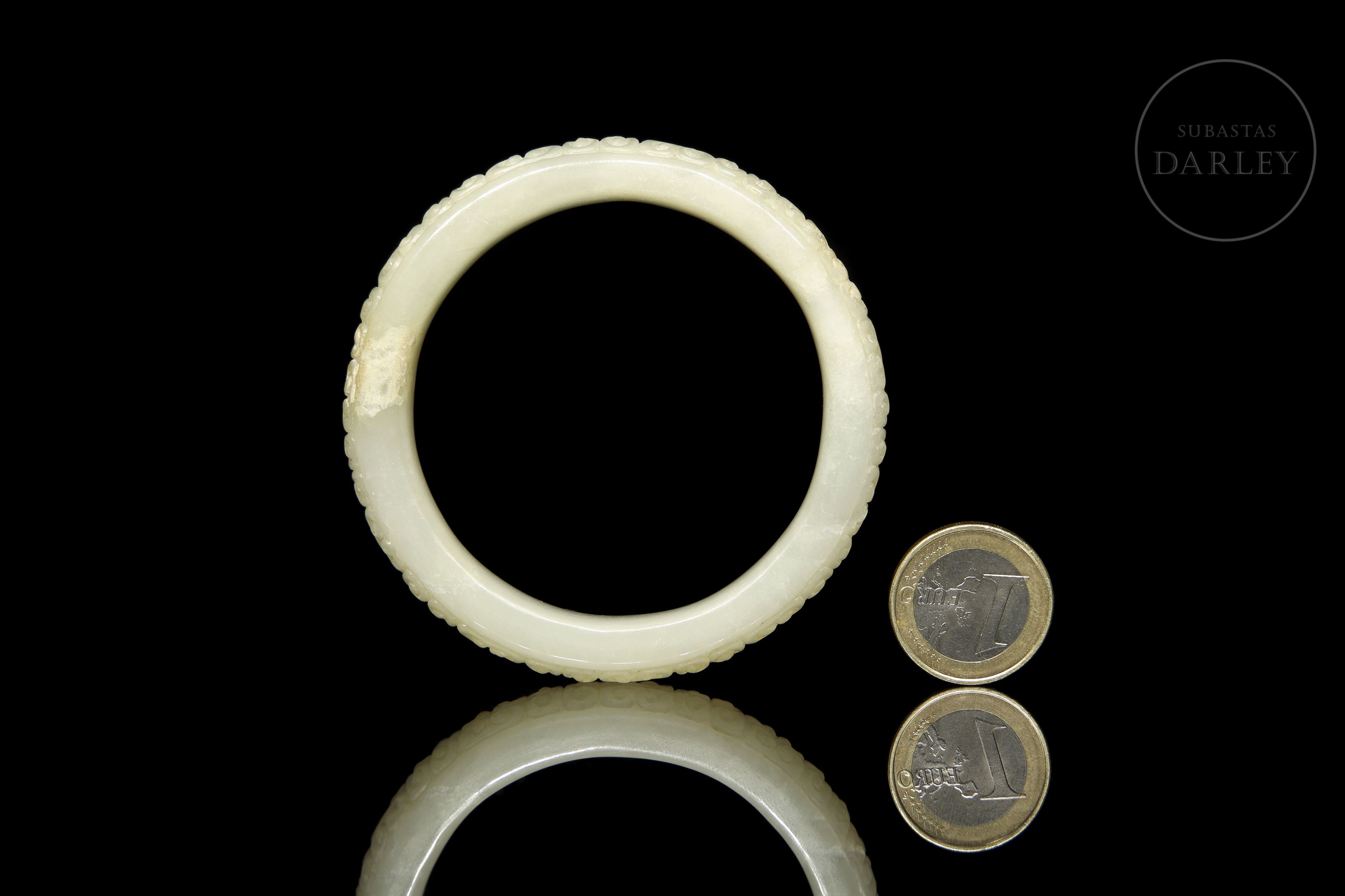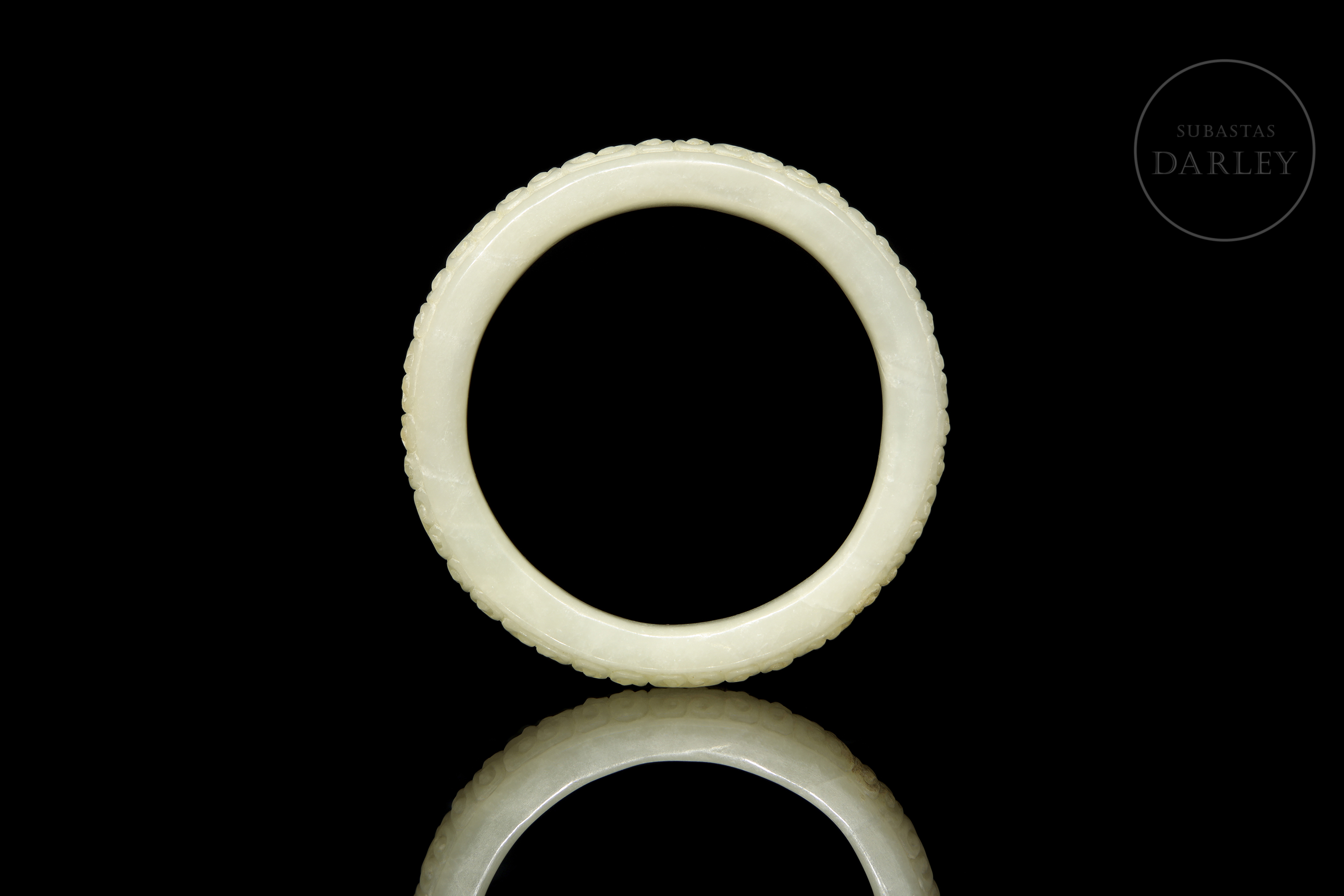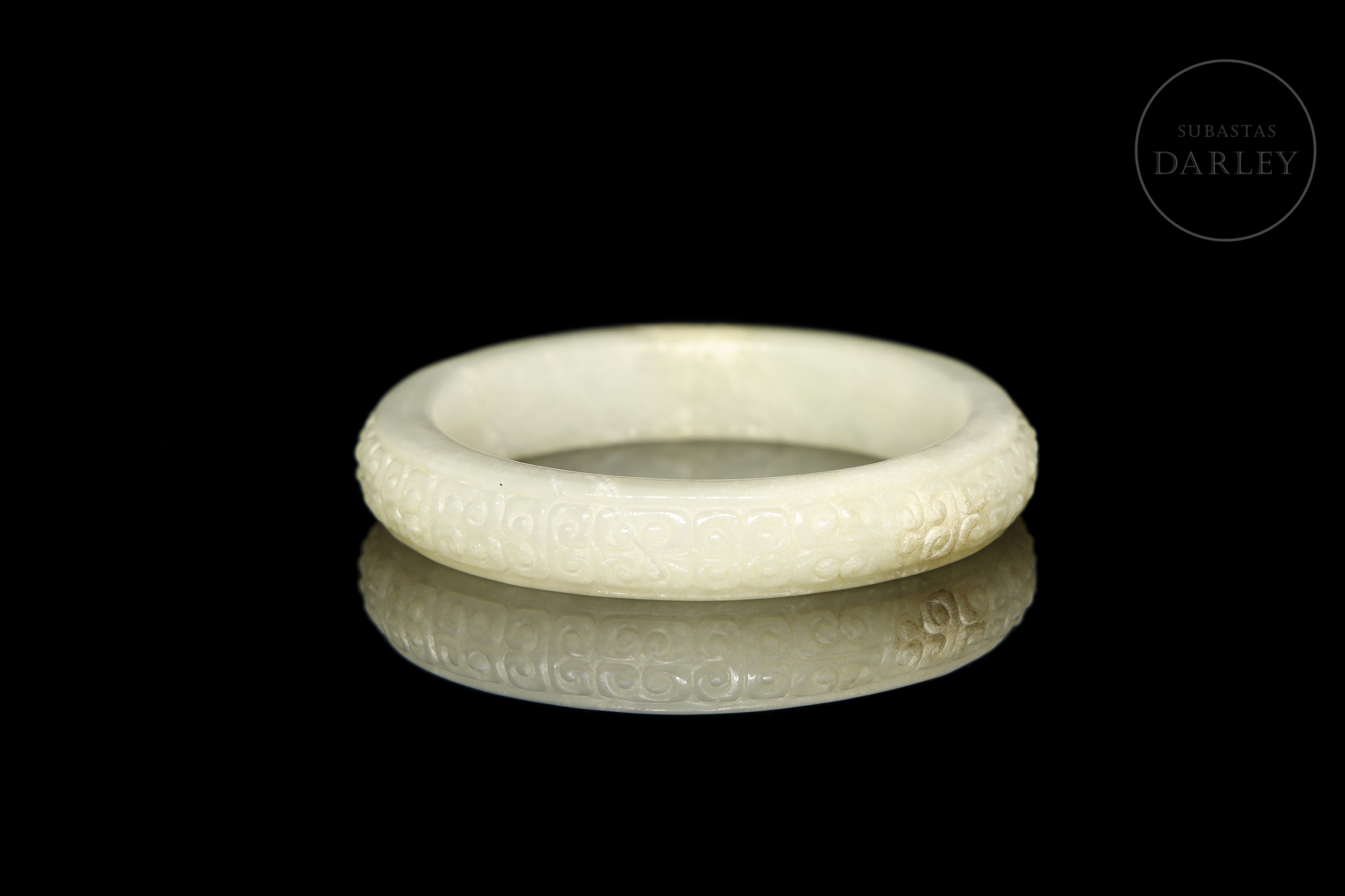 Brazalete anular, tallado en jade de tonalidad blanco-celadón. La pieza, de sección clásica redondeada, presenta la superficie exterior meticulosamente decorada en bajo relieve, con un patrón repetitivo de "Ruyis" (如意), que evoca la forma del hongo lingzhi y se asocia con la buena fortuna. Muestra pátina en tono ocre por envejecimiento natural. Dinastía Han (206 a.C. - 220 d.C.).