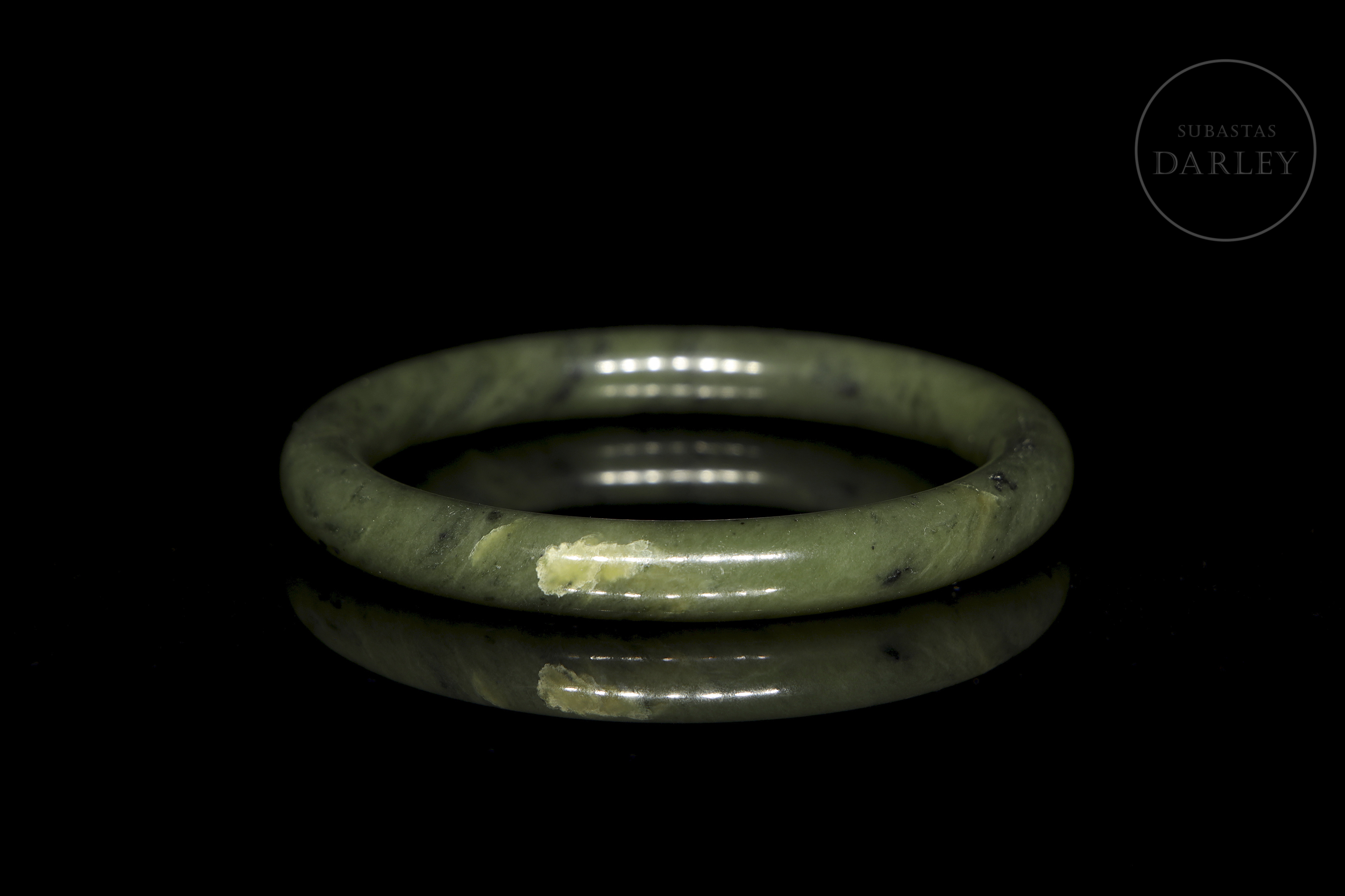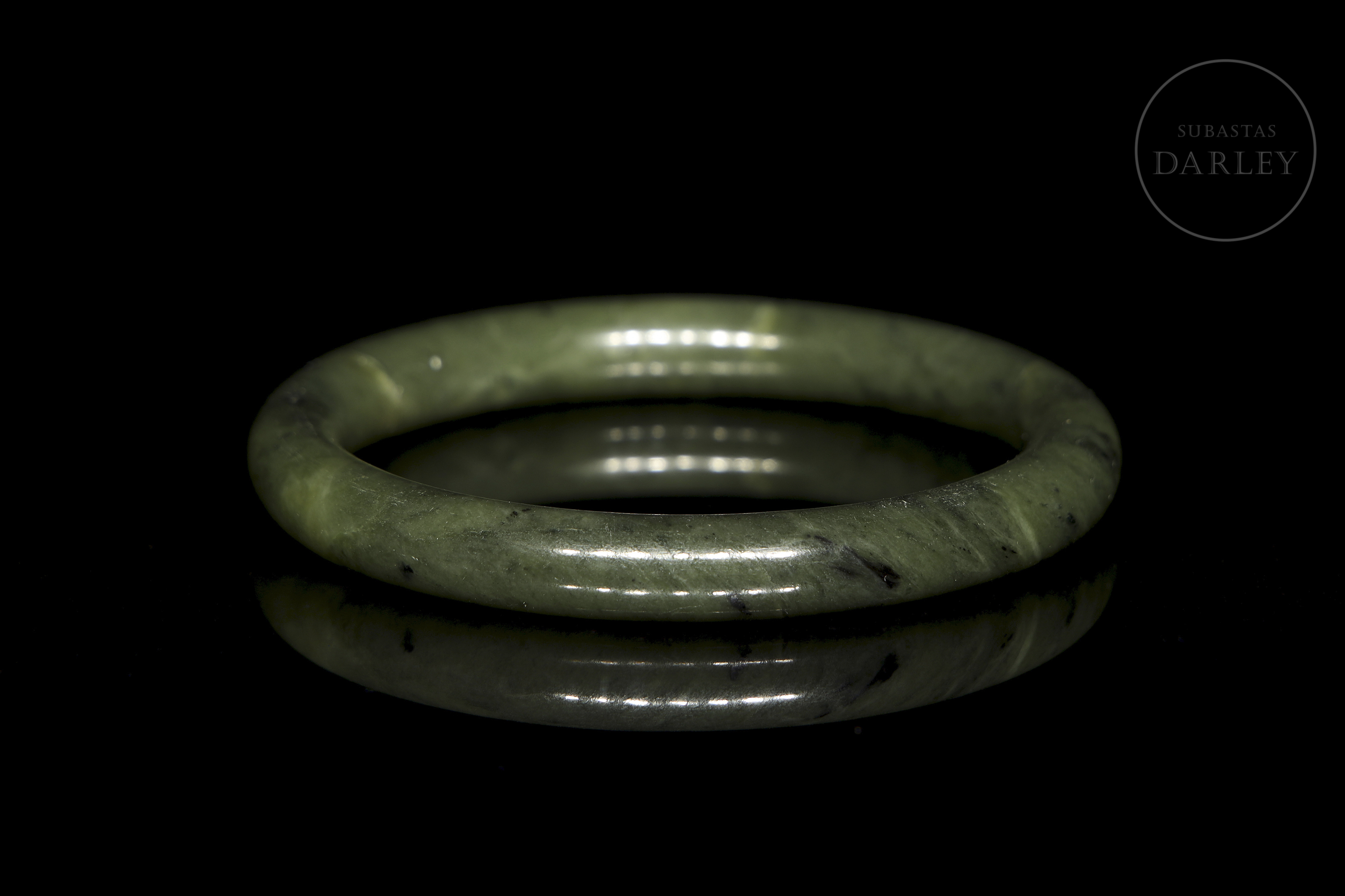 Jade de tonalidad verde profunda con veteado natural oscuro y áreas de inclusiones más claras. Posee un formato circular con perfil redondeado y un pulido vítreo que resalta la textura. La pieza ha sido tallada a partir de un único bloque de jade, mostrando una pátina.