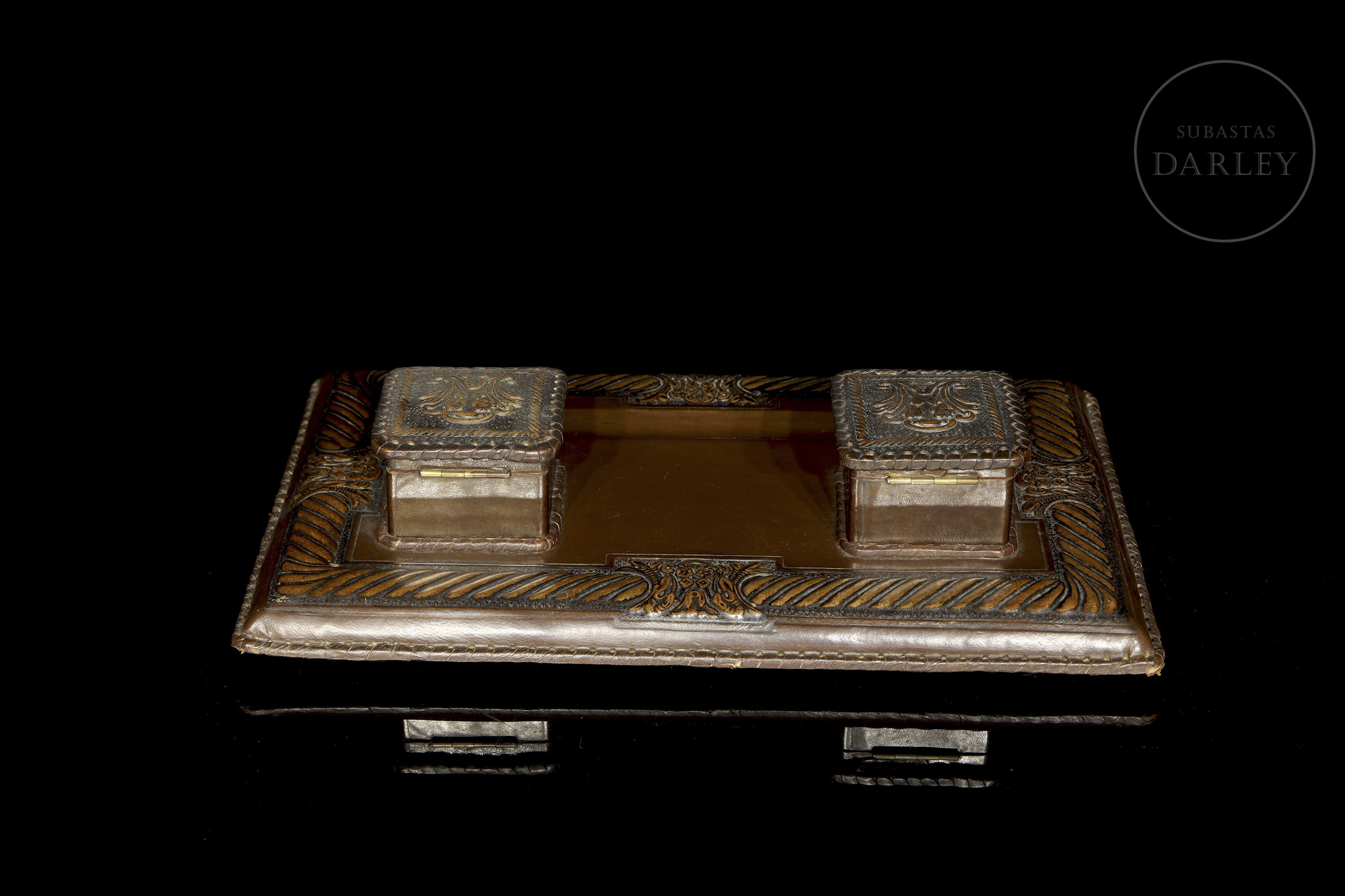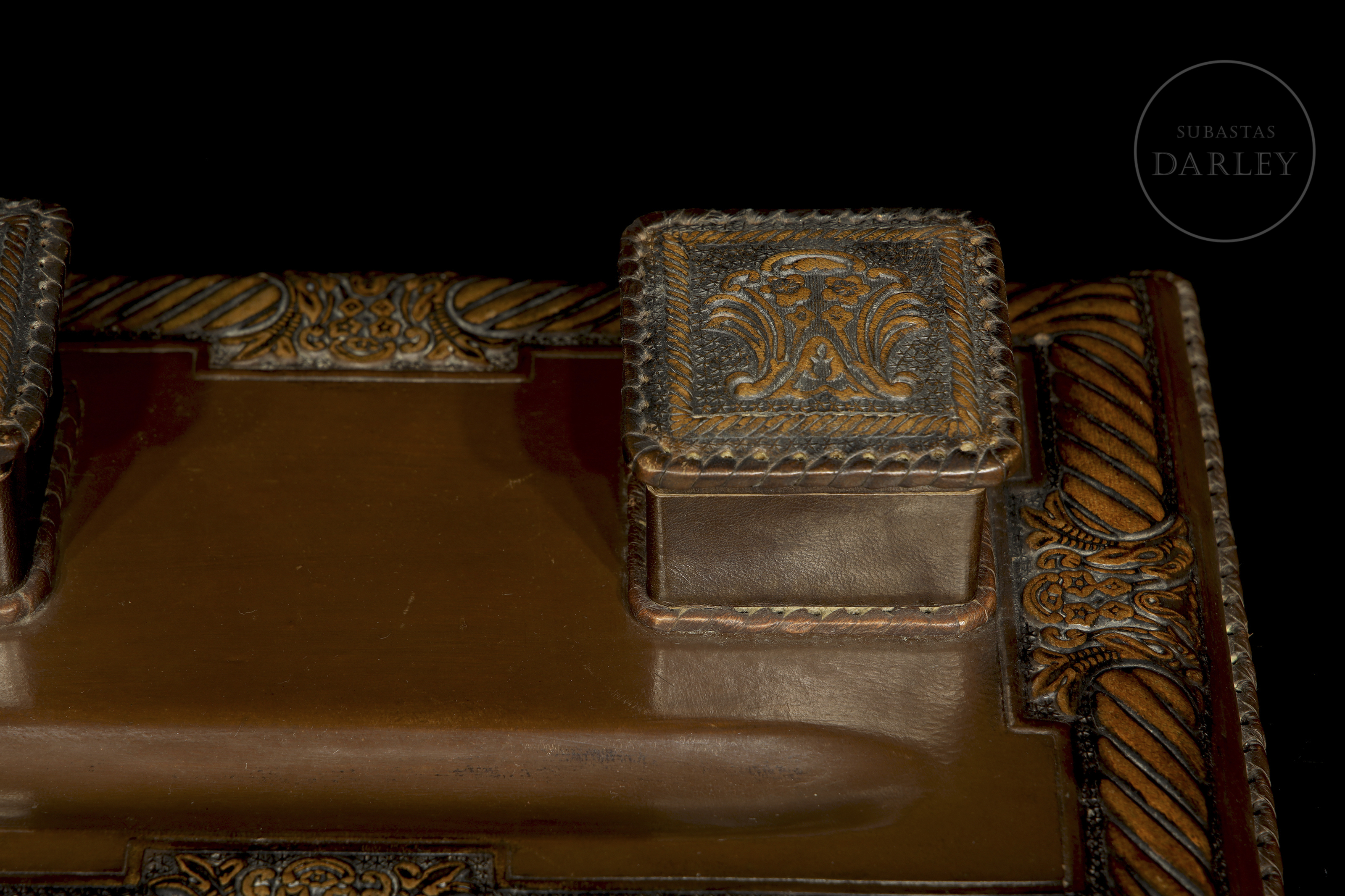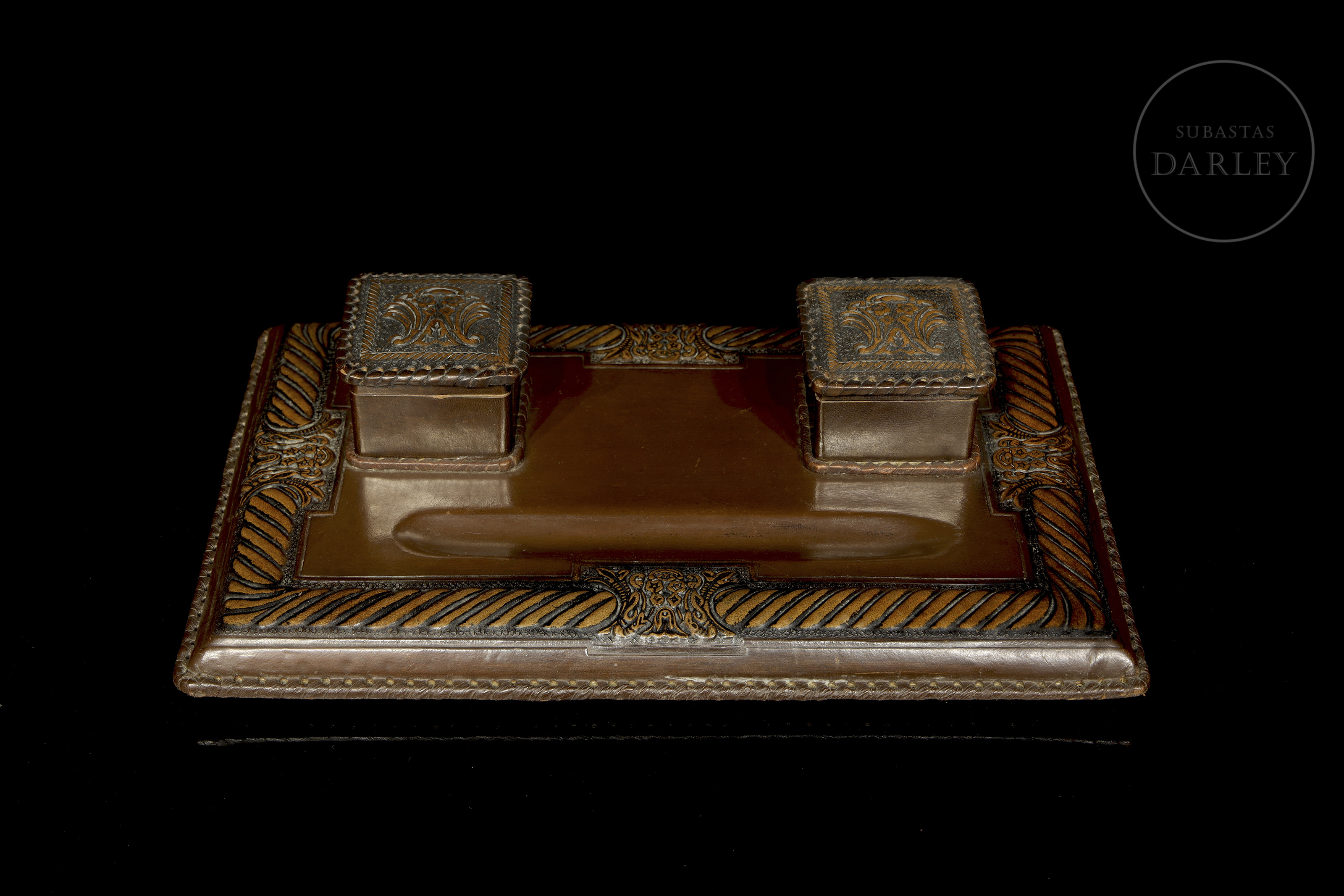Pieza de escritorio de manufactura artesanal, realizada en cuero de tonalidad marrón, de formato rectangular con decoración perimetral repujada de estilo clásico. Presenta una base con canal para plumas y dos tinteros cuadrangulares integrados con tapas abisagradas.