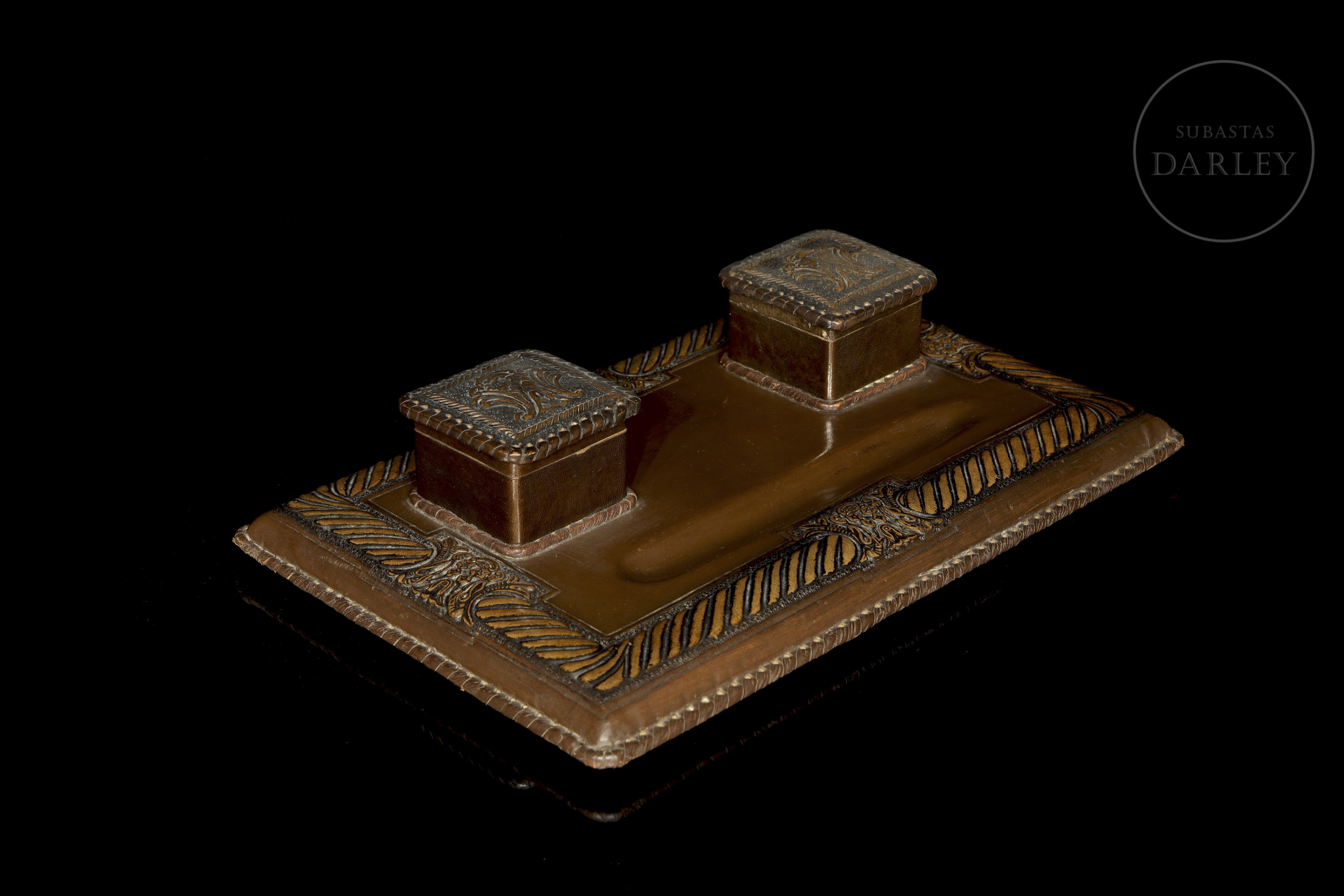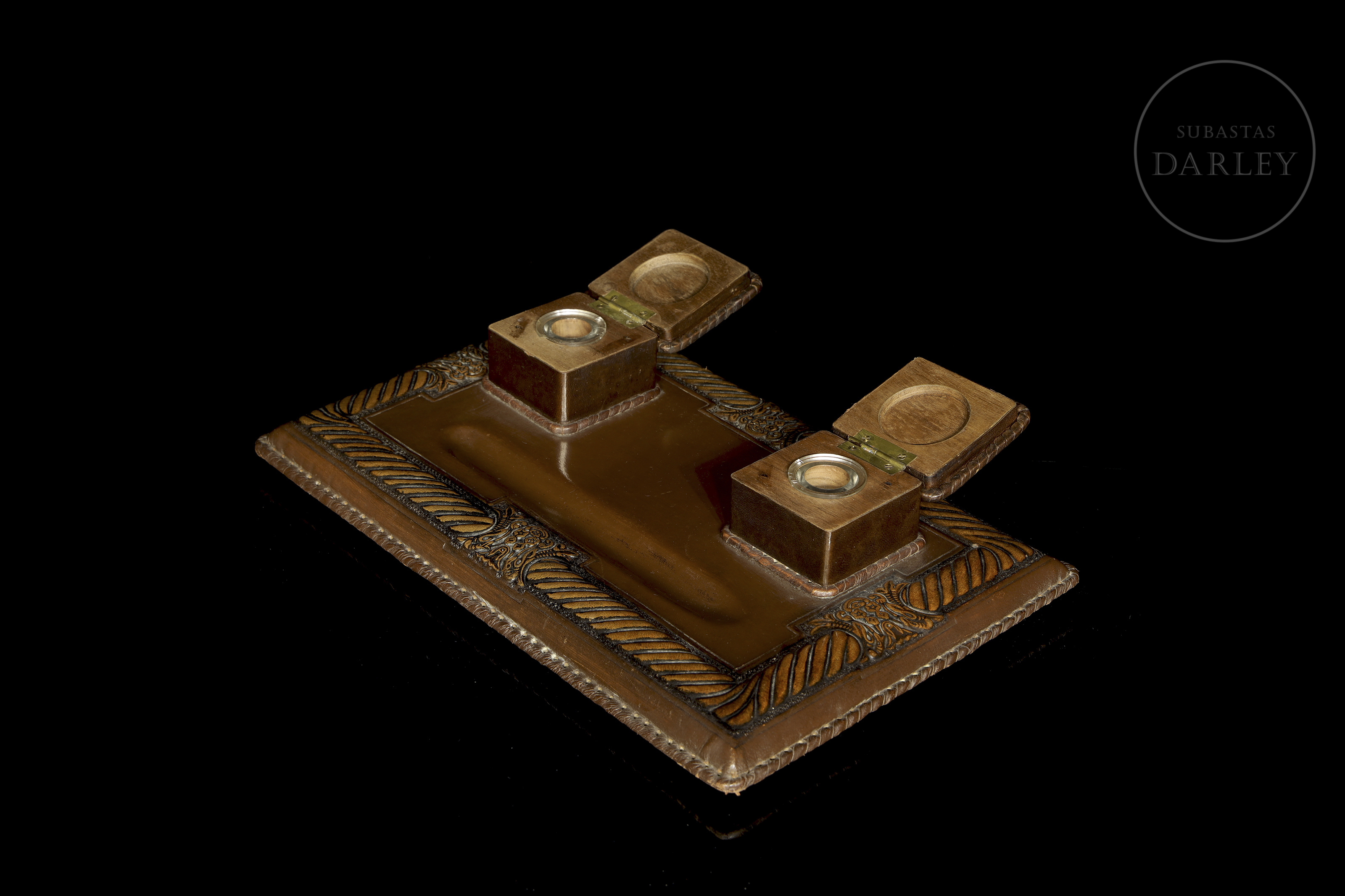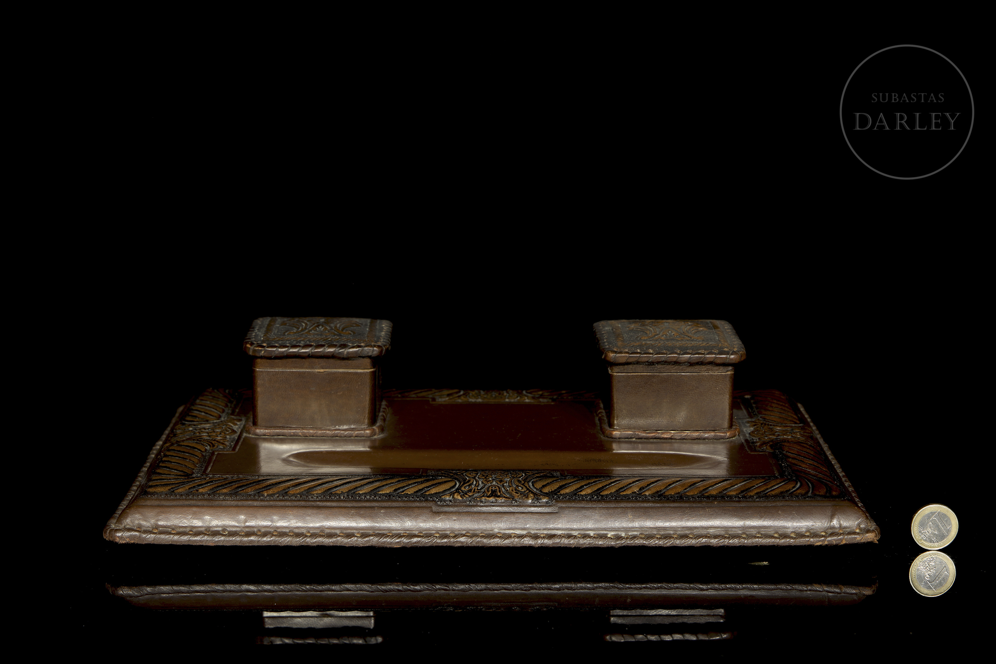 Pieza de escritorio de manufactura artesanal, realizada en cuero de tonalidad marrón, de formato rectangular con decoración perimetral repujada de estilo clásico. Presenta una base con canal para plumas y dos tinteros cuadrangulares integrados con tapas abisagradas.