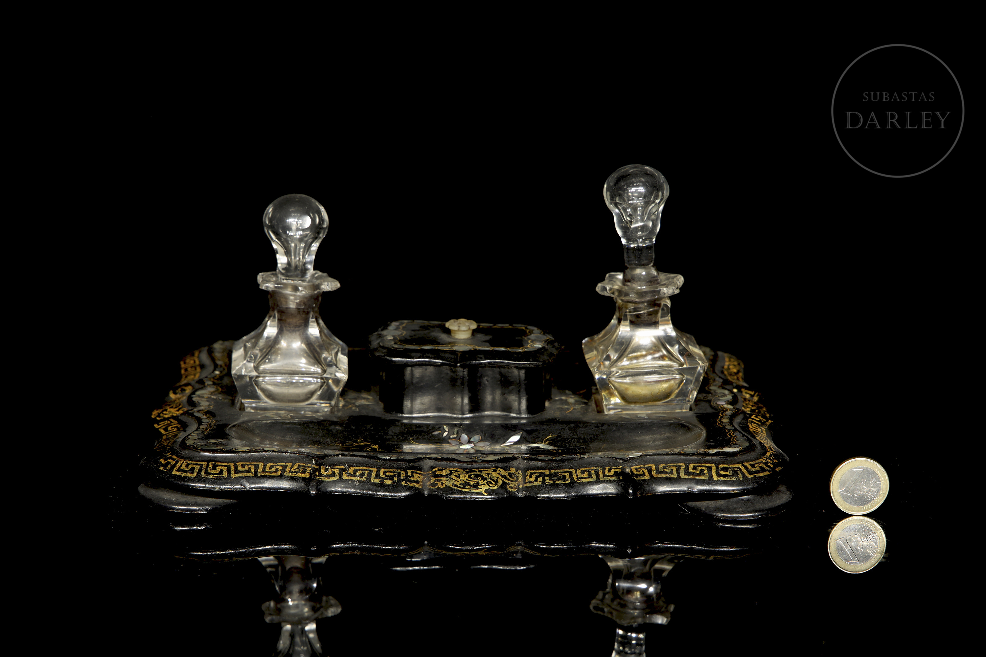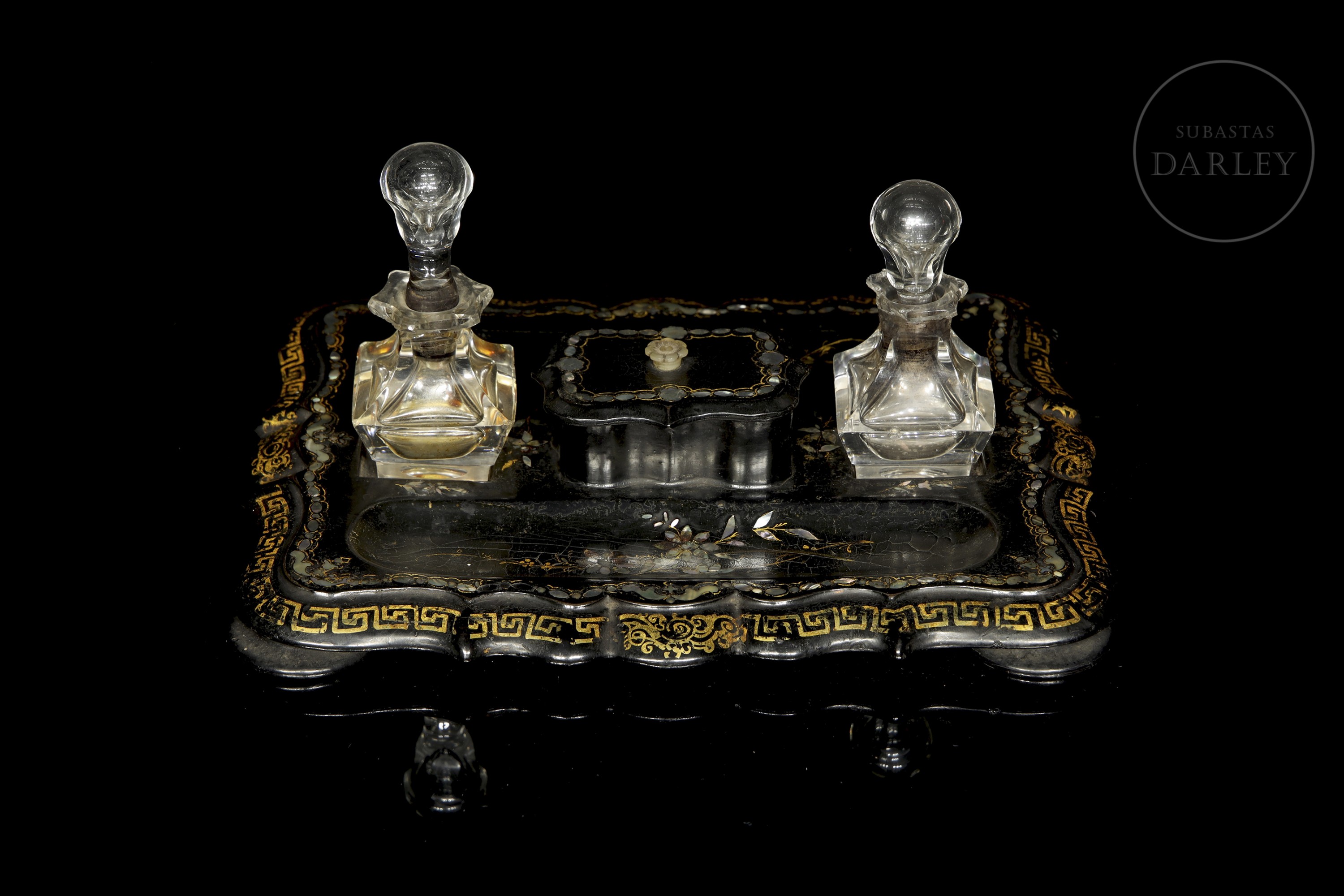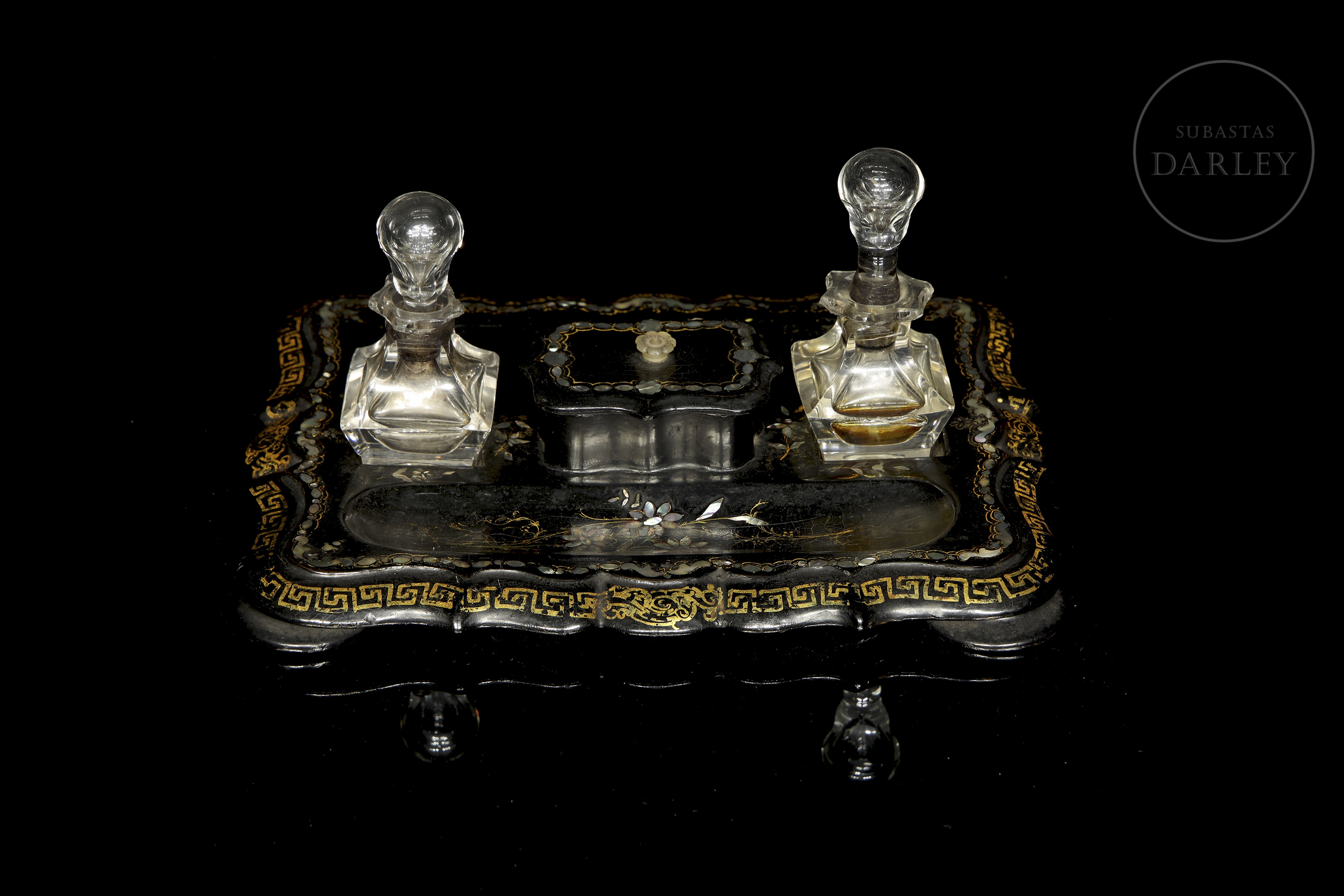 Elegante tintero de escritorio de estilo romántico que presenta una base polilobulada decorada con incrustaciones de nácar, motivos orientales y florales. El conjunto incluye dos frascos de cristal tallado para tinta y un compartimento central con tapa.