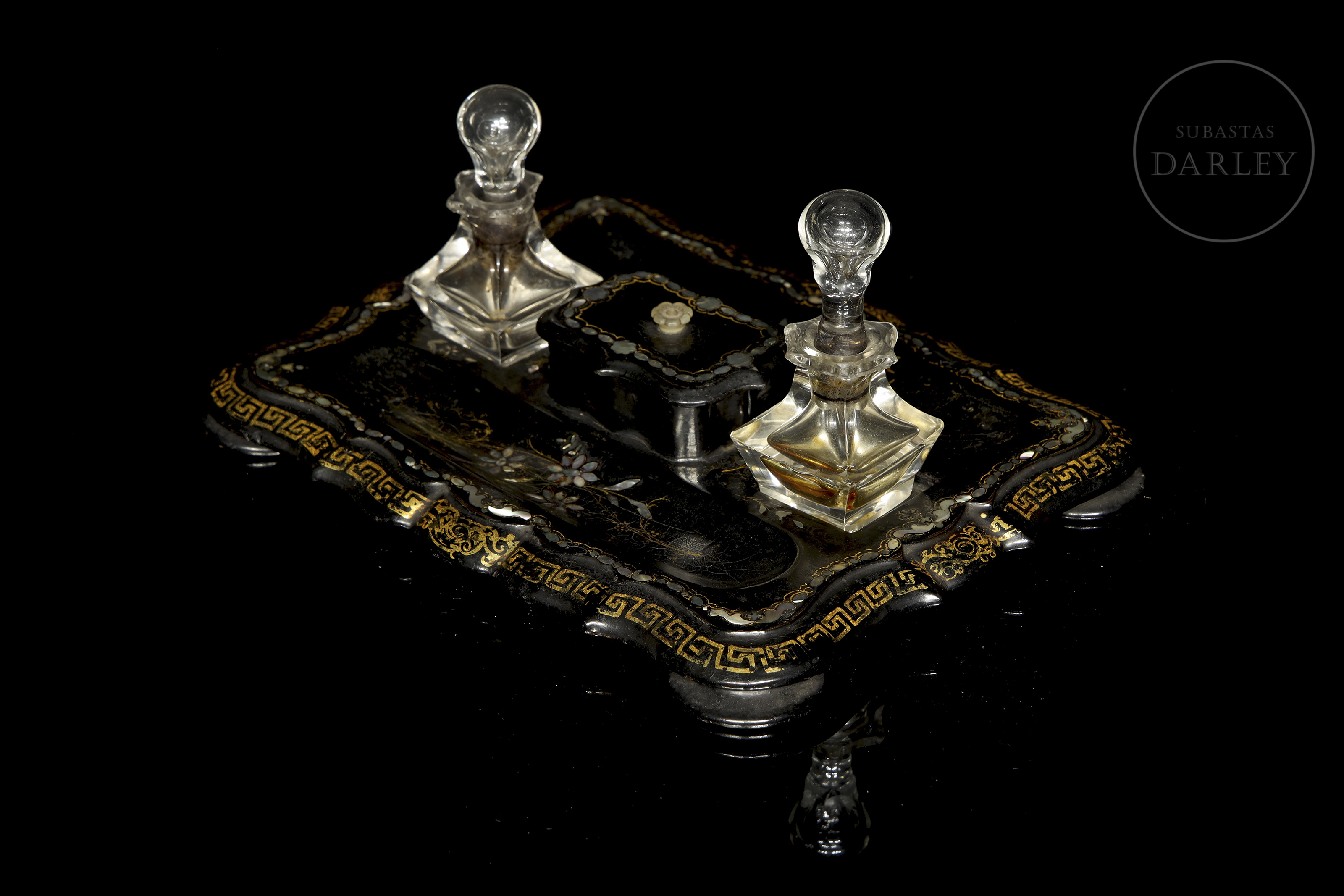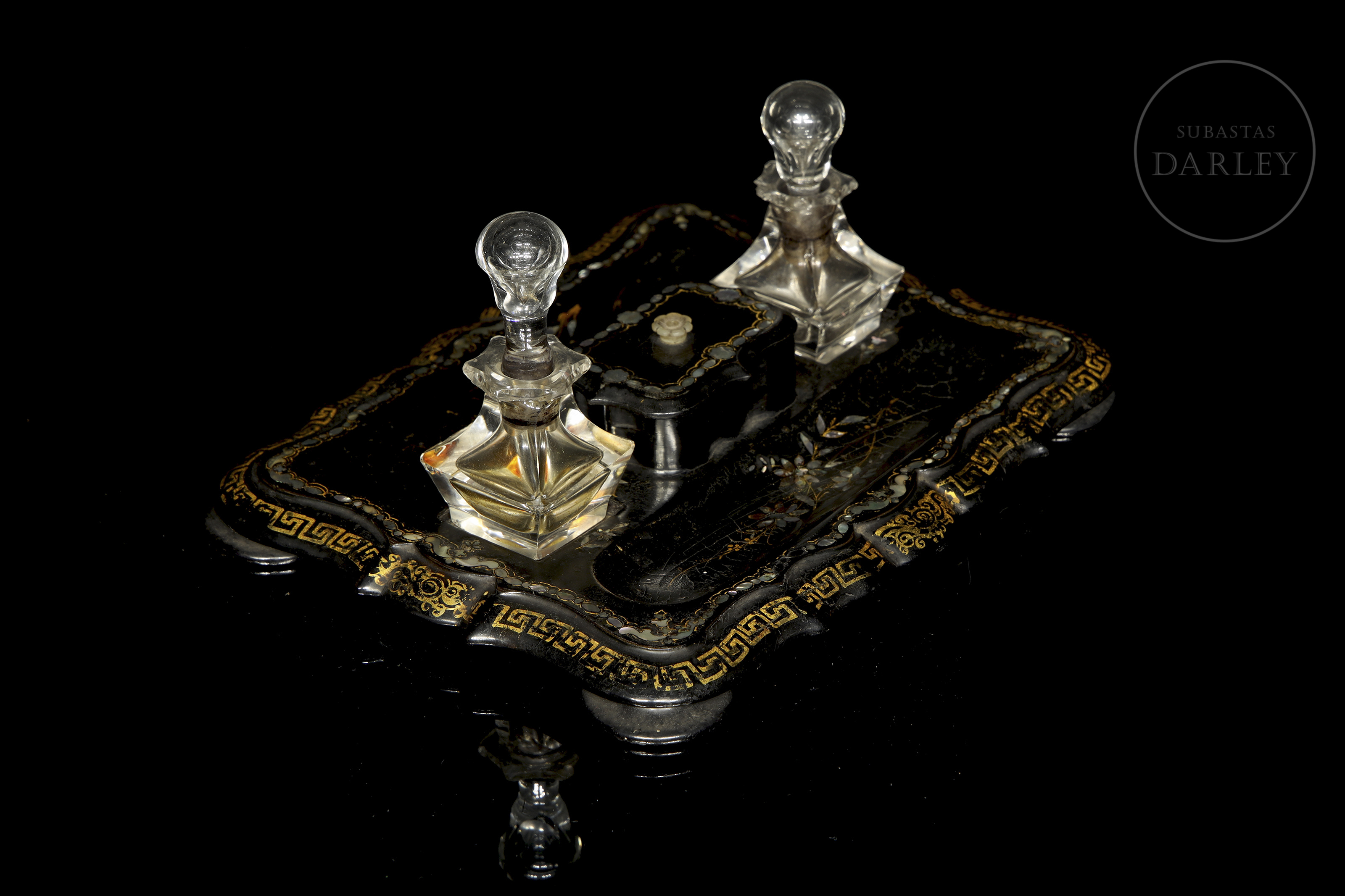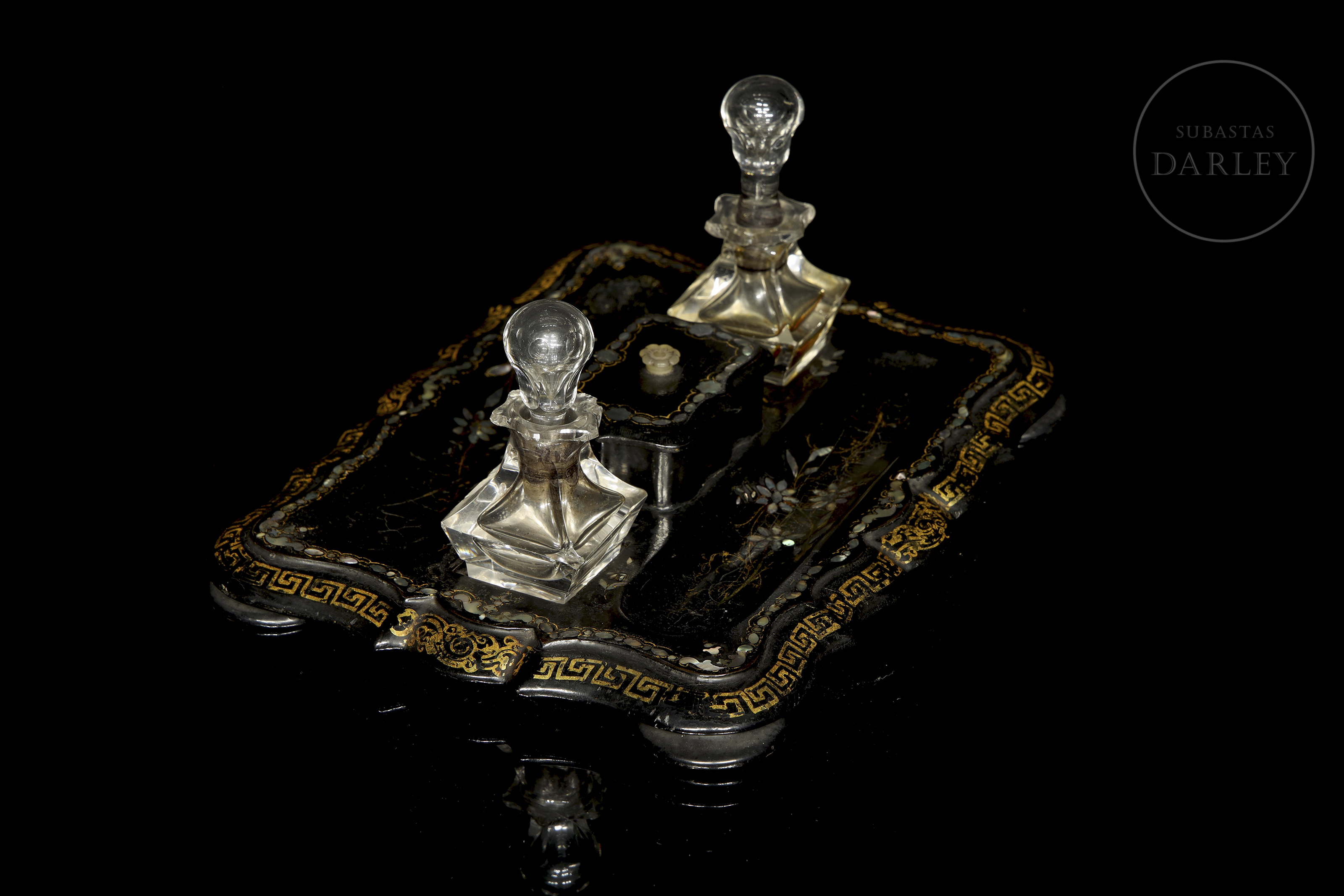 Elegante tintero de escritorio de estilo romántico que presenta una base polilobulada decorada con incrustaciones de nácar, motivos orientales y florales. El conjunto incluye dos frascos de cristal tallado para tinta y un compartimento central con tapa.