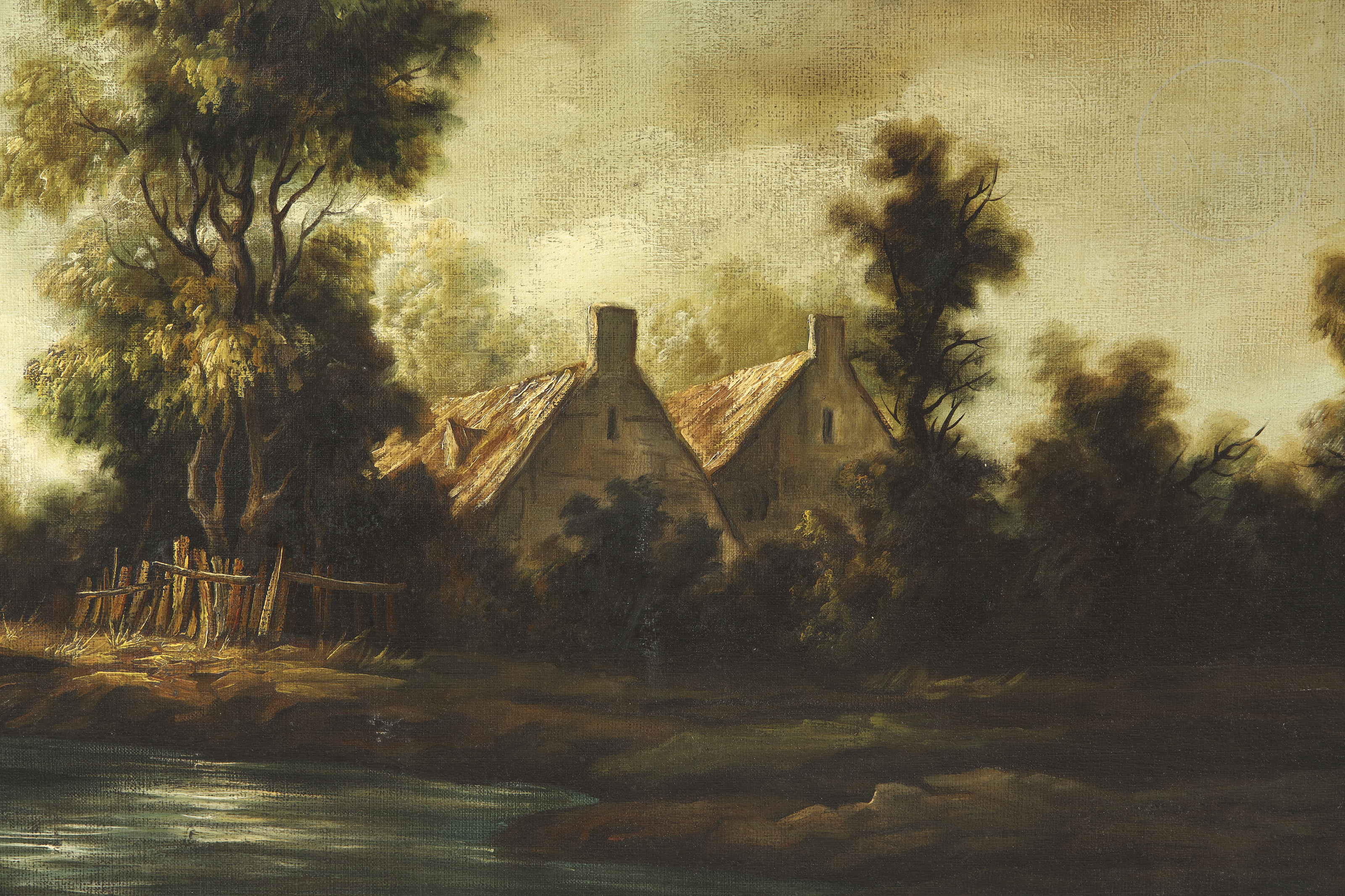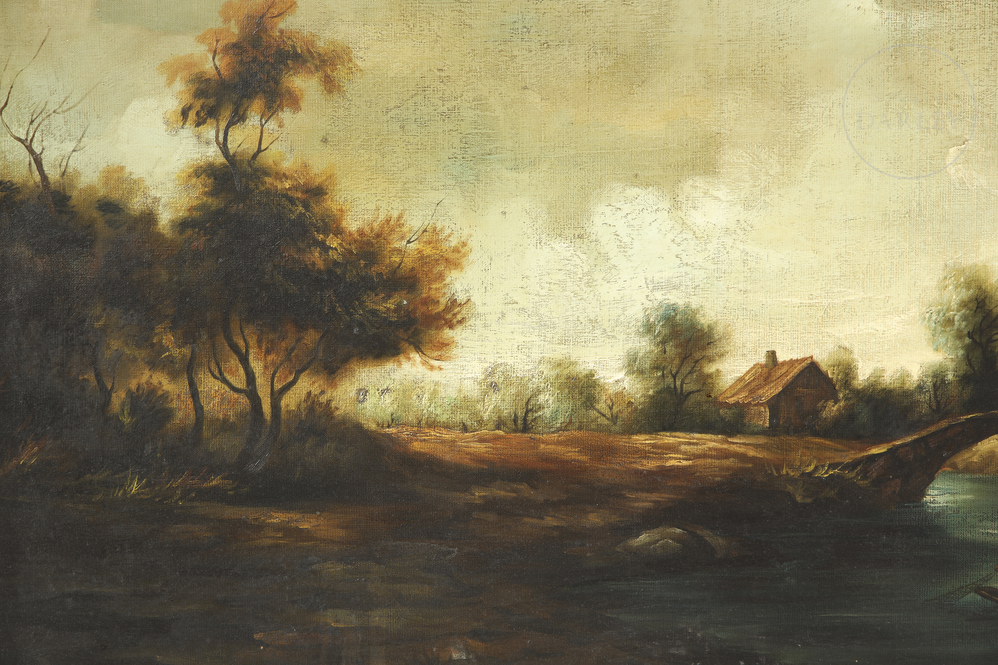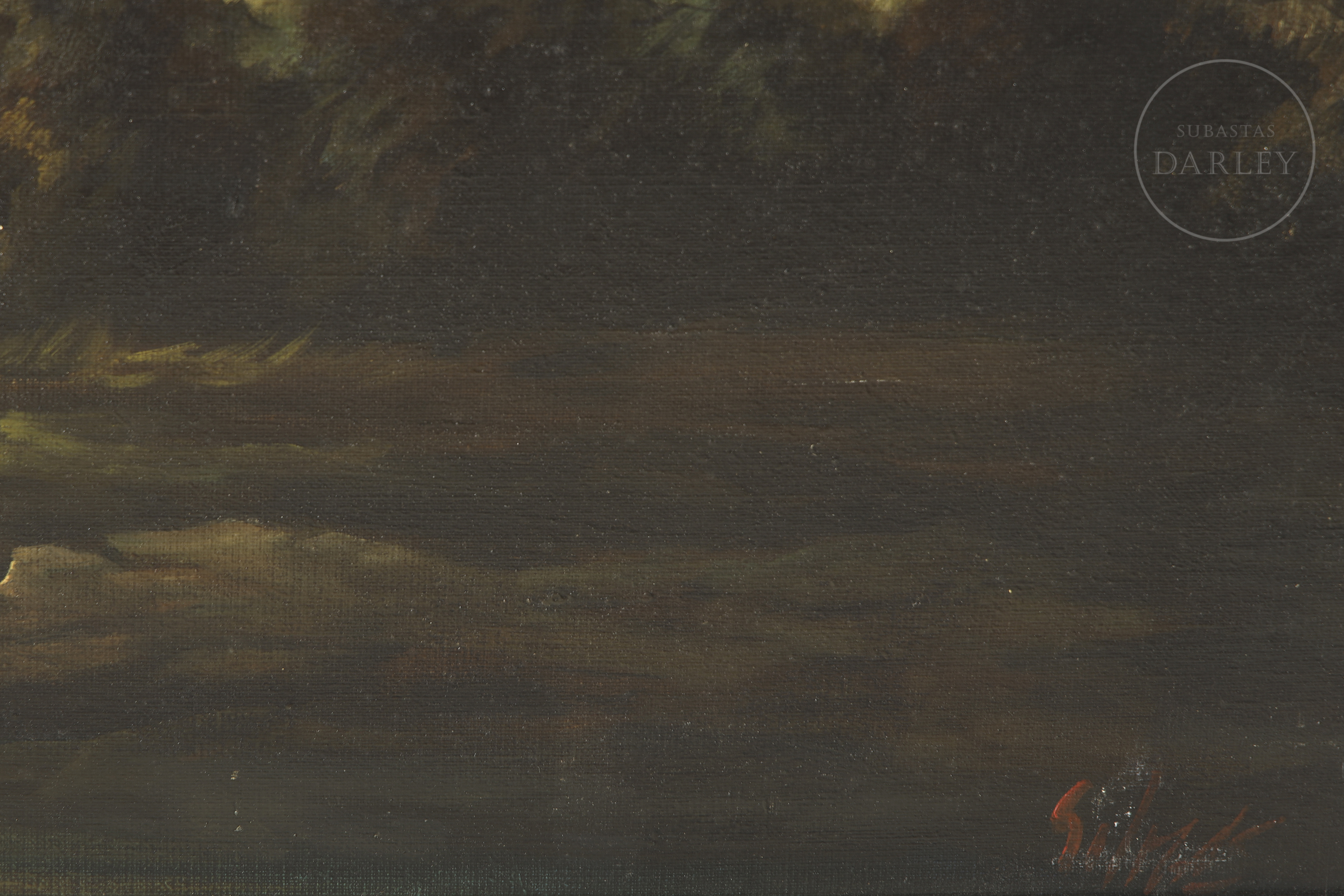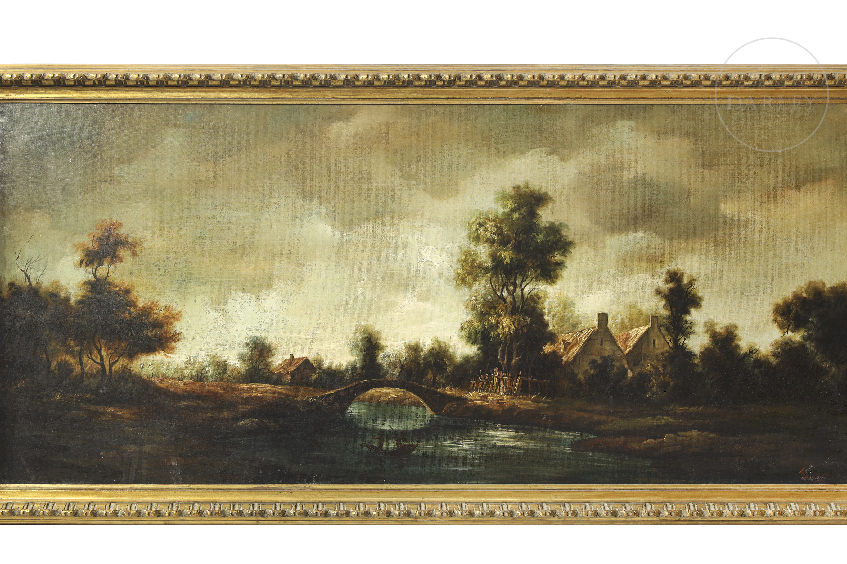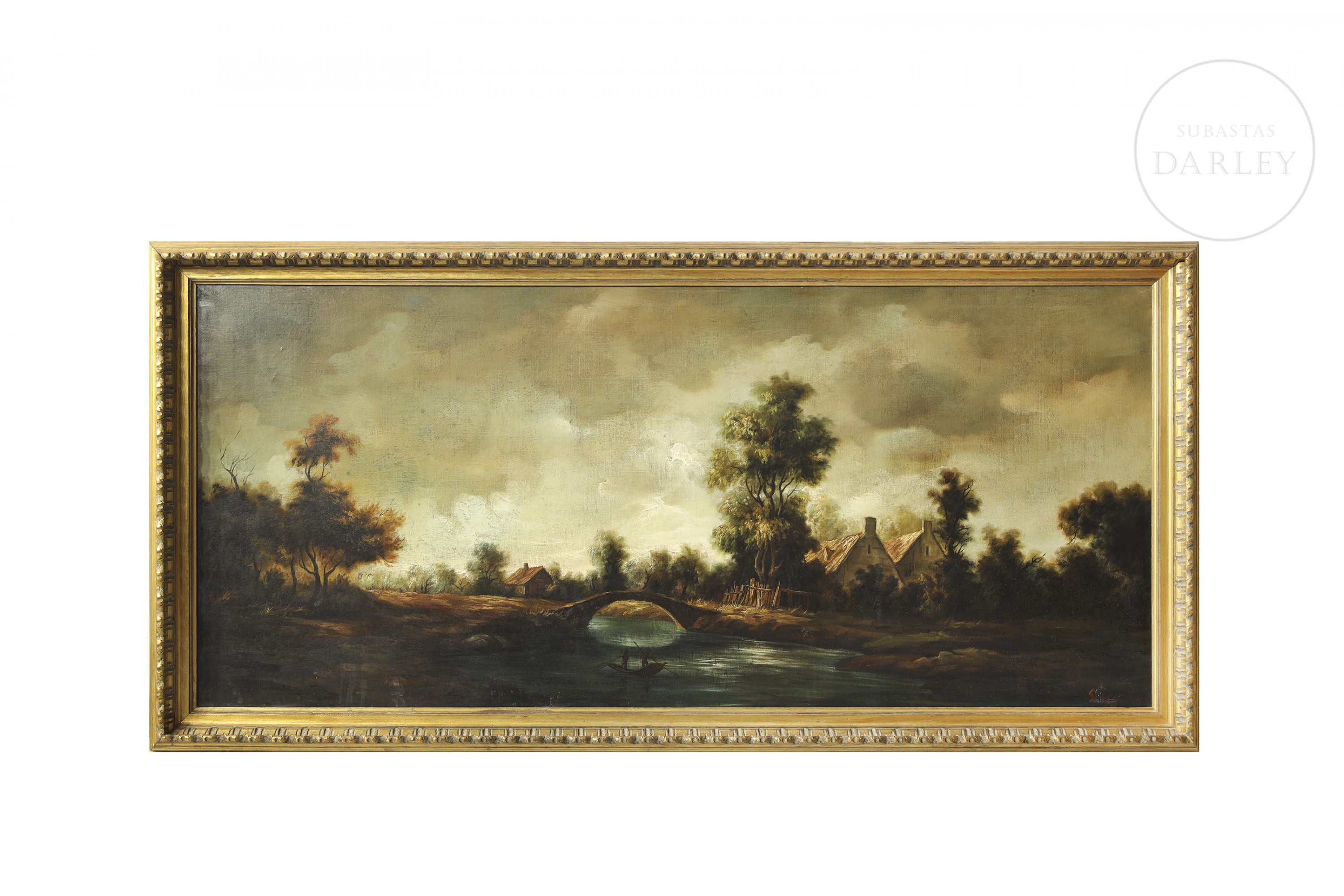 Óleo sobre lienzo firmado en la esquina inferior derecha. Firmada en la esquina inferior derecha de la obra. Paisaje posiblemente inspirado en la pintura "Landscape with a Stone Bridge" por Rembrandt van Rijn.