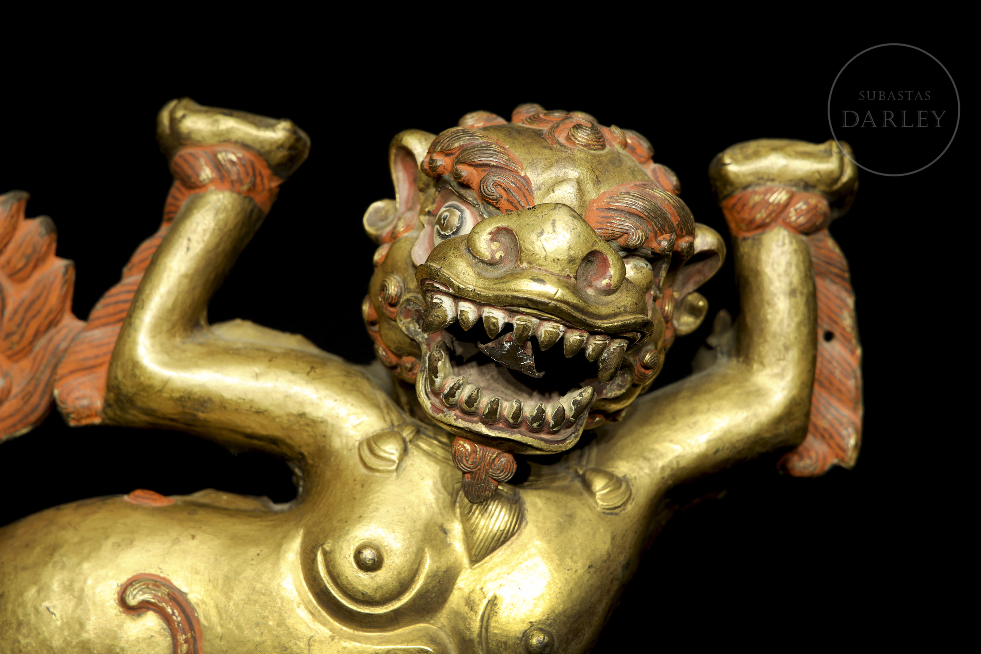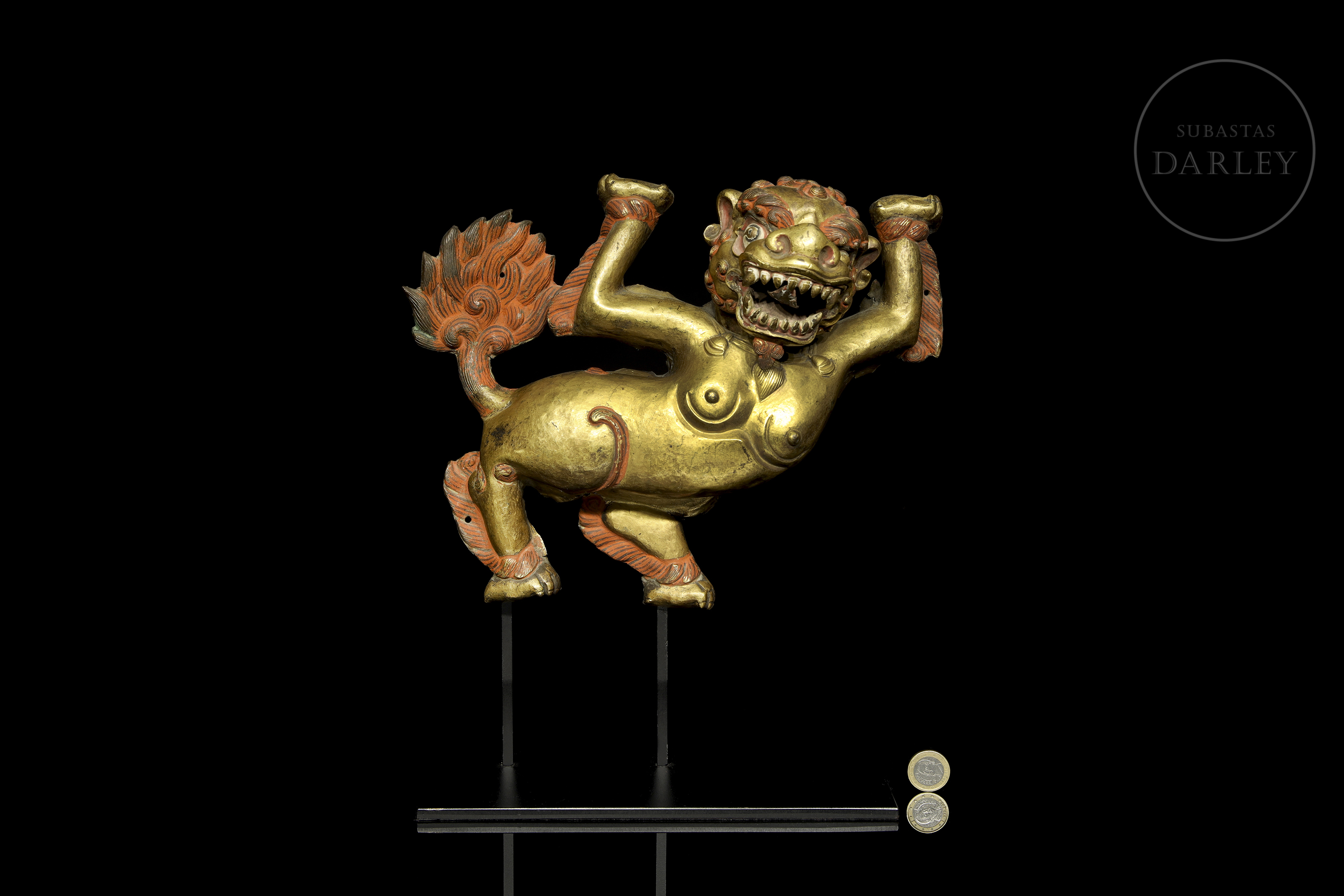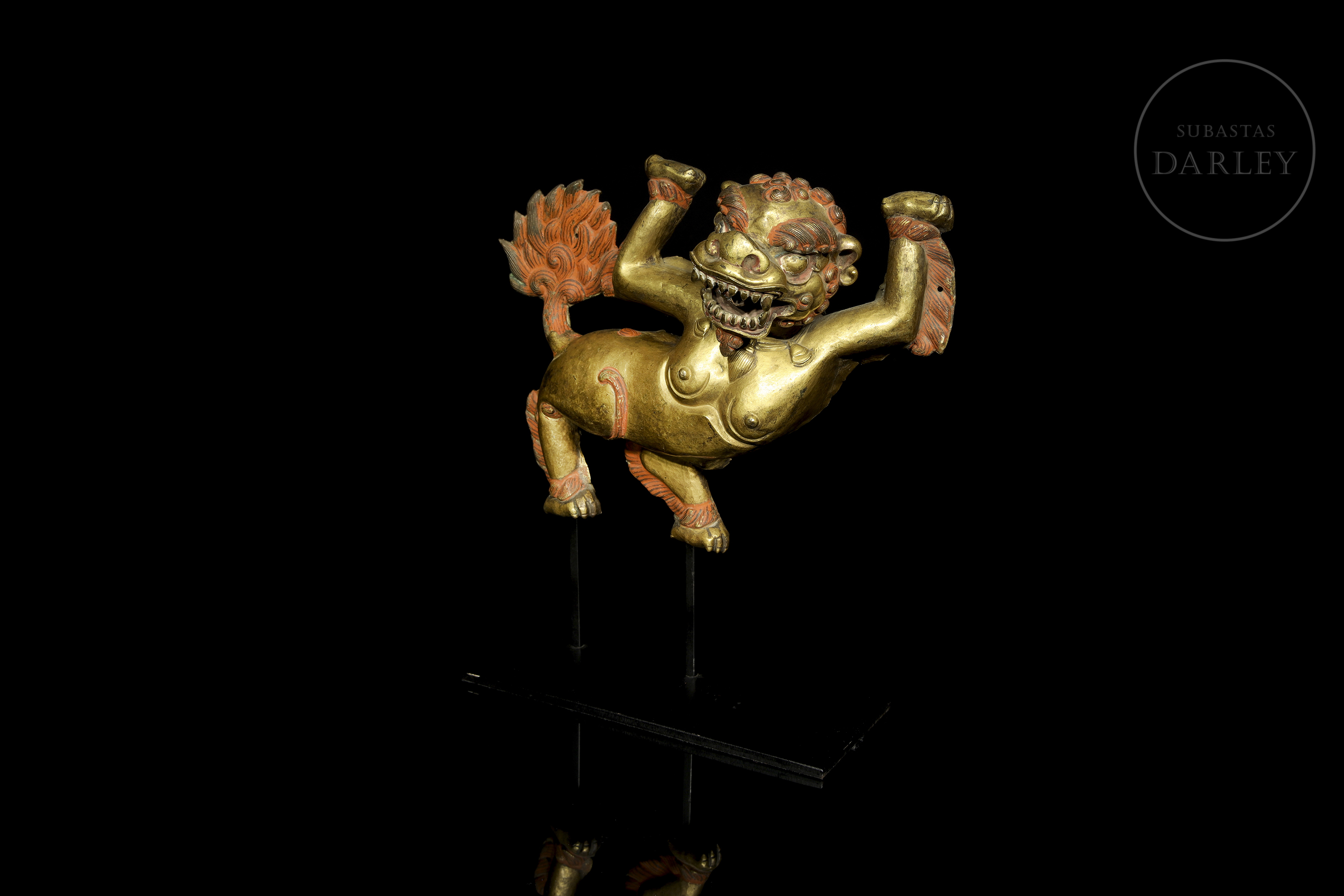 Figura que representa a un León de las Nieves, animal mítico del Tíbet. Realizado en cobre dorado repujado, de interior hueco, y cabeza de bronce. Muestra a la bestia en una postura dinámica, con las patas delanteras alzadas, fauces abiertas, ojos prominentes y una melena y cola flamígeras donde se observan restos de pigmento rojizo y anaranjado. Conserva gran parte de su acabado original dorado y restos de policromía en tonos rojos y anaranjados. Se dispone sobre una peana metálica moderna.