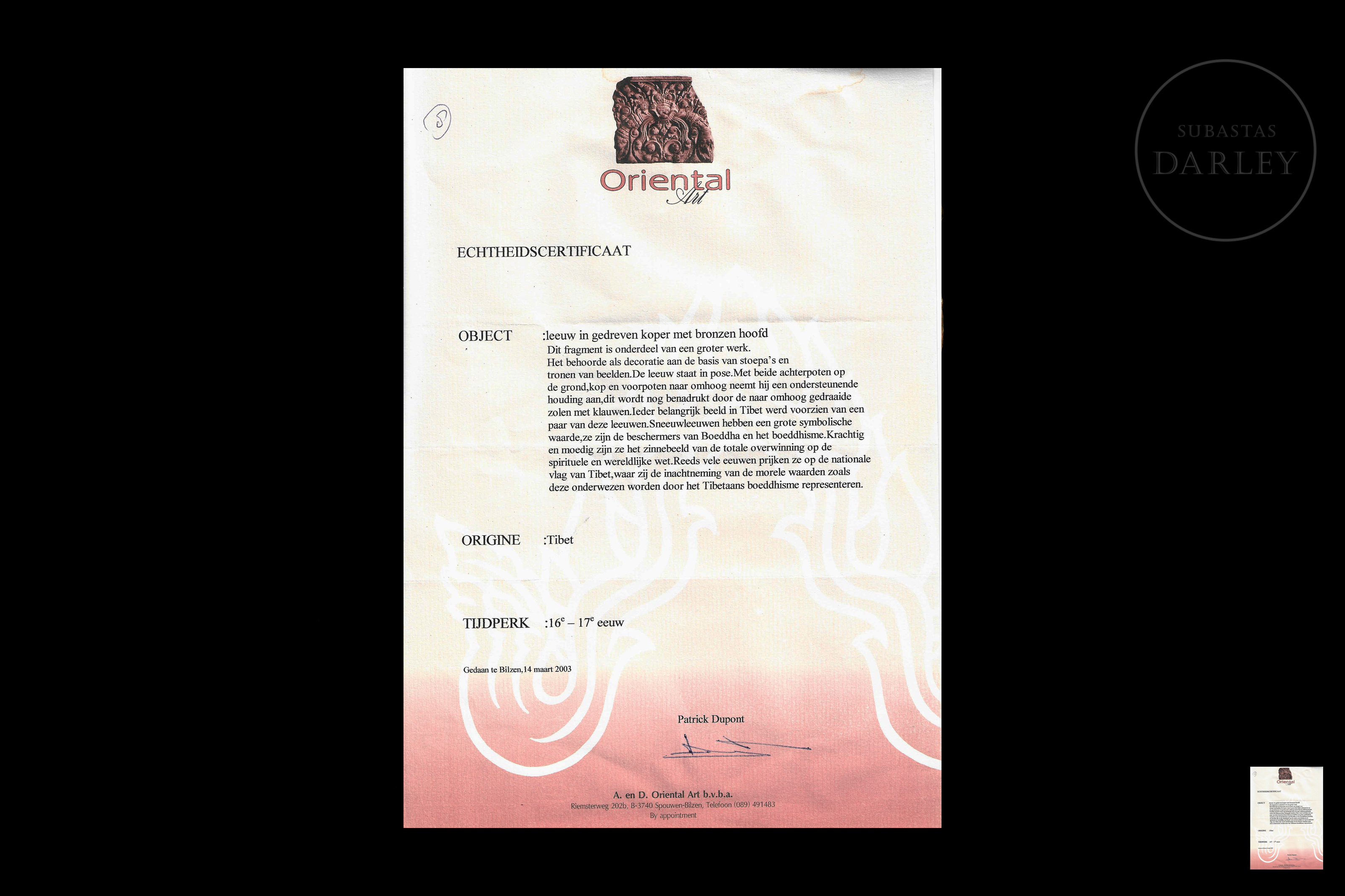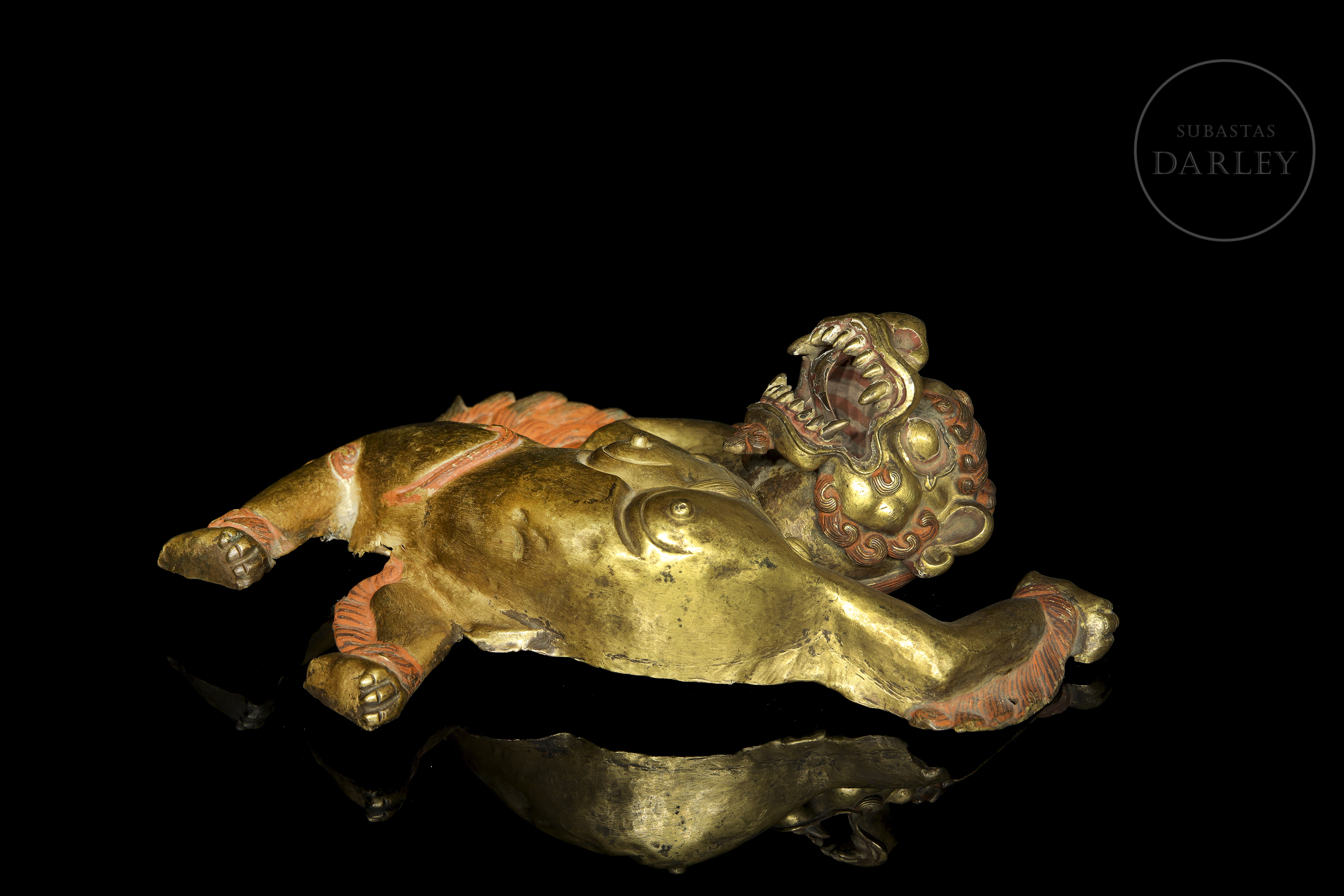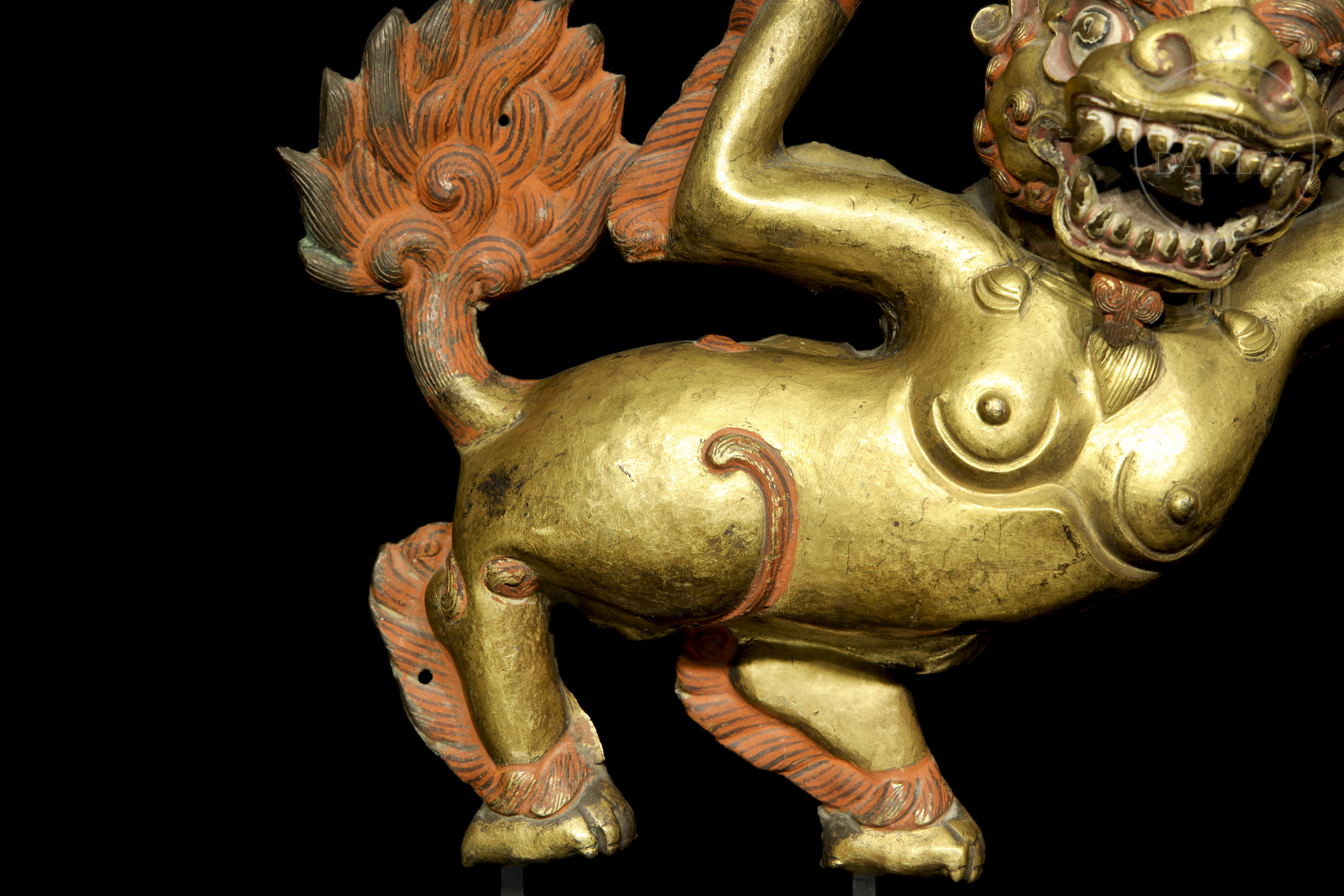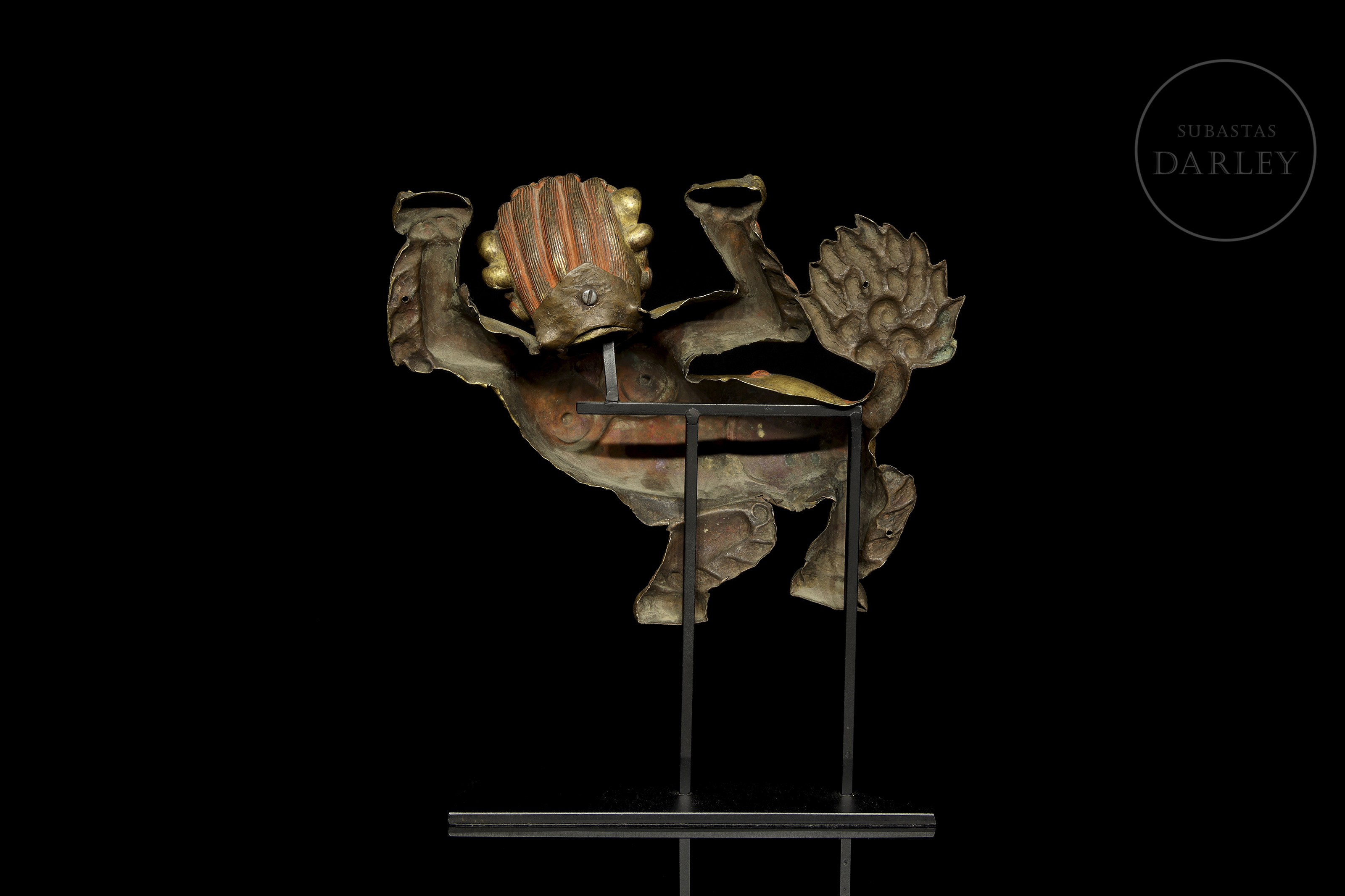 Figura que representa a un León de las Nieves, animal mítico del Tíbet. Realizado en cobre dorado repujado, de interior hueco, y cabeza de bronce. Muestra a la bestia en una postura dinámica, con las patas delanteras alzadas, fauces abiertas, ojos prominentes y una melena y cola flamígeras donde se observan restos de pigmento rojizo y anaranjado. Conserva gran parte de su acabado original dorado y restos de policromía en tonos rojos y anaranjados. Se dispone sobre una peana metálica moderna.