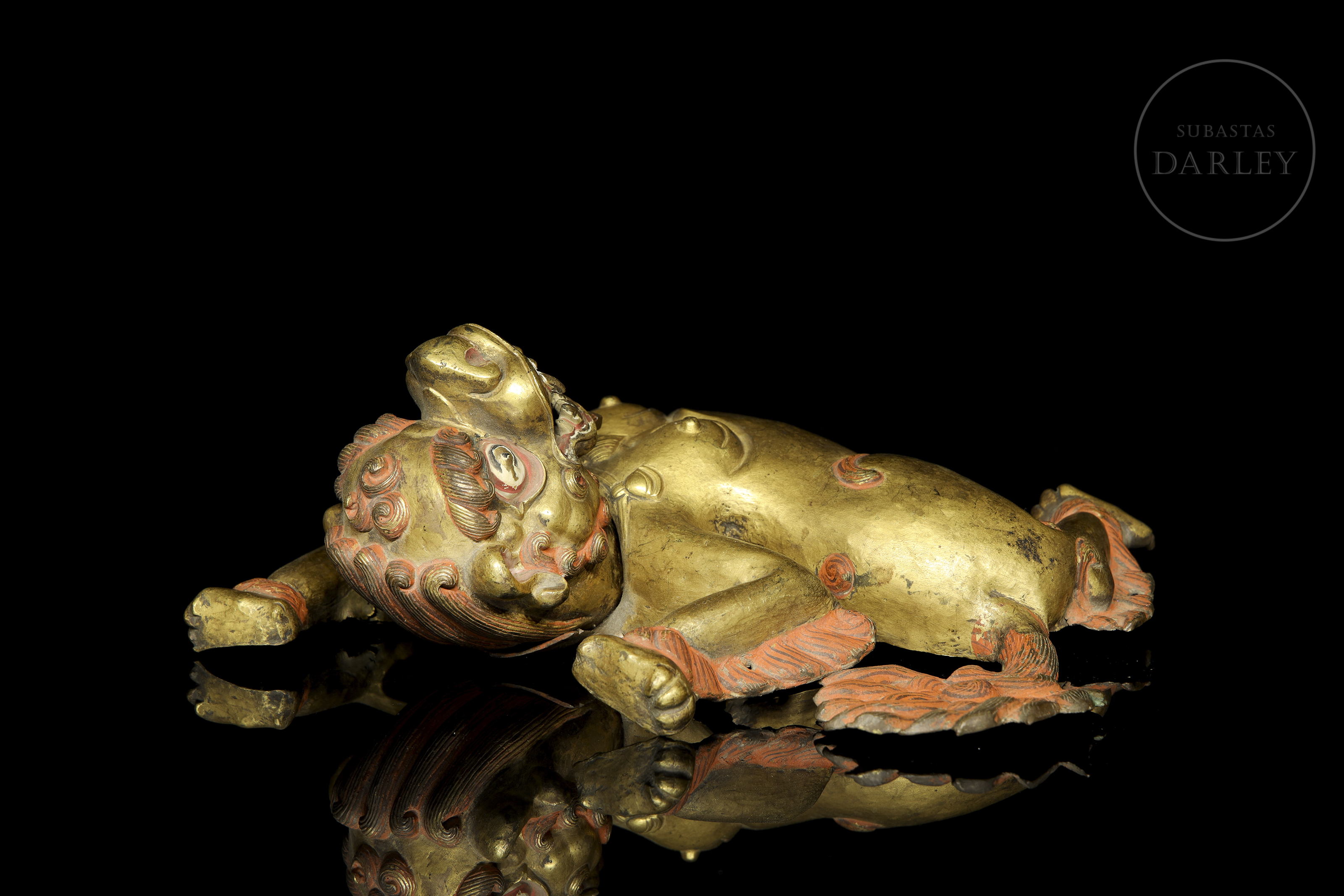 Escultura de cobre dorado policromado "Tigre de nieve", Tibet, s.XVI