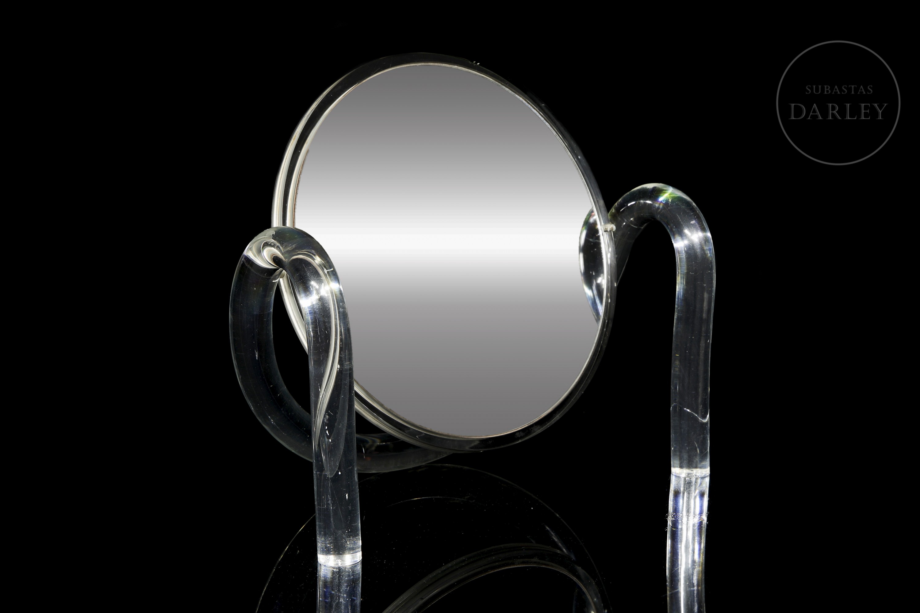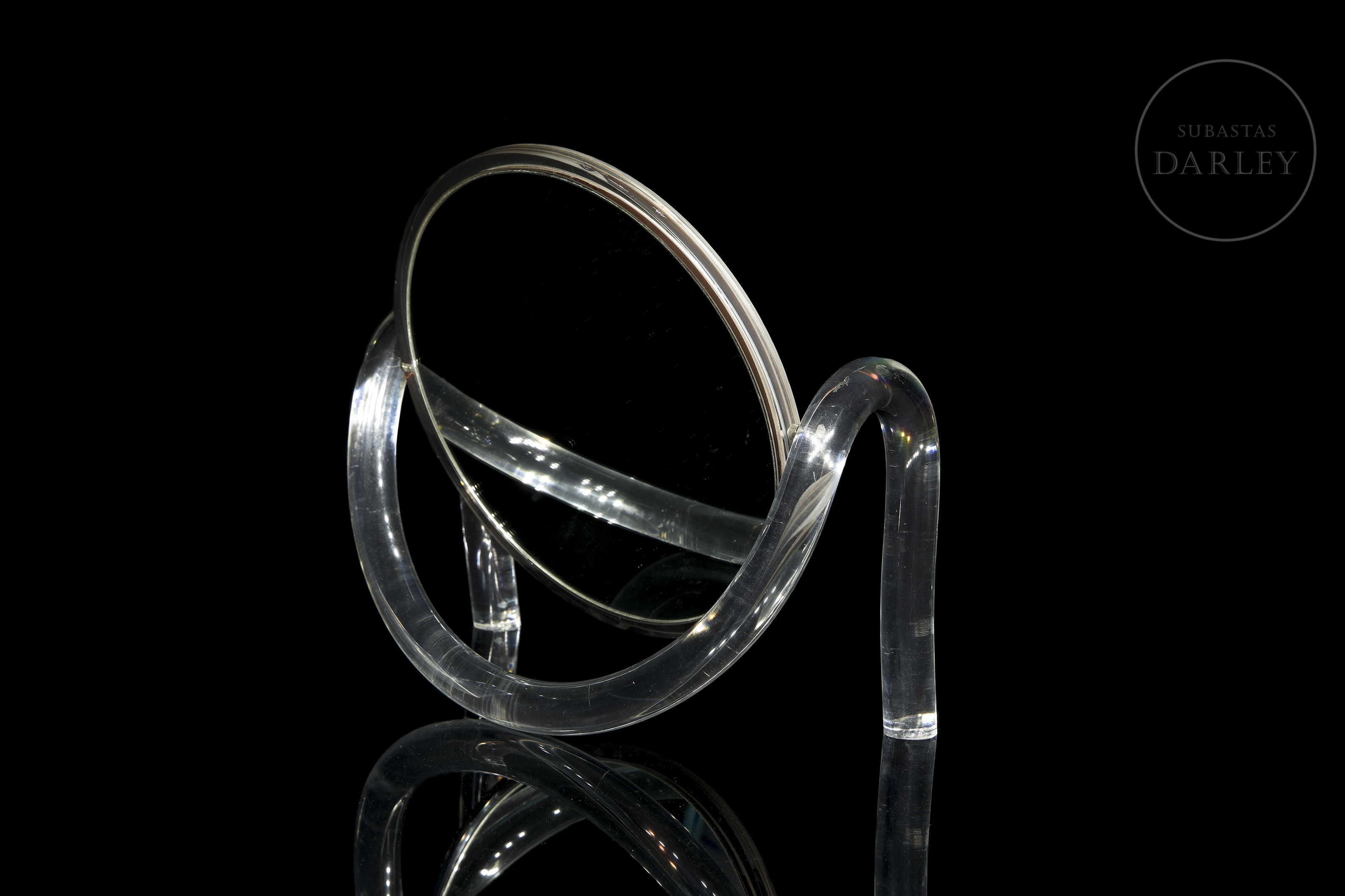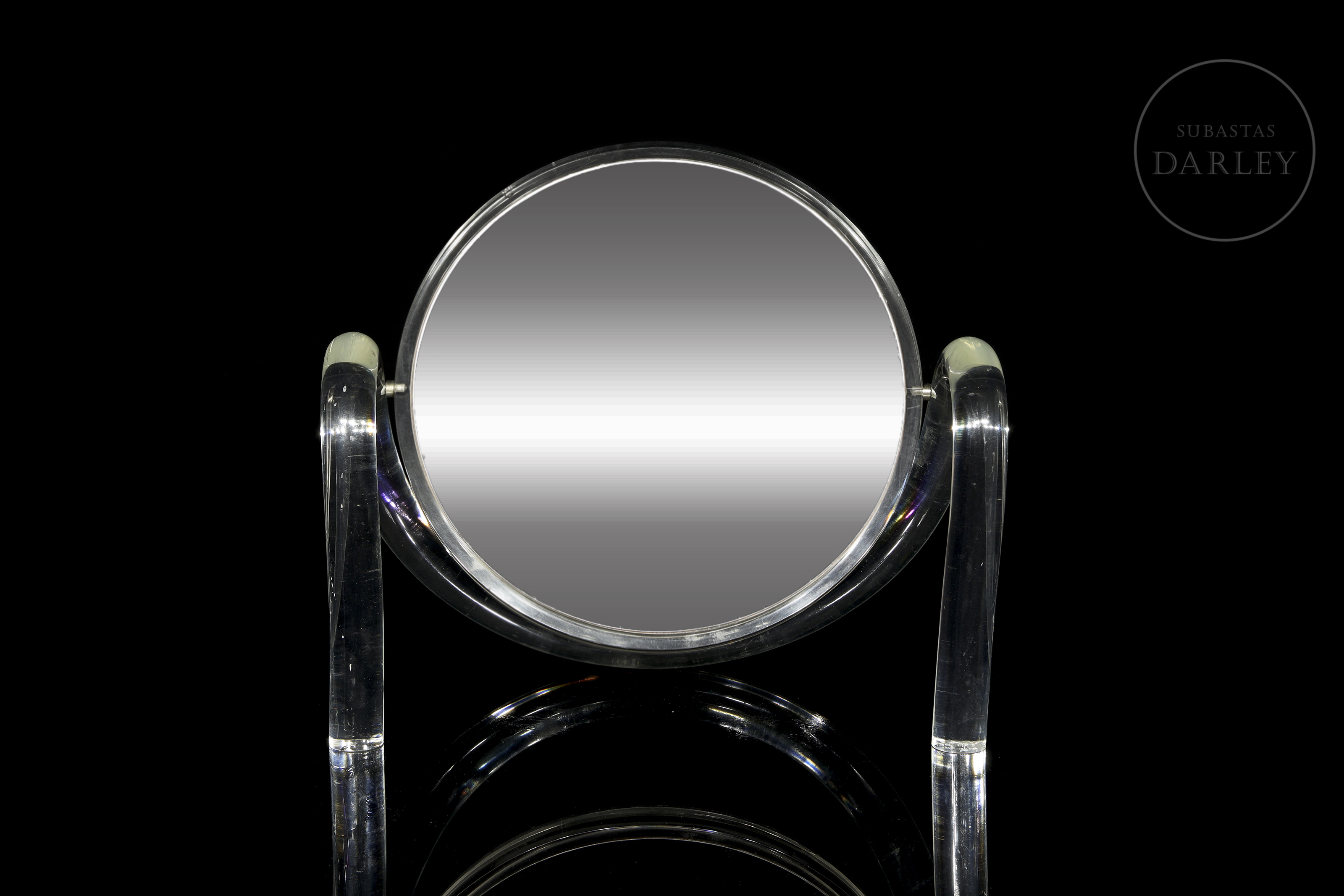 Espejo de doble cara con soporte realizado en metacrilato, siguiendo el estilo de Dorothy Thorpe. Su diseño vintage evoca la estética de las décadas de 1970 y 1980, sin renunciar a la practicidad. Los soportes laterales permiten la rotación continua de 360º de la pieza central. Presenta ligeros desperfectos derivados del uso.