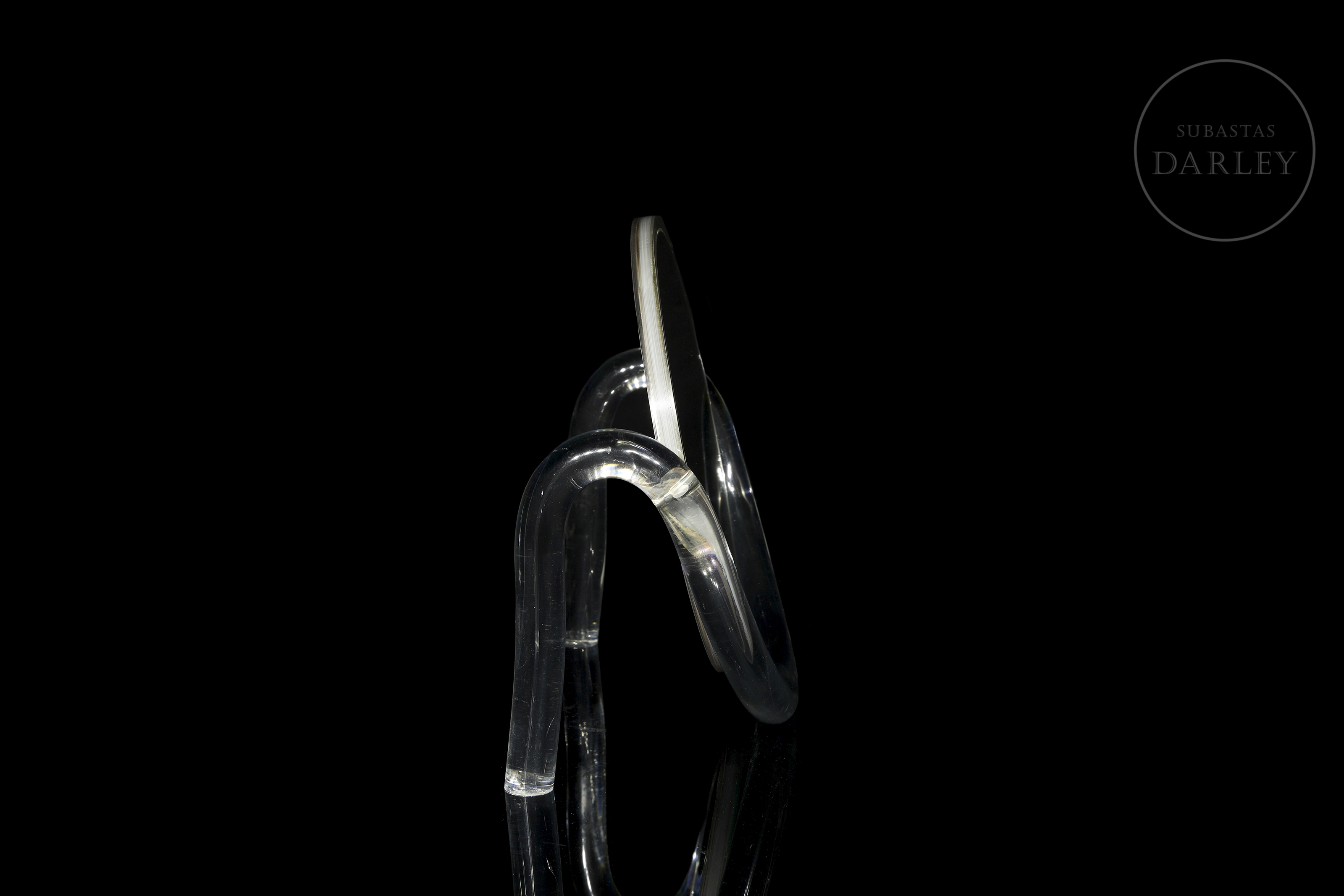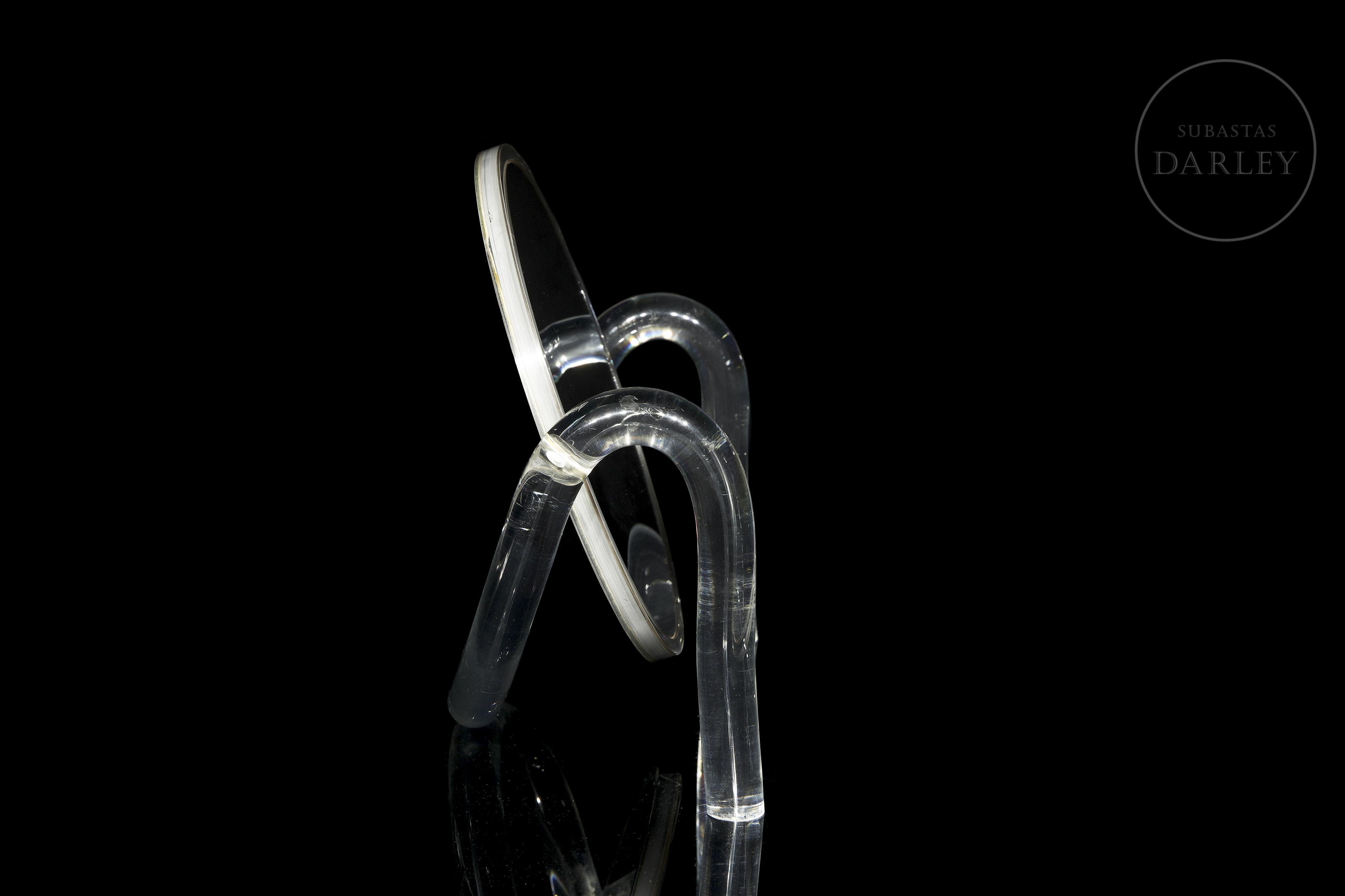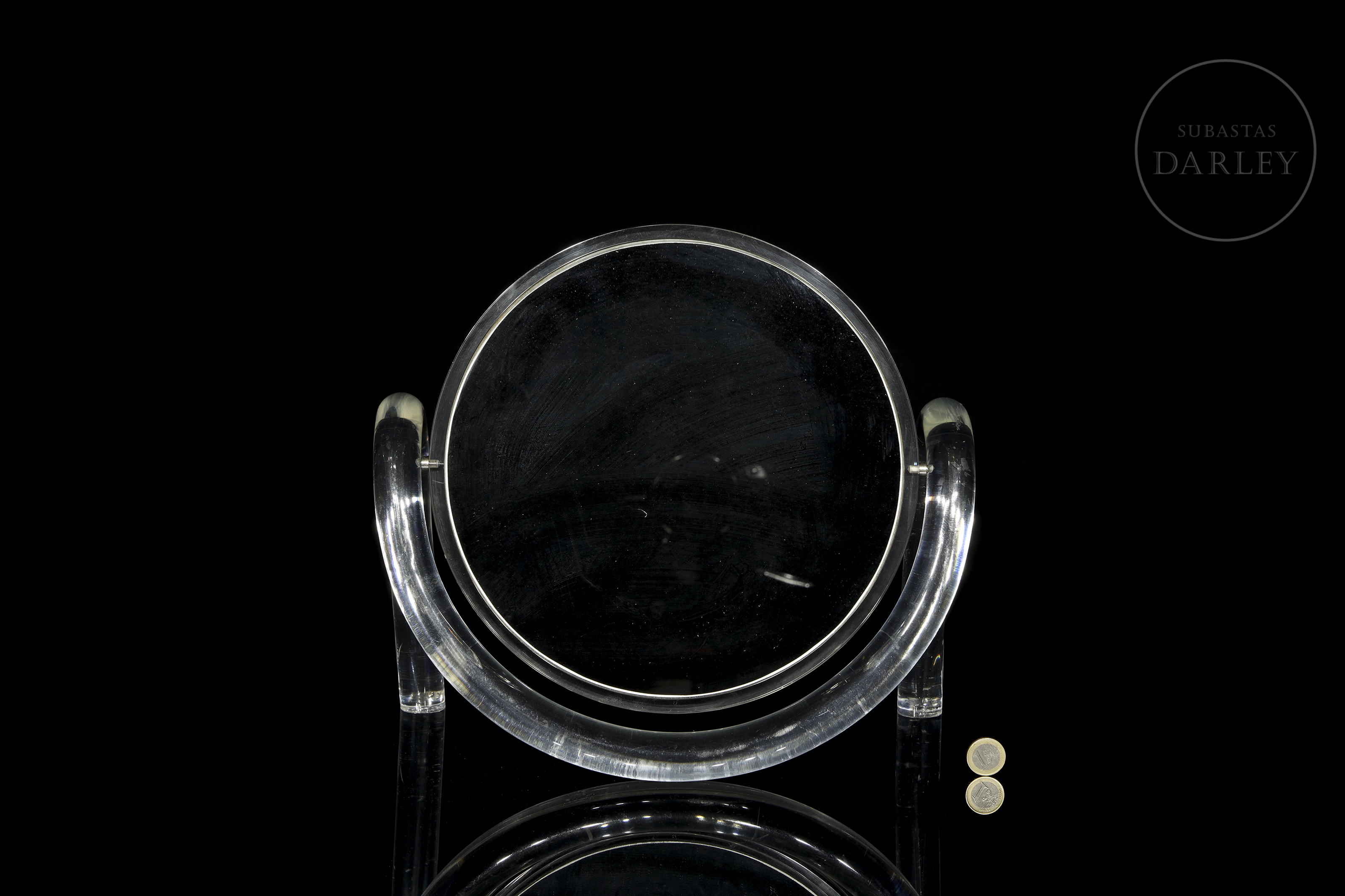 Espejo de doble cara con soporte realizado en metacrilato, siguiendo el estilo de Dorothy Thorpe. Su diseño vintage evoca la estética de las décadas de 1970 y 1980, sin renunciar a la practicidad. Los soportes laterales permiten la rotación continua de 360º de la pieza central. Presenta ligeros desperfectos derivados del uso.