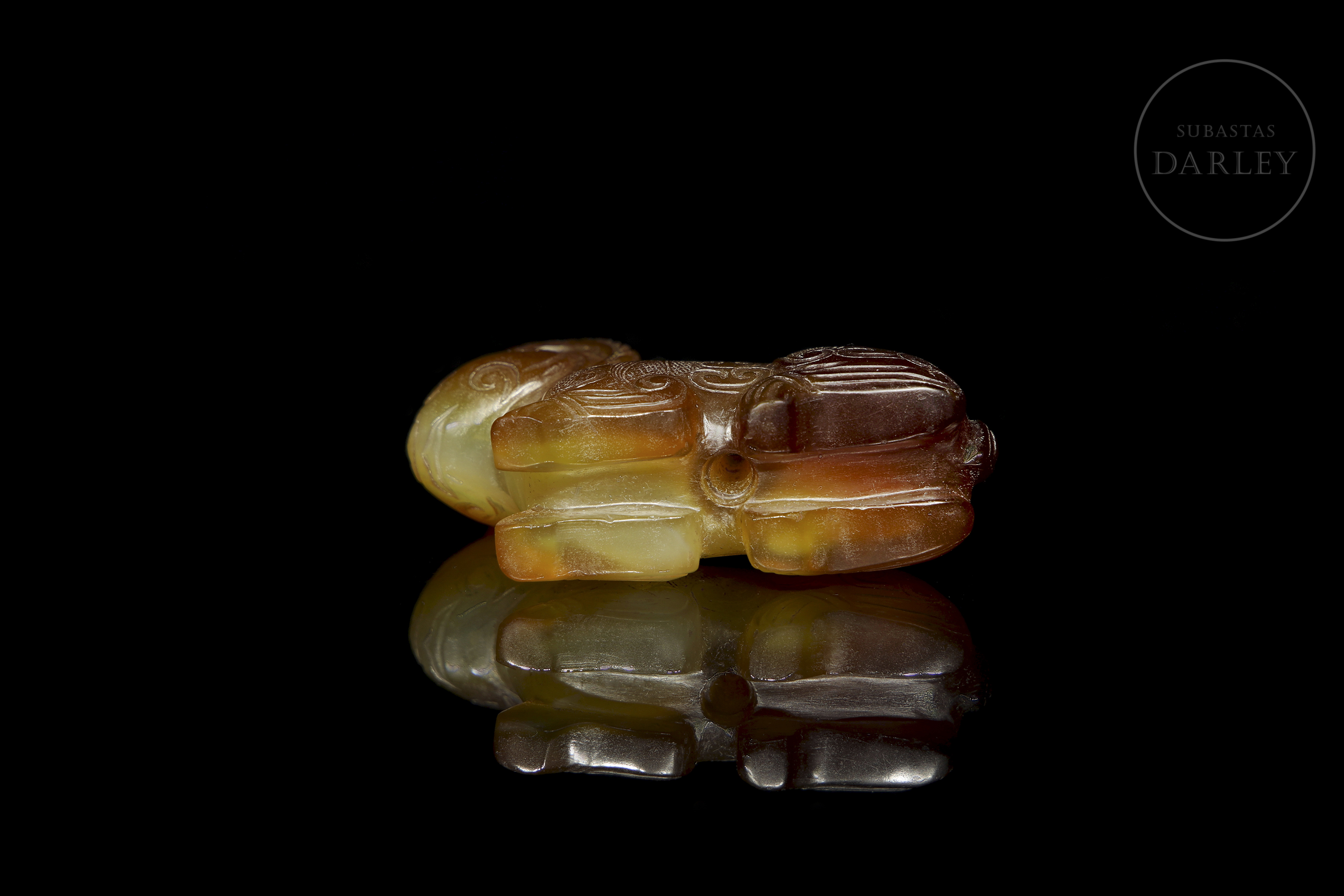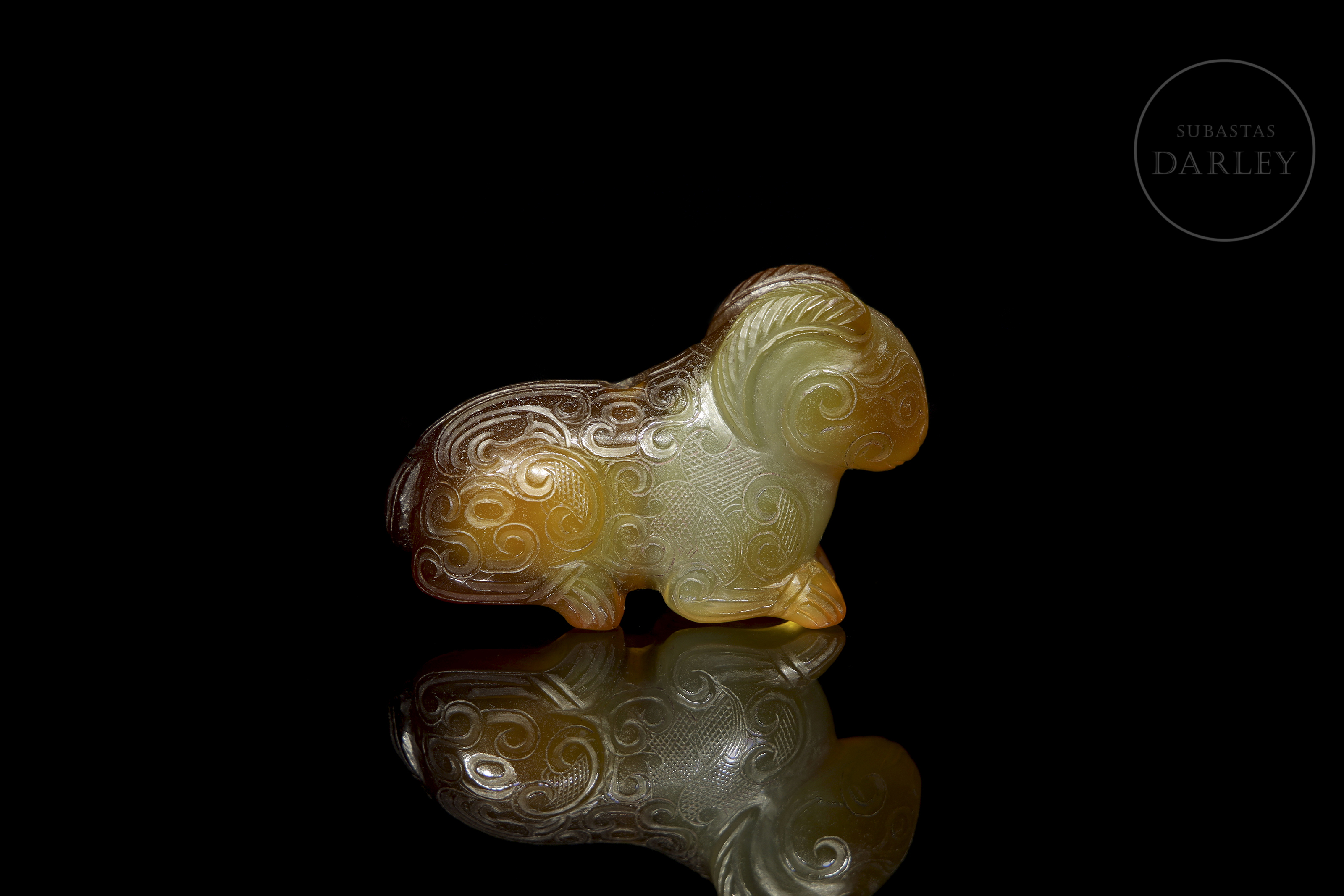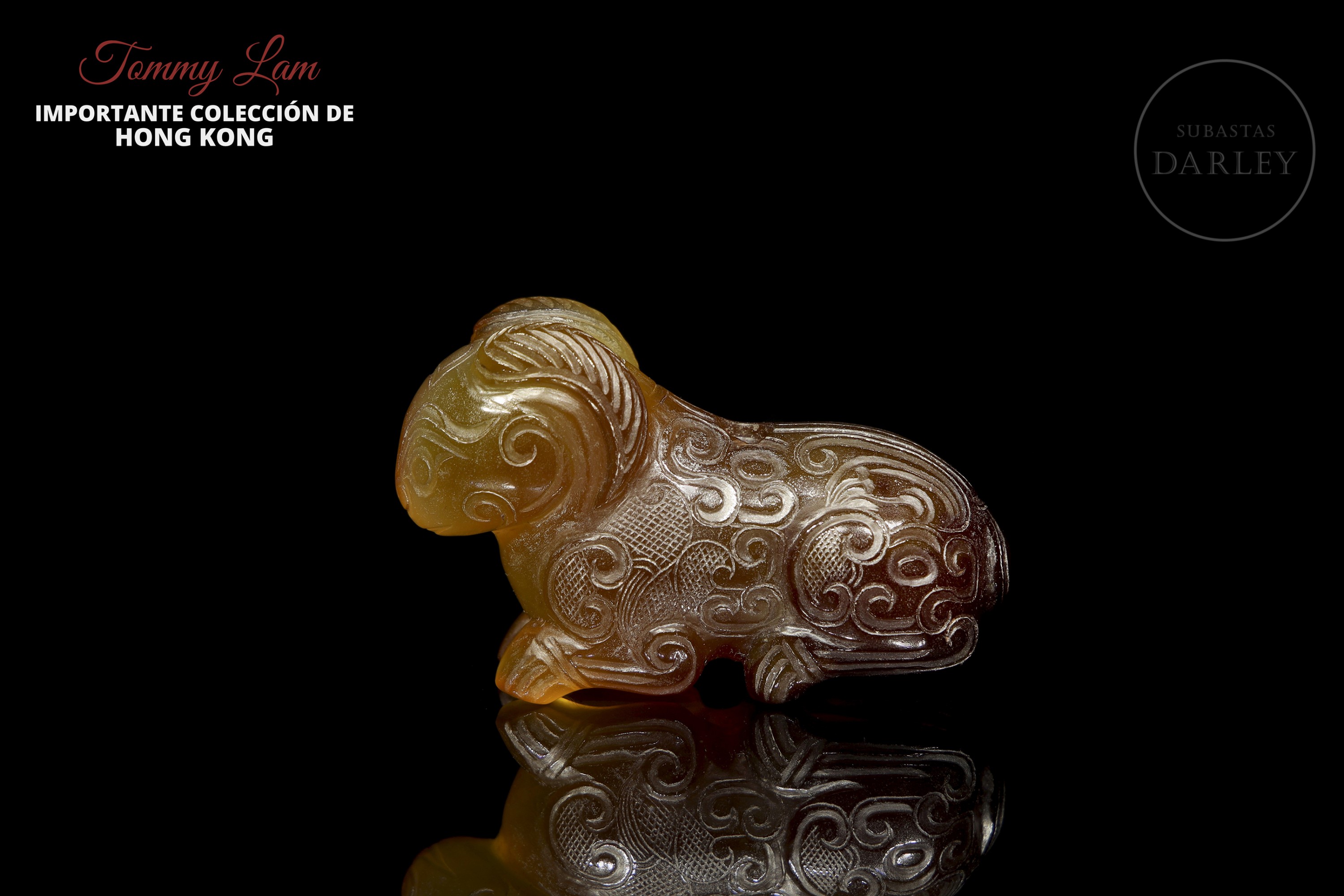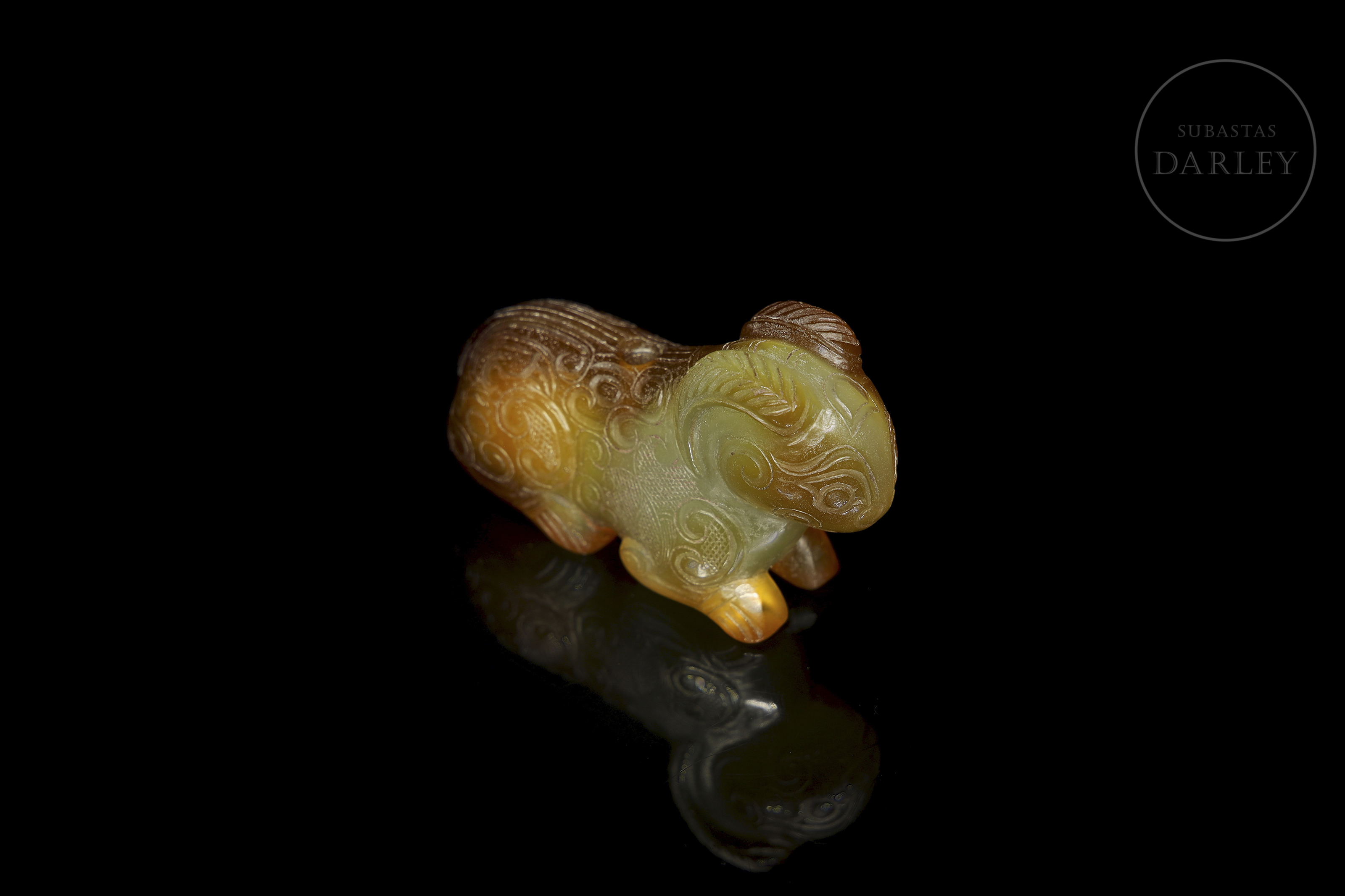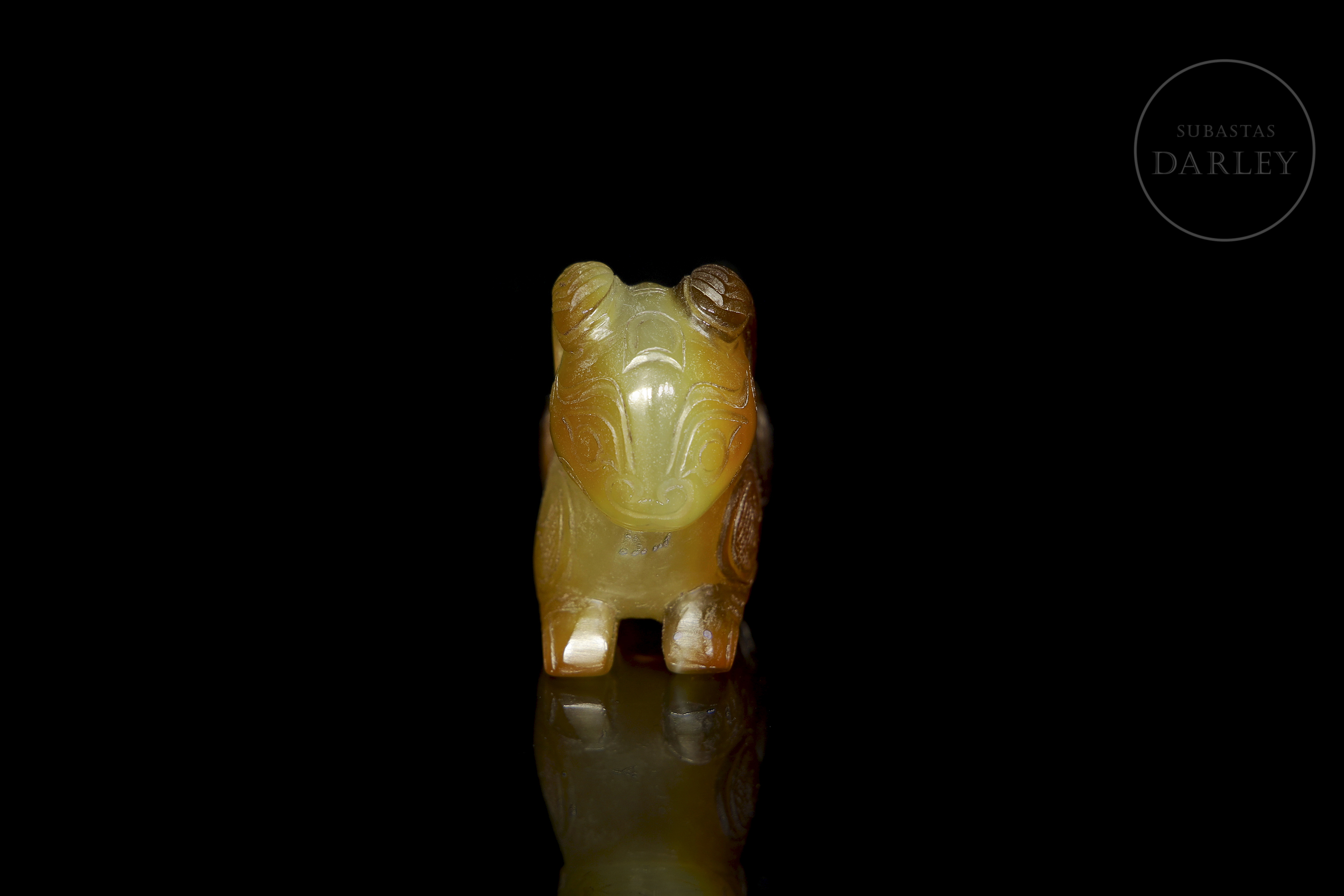 Ágata de tonalidad miel con áreas marrón rojizo y vetas naturales. La obra presenta la talla en bulto redondo de un carnero recostado, de cuerpo compacto y las patas replegadas bajo el vientre. La cabeza muestra unos grandes cuernos estriados que se curvan hacia atrás rodeando las orejas. La superficie se encuentra profusamente decorada con motivos de nubes y roleos incisos, acompañados de zonas con trama de rombos. Muestra pátina por envejecimiento. Dinastía Zhou (1046 a.C. – 256 a.C.) o posterior.