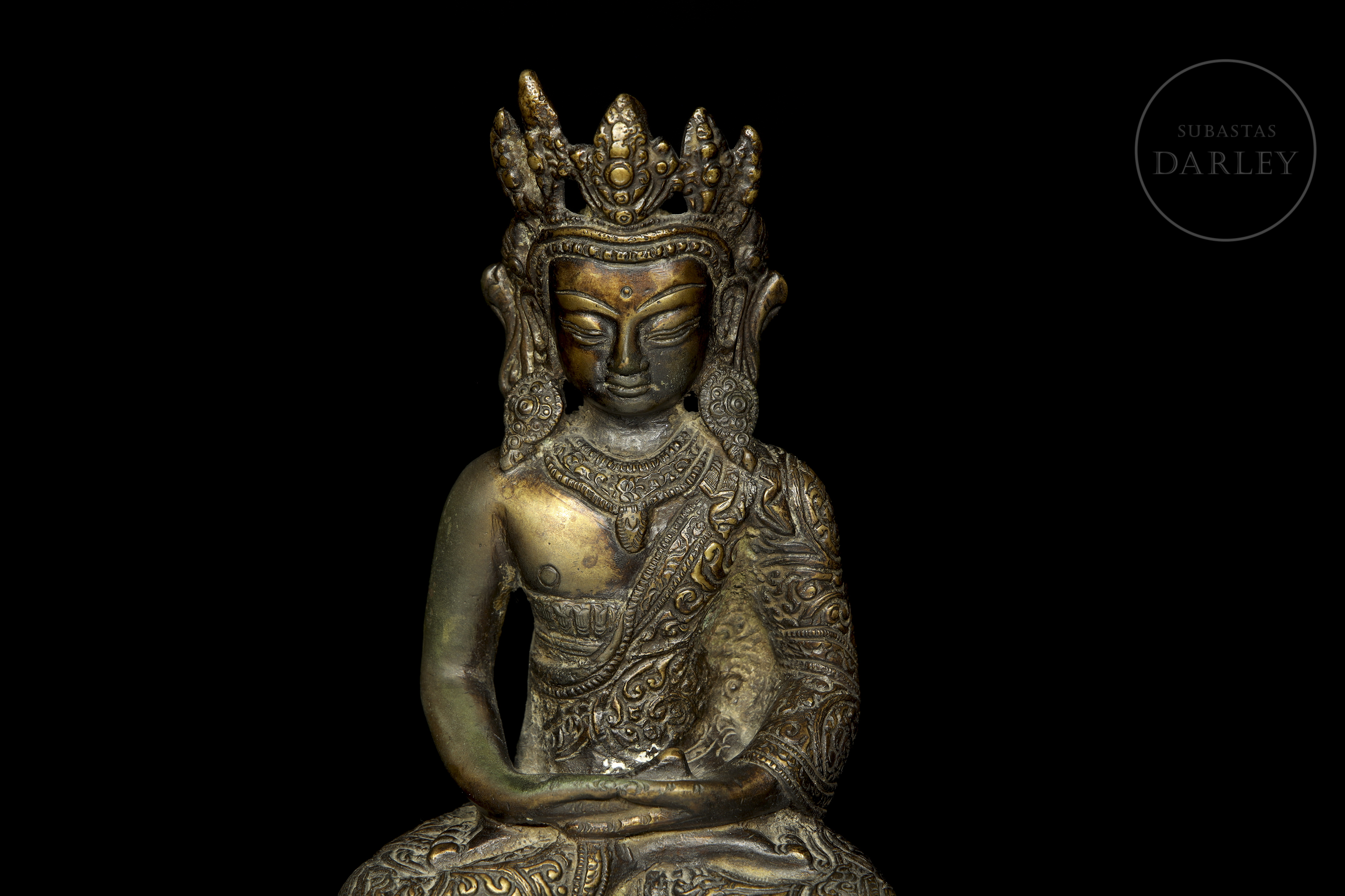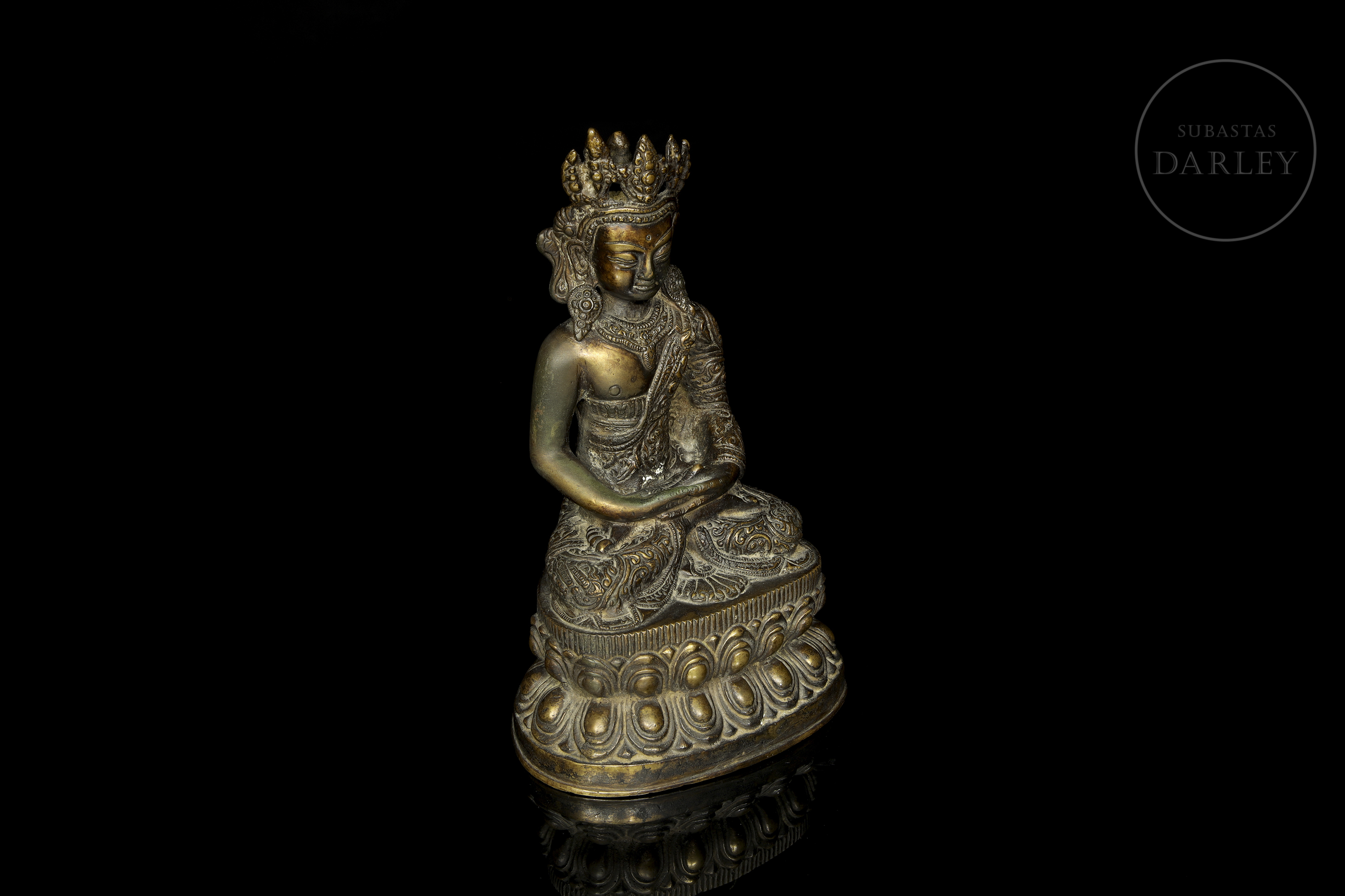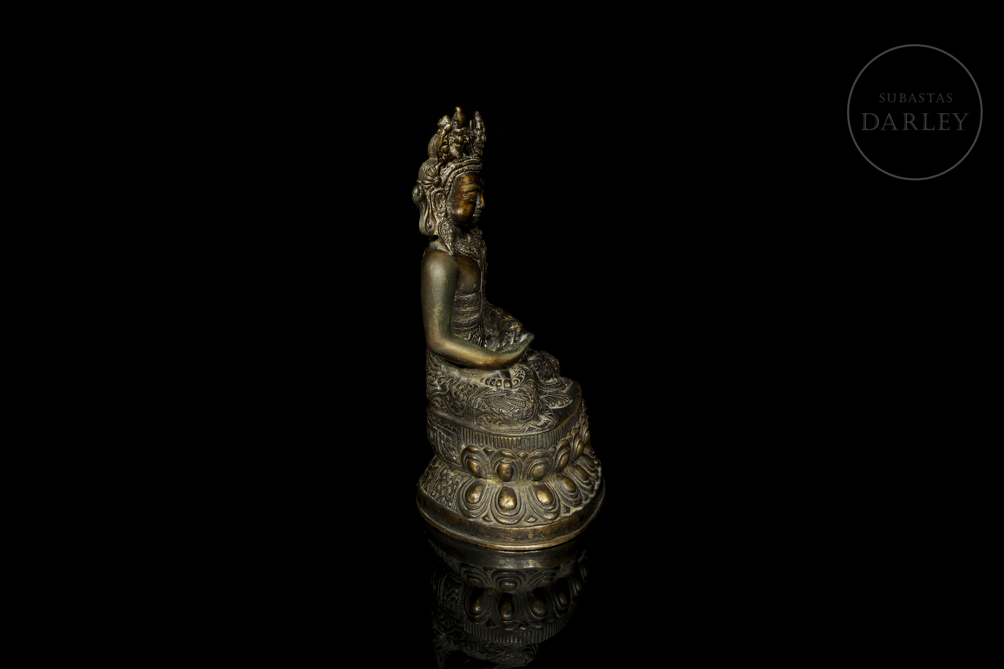Bronce fundido con pátina oscura y sutiles irisaciones doradas. Representa a una deidad budista en posición de meditación sobre un trono de loto de doble pétalo, con las manos en dhyana mudra. La figura luce una elaborada corona de cinco puntas y ricas vestiduras con motivos florales.