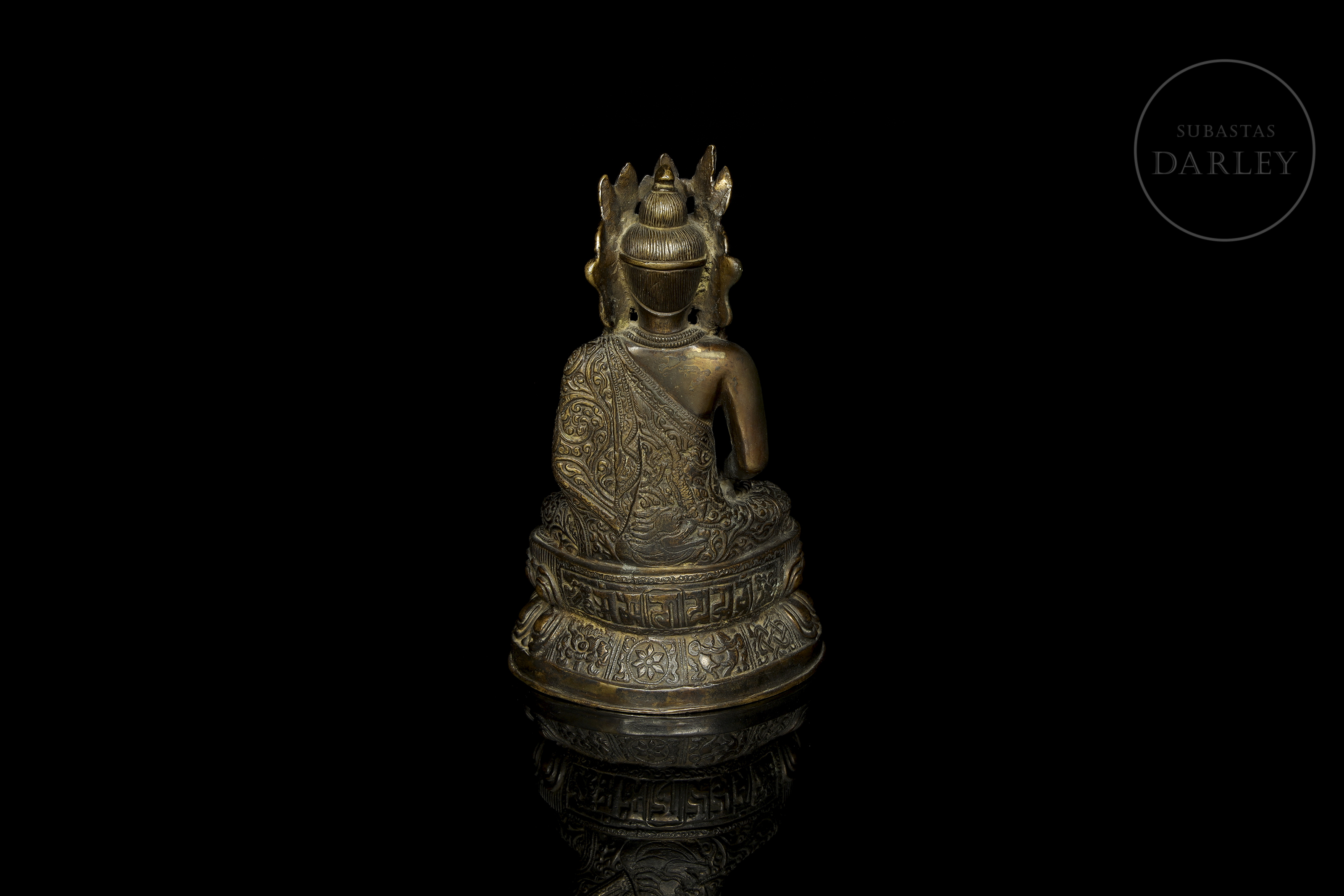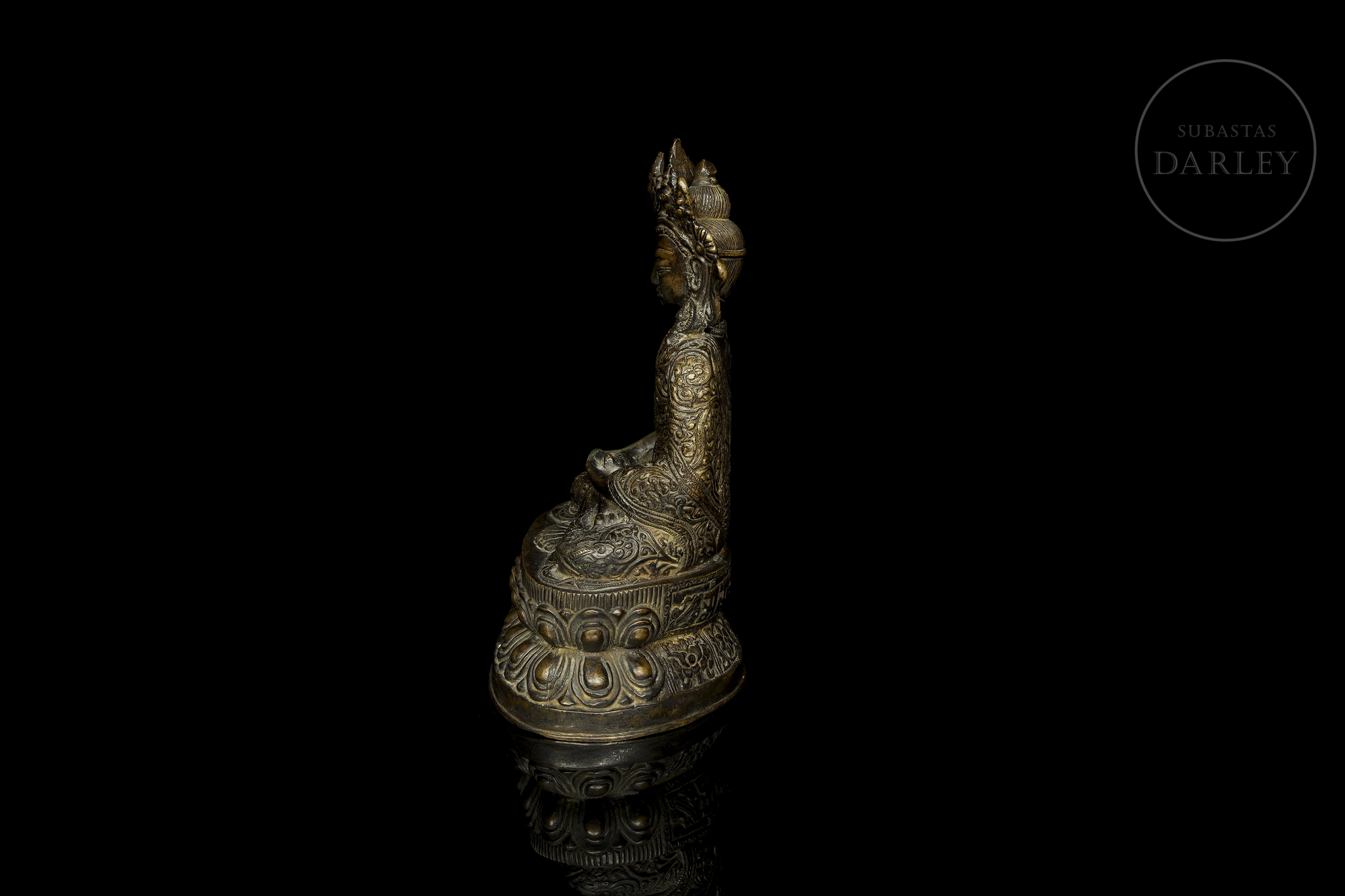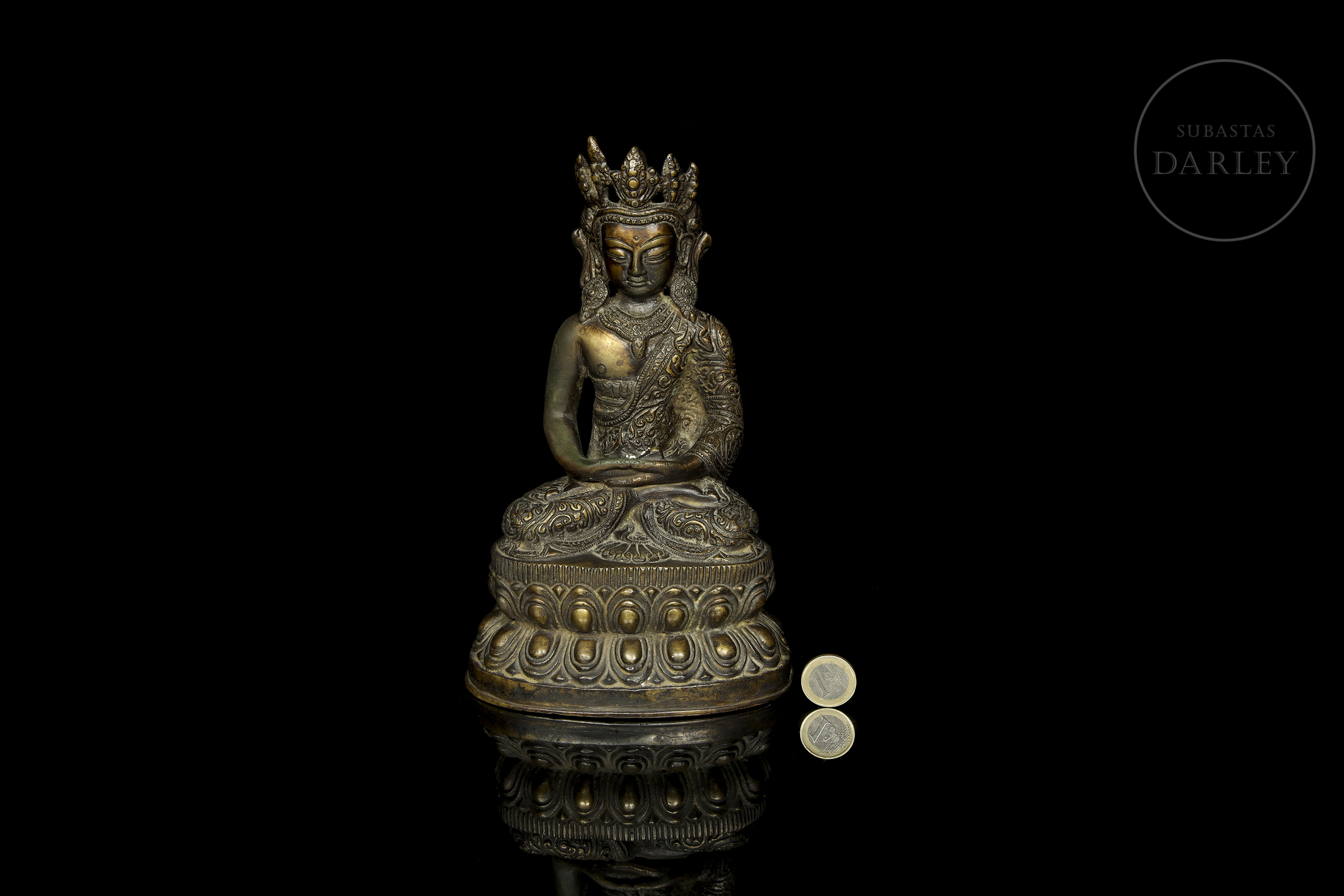 Bronce fundido con pátina oscura y sutiles irisaciones doradas. Representa a una deidad budista en posición de meditación sobre un trono de loto de doble pétalo, con las manos en dhyana mudra. La figura luce una elaborada corona de cinco puntas y ricas vestiduras con motivos florales.