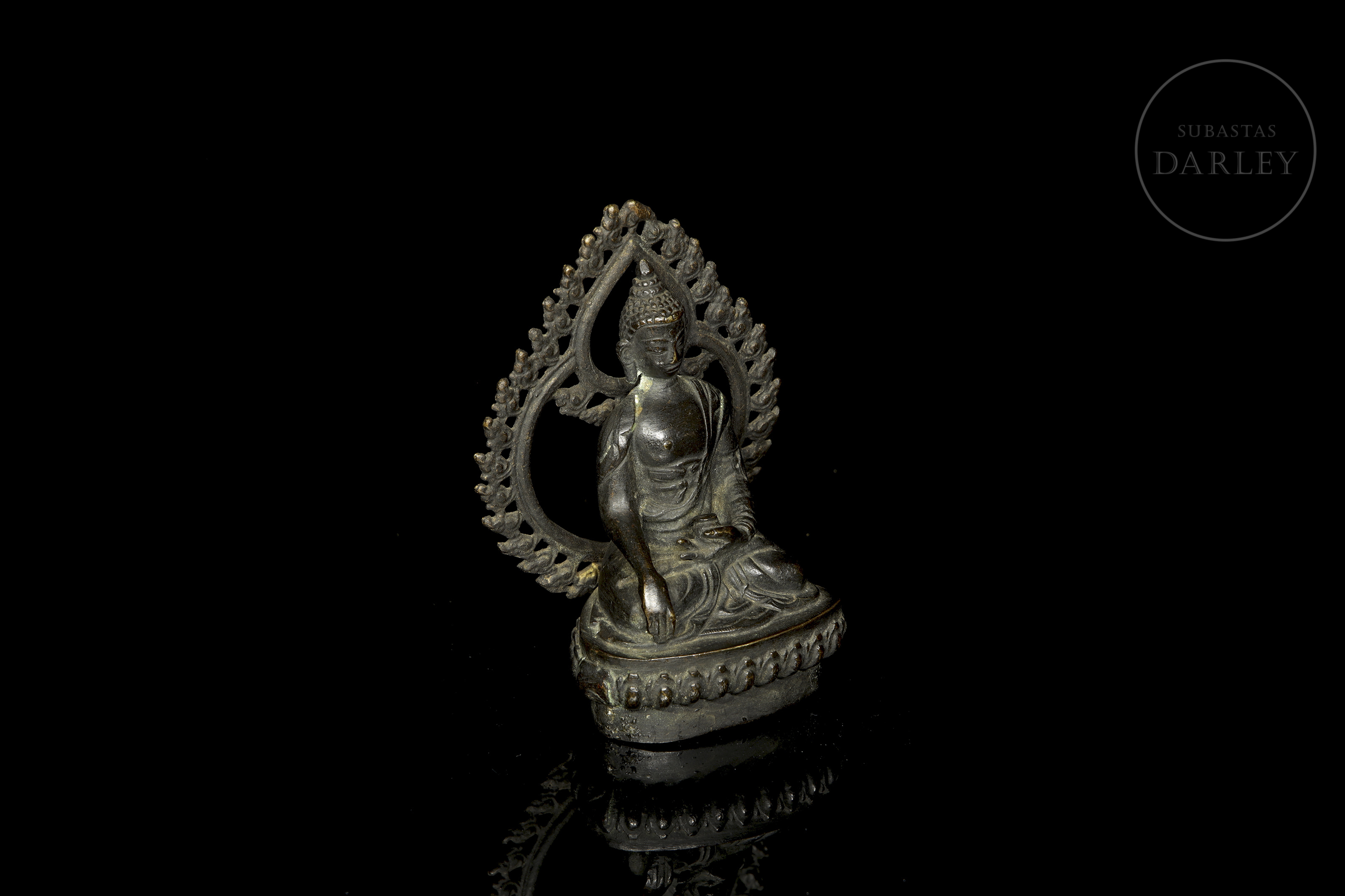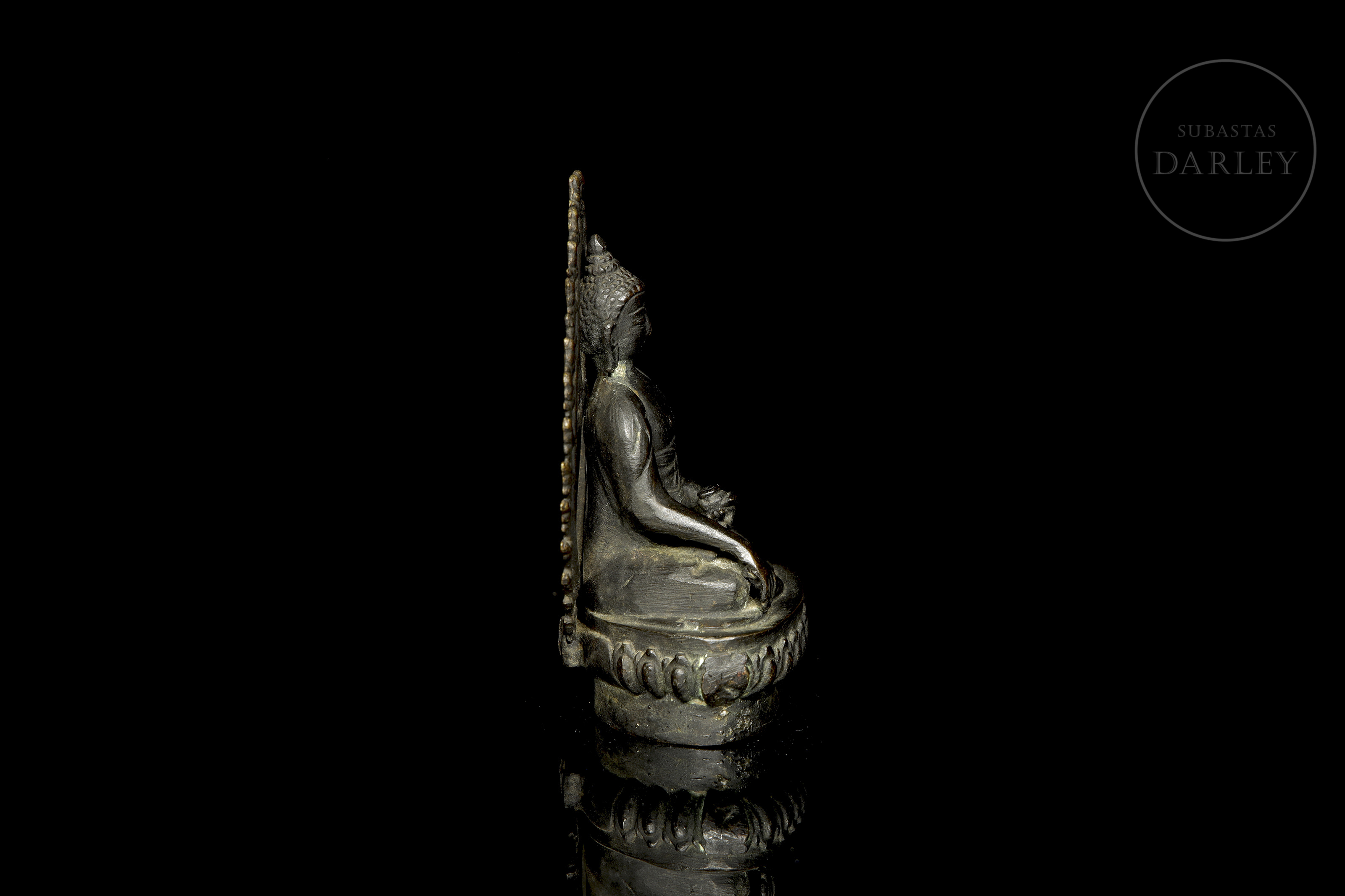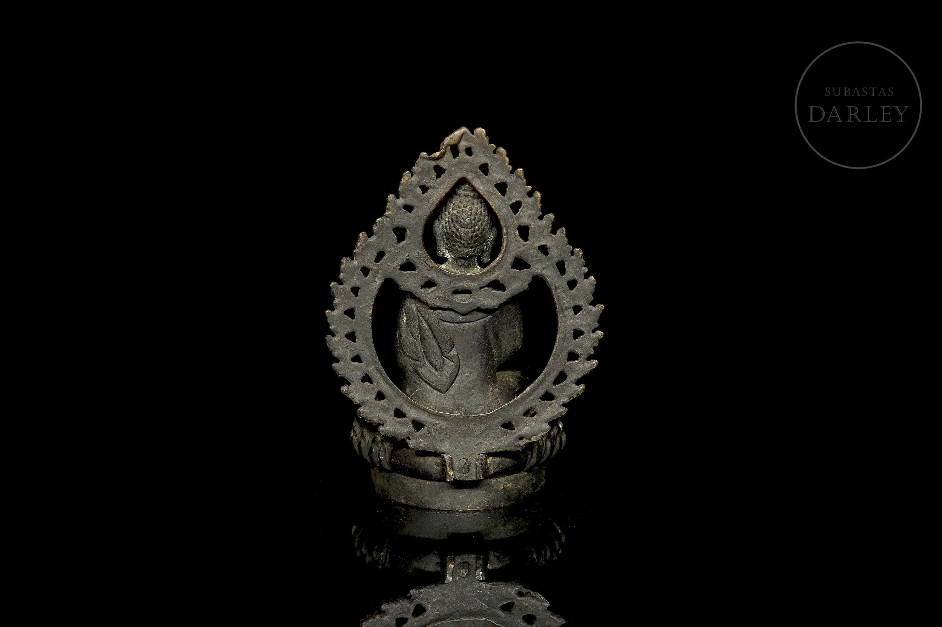Realizada en bronce fundido con una pátina oscura. Representa al Buda histórico, Sakyamuni, en posición de meditación sobre un trono de loto de doble pétalo, con la mano derecha en bhumisparsha mudra. La figura se enmarca tras una gran mandorla decorada con motivos flamígeros y volutas.