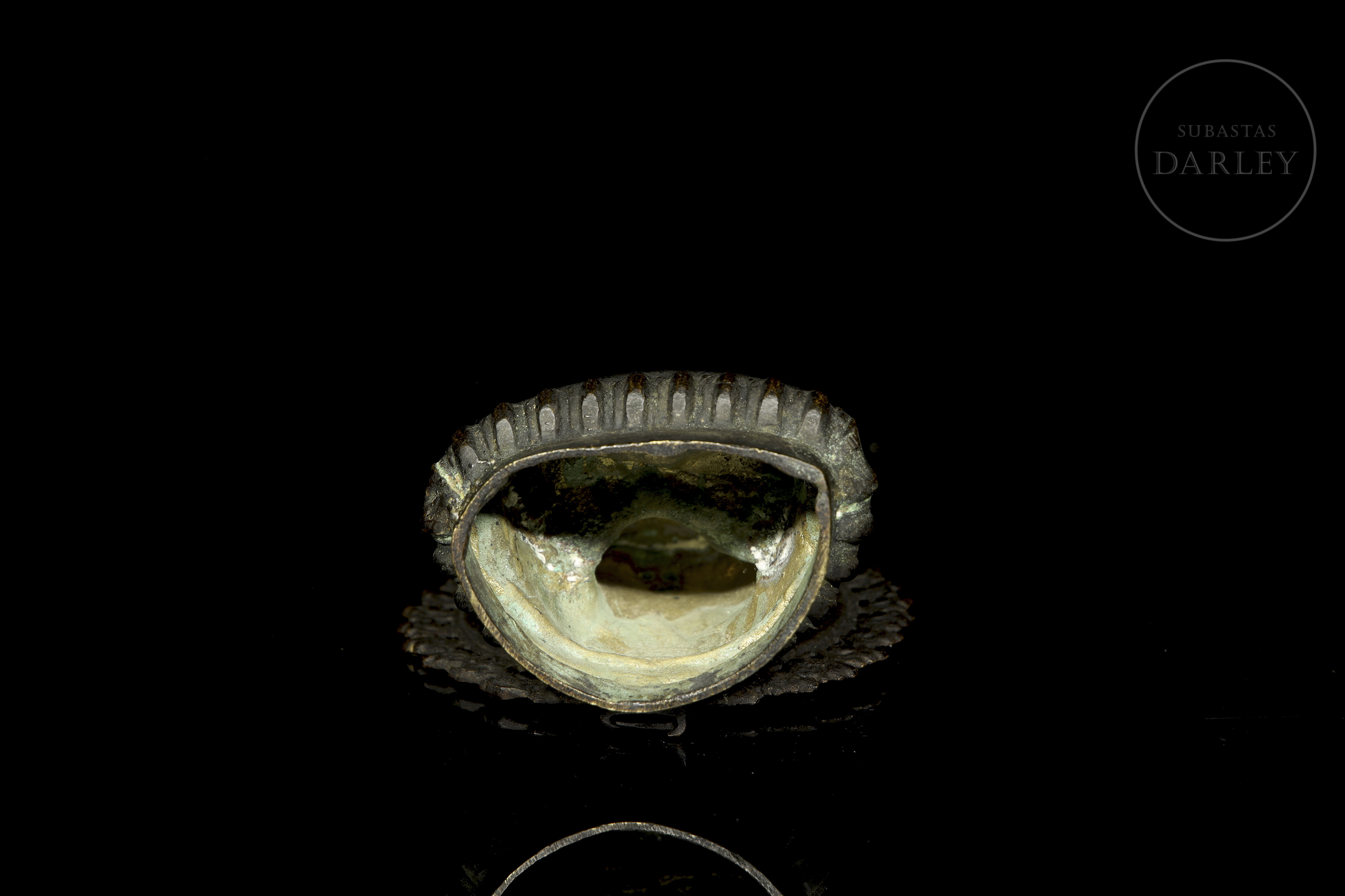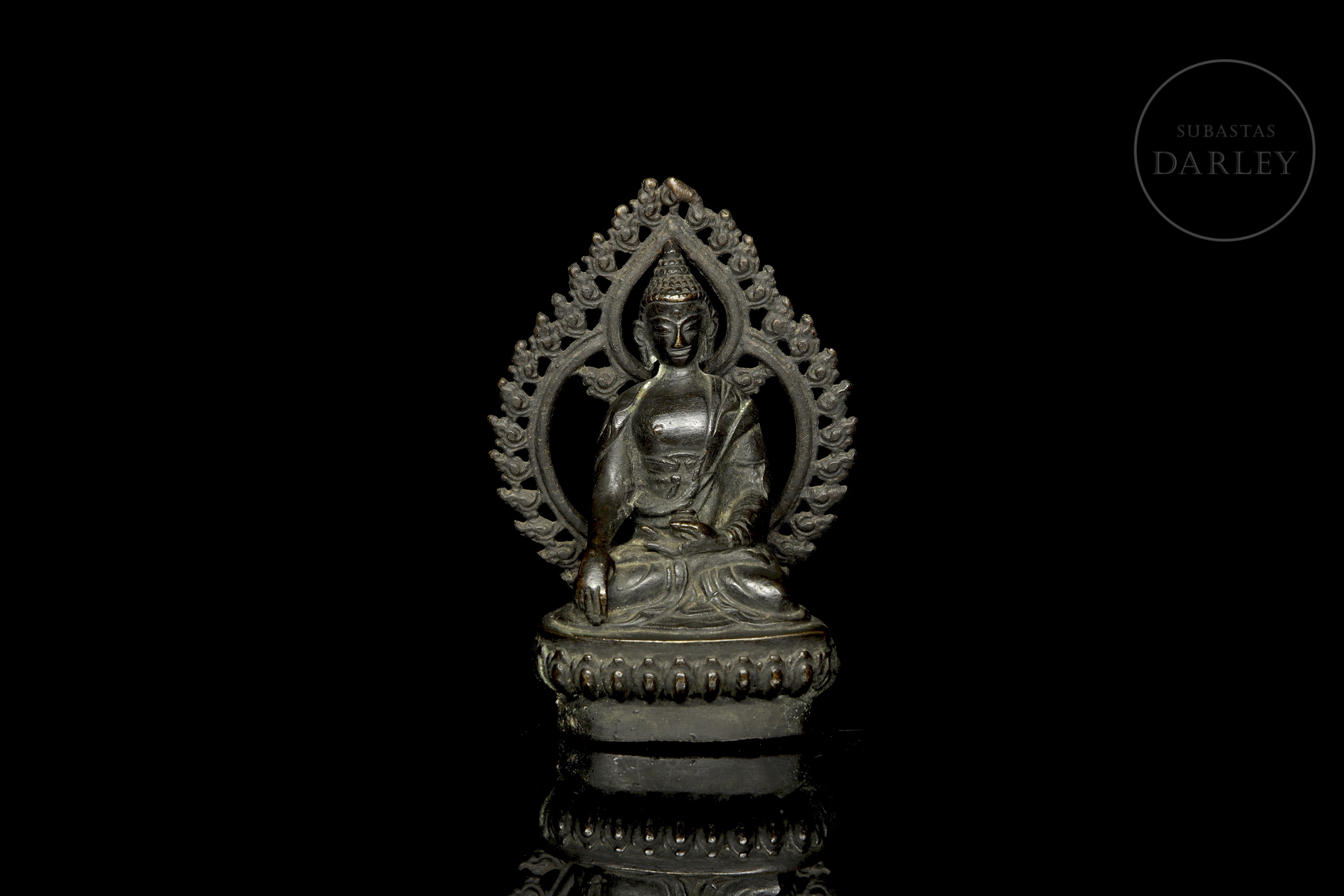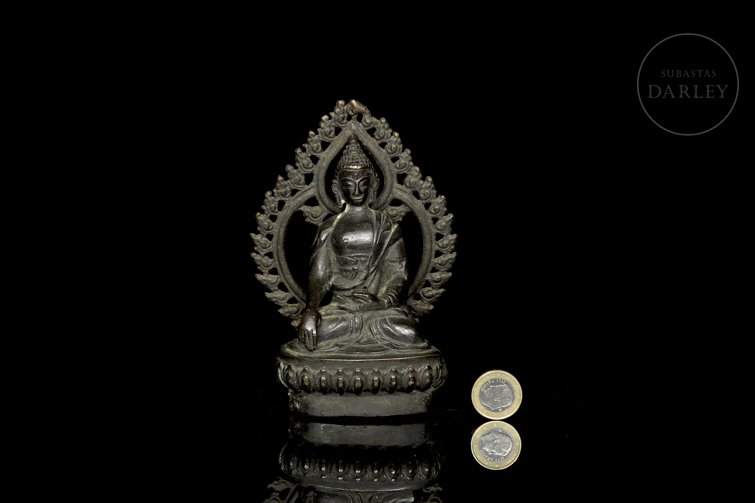 Realizada en bronce fundido con una pátina oscura. Representa al Buda histórico, Sakyamuni, en posición de meditación sobre un trono de loto de doble pétalo, con la mano derecha en bhumisparsha mudra. La figura se enmarca tras una gran mandorla decorada con motivos flamígeros y volutas.