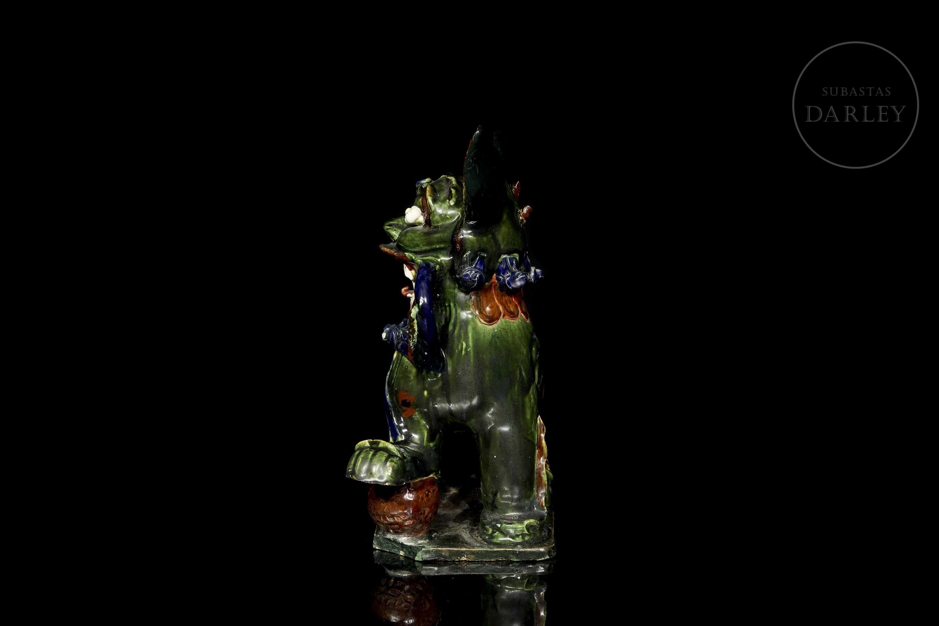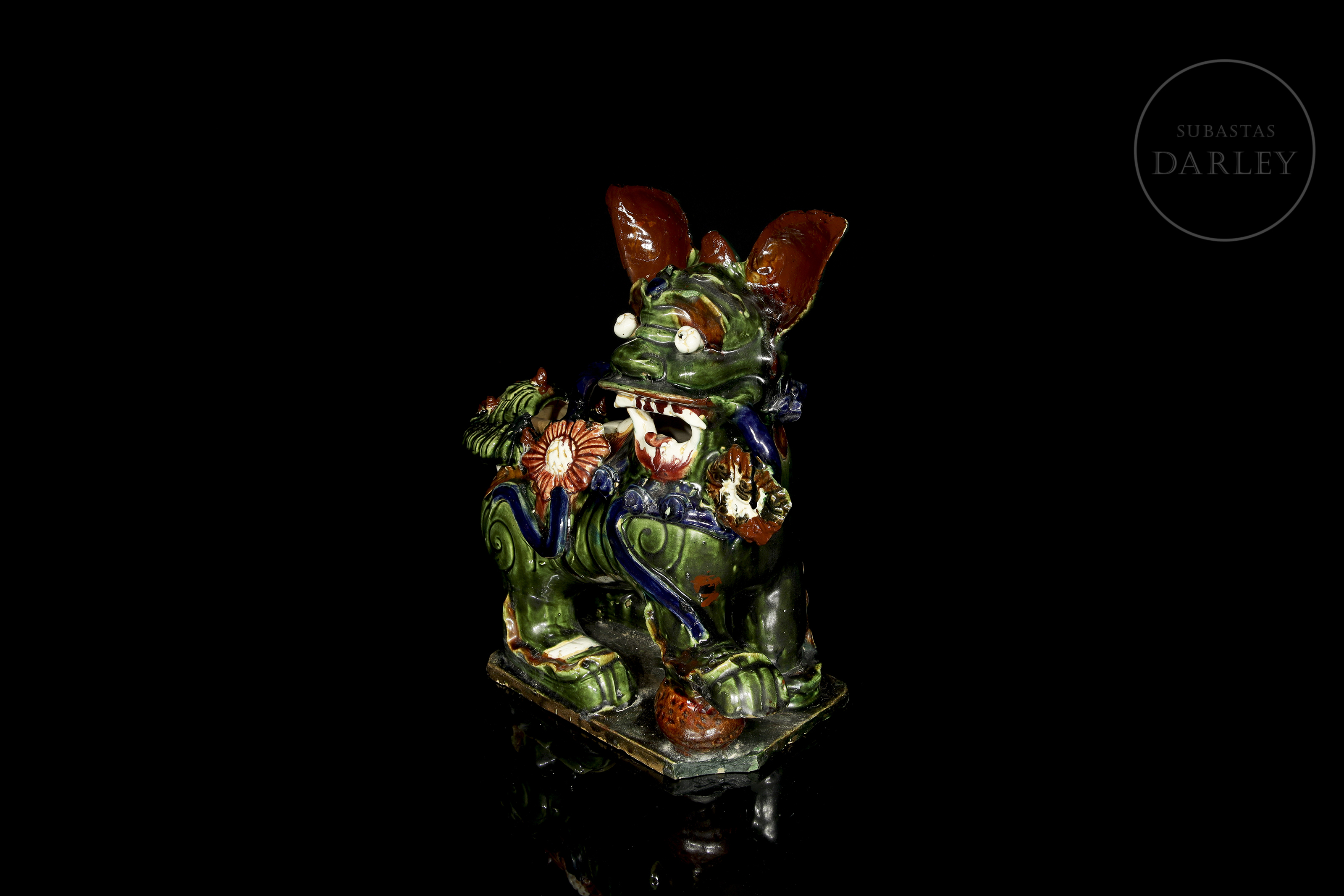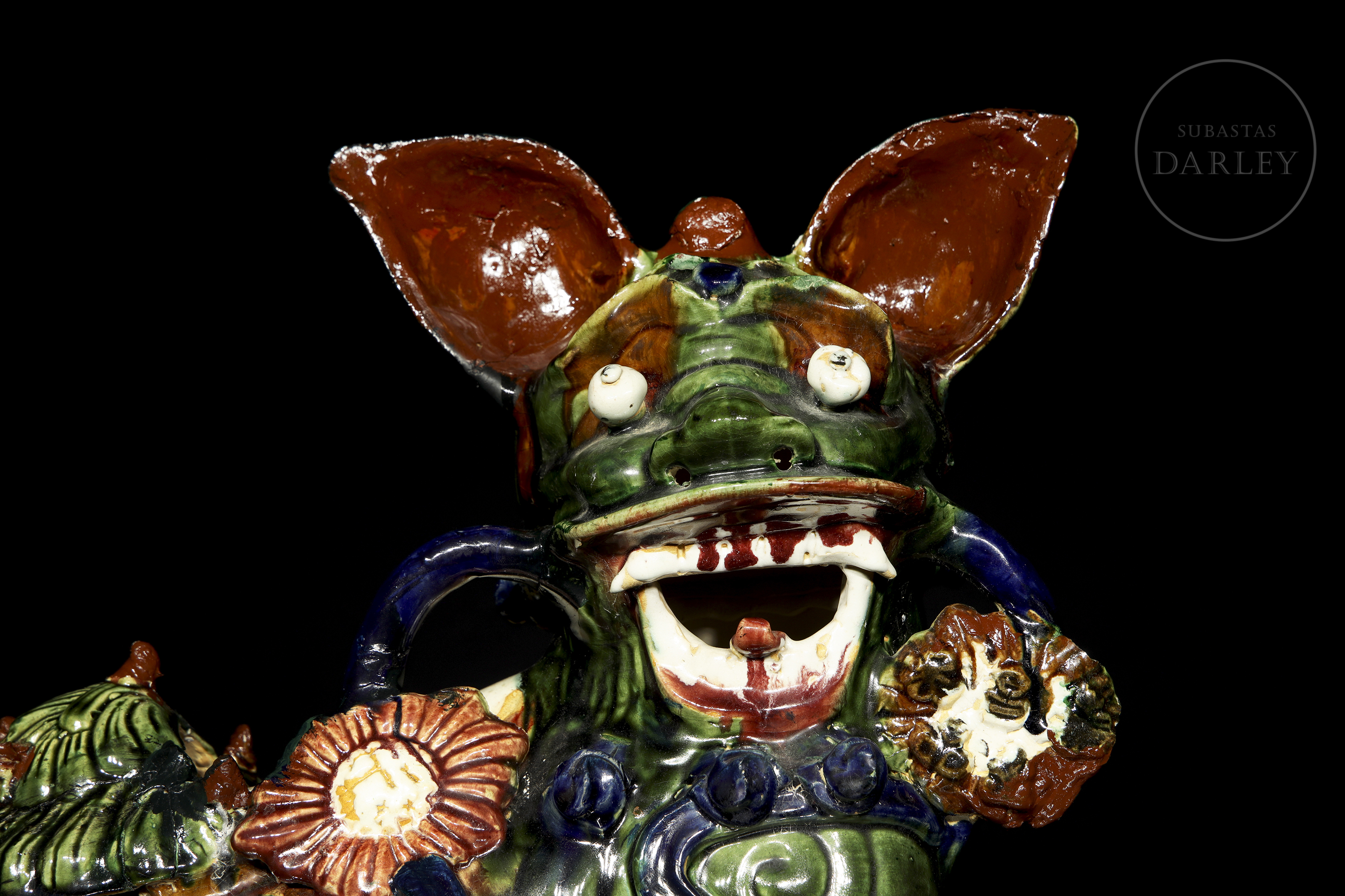 Realizada en cerámica esmaltada con una combinación de colores azul cobalto, verde y amarillo ocre. La figura representa a un perro guardián (shishi) en actitud dinámica, con una pata apoyada sobre una esfera calada. El diseño destaca por la melena, la cola flameante y una expresión facial vigorosa.