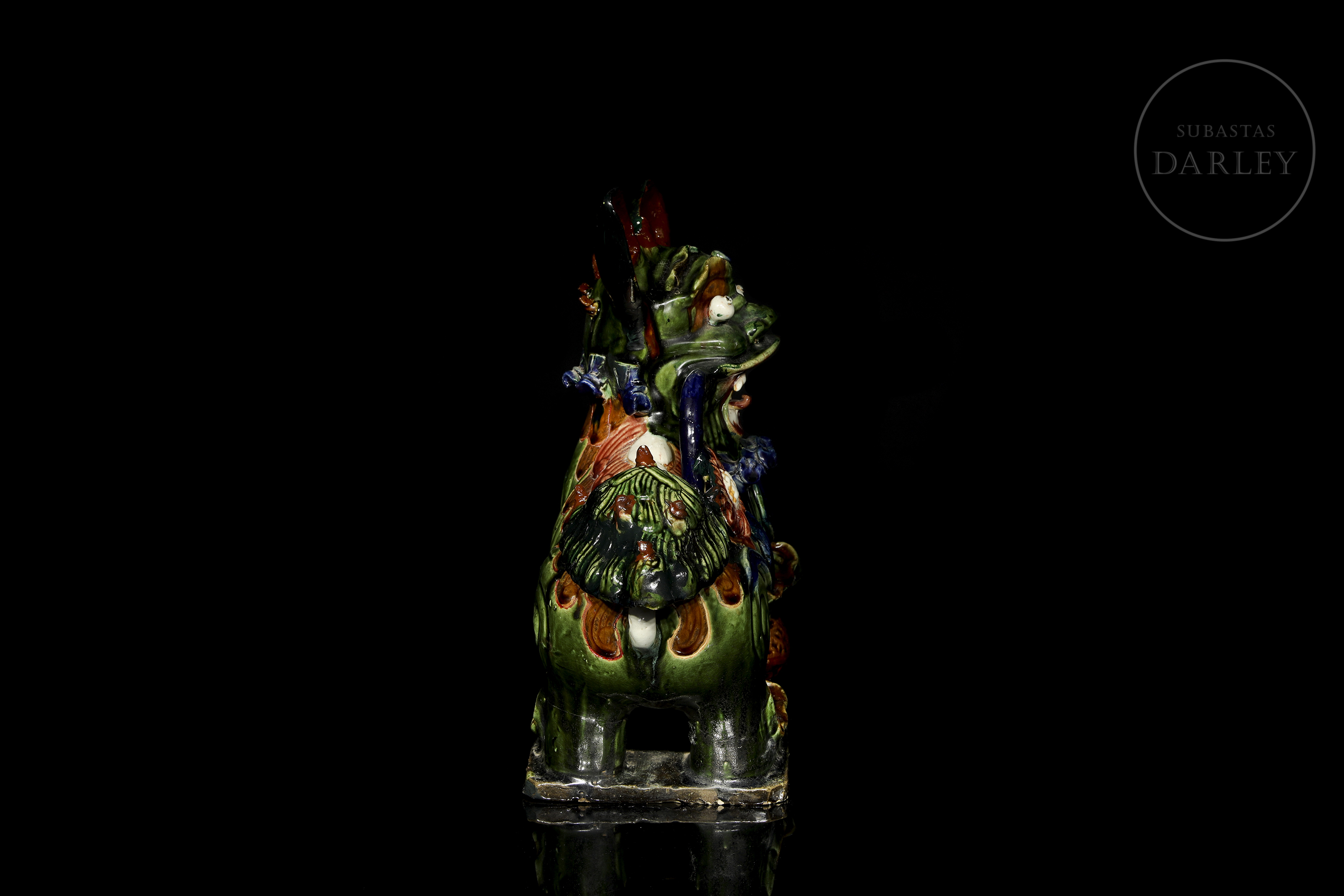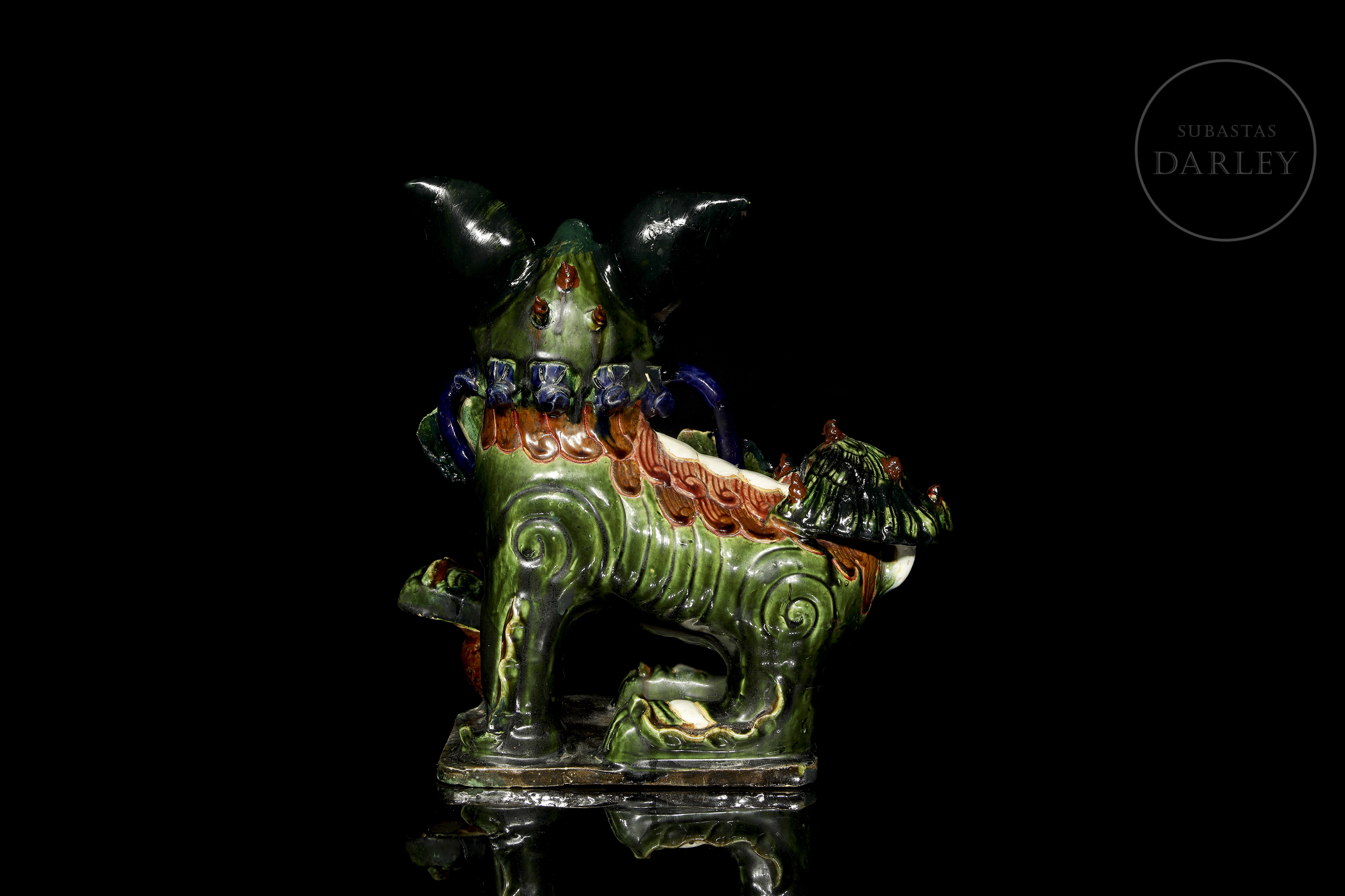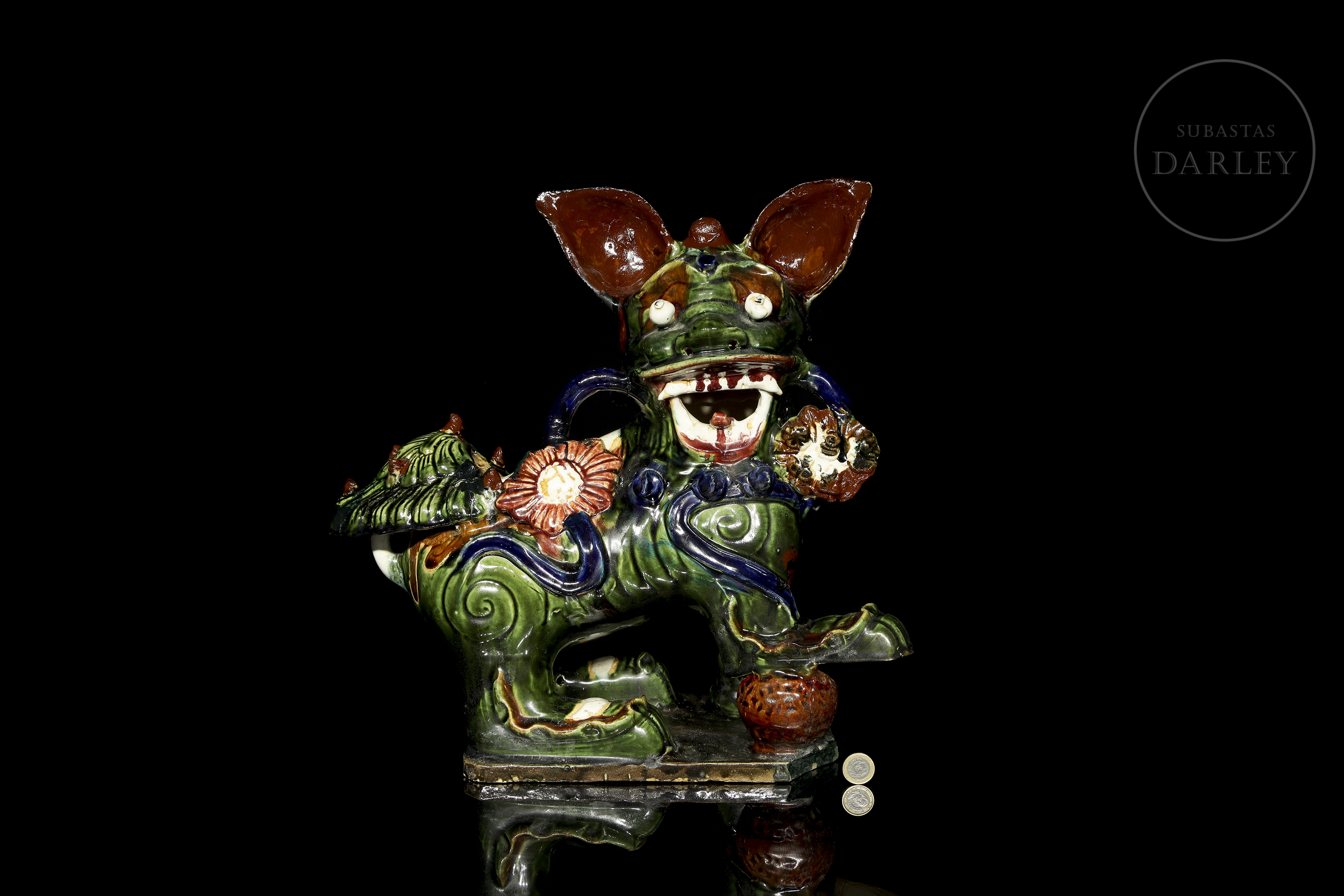 Realizada en cerámica esmaltada con una combinación de colores azul cobalto, verde y amarillo ocre. La figura representa a un perro guardián (shishi) en actitud dinámica, con una pata apoyada sobre una esfera calada. El diseño destaca por la melena, la cola flameante y una expresión facial vigorosa.
