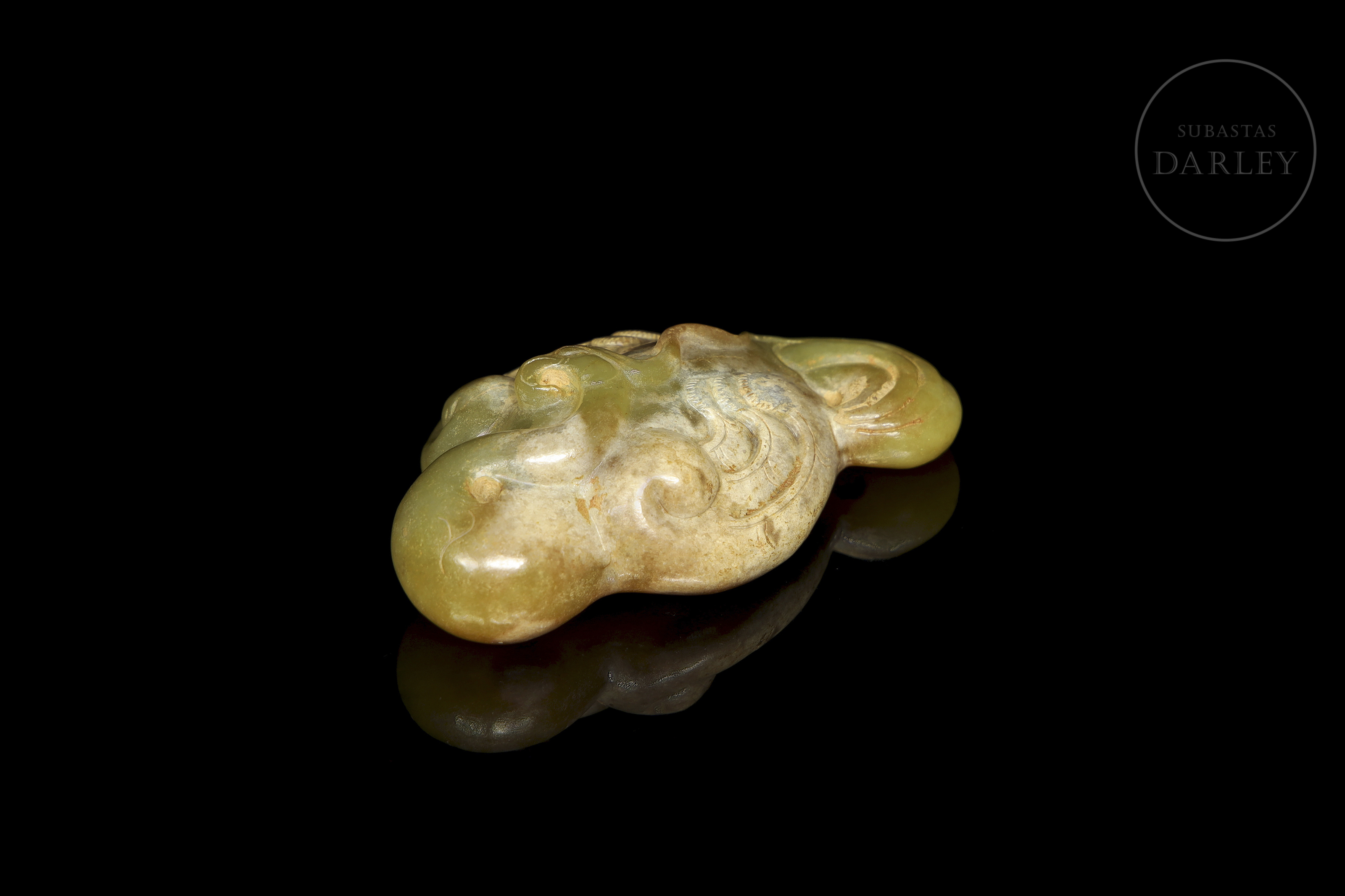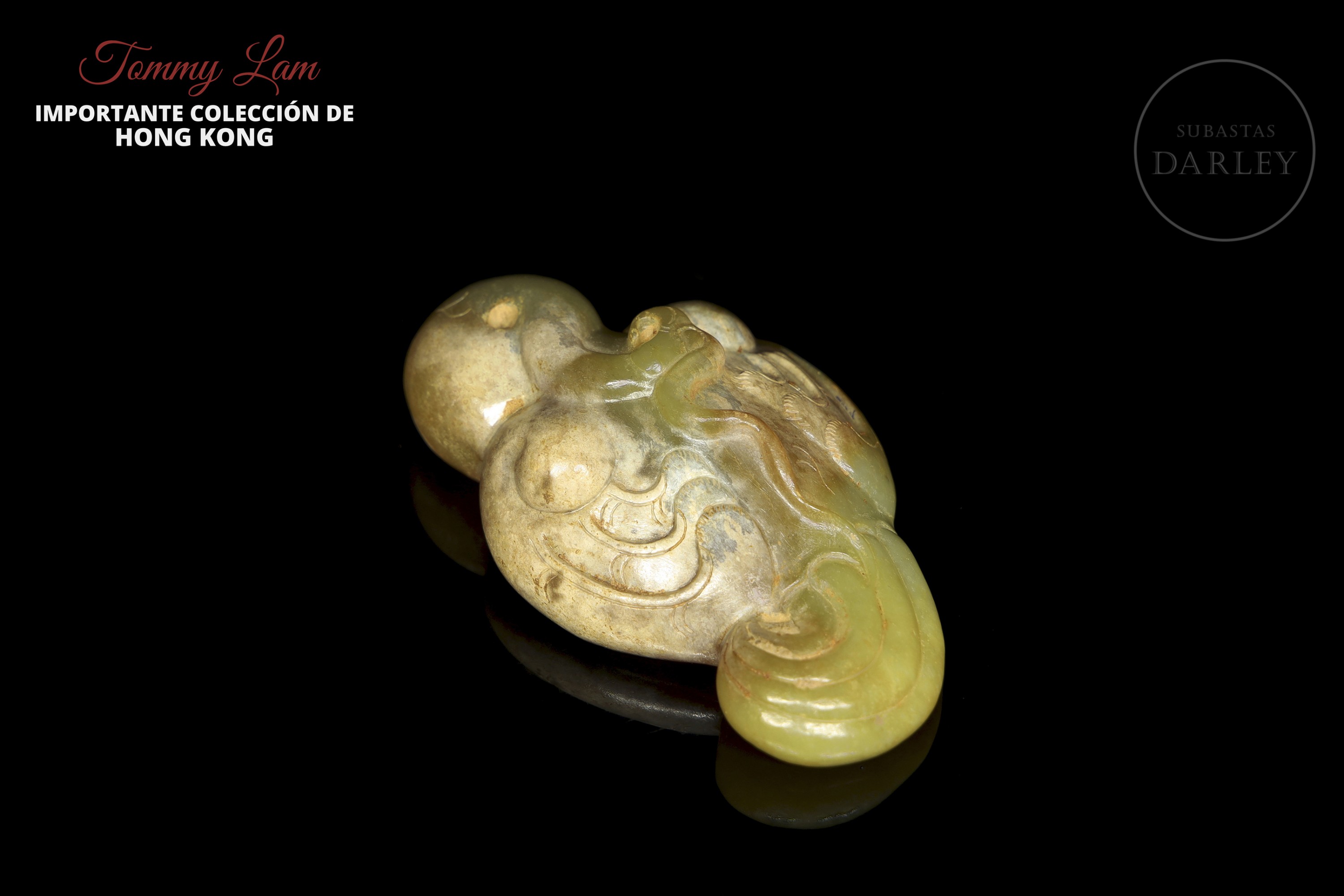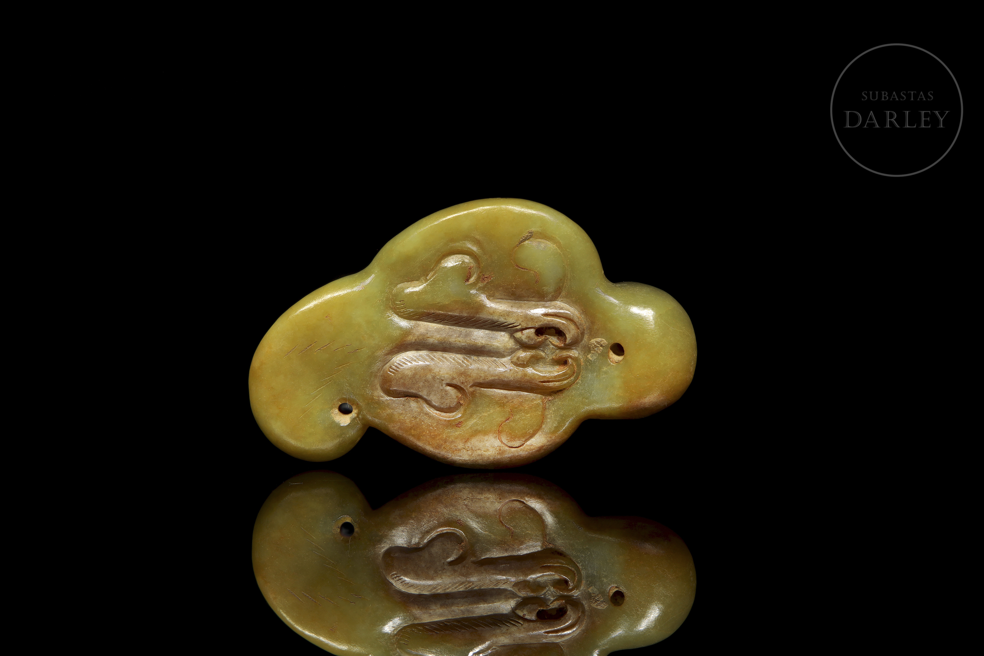 Jade de tono amarillo verdoso con notable pátina y alteraciones minerales en tonos ocre y blanco. La pieza representa un ave mitológica en posición compacta, con alas plegadas y cola curva. Destaca la talla en bajorrelieve con motivos de volutas espirales y finas incisiones que detallan el plumaje. Presenta pequeñas perforaciones para su suspensión. Dinastía Han (206 a.C. – 220 d.C.) o posterior.