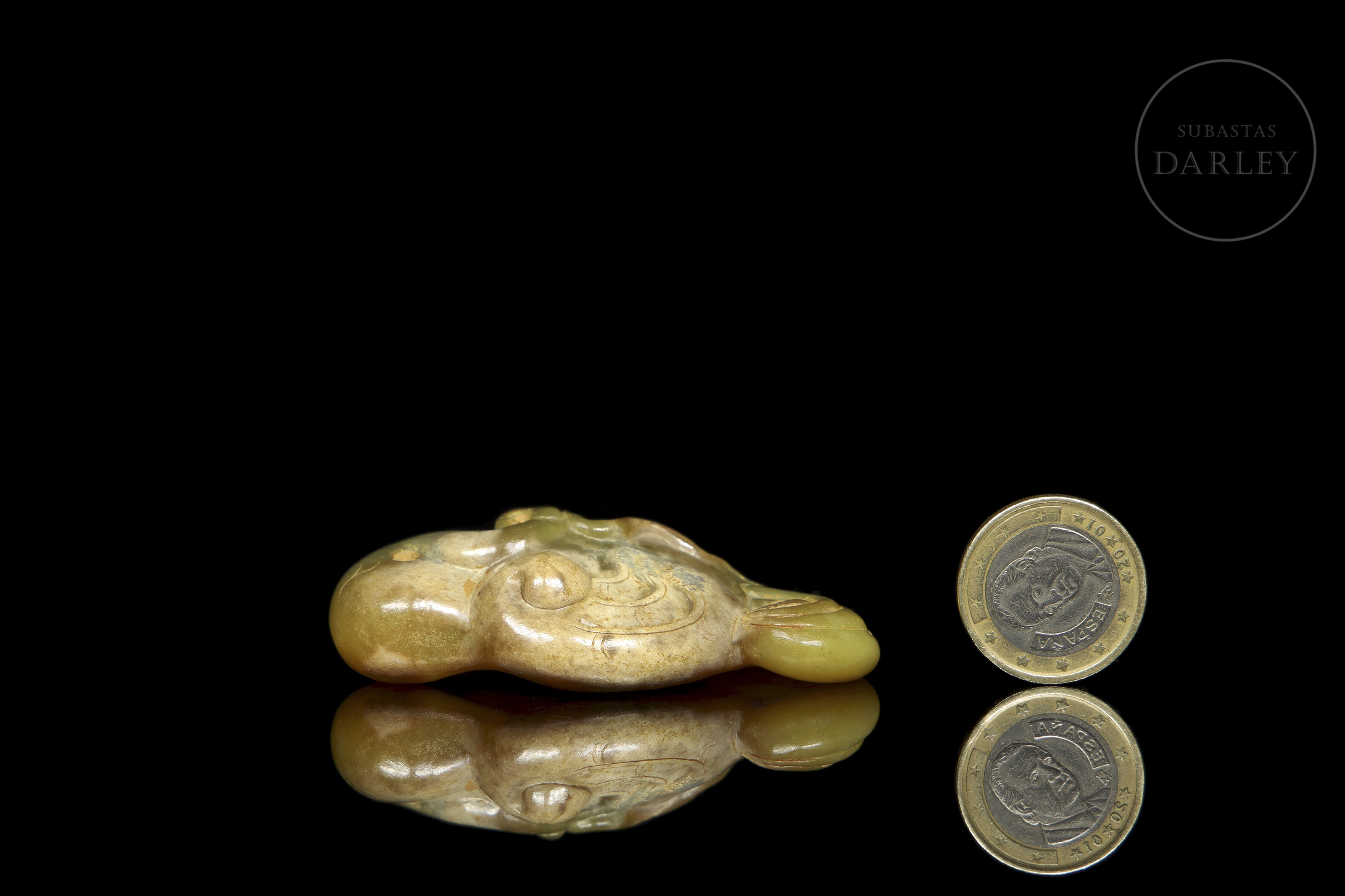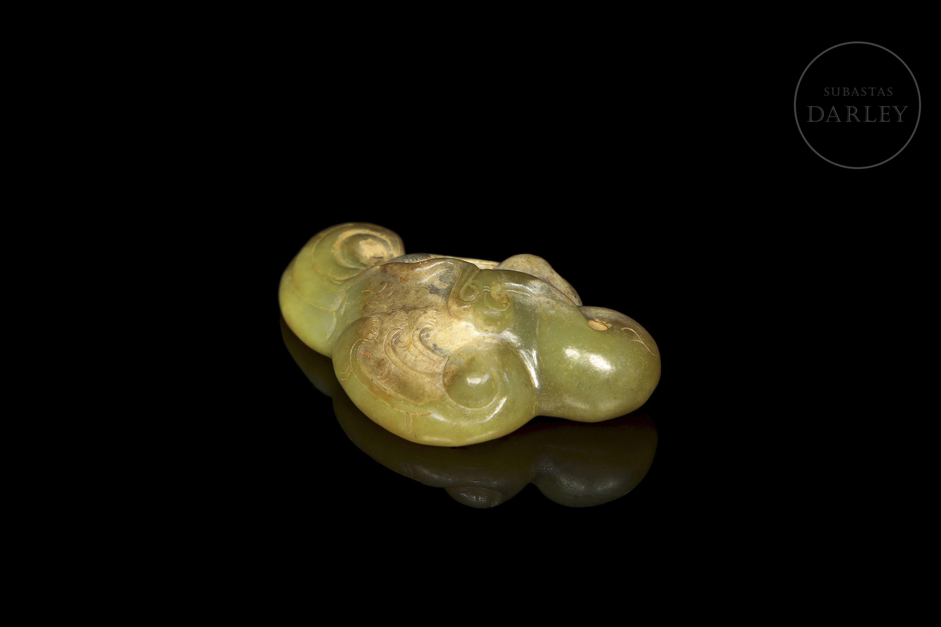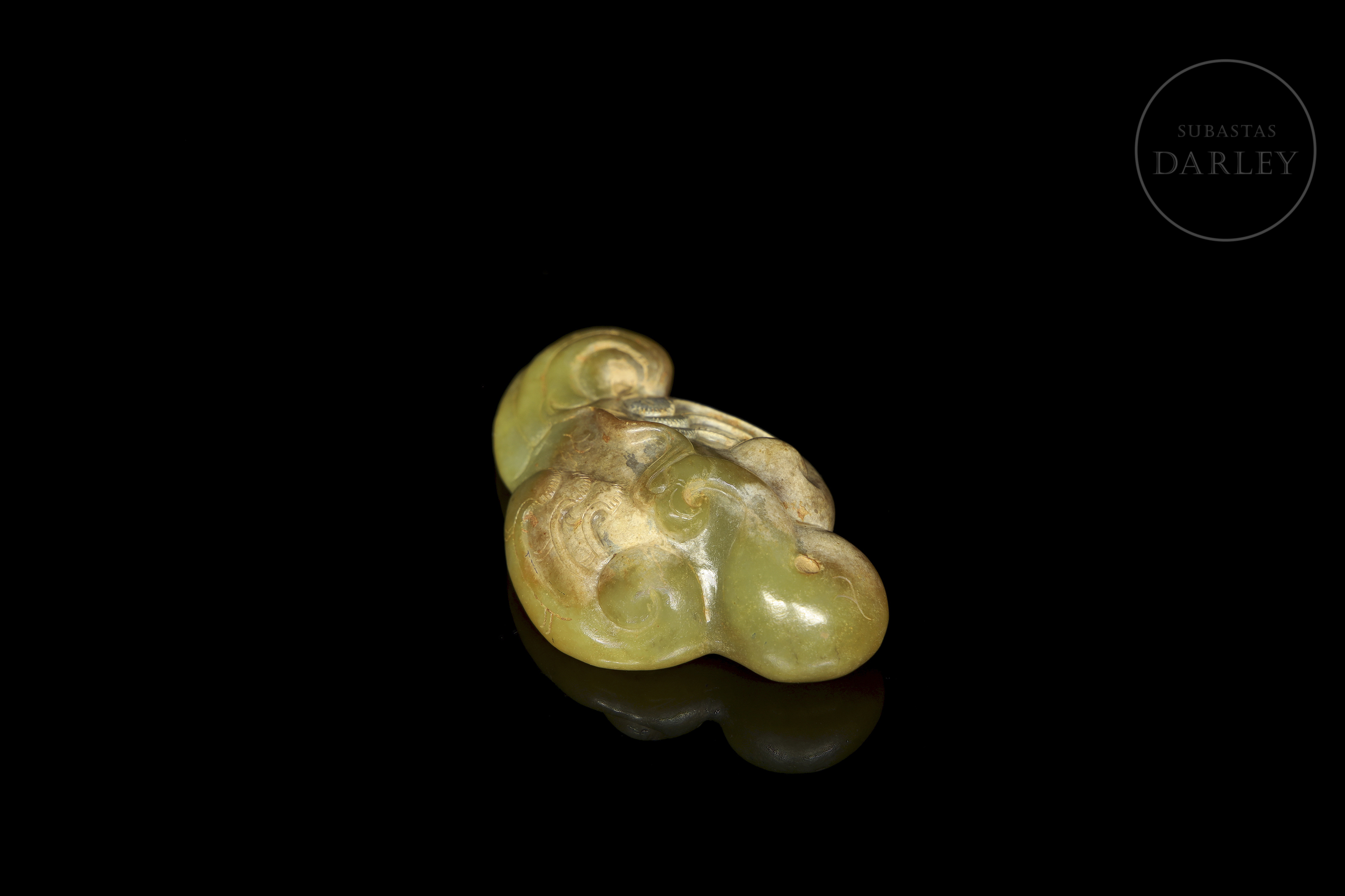 Jade de tono amarillo verdoso con notable pátina y alteraciones minerales en tonos ocre y blanco. La pieza representa un ave mitológica en posición compacta, con alas plegadas y cola curva. Destaca la talla en bajorrelieve con motivos de volutas espirales y finas incisiones que detallan el plumaje. Presenta pequeñas perforaciones para su suspensión. Dinastía Han (206 a.C. – 220 d.C.) o posterior.
