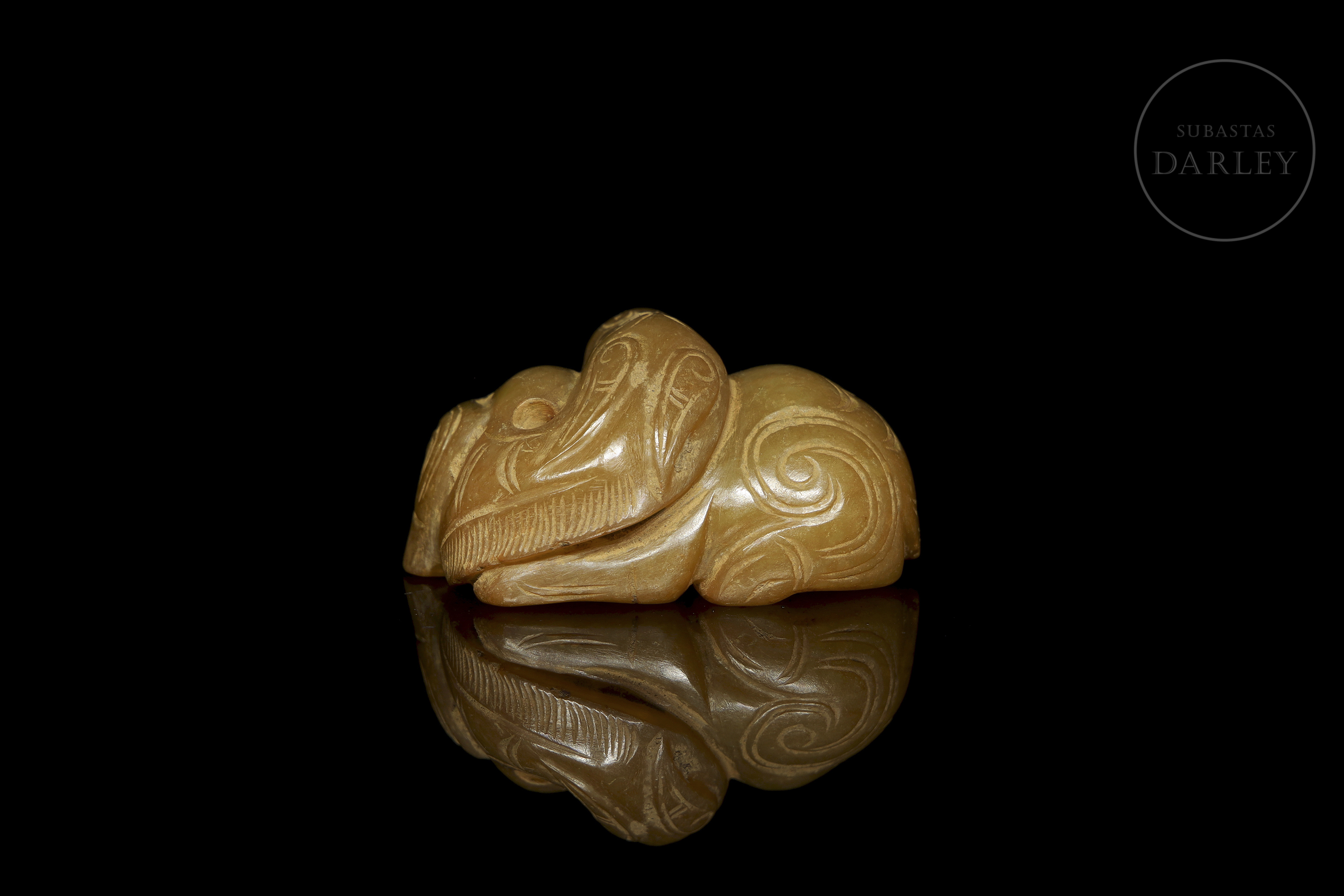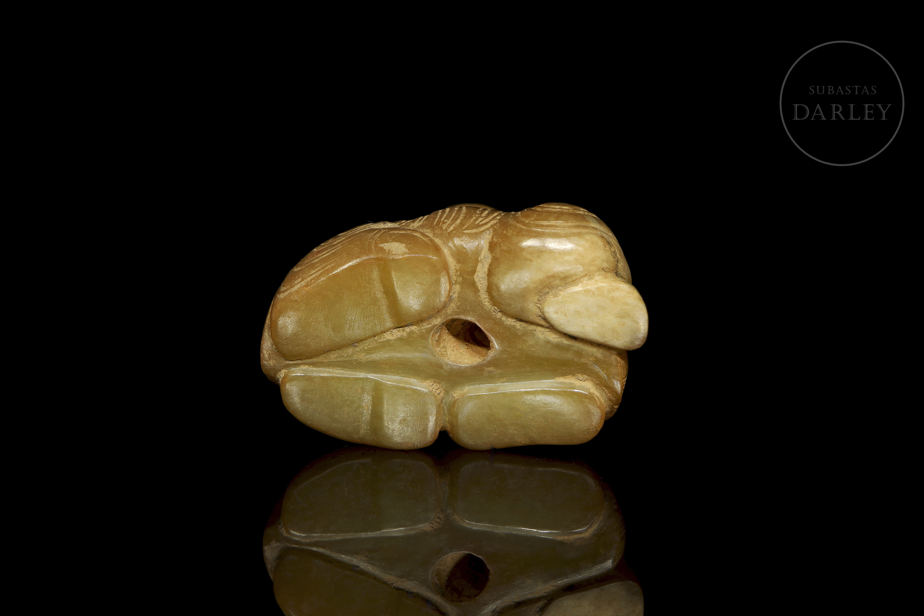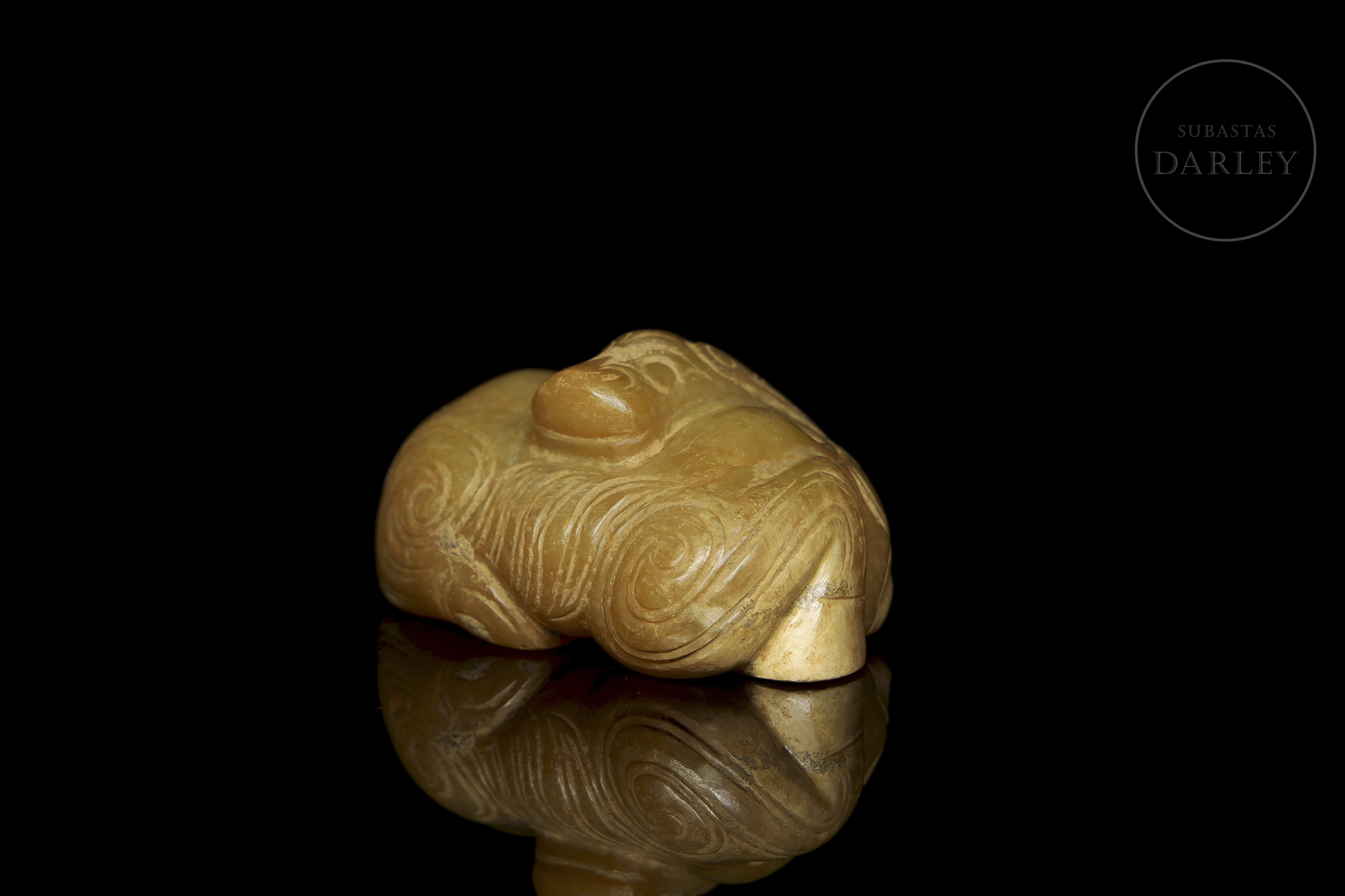 Jade de color amarillo miel con áreas en tonos ocre. Muestra un caballo en una postura compacta, con las patas recogidas bajo el cuerpo y la cabeza sobre el lomo. Destaca por su modelado con rasgos faciales, crin y cola definidos mediante incisiones lineales. Presenta una perforación en la parte inferior. Dinastía Zhou Occidental (aprox. 1046–771 a.C.) o posterior.