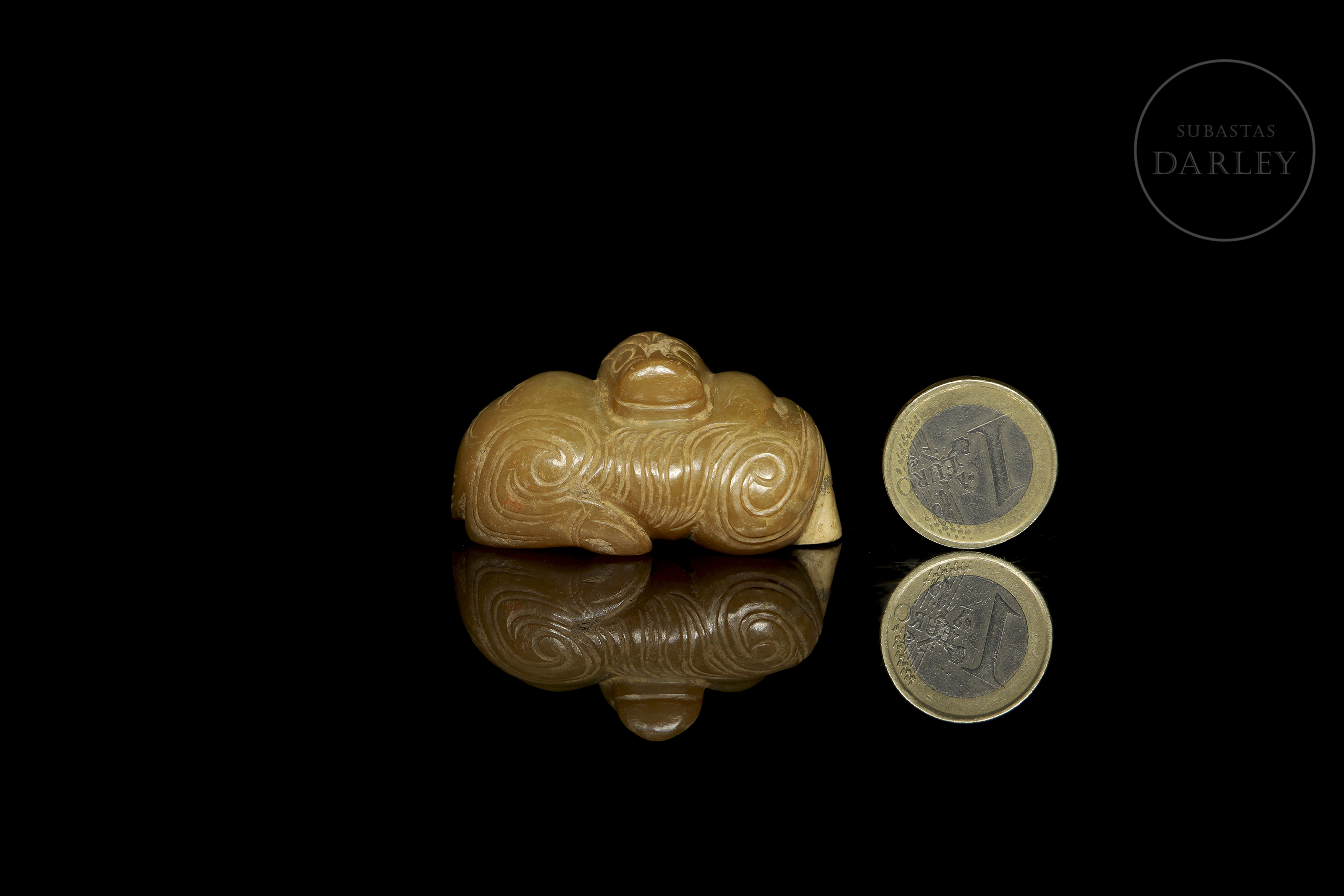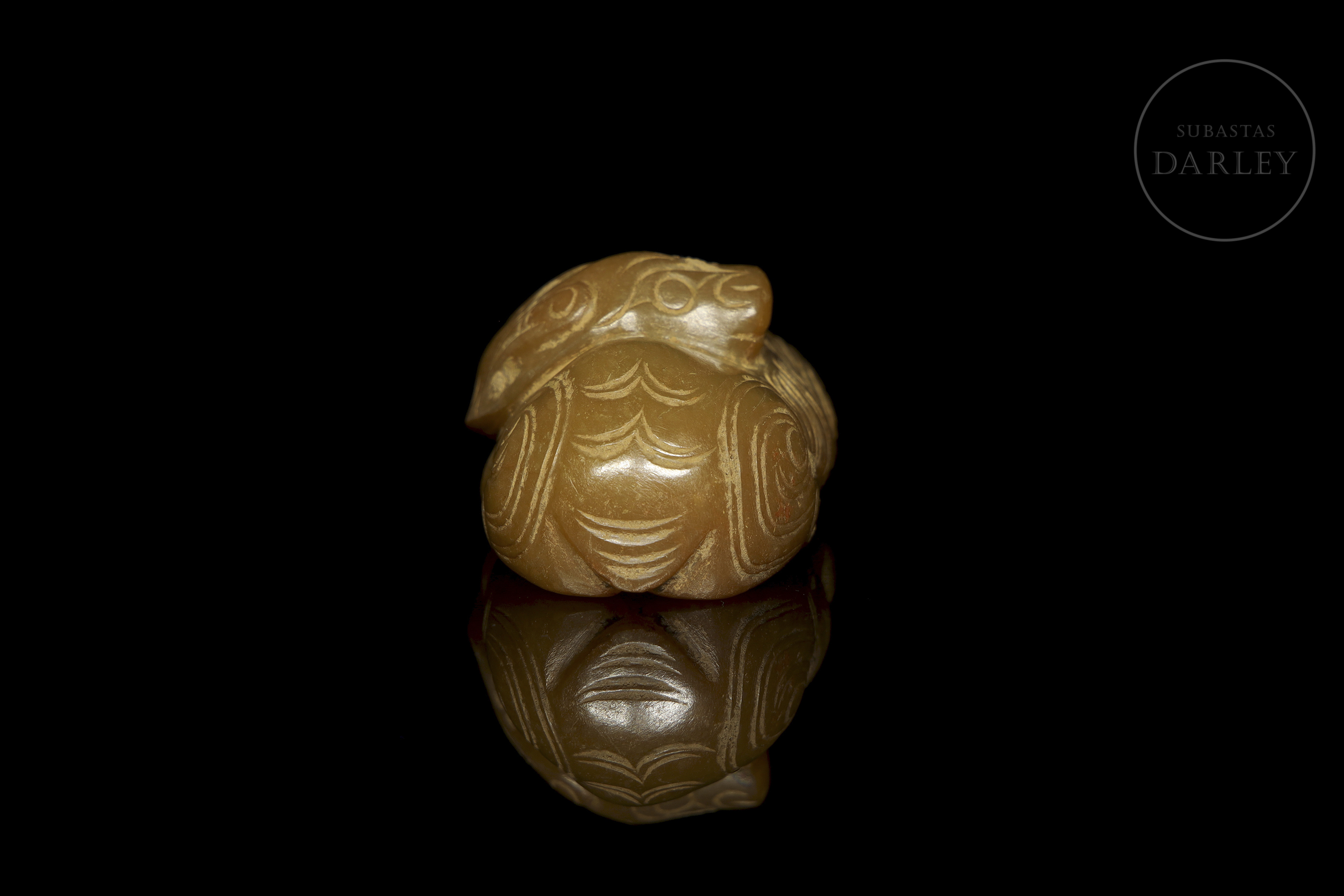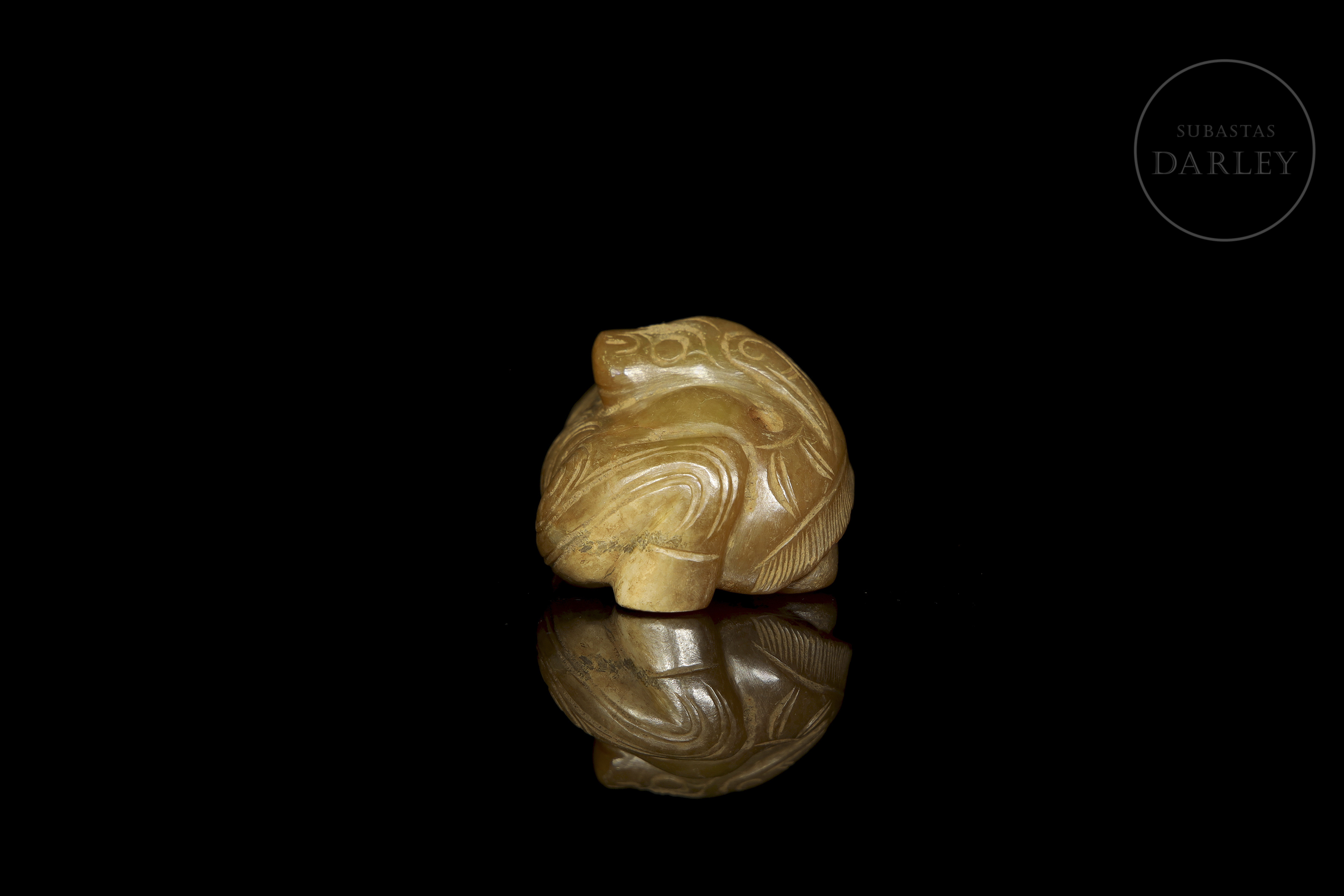 Jade de color amarillo miel con áreas en tonos ocre. Muestra un caballo en una postura compacta, con las patas recogidas bajo el cuerpo y la cabeza sobre el lomo. Destaca por su modelado con rasgos faciales, crin y cola definidos mediante incisiones lineales. Presenta una perforación en la parte inferior. Dinastía Zhou Occidental (aprox. 1046–771 a.C.) o posterior.