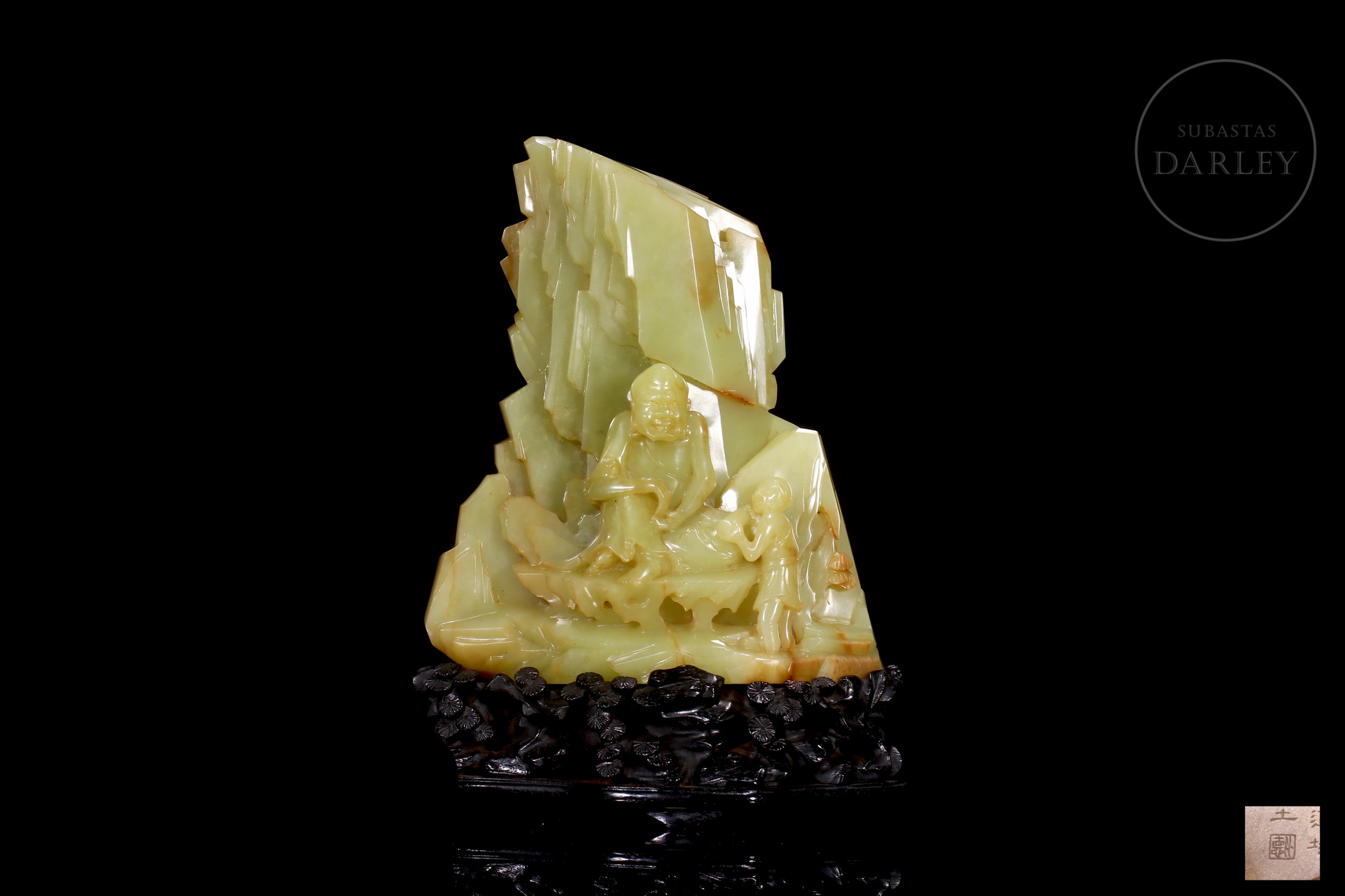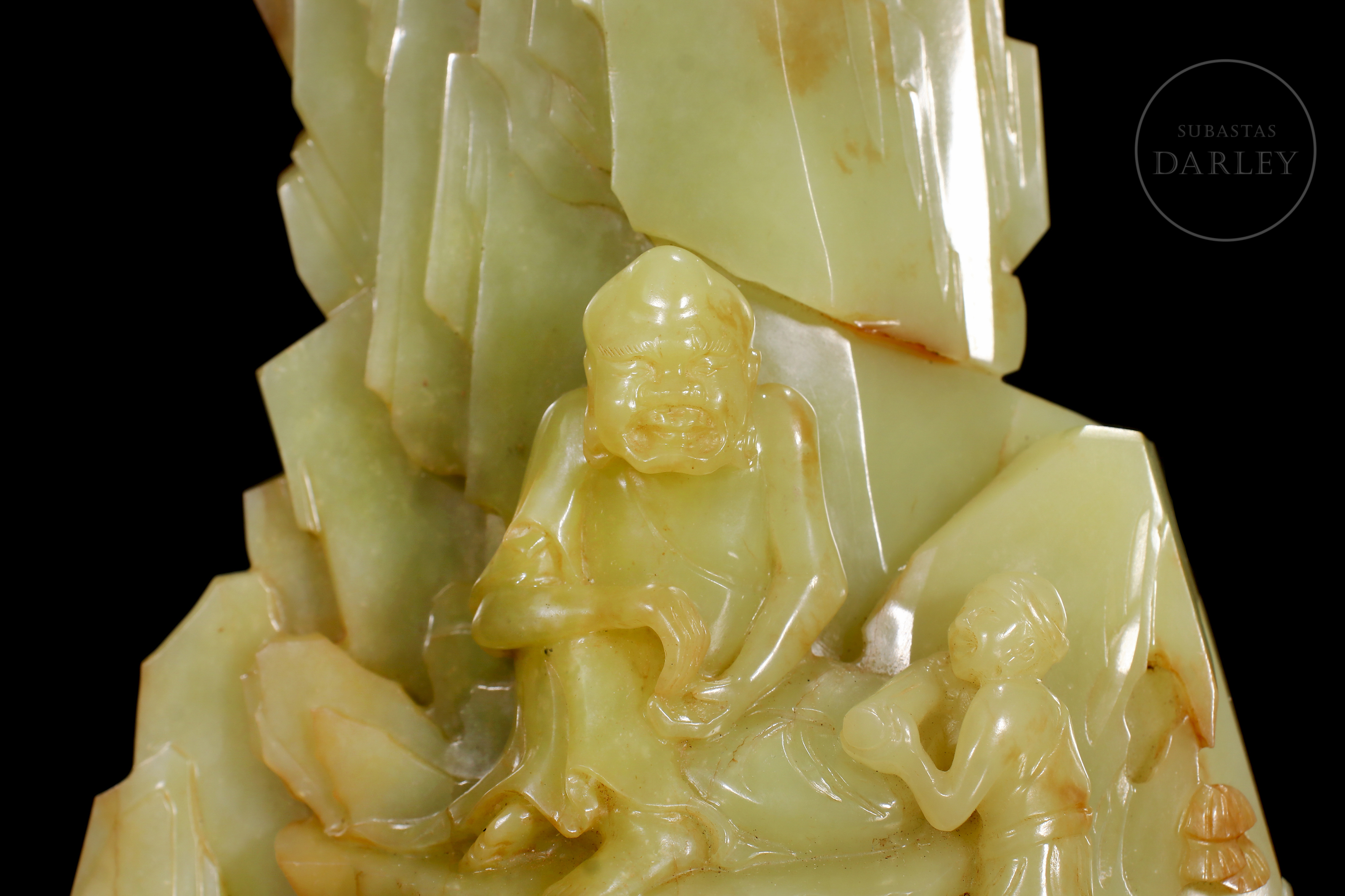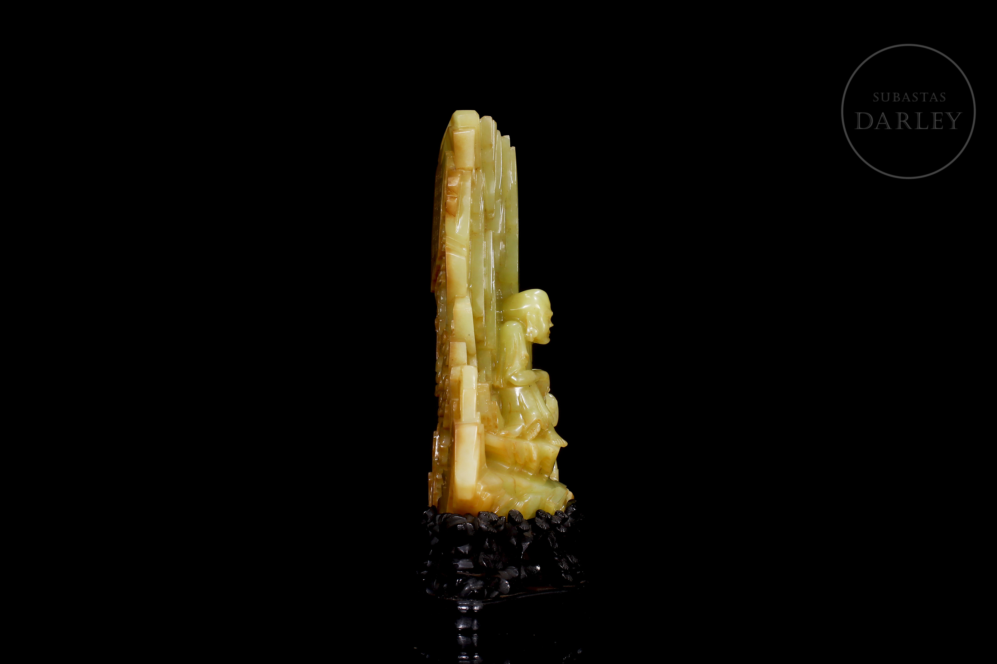 Figura de jade de Hetian de tonalidad amarillo verdoso con inclusiones color ocre. La pieza presenta una escena de retiro espiritual, donde la imagen de un Arhat o sabio budista, de rasgos maduros y expresión contemplativa se encuentra sentado en el interior de una gruta frente a un joven discípulo que le ofrece un objeto ritual. En el reverso, exhibe una superficie escarpada adornada con pinos en relieve y una inscripción caligráfica grabada. Dinastía Qing (1644–1911).