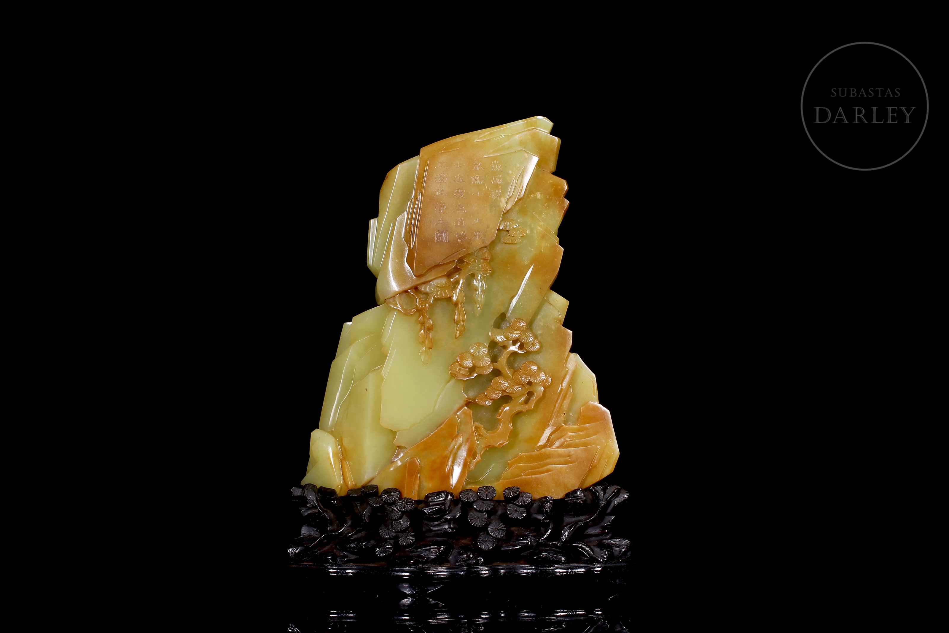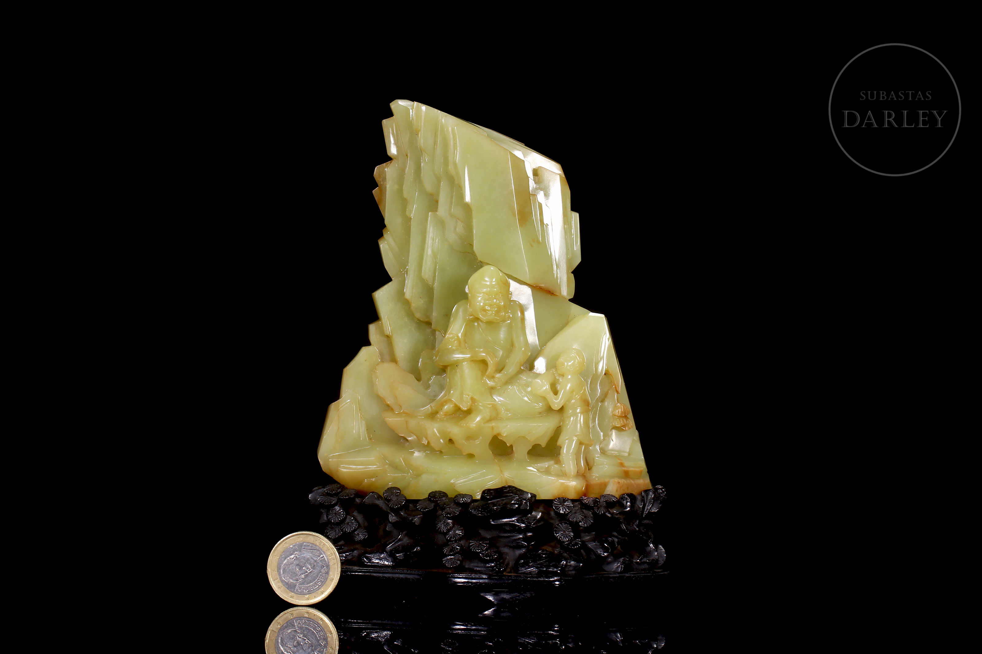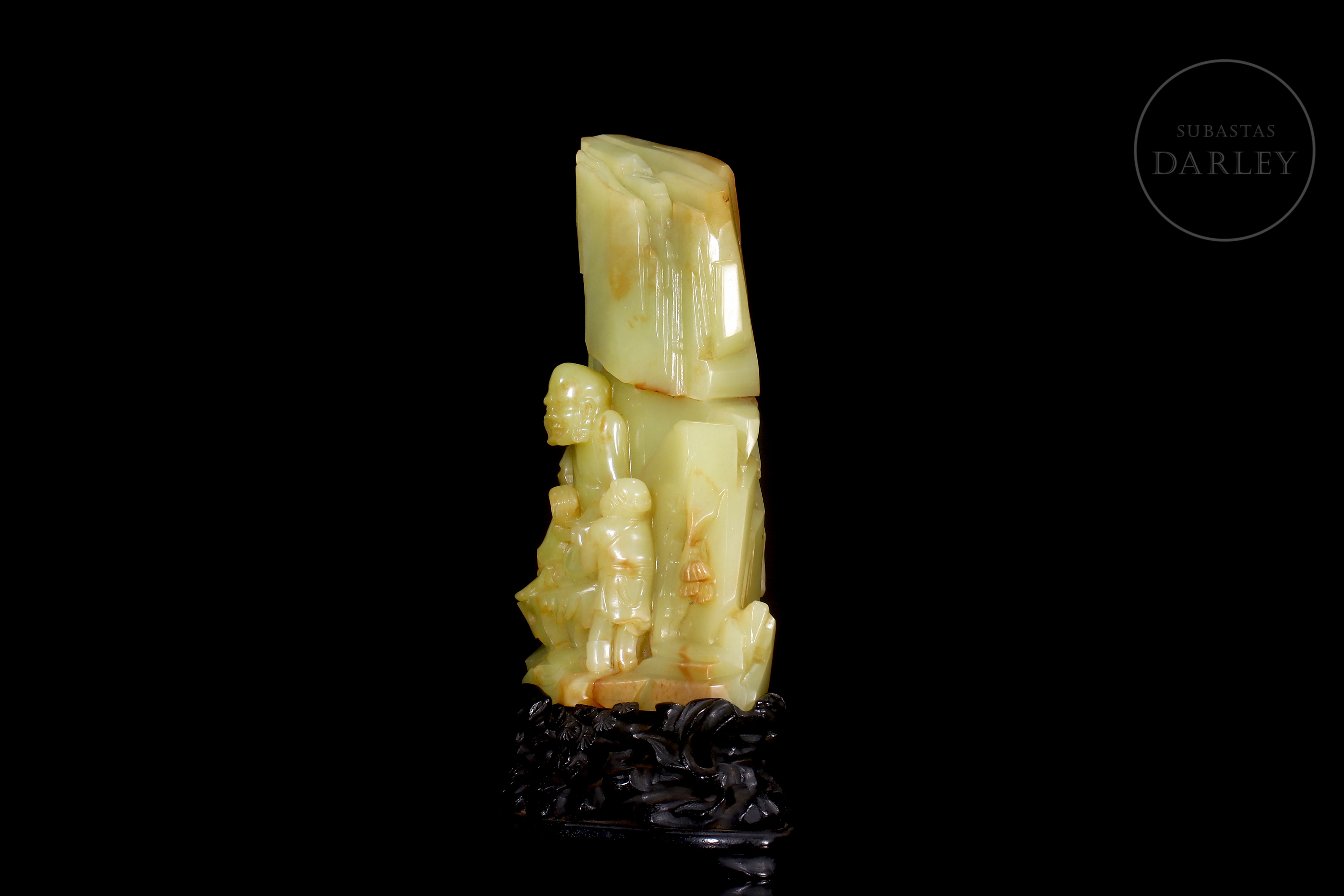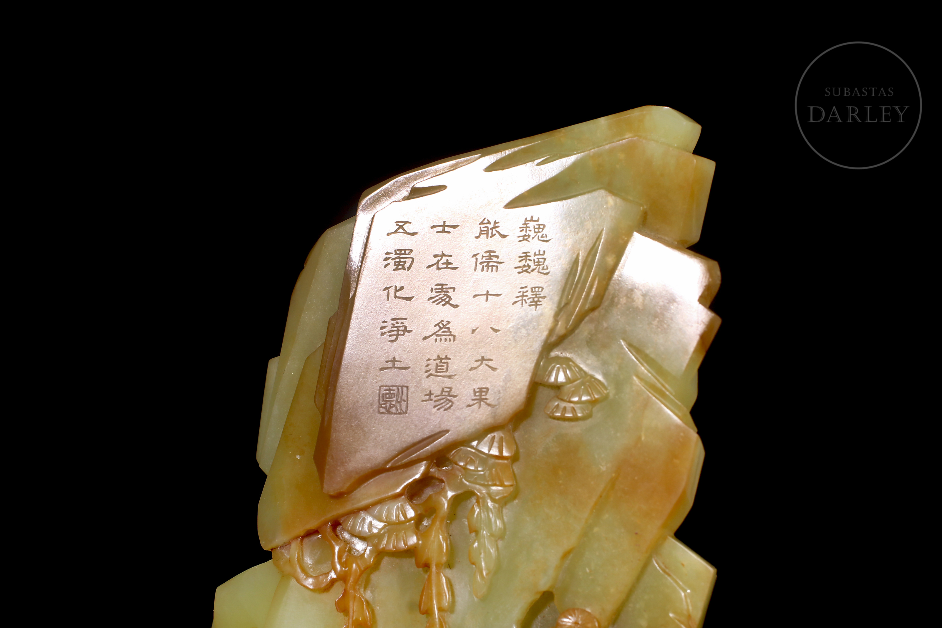 Figura de jade de Hetian de tonalidad amarillo verdoso con inclusiones color ocre. La pieza presenta una escena de retiro espiritual, donde la imagen de un Arhat o sabio budista, de rasgos maduros y expresión contemplativa se encuentra sentado en el interior de una gruta frente a un joven discípulo que le ofrece un objeto ritual. En el reverso, exhibe una superficie escarpada adornada con pinos en relieve y una inscripción caligráfica grabada. Dinastía Qing (1644–1911).