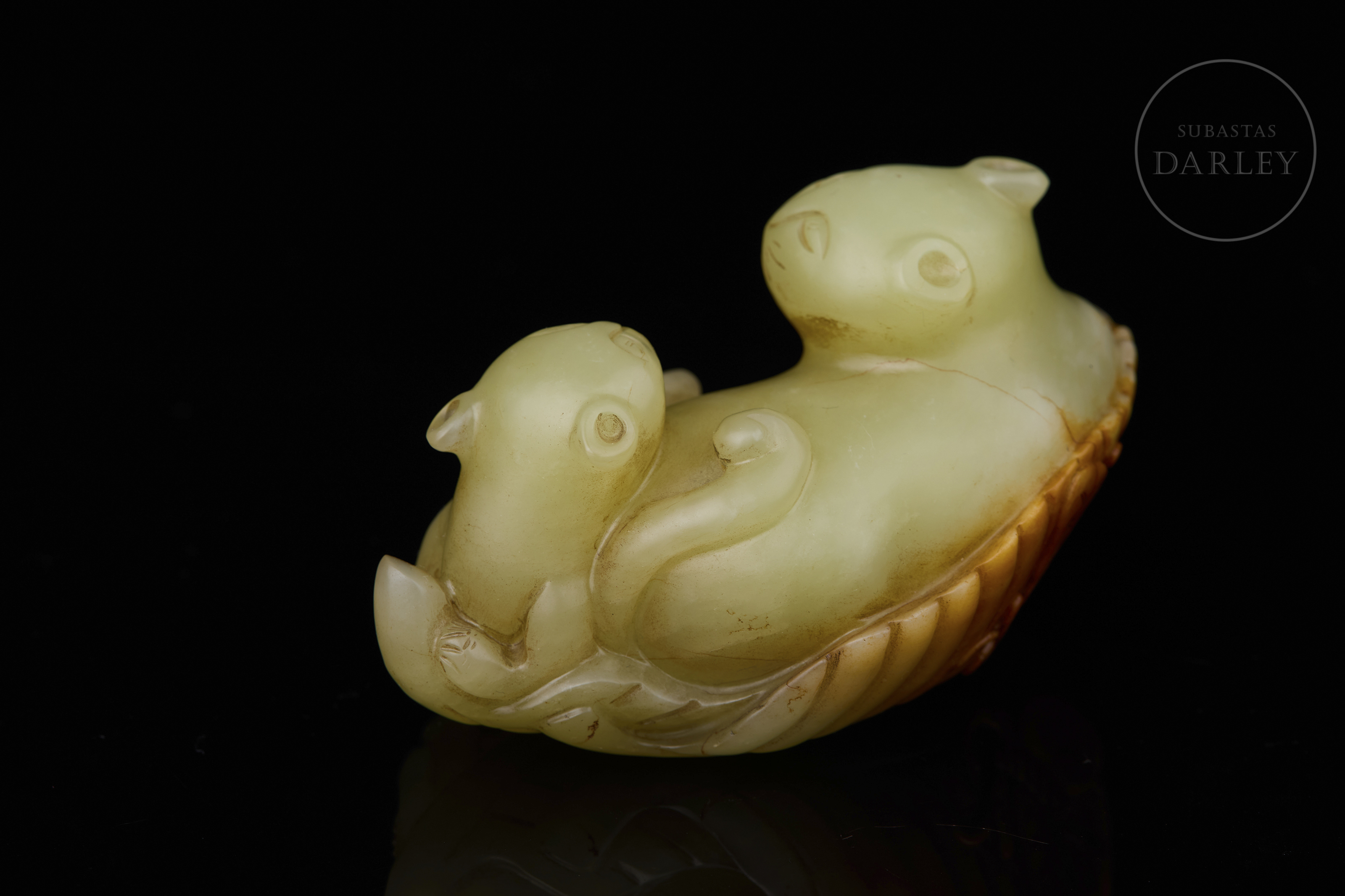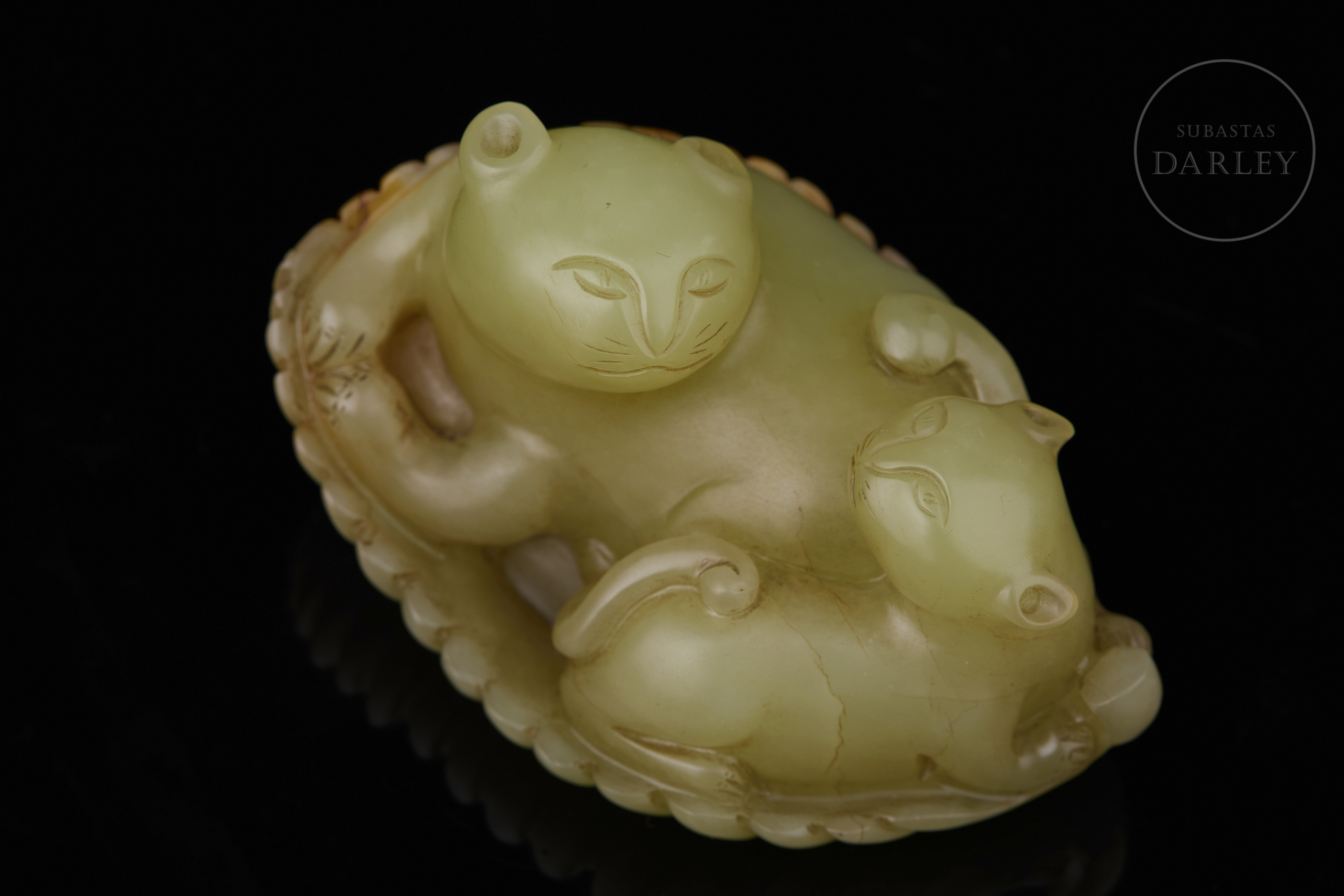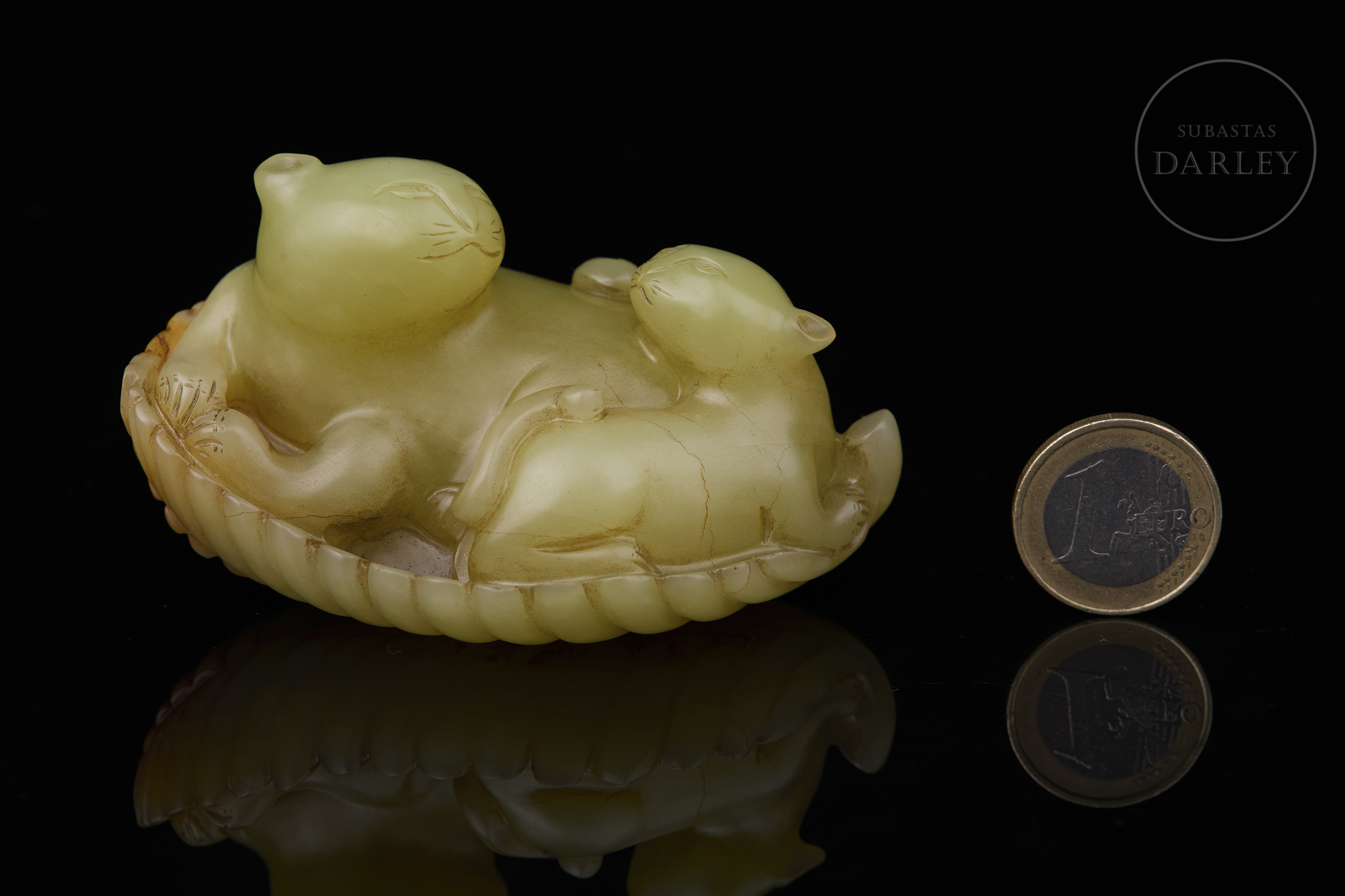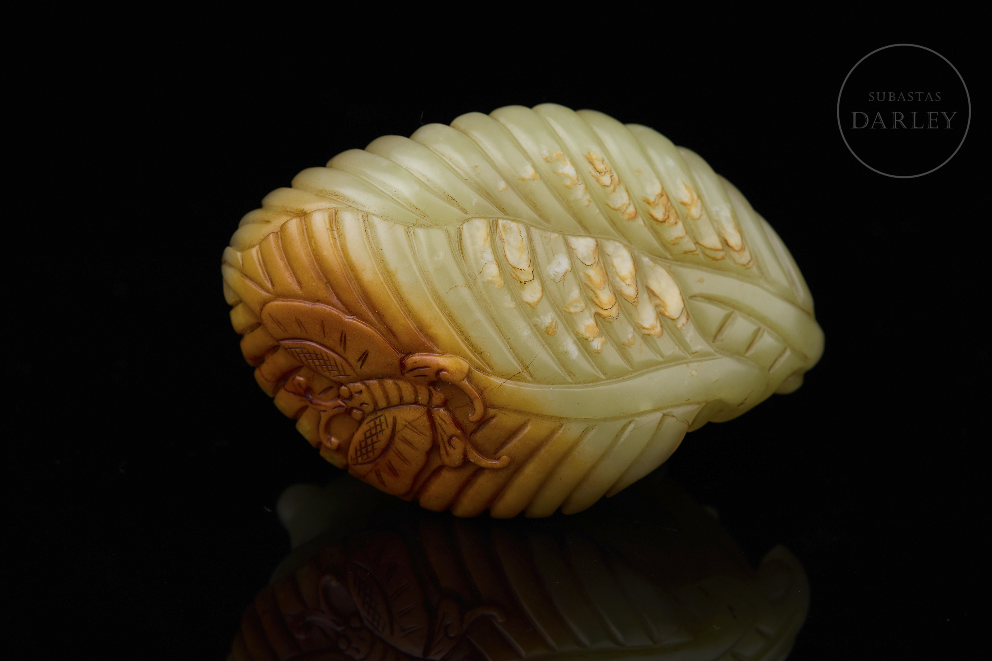 Jade de tonalidad amarillo-verdoso, con oscuras áreas de pátina marrón rojizo. Presenta una talla en bulto redondo de una leona recostada junto a su cachorro sobre una gran hoja, cuya superficie inferior ha sido aprovechada para tallar una mariposa en relieve. Iconográficamente, la leona con su cría simboliza la continuidad del linaje y la protección familiar. Dinastía Qing (1644–1911).