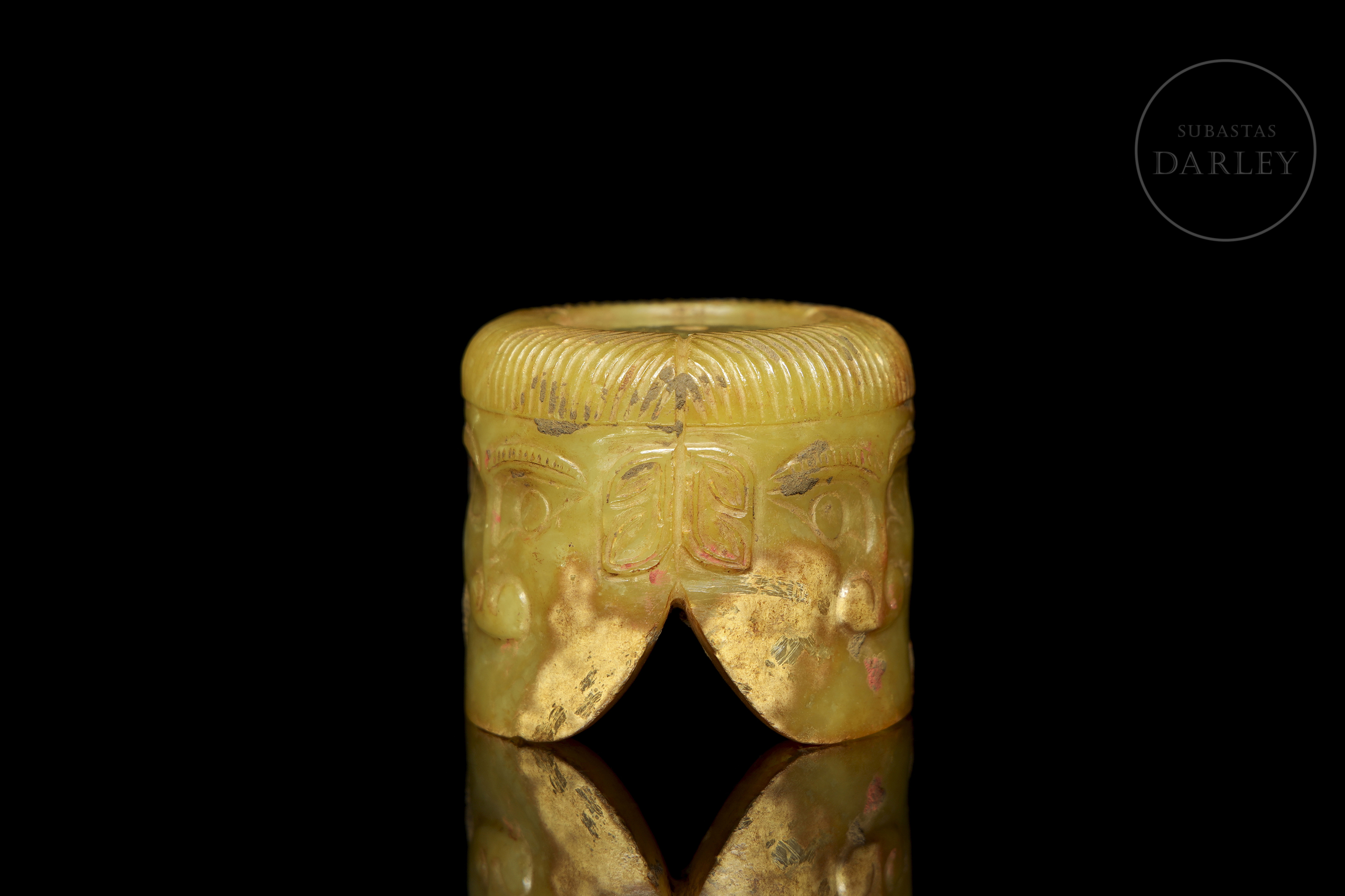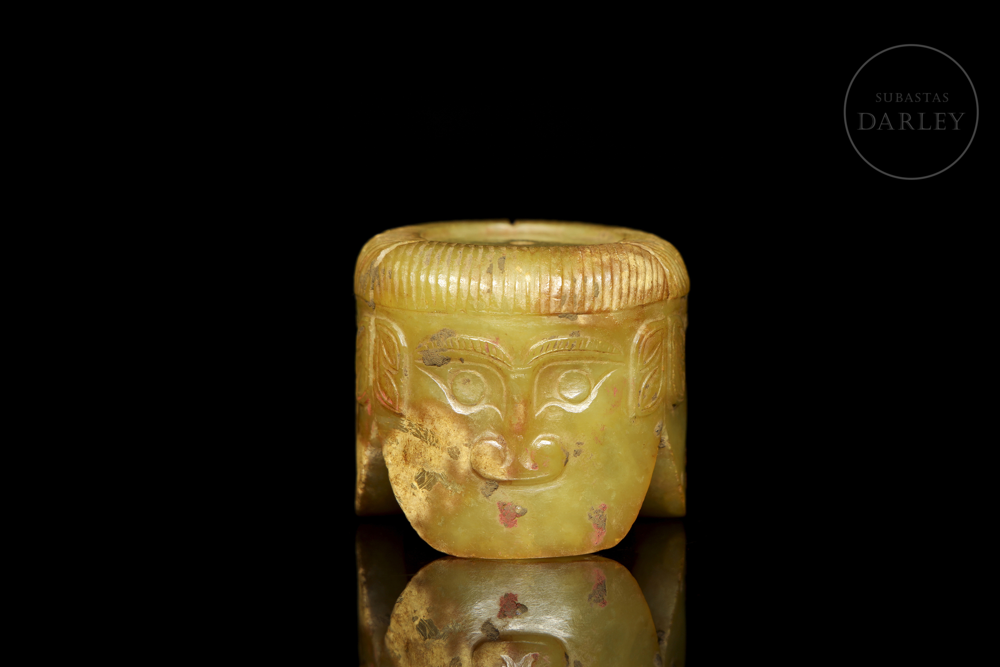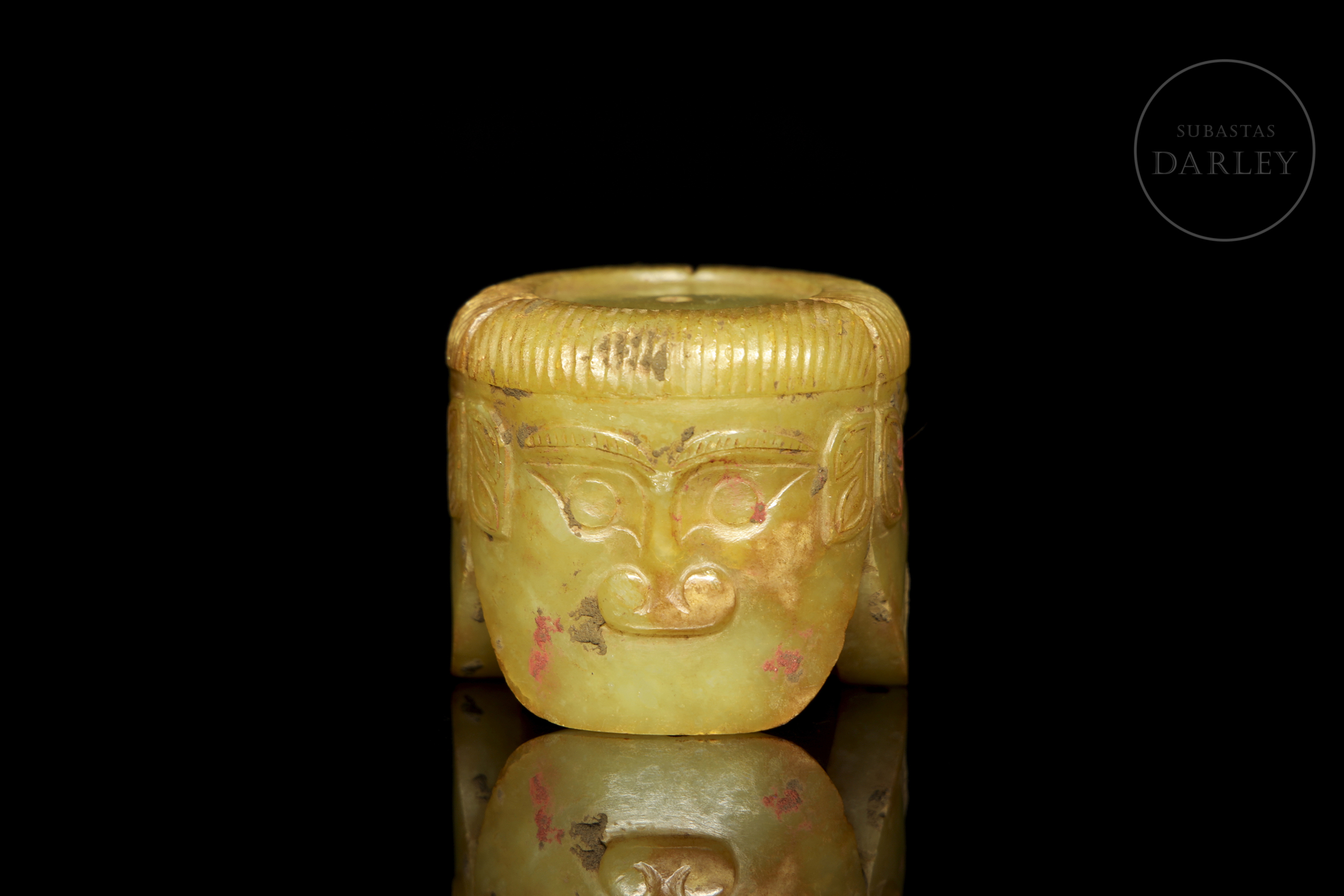 Figura de jade amarillo de estilo arcaico, probablemente un terminal para una carroza. La pieza, hueca, está tallada en un jade de tonos amarillos con vetas rojizas y ocres. El frontal está esculpido con dos máscaras arcaicas dispuestas de forma simétrica, de rasgos antropomorfos, coronados por finas líneas incisas a modo de cabellera. Dinastía Zhou (s.II - 221 a.C) o posterior.