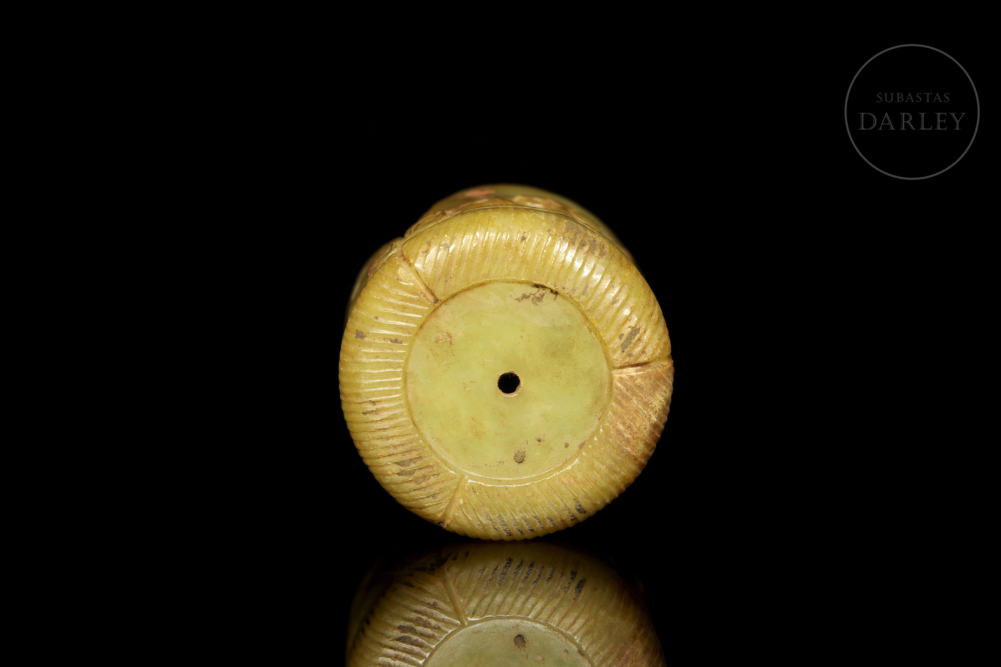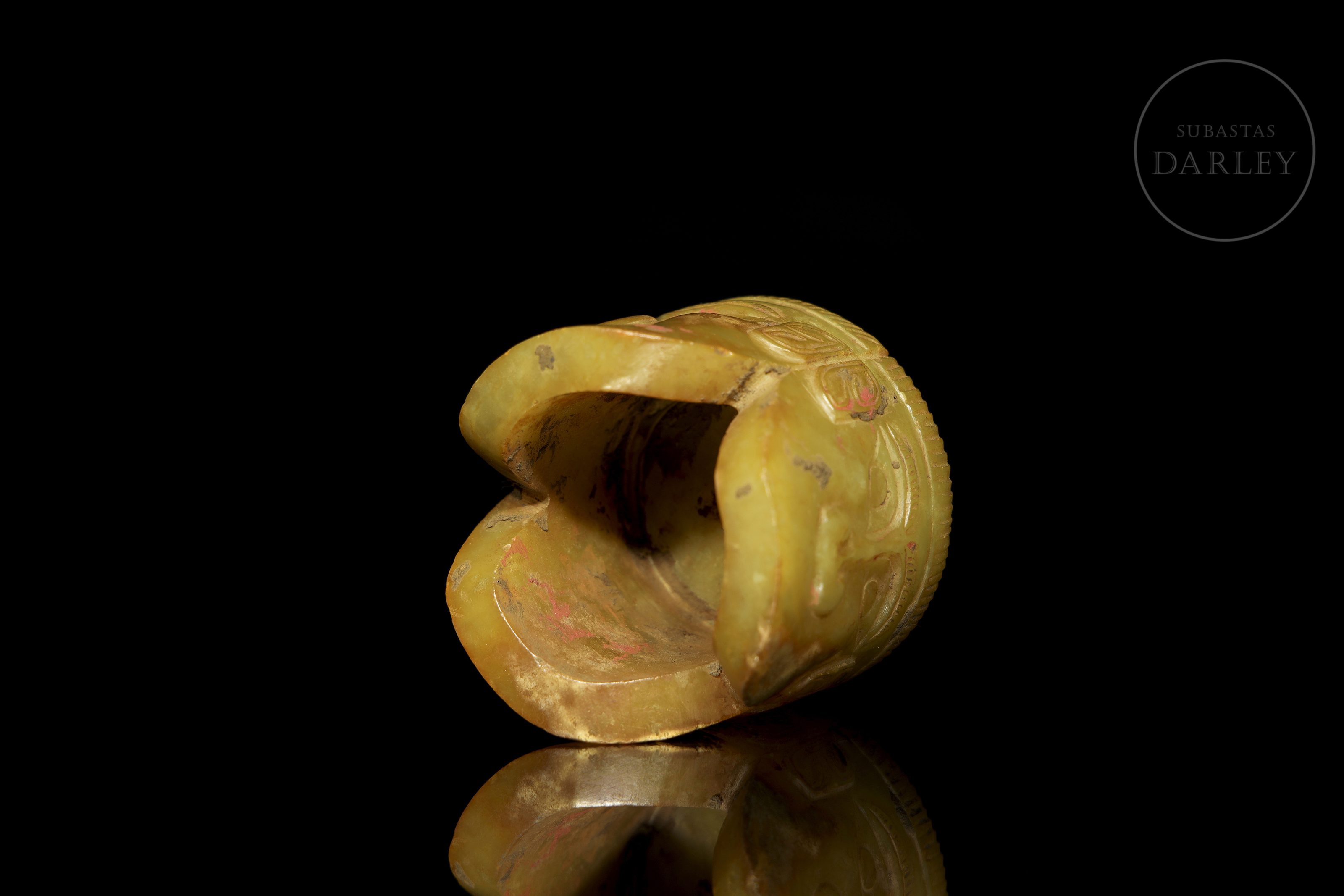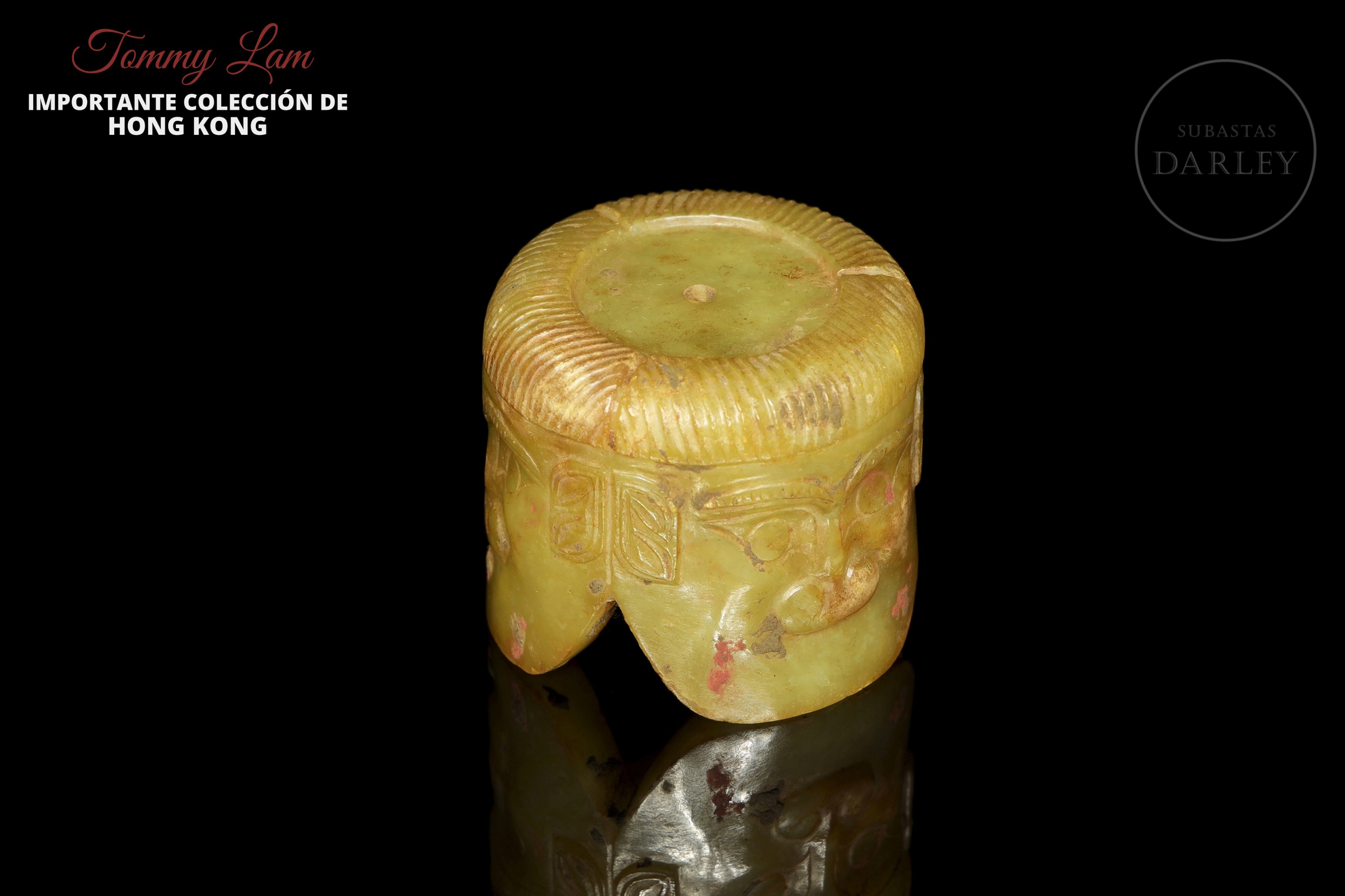Figura de jade amarillo de estilo arcaico, probablemente un terminal para una carroza. La pieza, hueca, está tallada en un jade de tonos amarillos con vetas rojizas y ocres. El frontal está esculpido con dos máscaras arcaicas dispuestas de forma simétrica, de rasgos antropomorfos, coronados por finas líneas incisas a modo de cabellera. Dinastía Zhou (s.II - 221 a.C) o posterior.