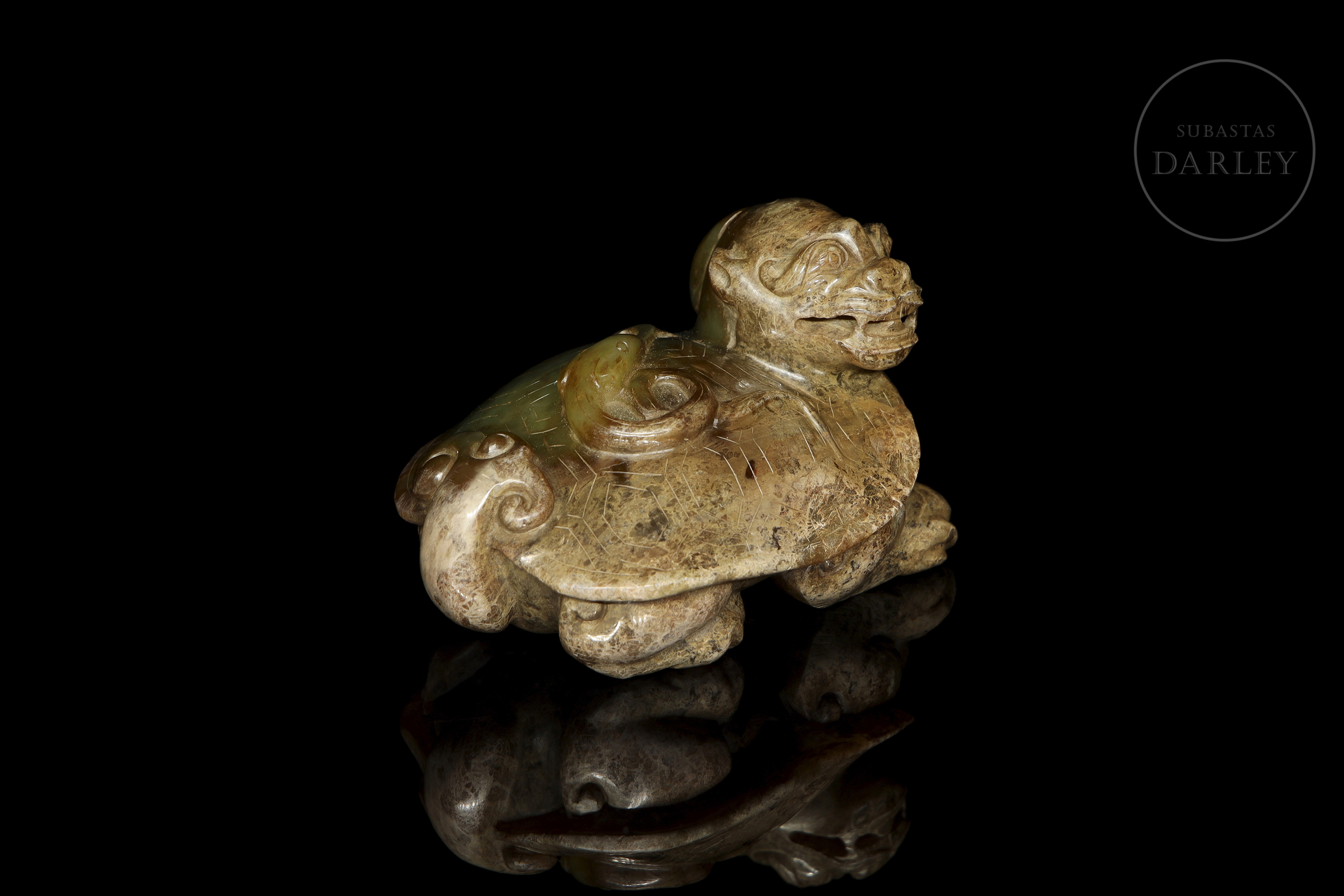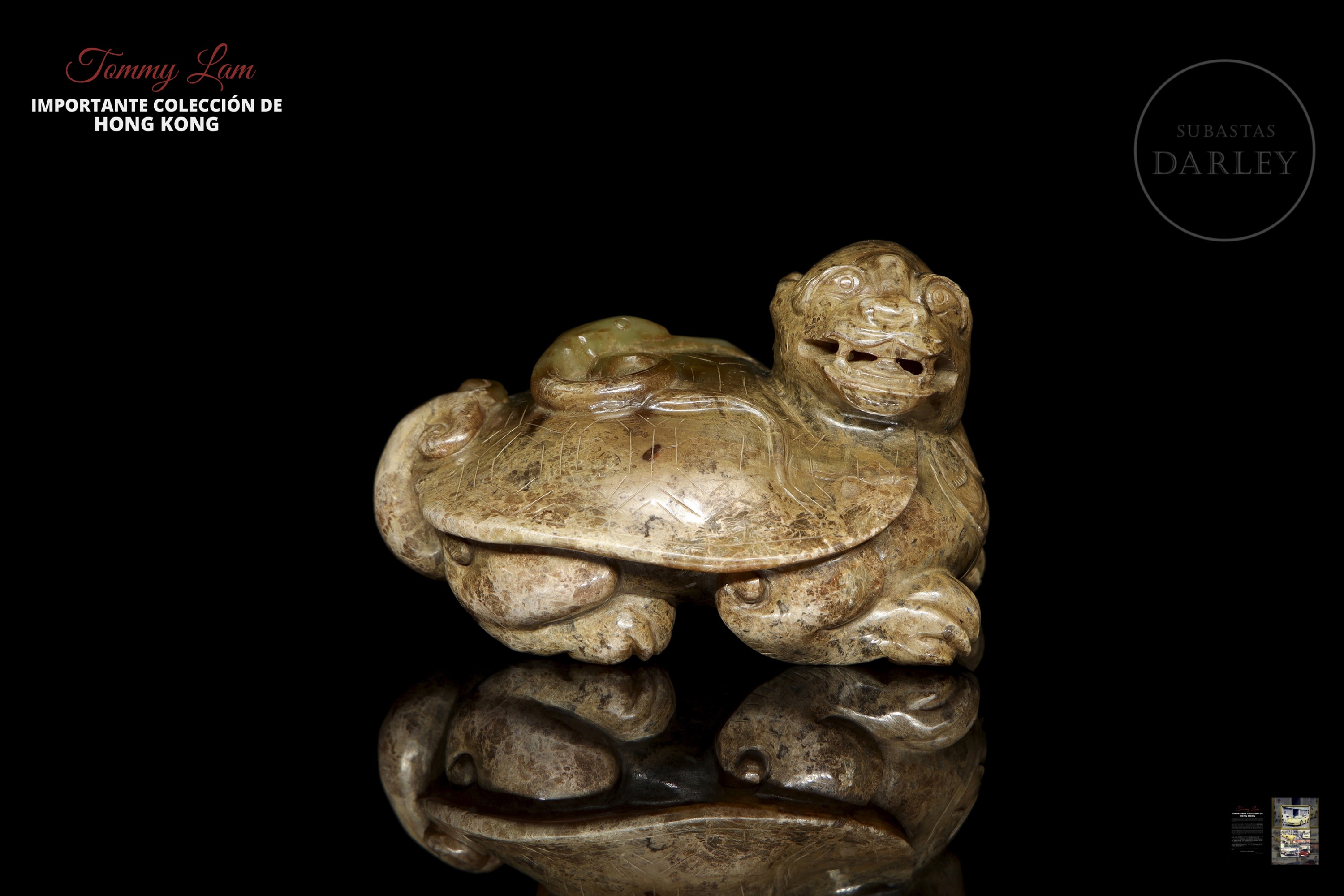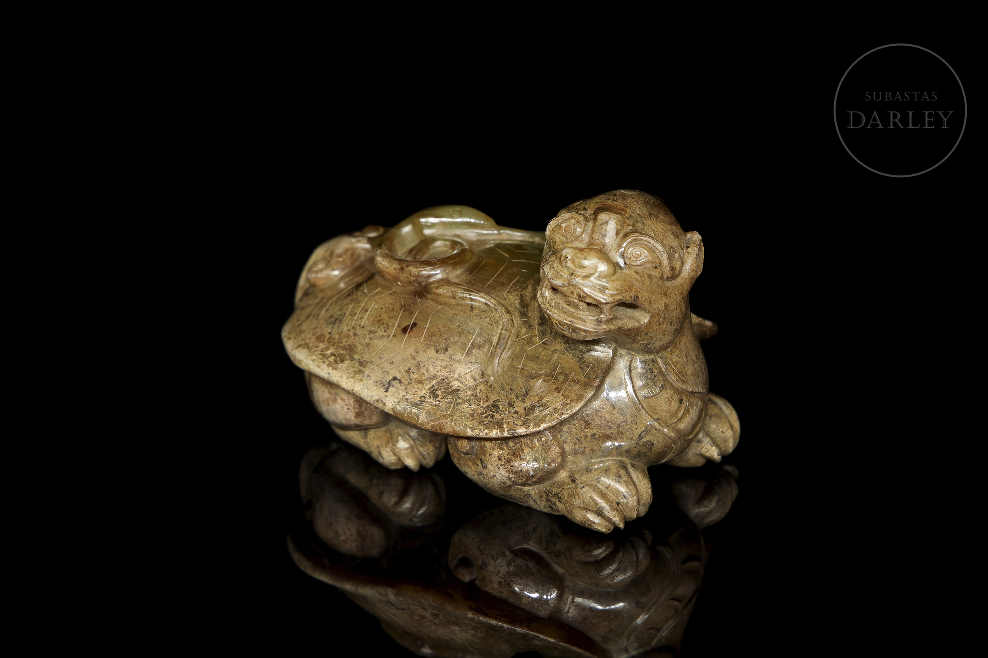 Excepcional escultura de bulto redondo tallada en jade de color amarillo con alteraciones naturales terrosas en tonos ocres y marrones. Representa la poderosa bestia mitológica conocida como "Tortuga Dragón" (龍龜), de cuerpo robusto, cabeza ladeada con fauces marcadas y ojos prominentes. El caparazón está meticulosamente grabado con el clásico patrón de hexágonos. Sobre su espalda, una pequeña bestia serpenteante de estilo arcaizante se desliza en bajo relieve. Las patas, firmemente asentadas, están talladas con garras definidas. Periodo Reinos Combatientes (475-221 a.C.).