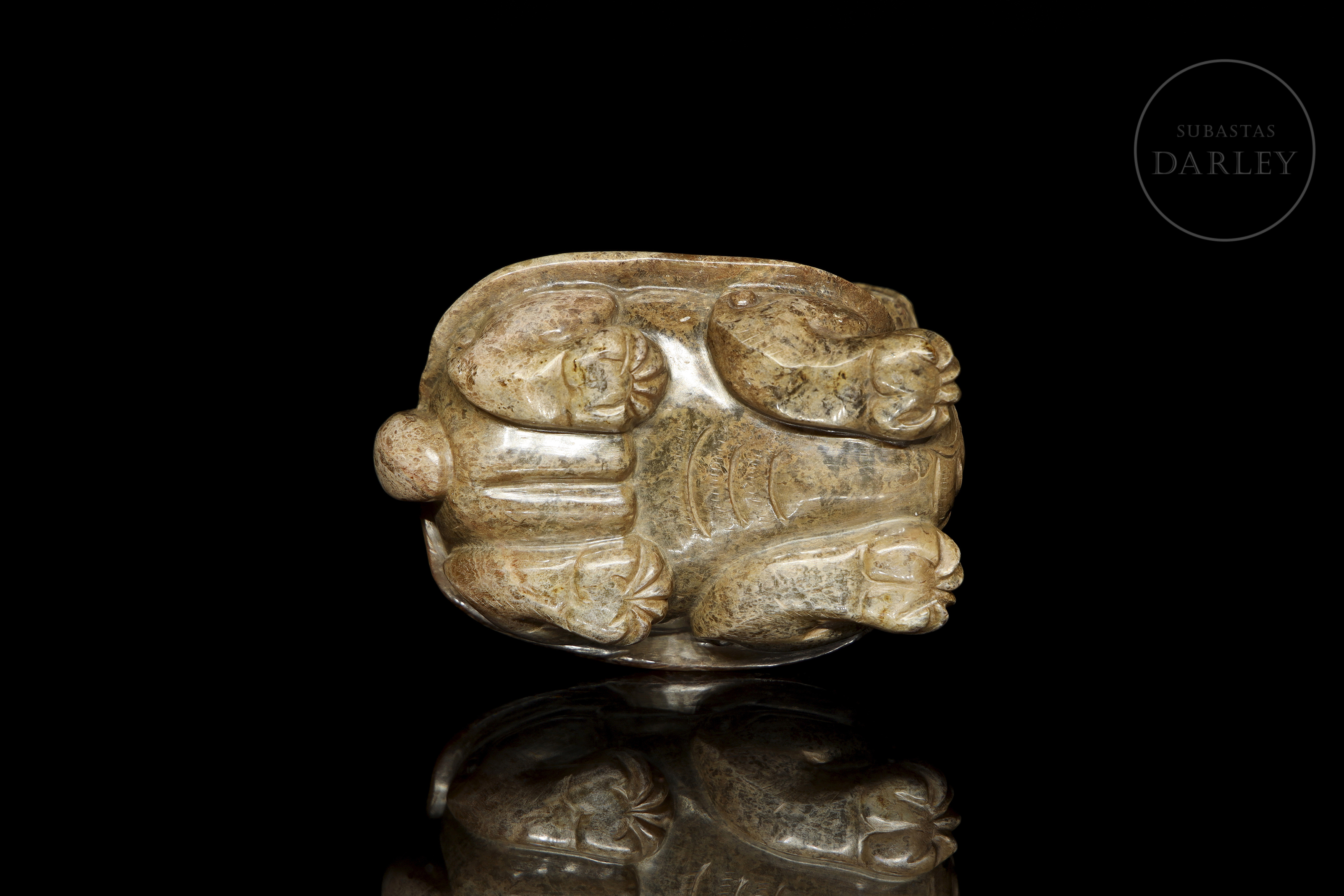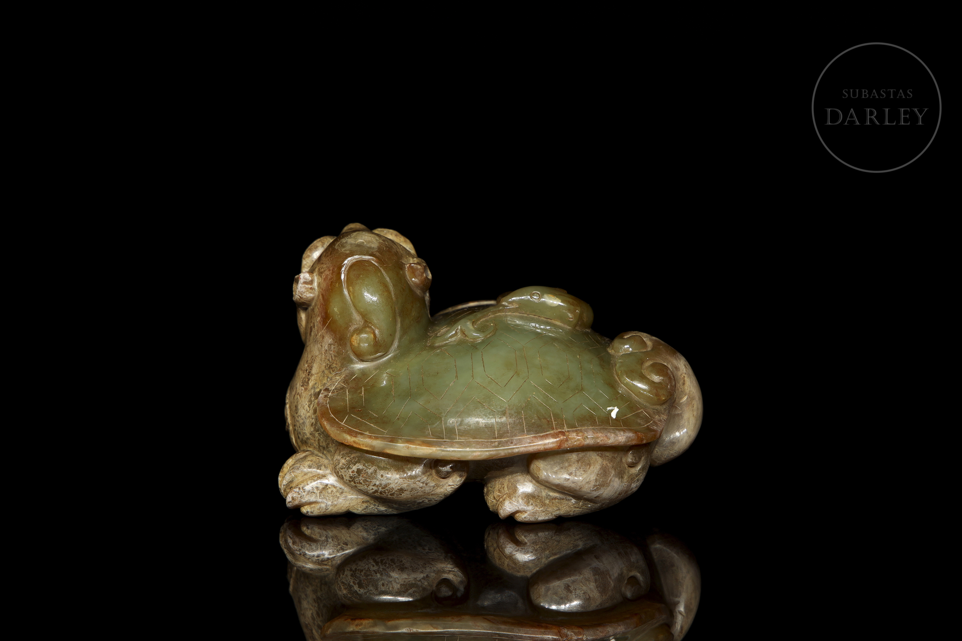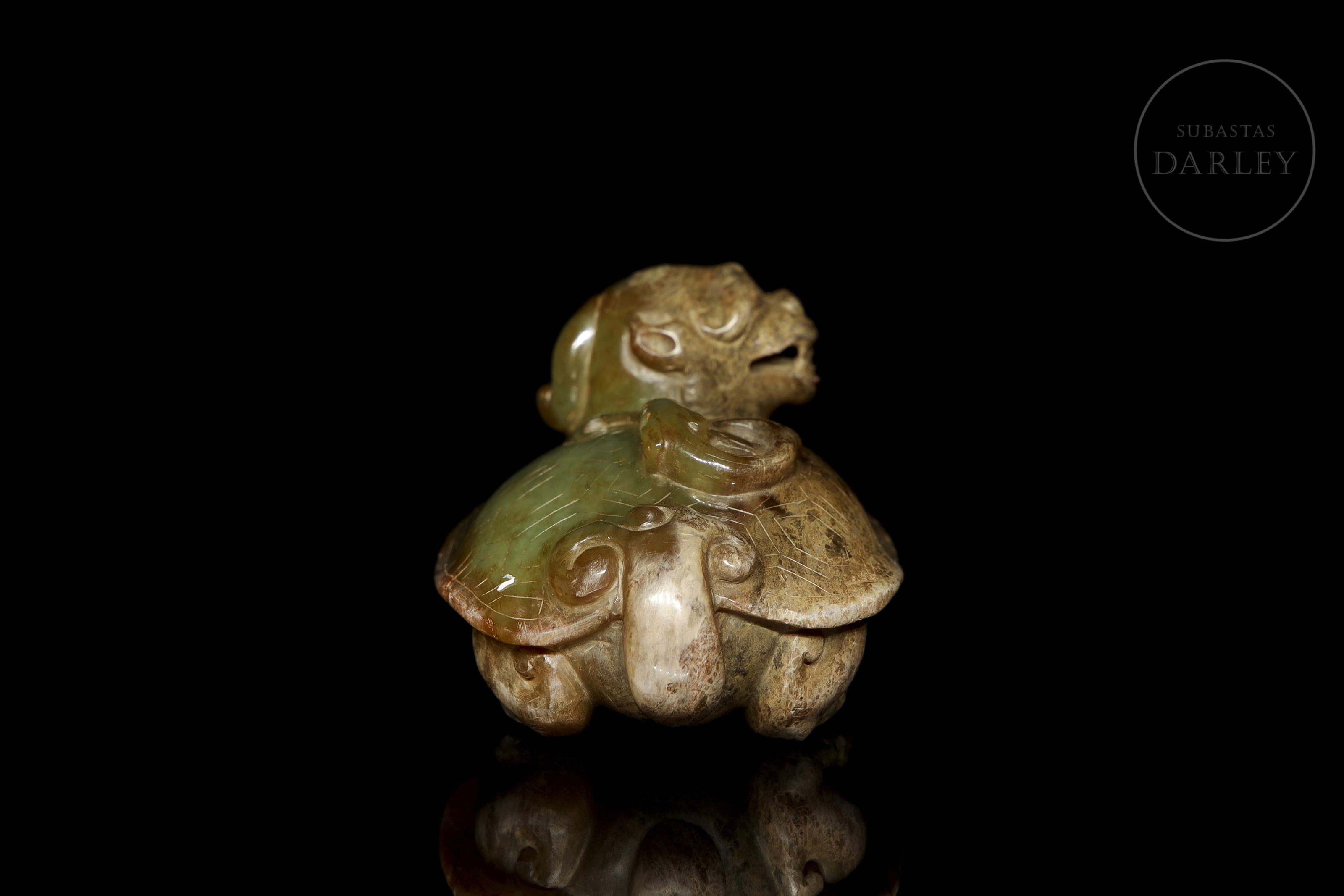 Excepcional escultura de bulto redondo tallada en jade de color amarillo con alteraciones naturales terrosas en tonos ocres y marrones. Representa la poderosa bestia mitológica conocida como "Tortuga Dragón" (龍龜), de cuerpo robusto, cabeza ladeada con fauces marcadas y ojos prominentes. El caparazón está meticulosamente grabado con el clásico patrón de hexágonos. Sobre su espalda, una pequeña bestia serpenteante de estilo arcaizante se desliza en bajo relieve. Las patas, firmemente asentadas, están talladas con garras definidas. Periodo Reinos Combatientes (475-221 a.C.).
