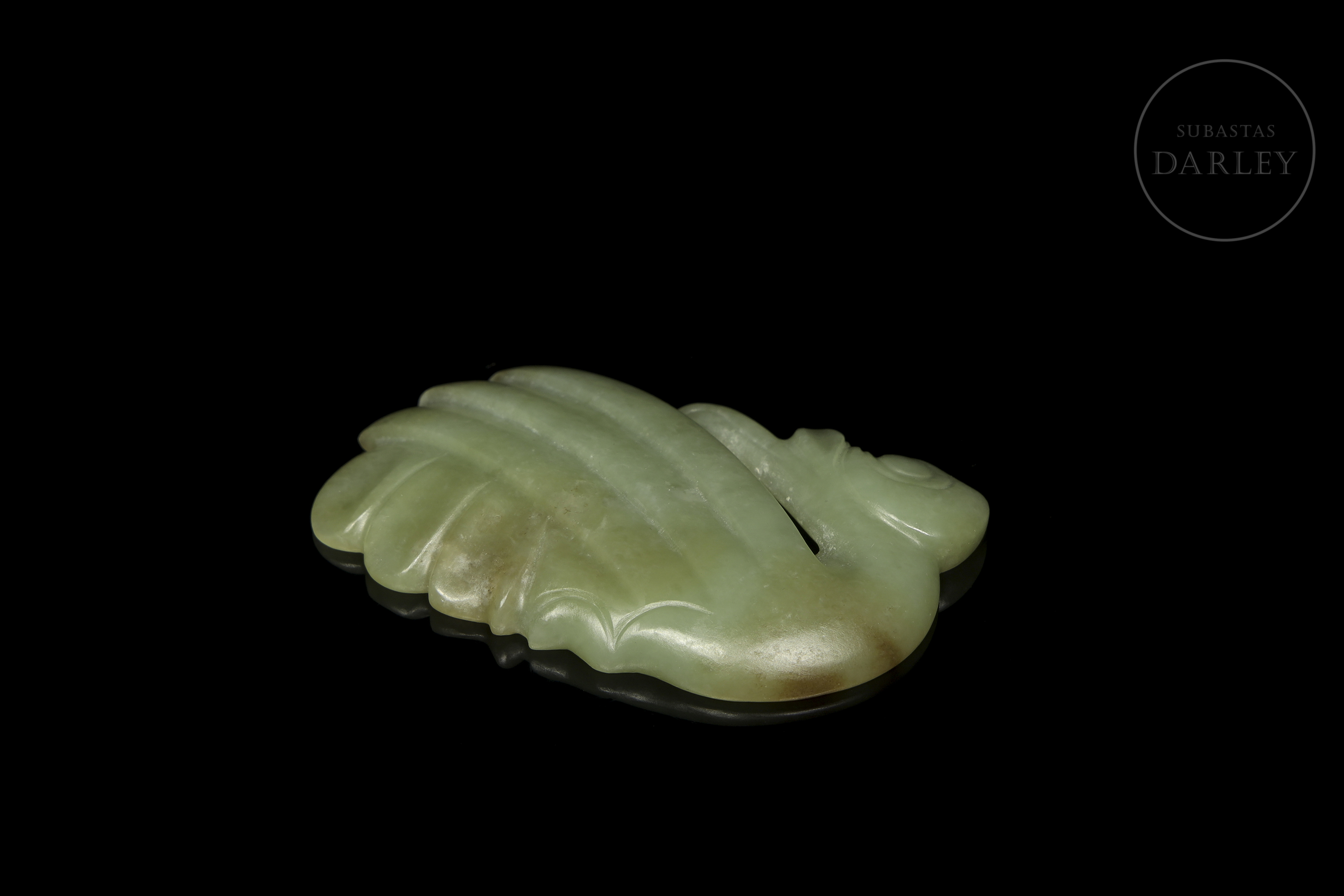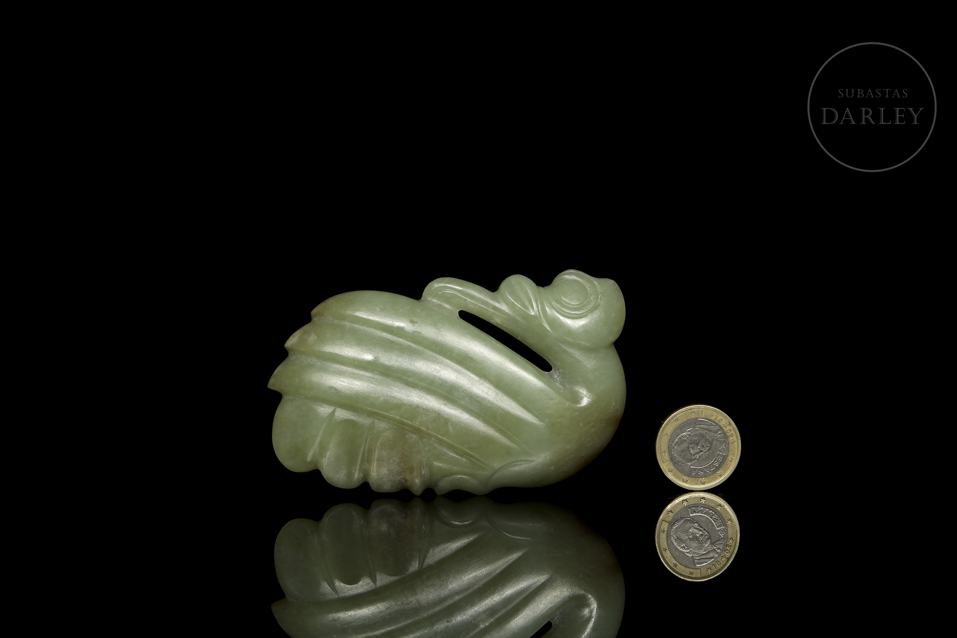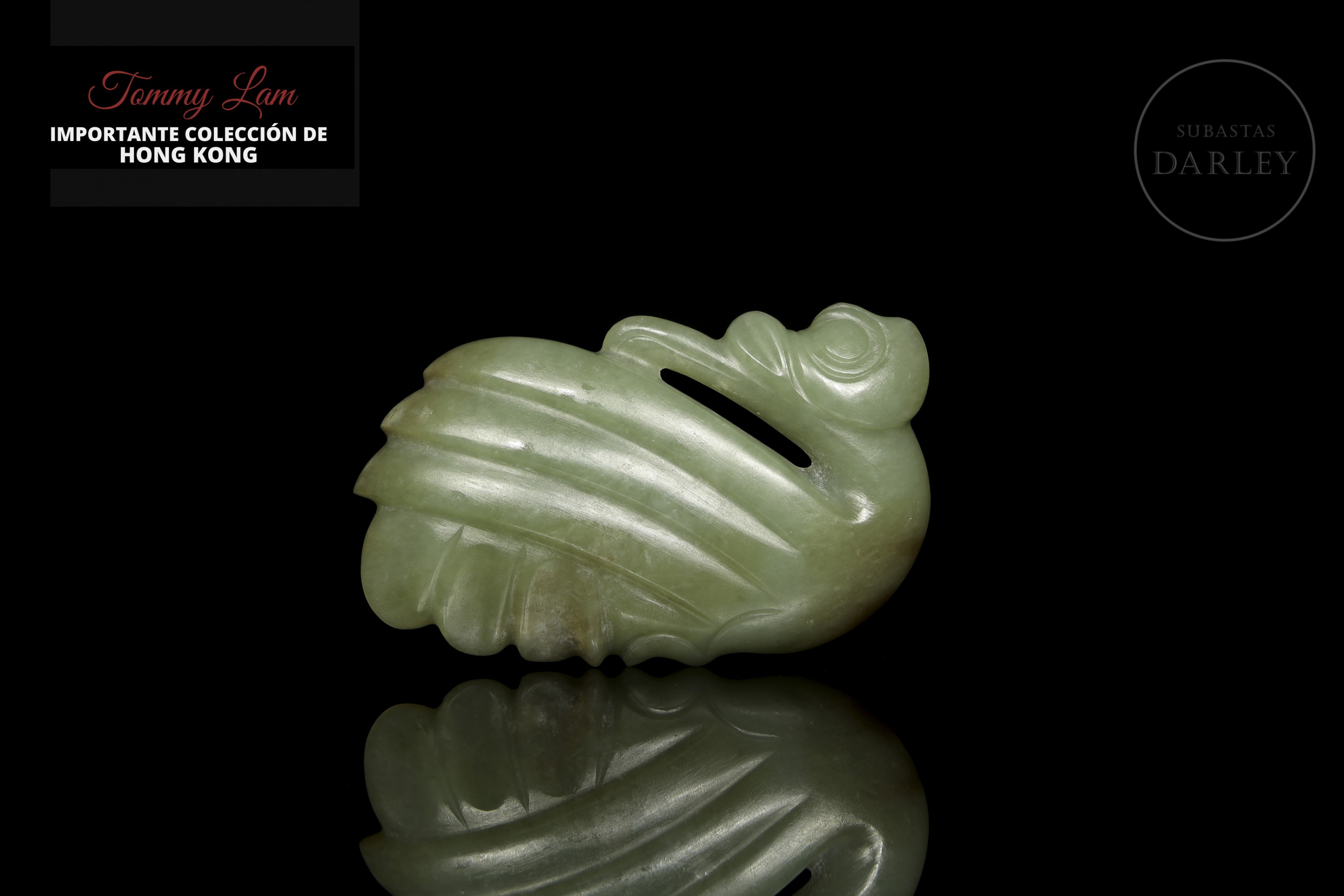 Jade de tono celadón pálido con sutiles zonas de alteración de color pardo. Representa un ave en posición de reposo, con alas recogidas, cuello estilizado y cabeza volteada, apoyando el pico en el lomo. Presenta rasgos esquemáticos, con ojos circulares, y plumas en relieve. En el reverso, se aprecian perforaciones para su suspensión. Cultura Hongshan (aprox. 4000–3000 a.C.) o posterior.