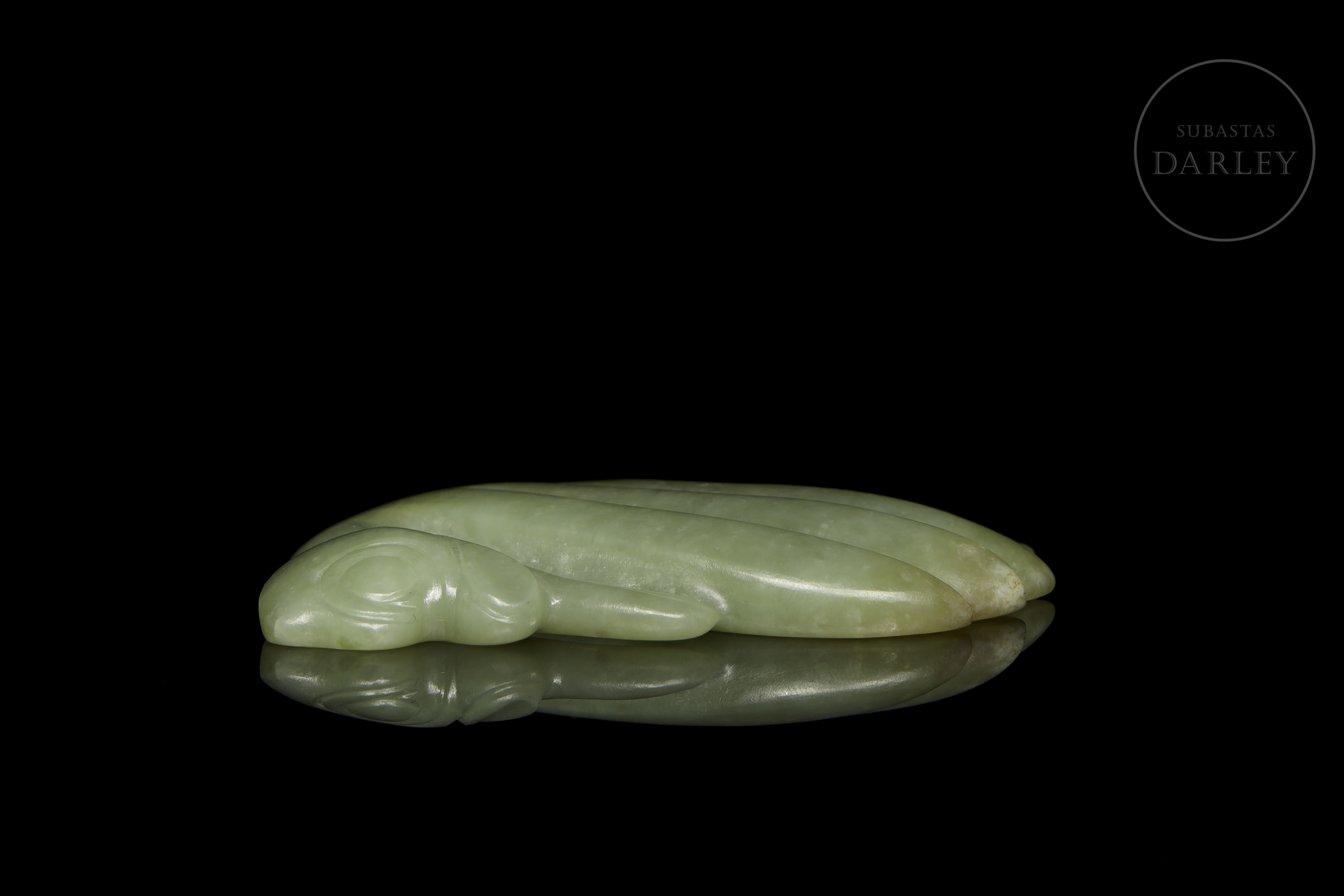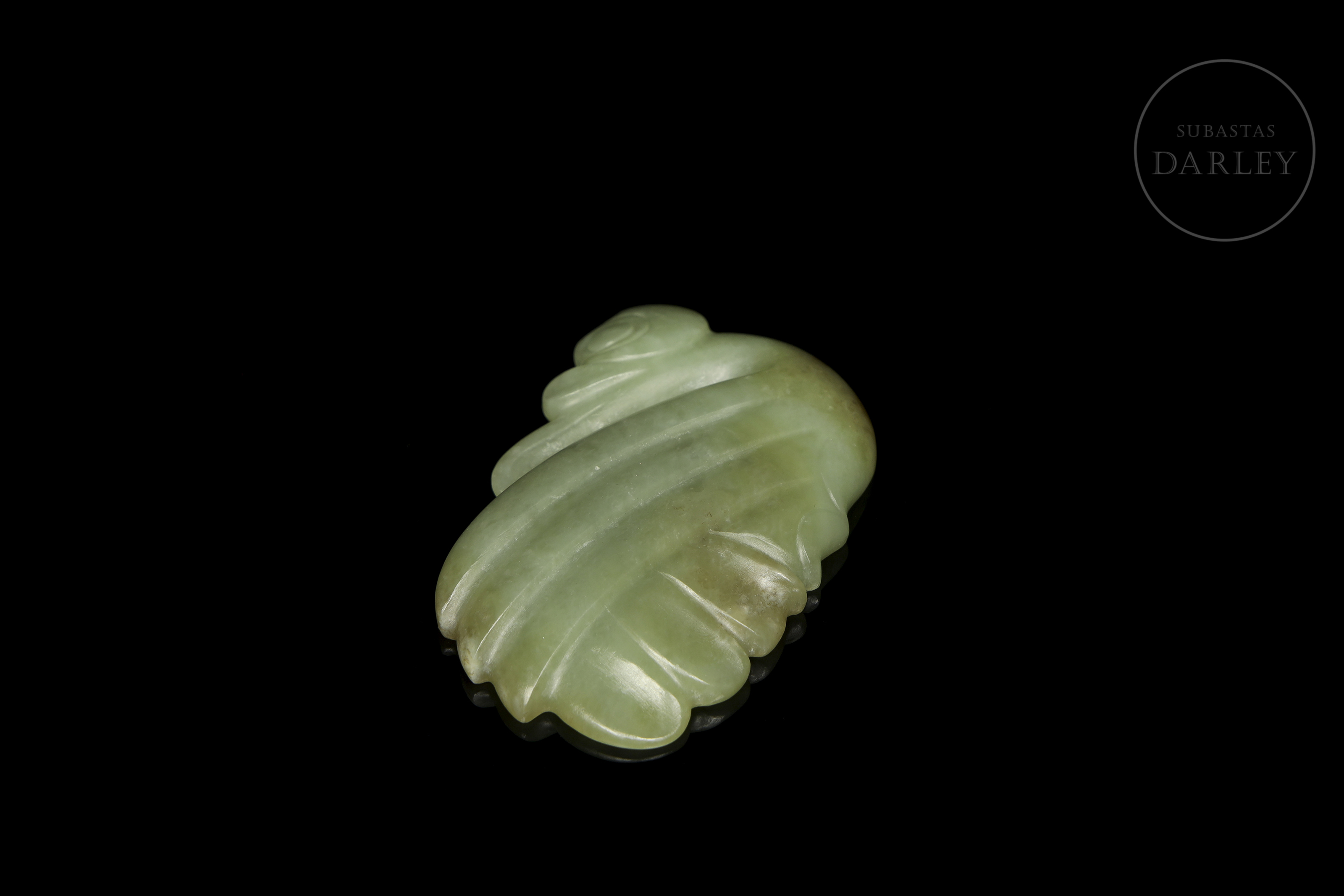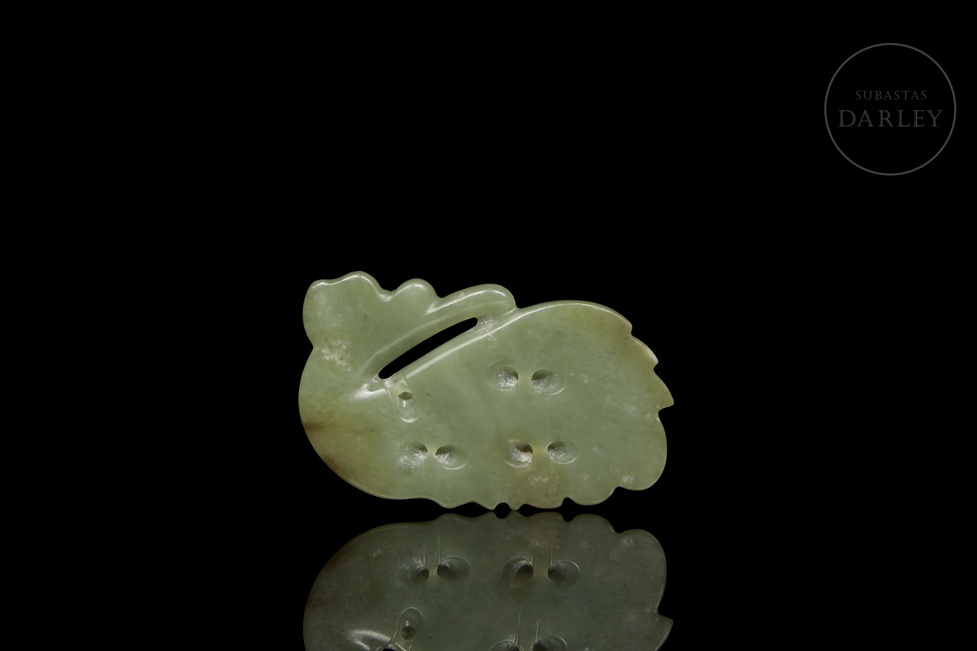 Jade de tono celadón pálido con sutiles zonas de alteración de color pardo. Representa un ave en posición de reposo, con alas recogidas, cuello estilizado y cabeza volteada, apoyando el pico en el lomo. Presenta rasgos esquemáticos, con ojos circulares, y plumas en relieve. En el reverso, se aprecian perforaciones para su suspensión. Cultura Hongshan (aprox. 4000–3000 a.C.) o posterior.