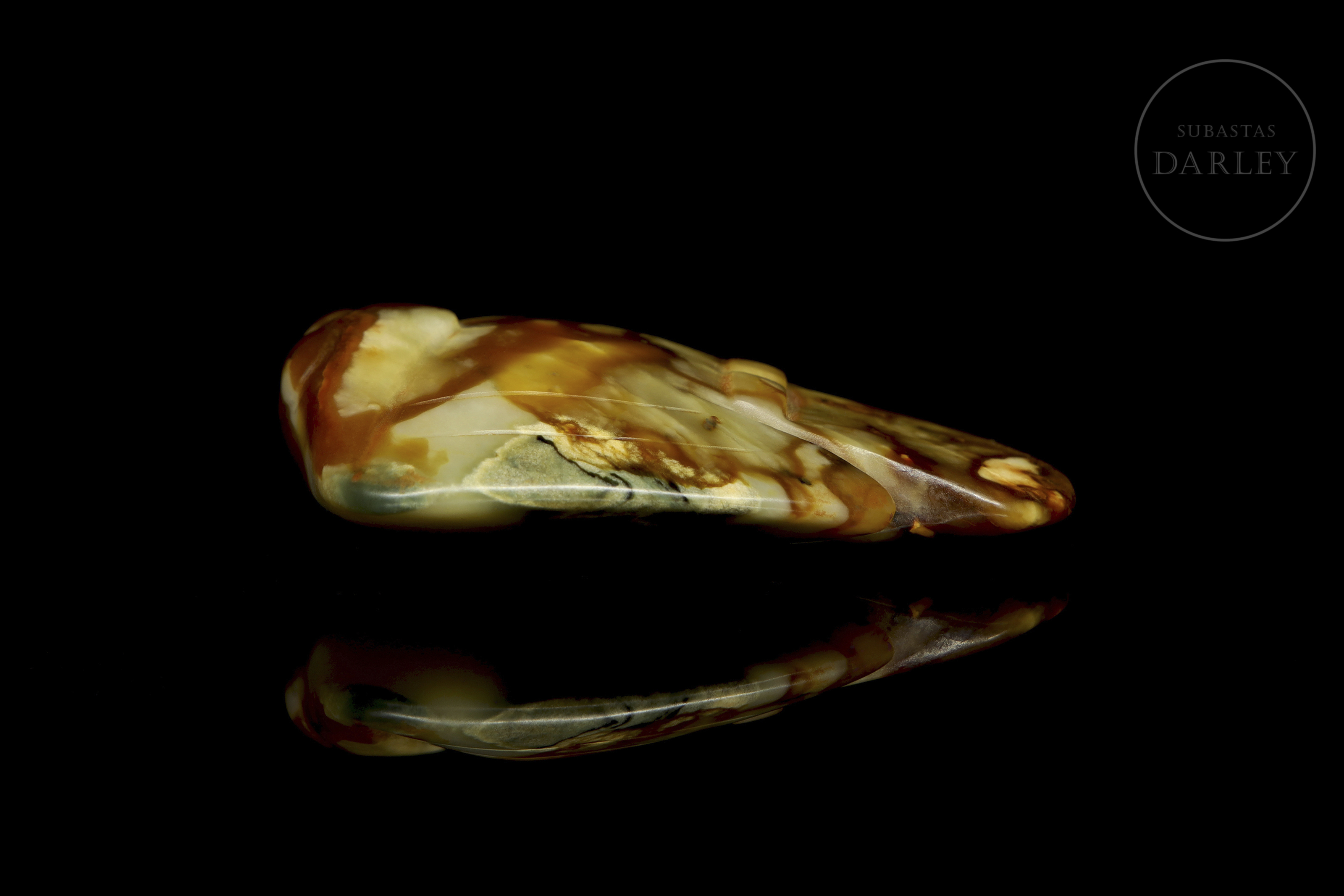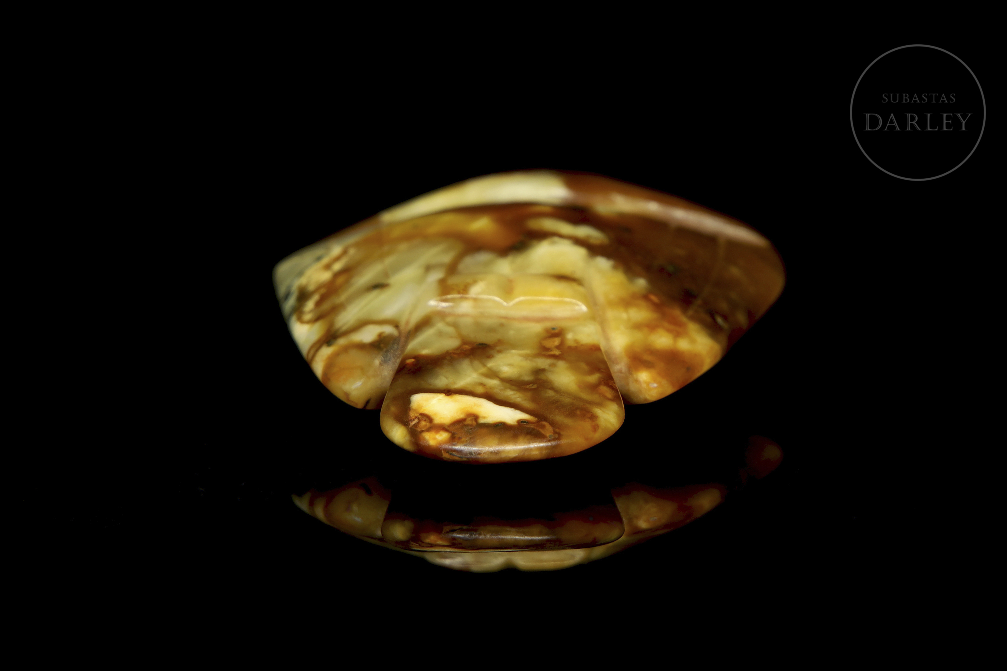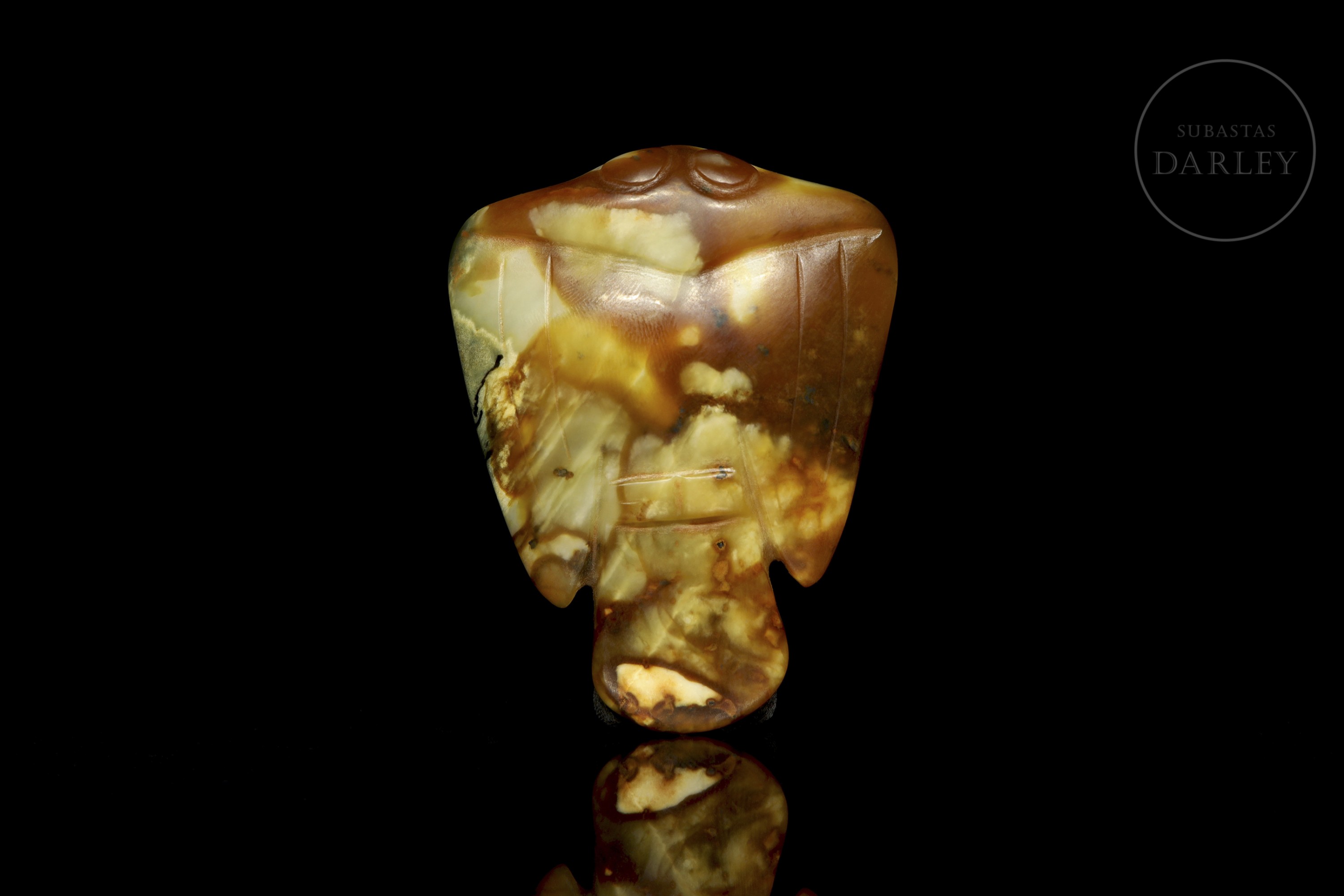 Escultura de jade de forma compacta, representando un ave de talla es esquemática, enfatizando la silueta suave y redondead, con las alas desplegadas y la cabeza recogida. El material presenta un tono base verde grisáceo, enriquecido por áreas de pátina marrón. Cultura Hongshan (c. 4700-2900 a.C.).