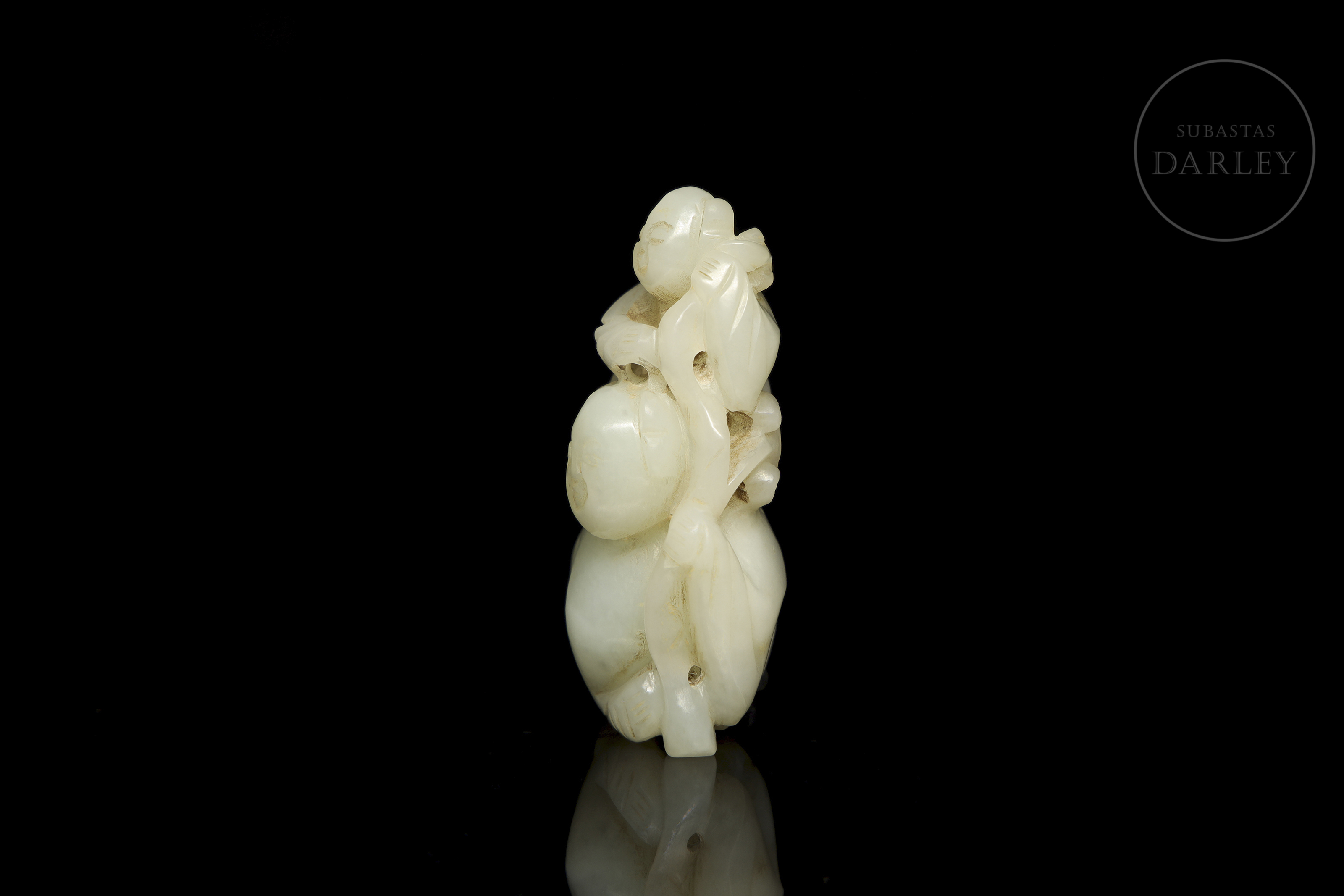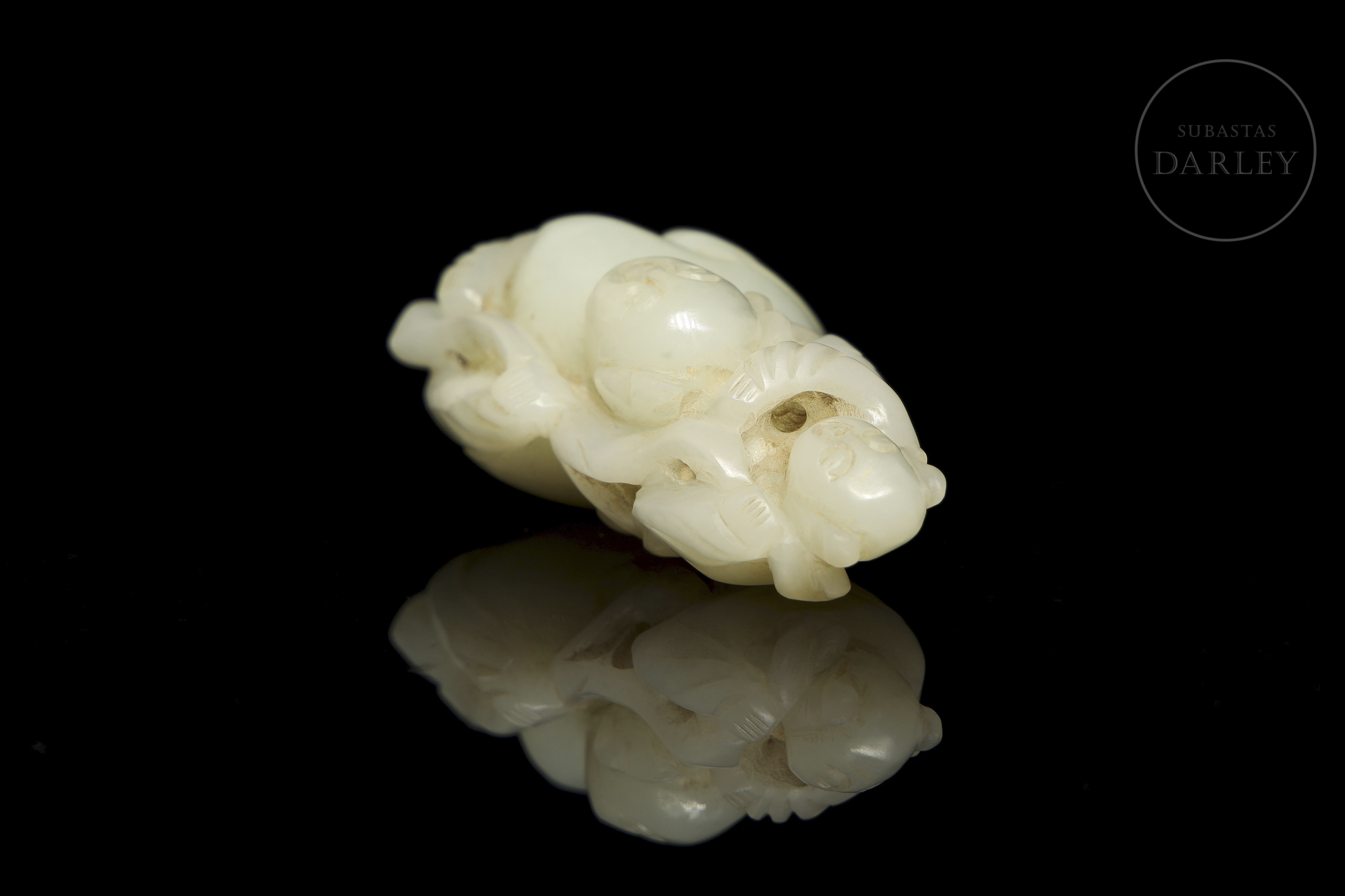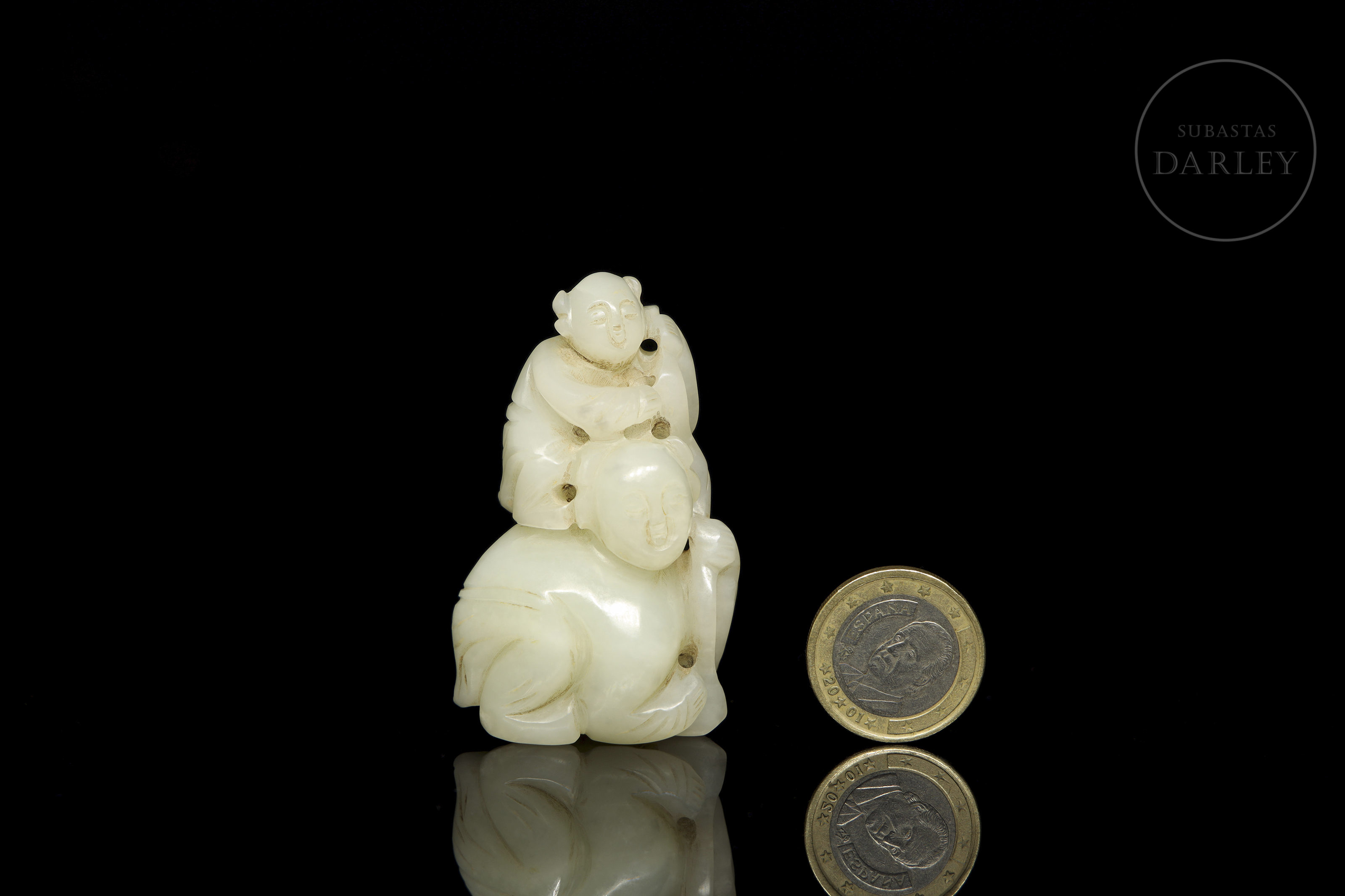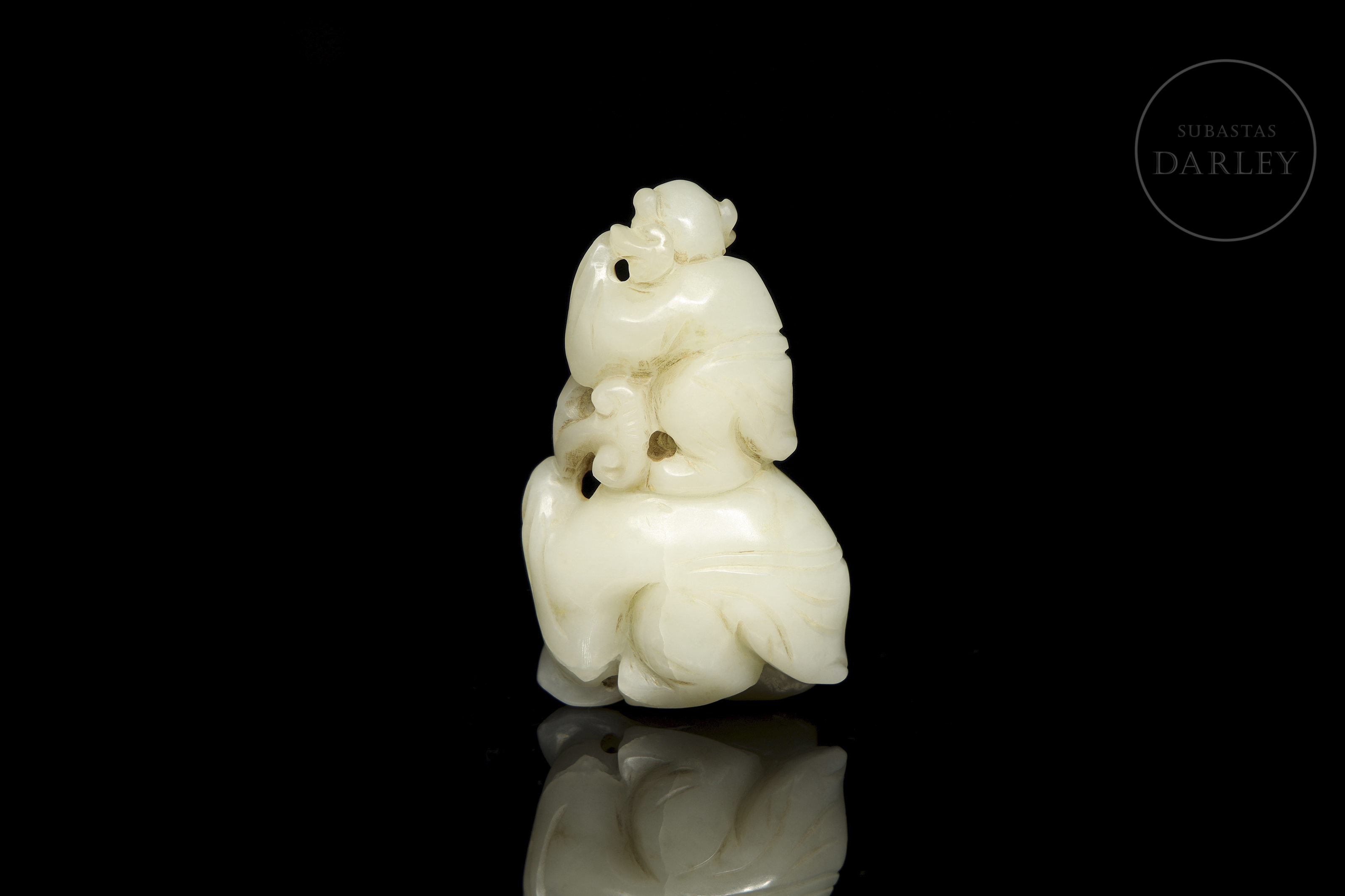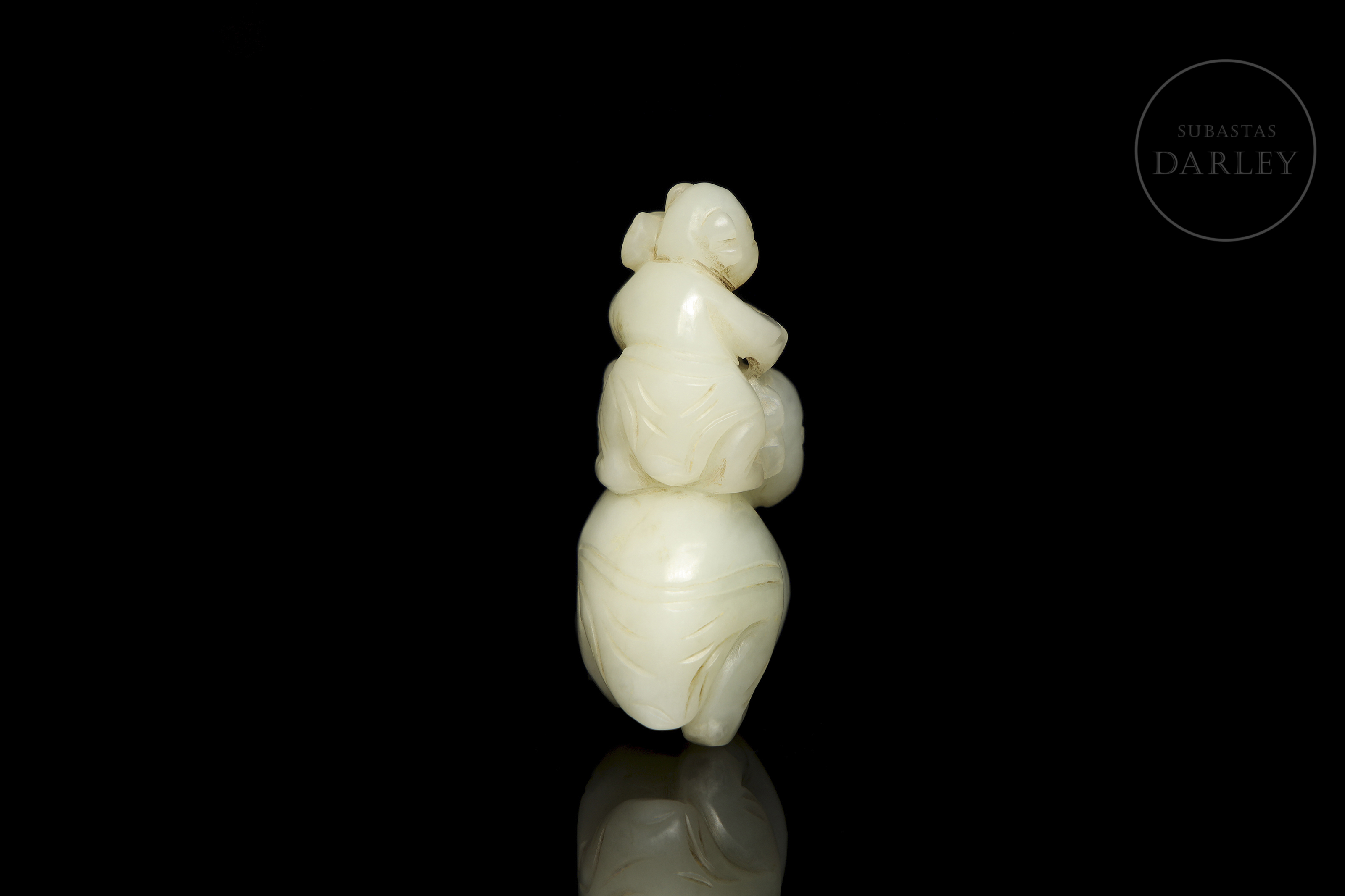 Figura de bulto redondo tallada en jade pulido de un tono blanquecino. La pieza representa un personaje zoomorfo en posición sedente, con patas de animal y brazos flexionados, llevando a un niño sobre la espalda, de actitud jovial. Muestra pátina por envejecimiento.