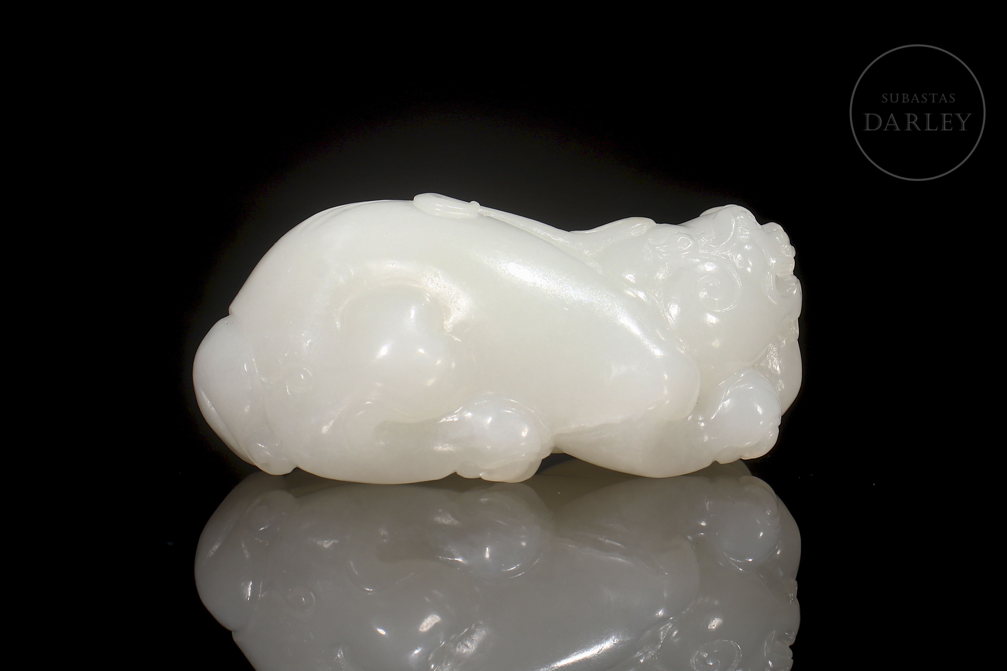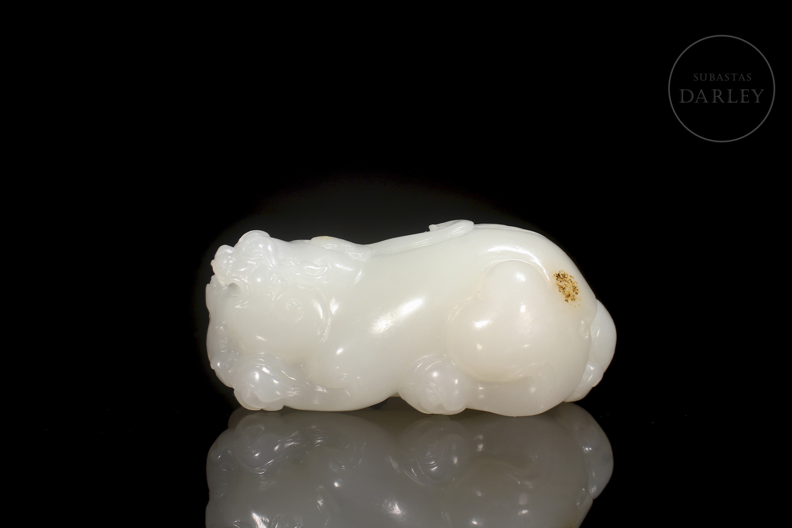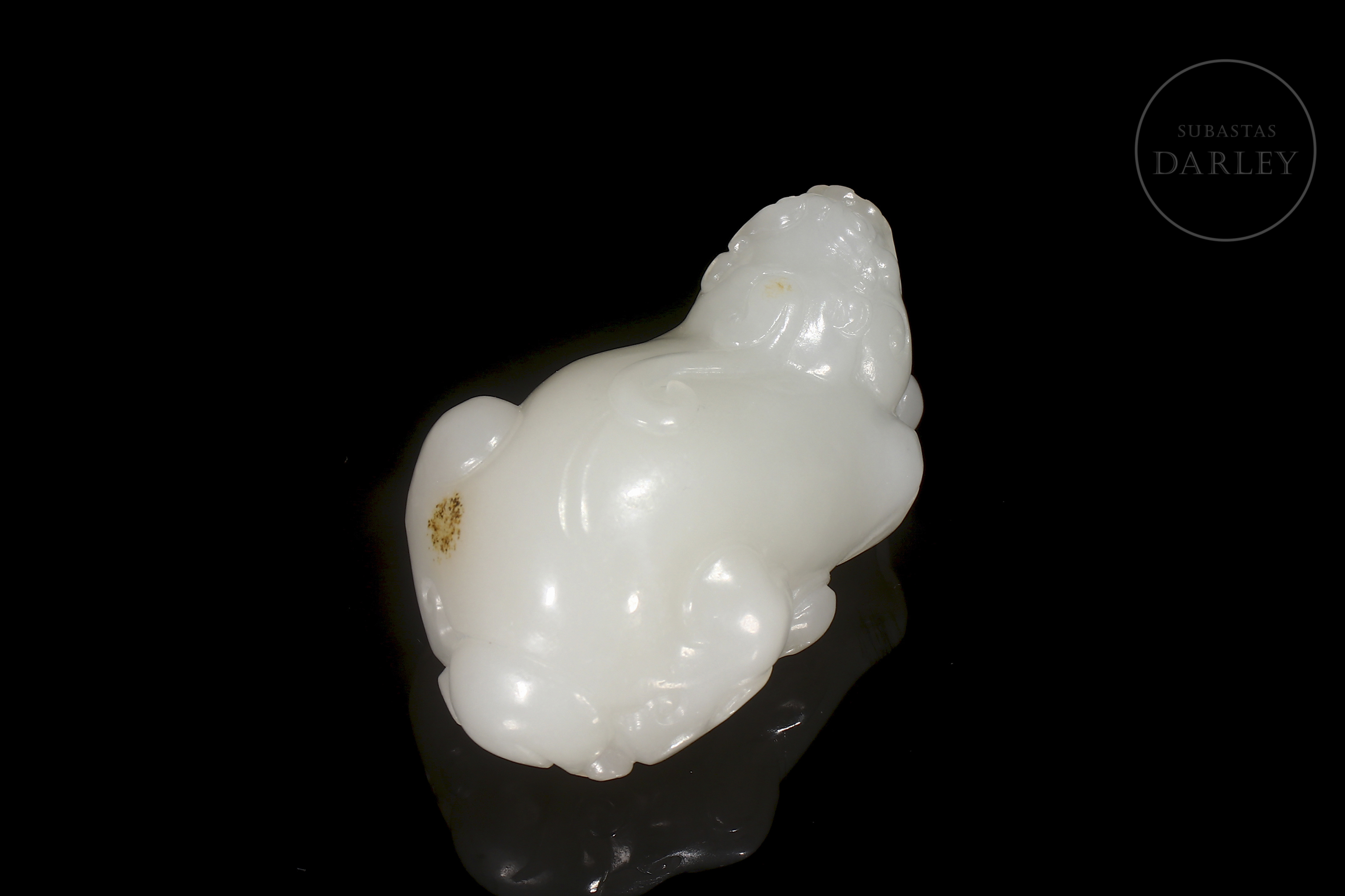 Escultura tallada en jade blanco de Hetian de forma compacta y pulida, representando un pequeño animal fantástico de cuerpo robusto y expresión serena. La superficie es lisa y satinada, con leves detalles incisos en la melena y las patas, y una discreta inclusión natural en el lateral posterior. Se conserva en su caja a medida.