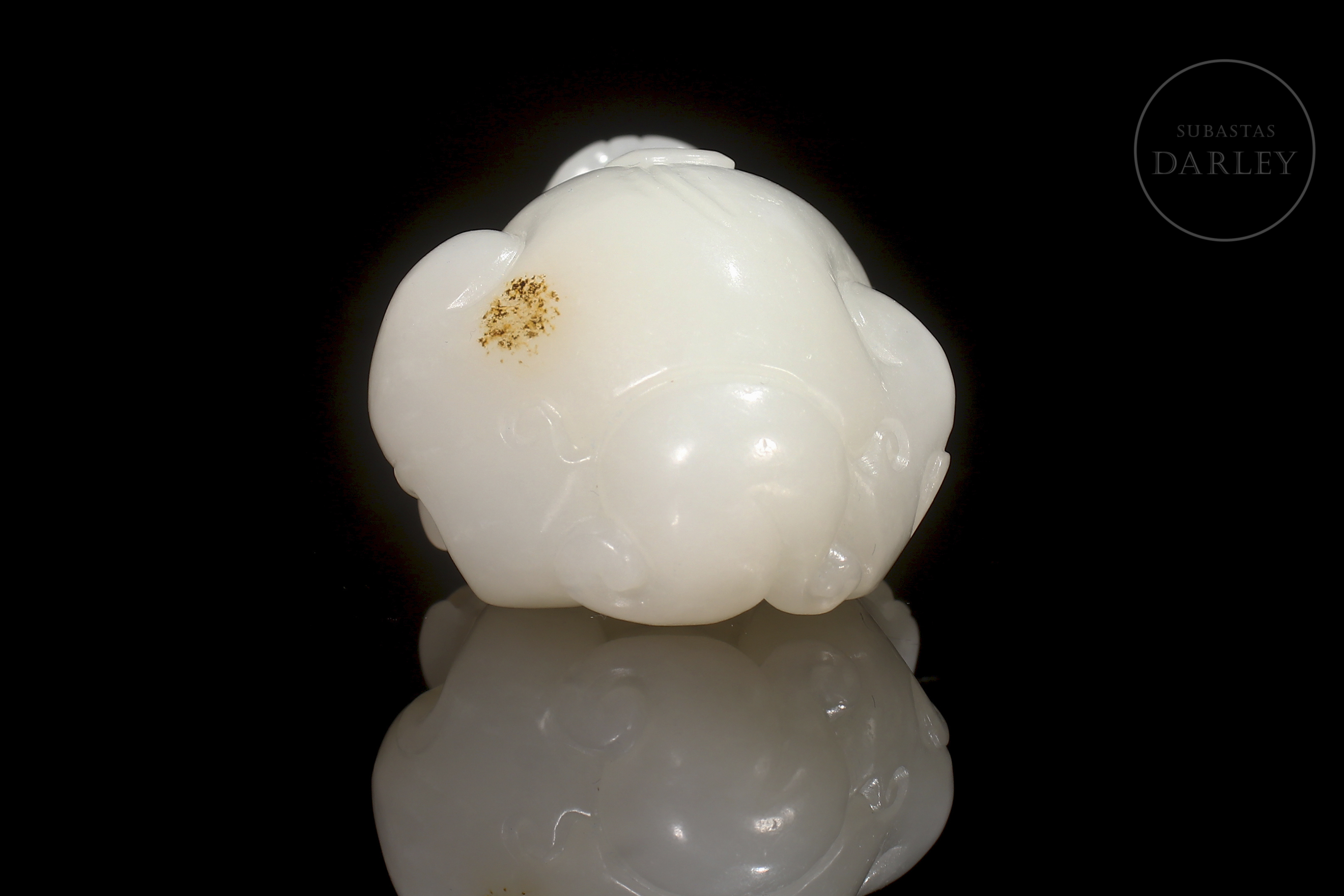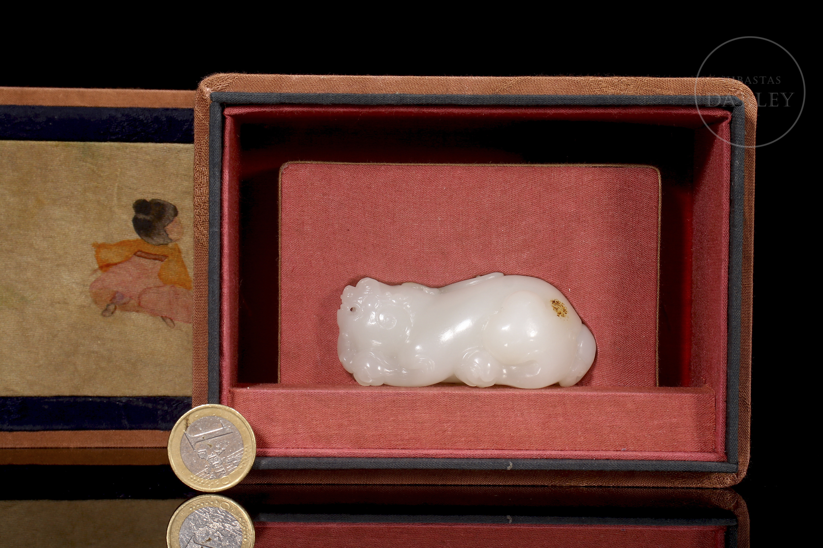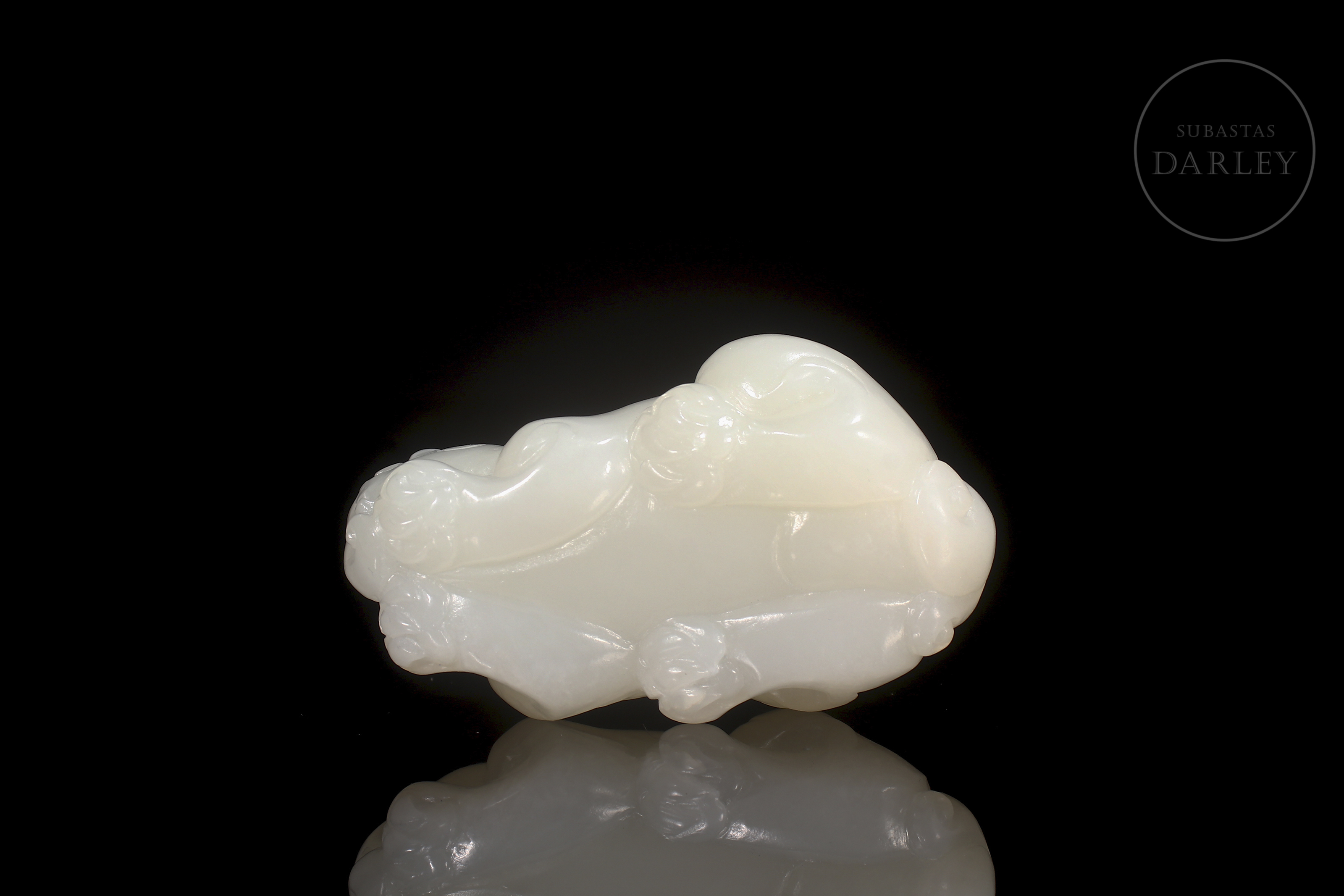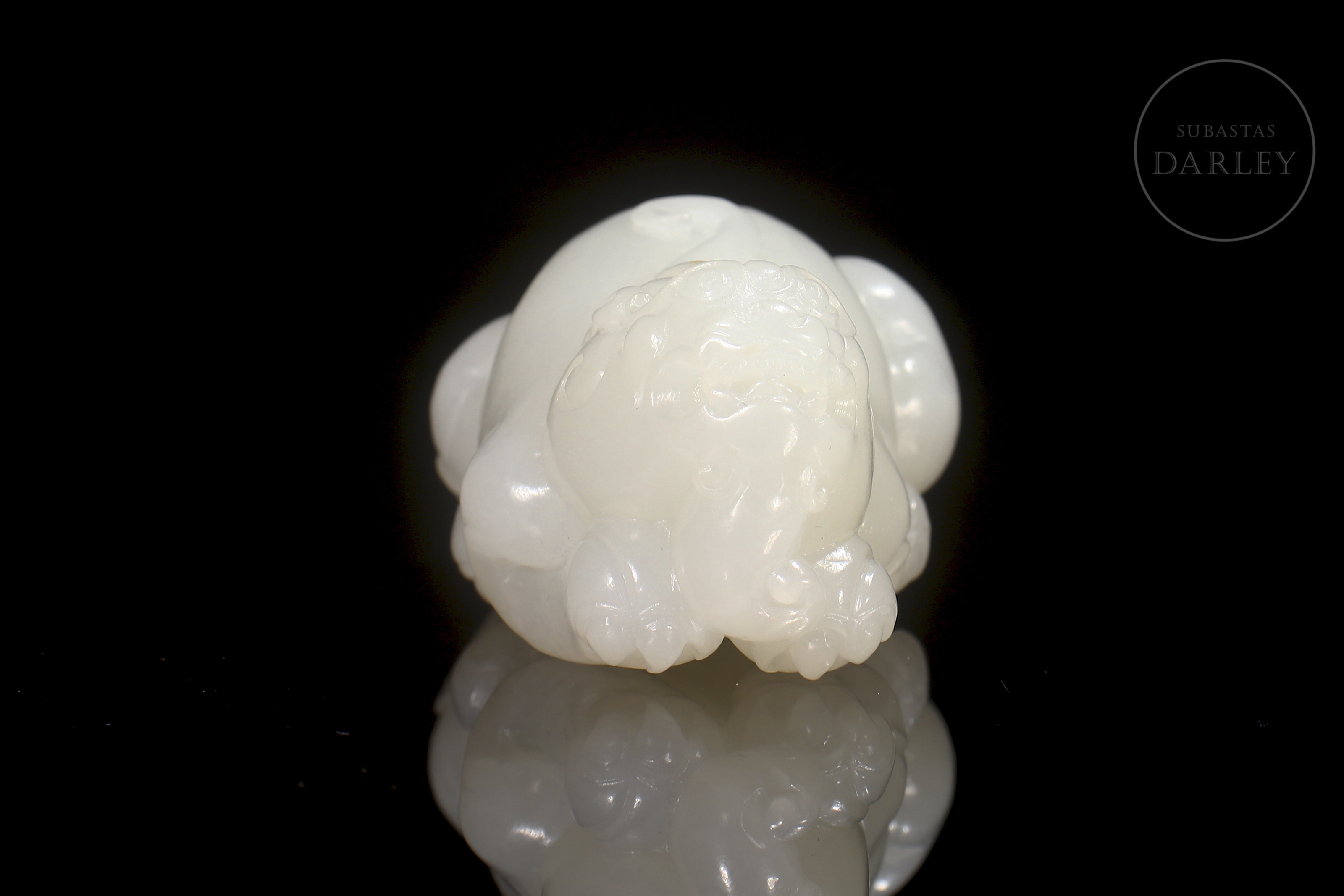 Escultura tallada en jade blanco de Hetian de forma compacta y pulida, representando un pequeño animal fantástico de cuerpo robusto y expresión serena. La superficie es lisa y satinada, con leves detalles incisos en la melena y las patas, y una discreta inclusión natural en el lateral posterior. Se conserva en su caja a medida.