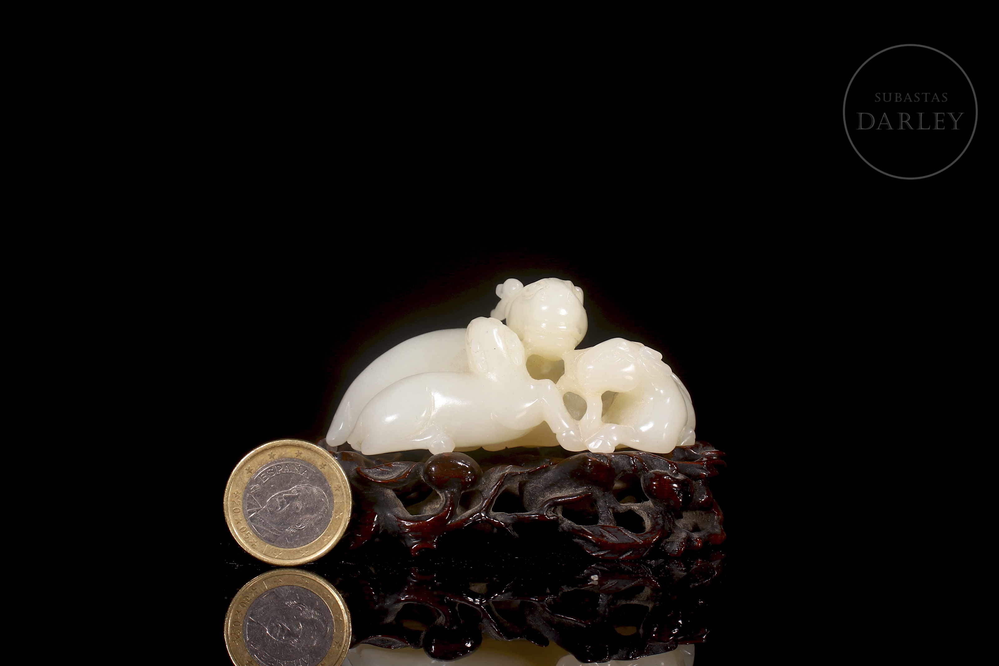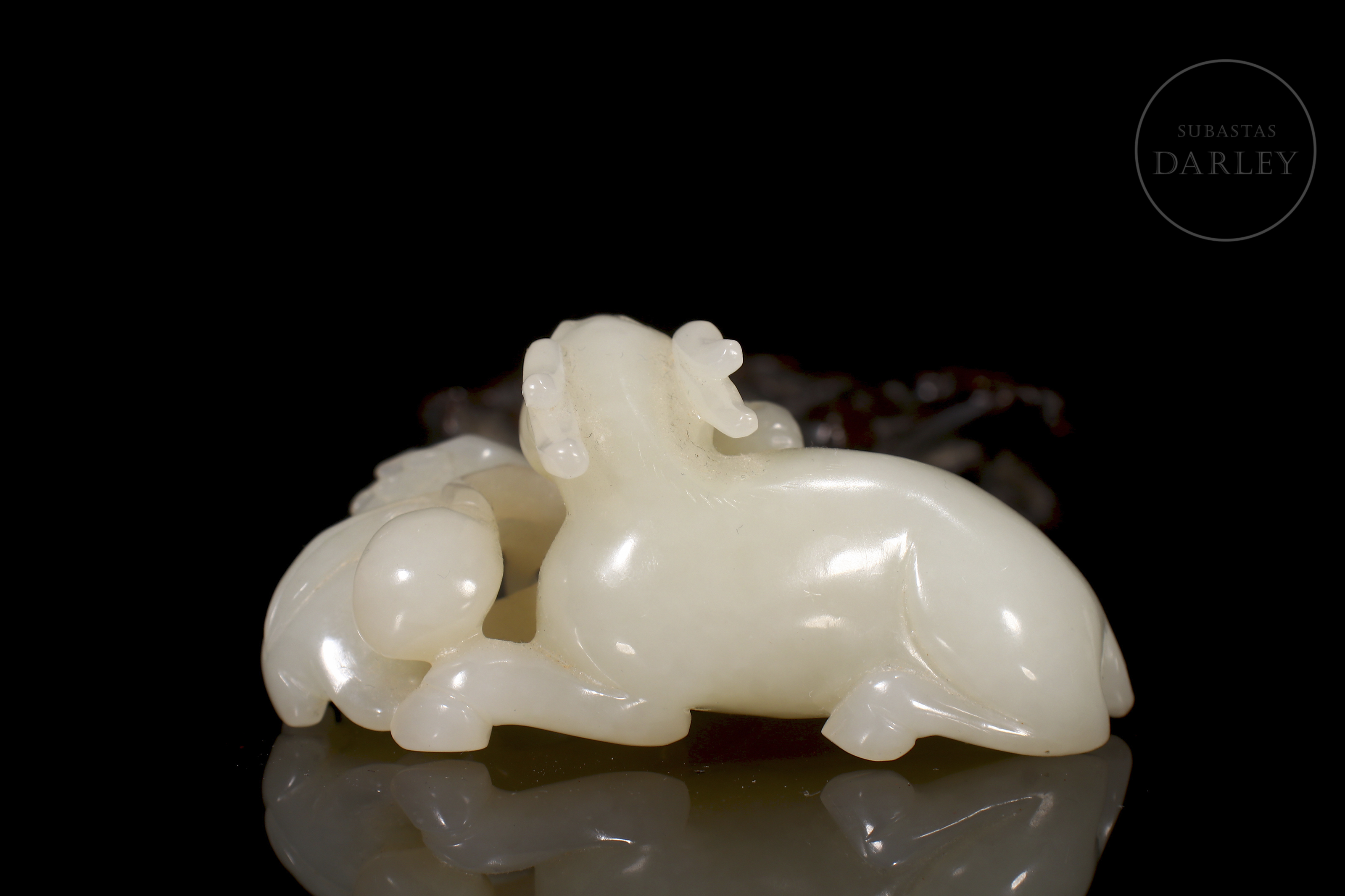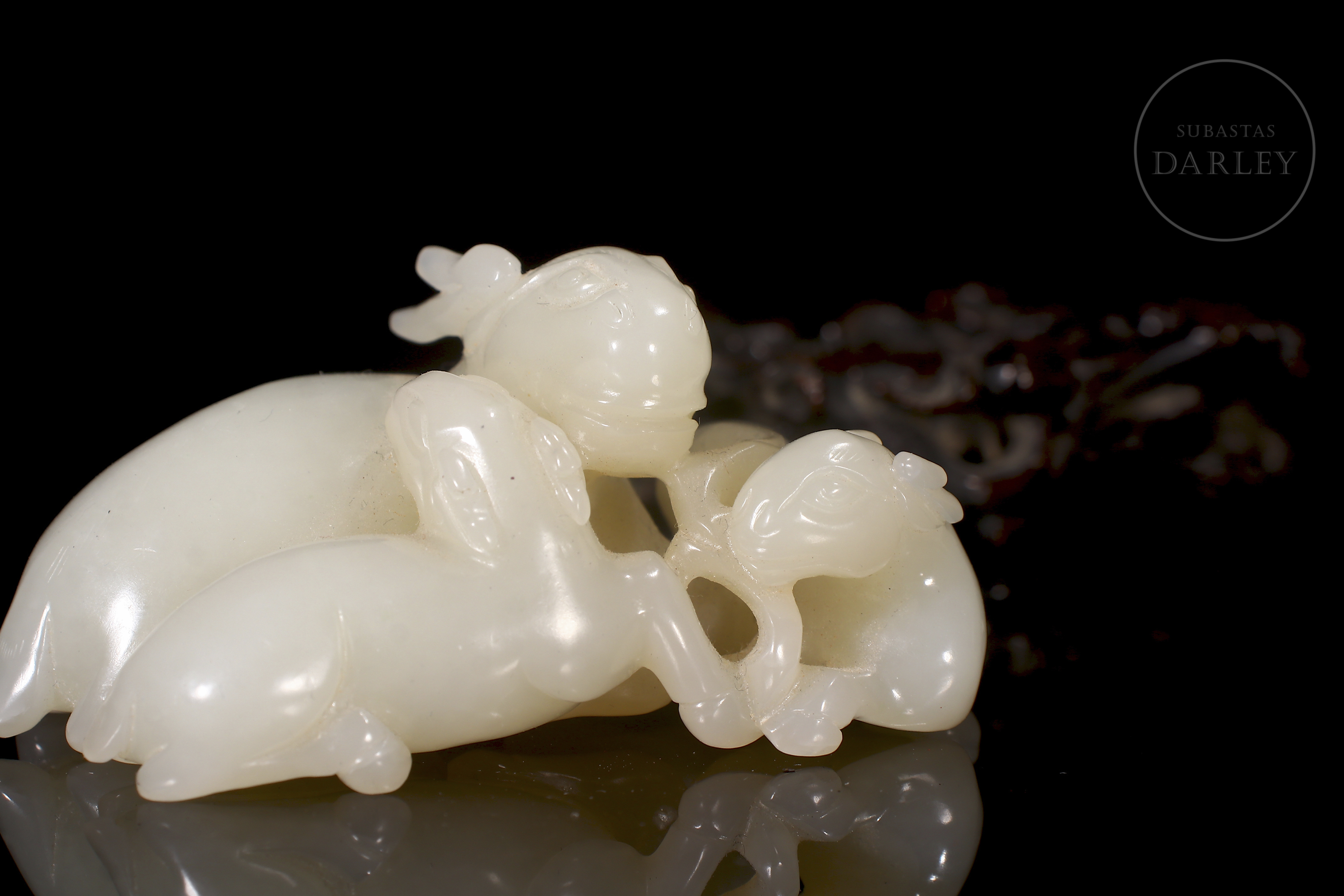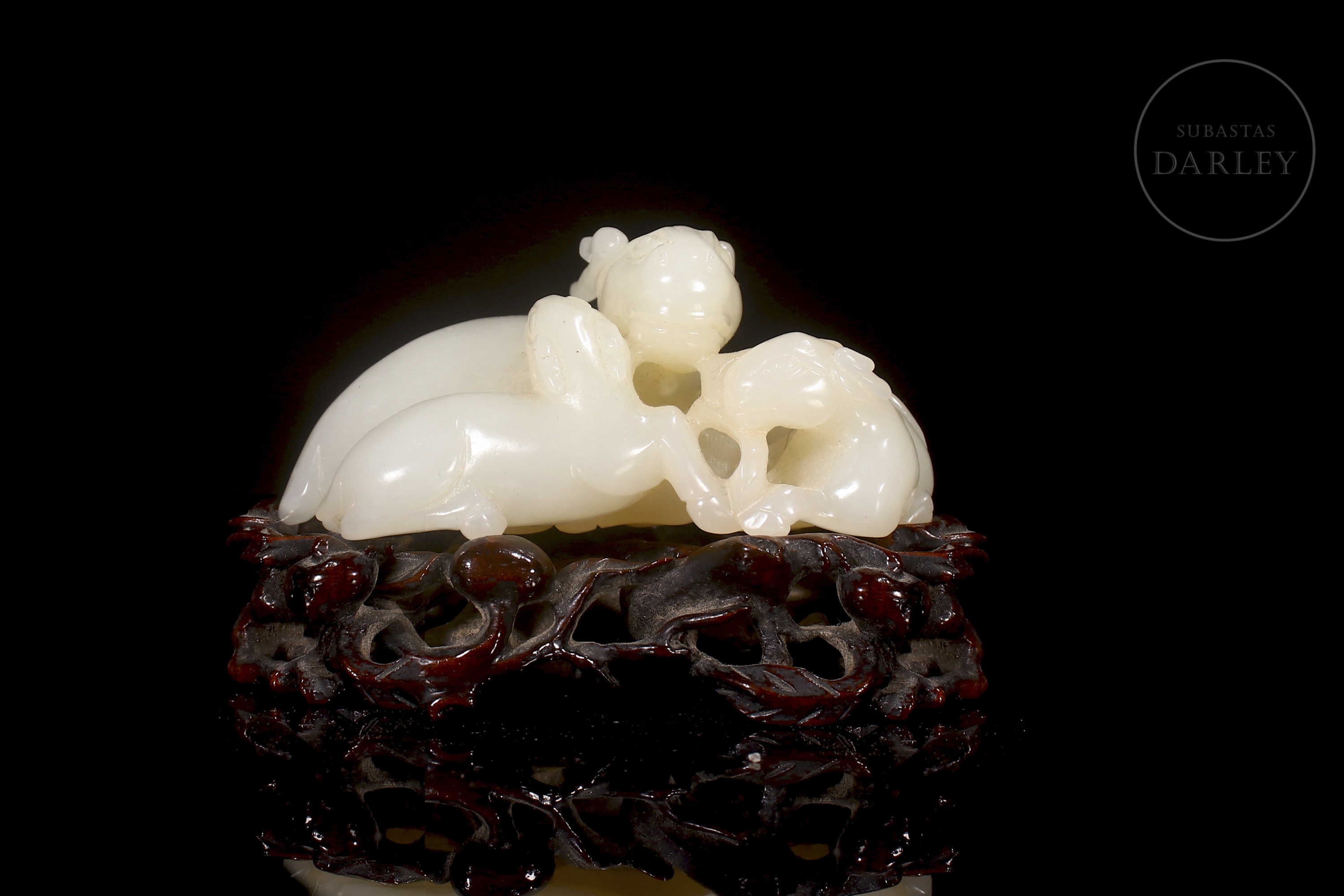 Jade blanco de Hetian que muestra tres carneros recostados, una madre con sus crías. Sus cuerpos se entrelazan en un delicado juego de miradas y posturas. Destacan los finos detalles incisos en las cabezas y cornamentas, así como los pequeños orificios calados. La pieza se acompaña de una base de madera tallada en entramado vegetal.