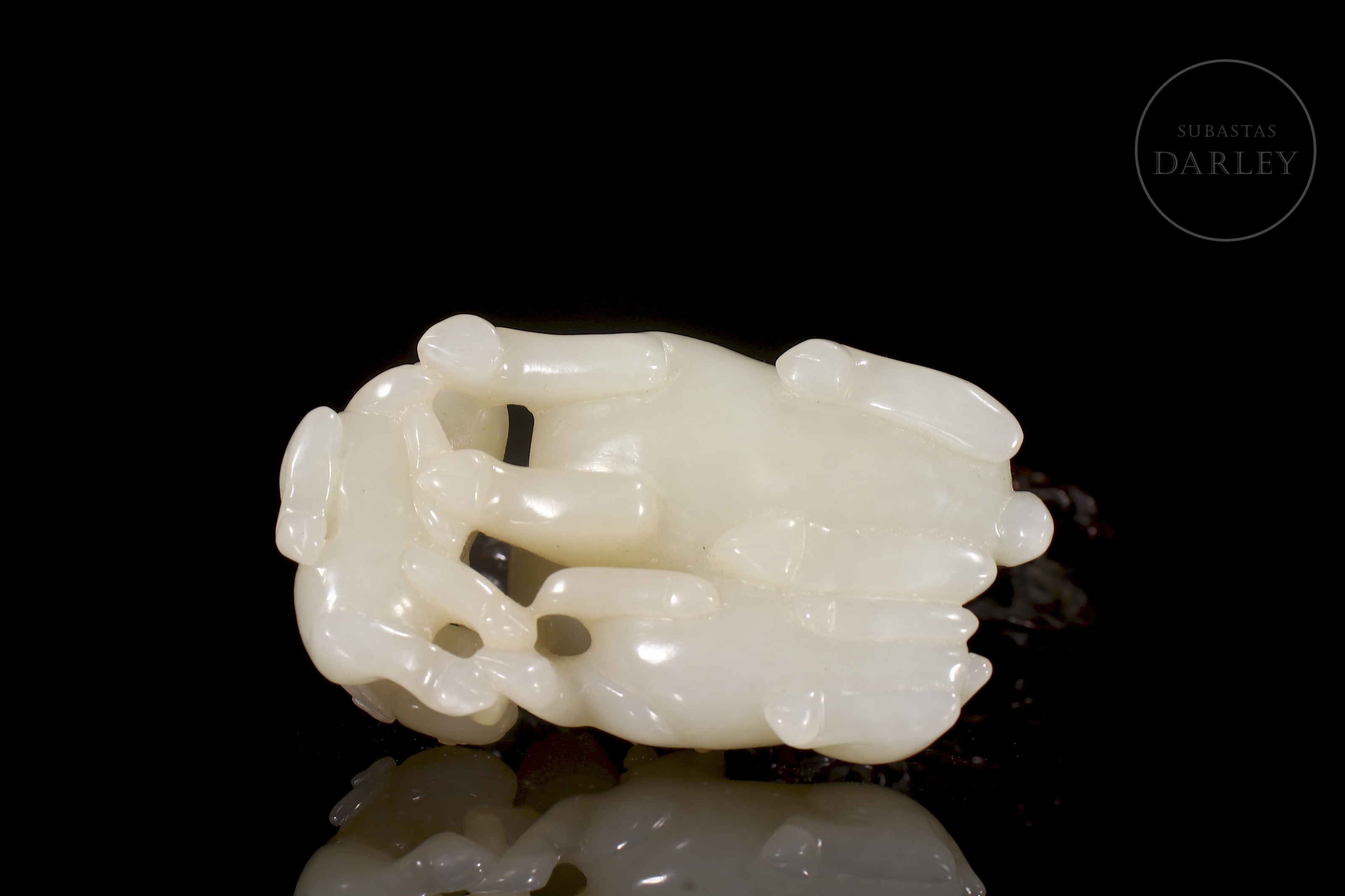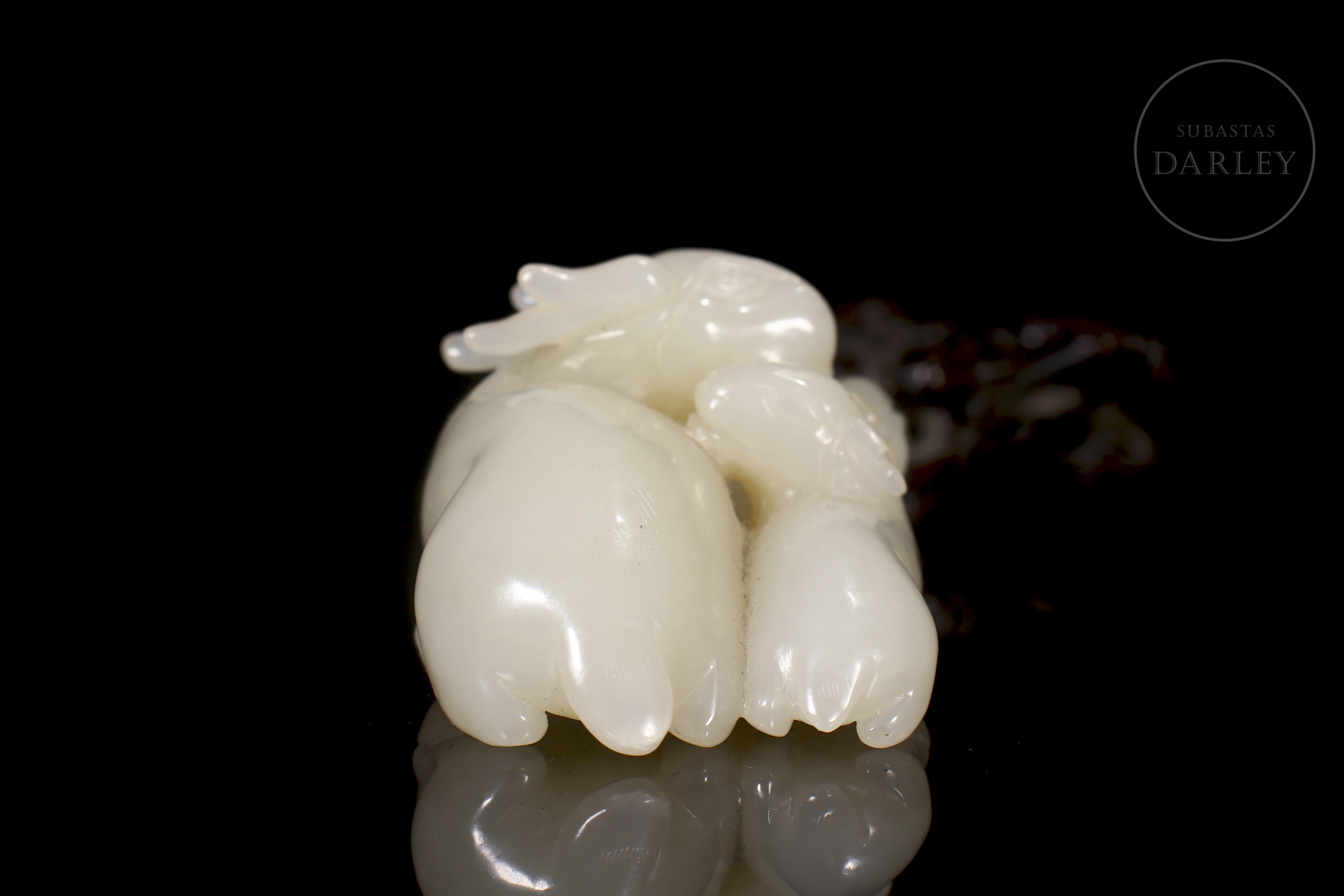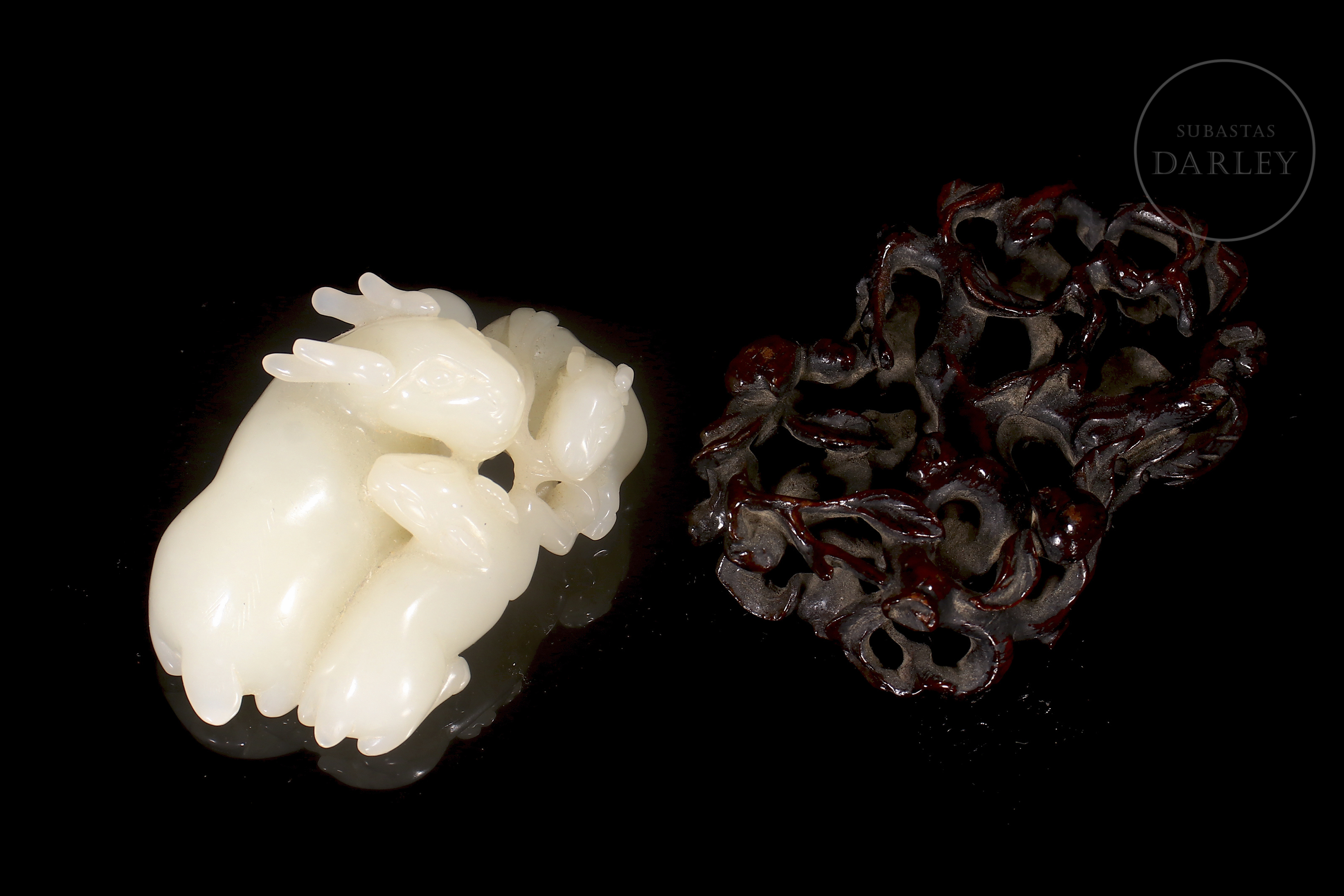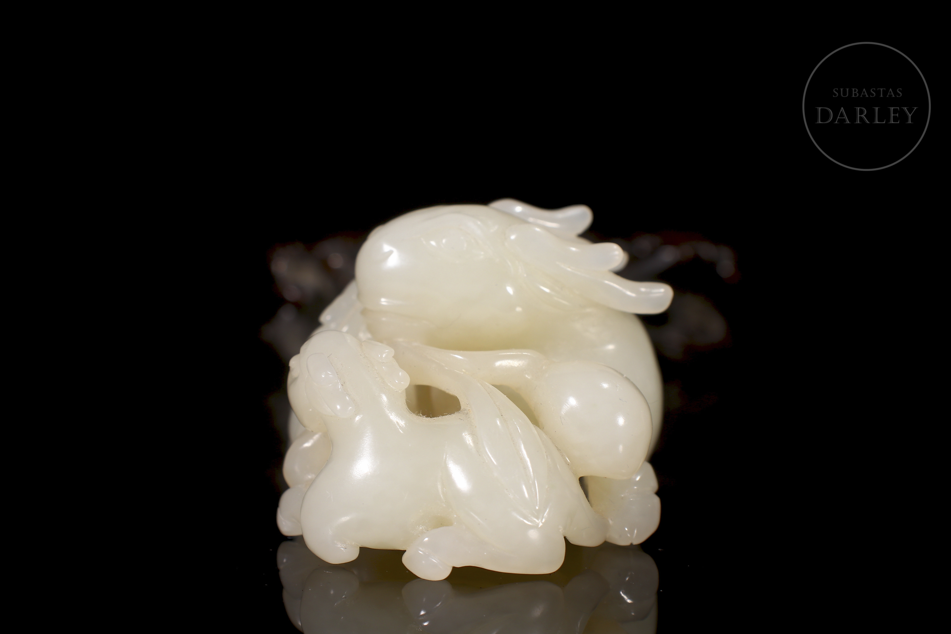 Jade blanco de Hetian que muestra tres carneros recostados, una madre con sus crías. Sus cuerpos se entrelazan en un delicado juego de miradas y posturas. Destacan los finos detalles incisos en las cabezas y cornamentas, así como los pequeños orificios calados. La pieza se acompaña de una base de madera tallada en entramado vegetal.
