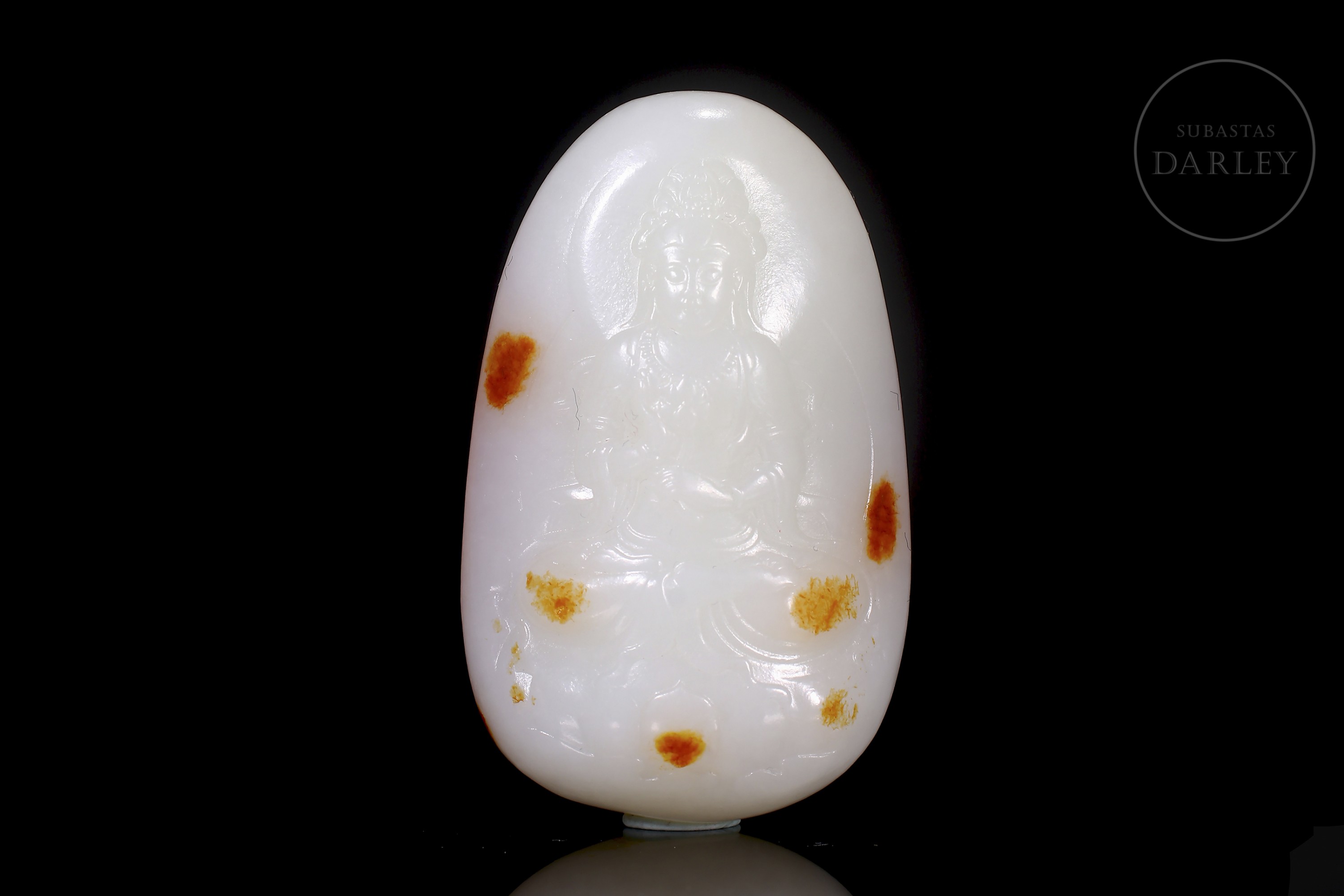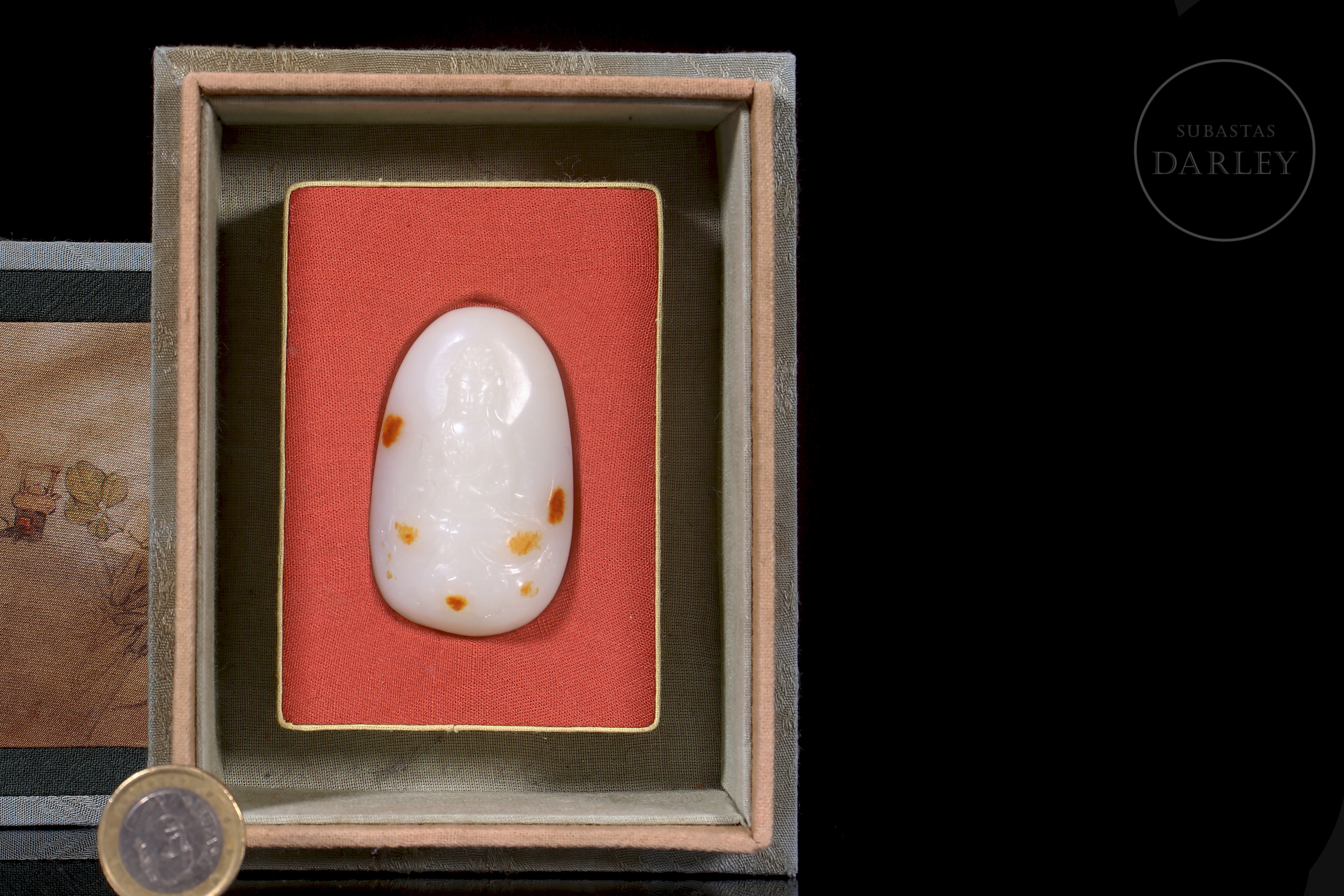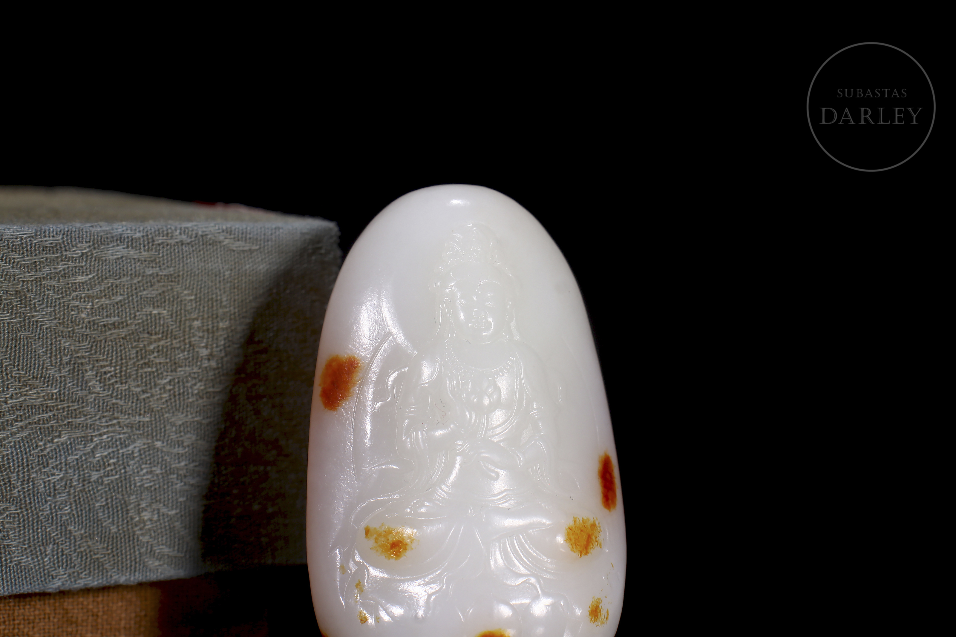 Figura tallada de jade blanco de Hetian, de forma lisa y ovalada, con áreas de pátina natural de color naranja rojizo. La decoración se basa en la talla sutil y superficial en bajo relieve de Guanyin en pose de meditación, con los pliegues de la túnica y los rasgos faciales suaves. Con caja forrada a medida.