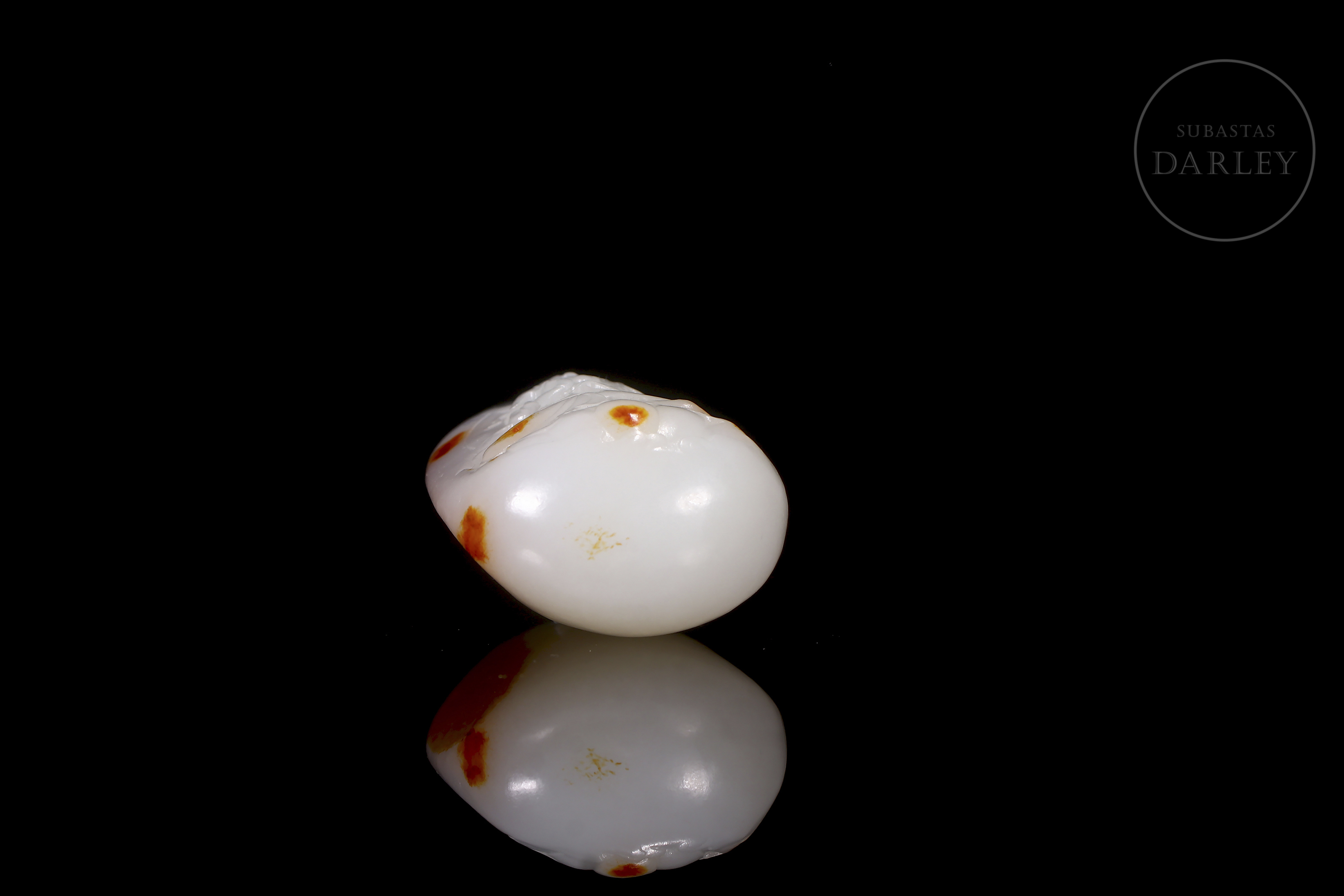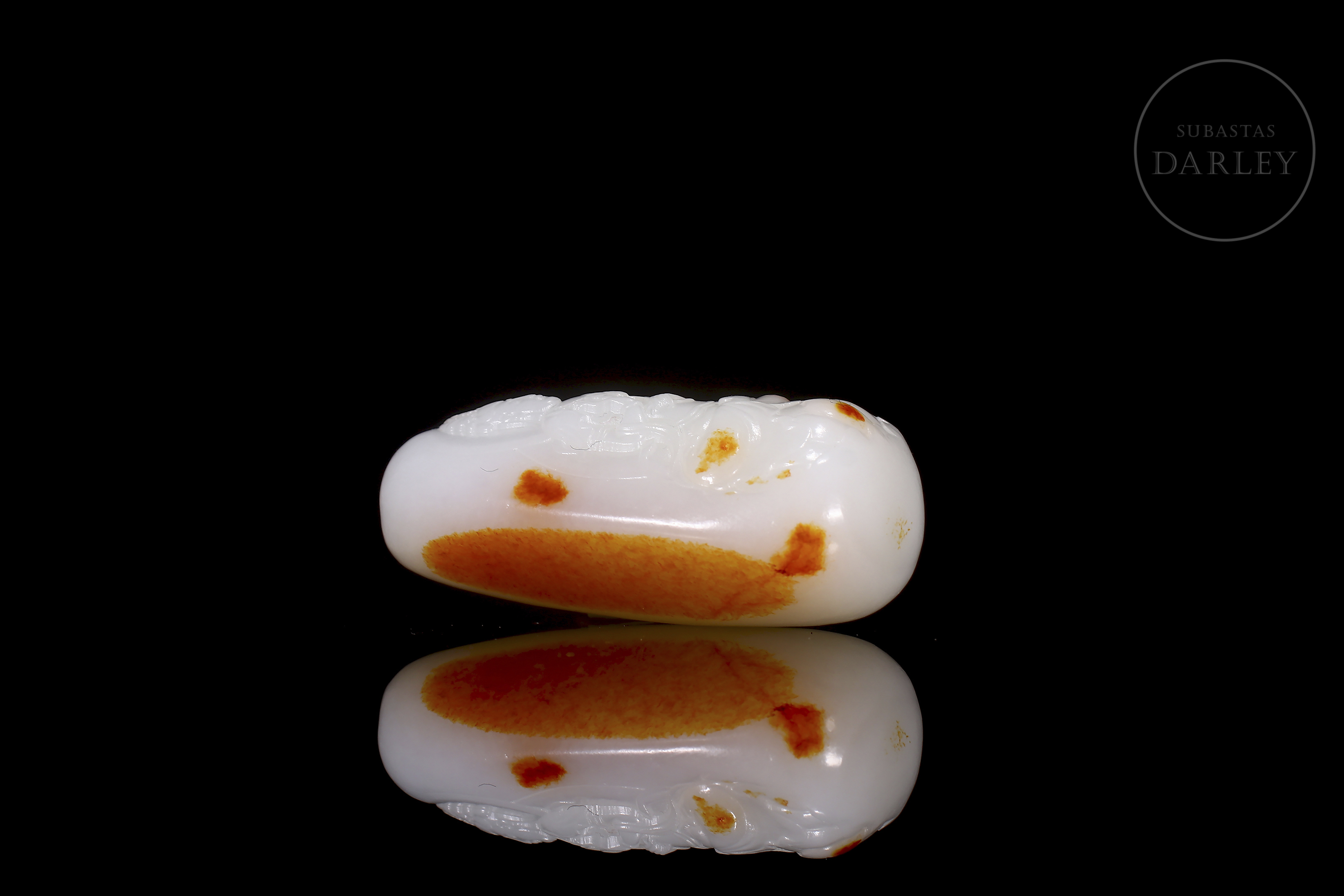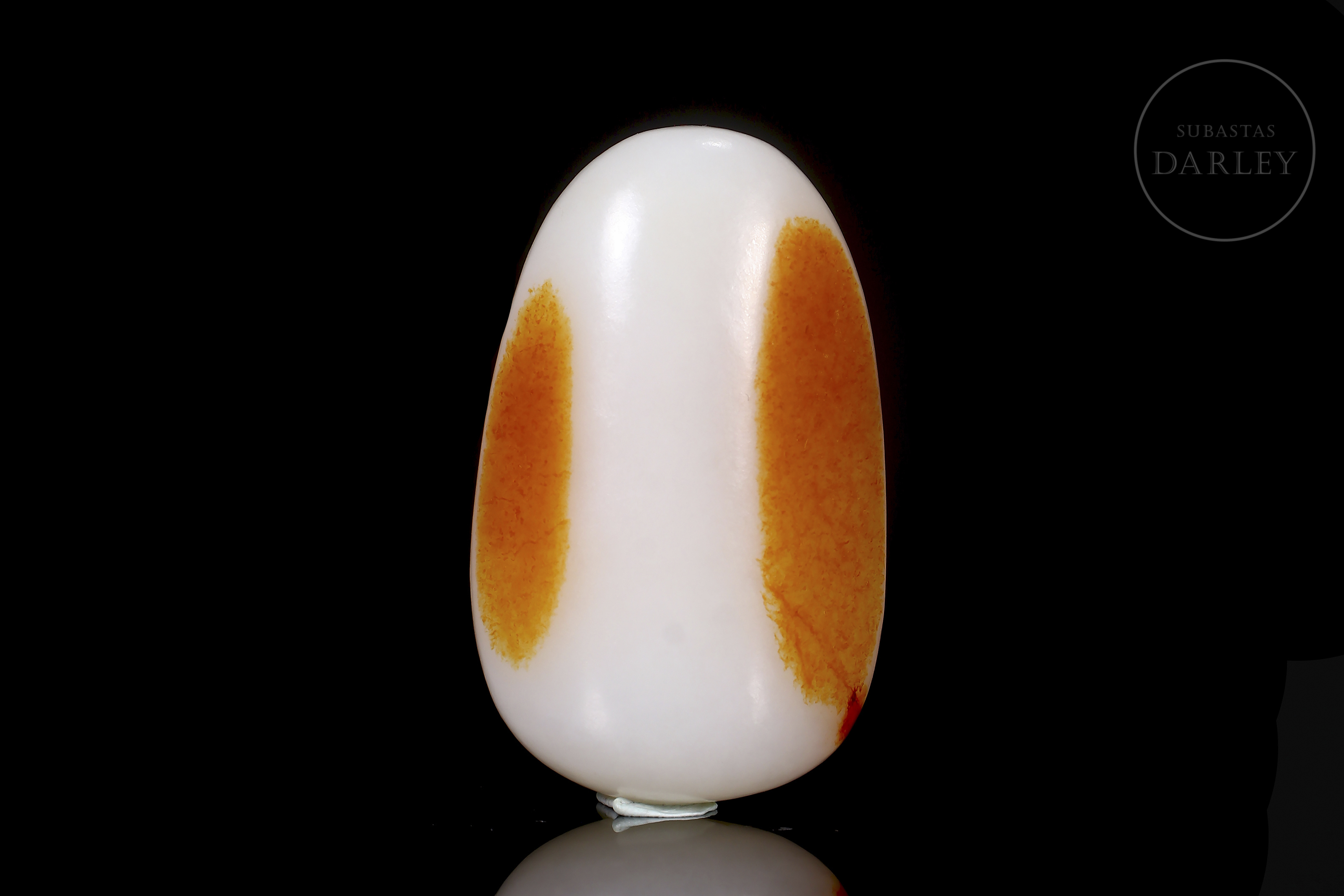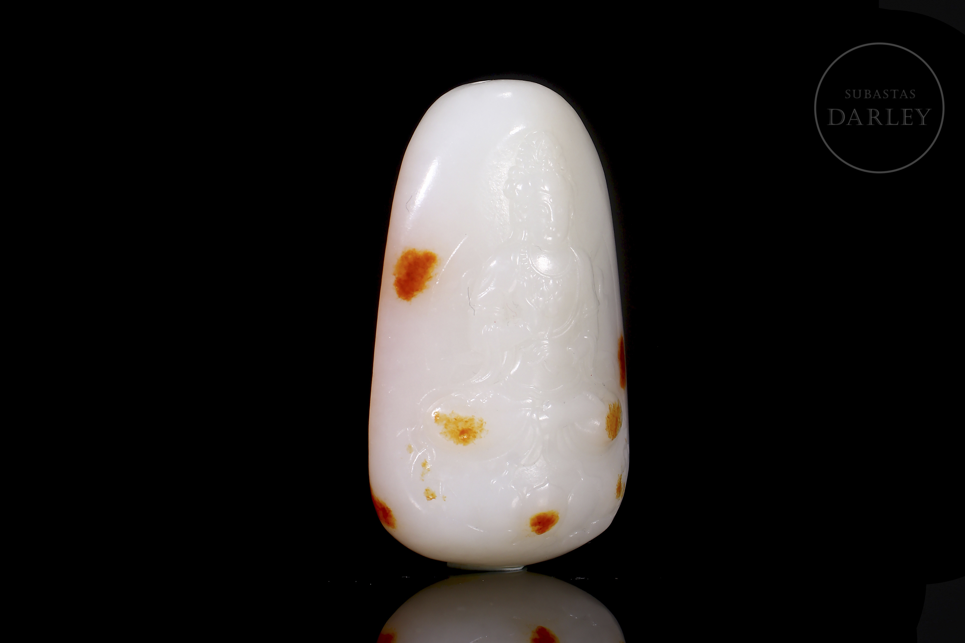 Figura tallada de jade blanco de Hetian, de forma lisa y ovalada, con áreas de pátina natural de color naranja rojizo. La decoración se basa en la talla sutil y superficial en bajo relieve de Guanyin en pose de meditación, con los pliegues de la túnica y los rasgos faciales suaves. Con caja forrada a medida.