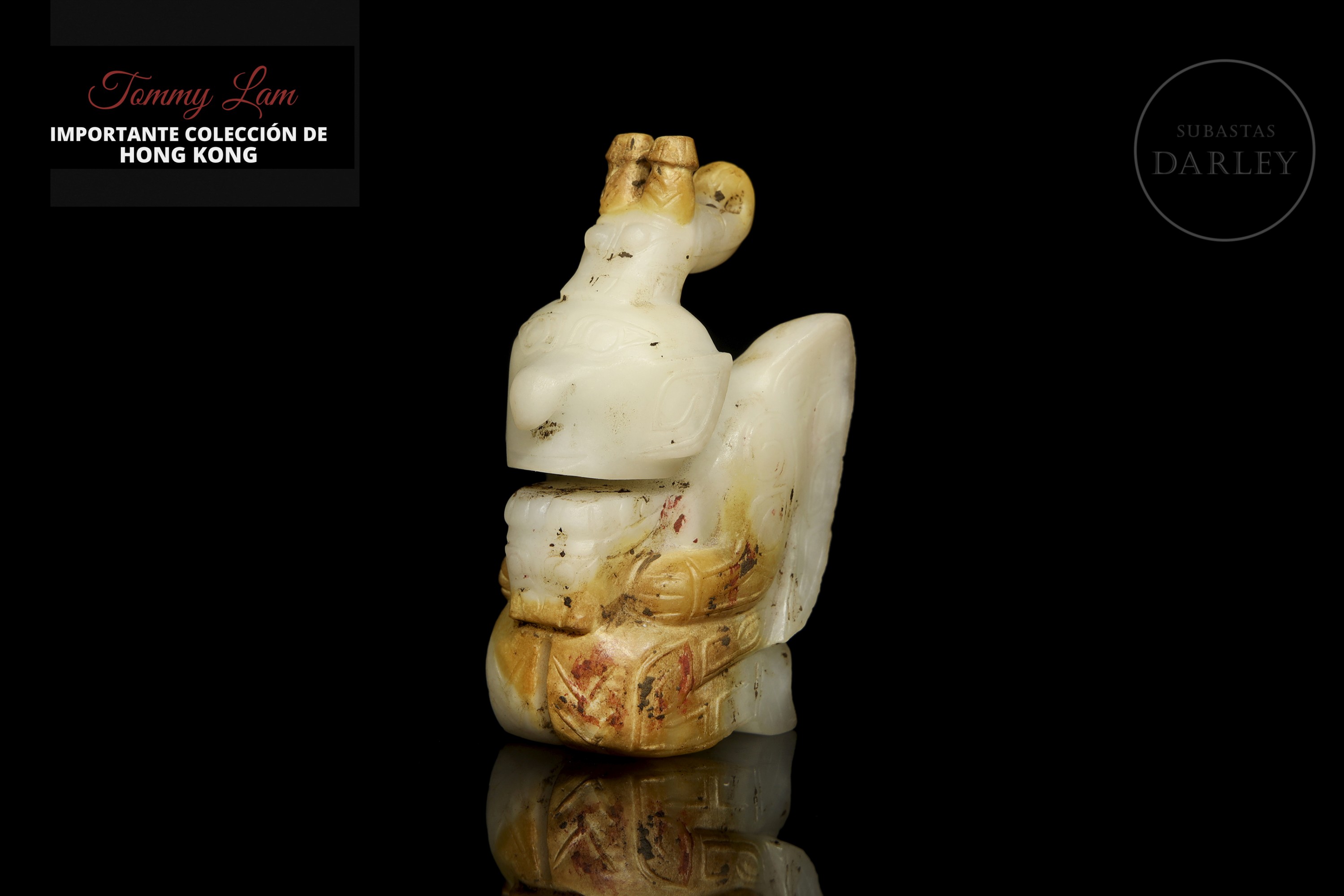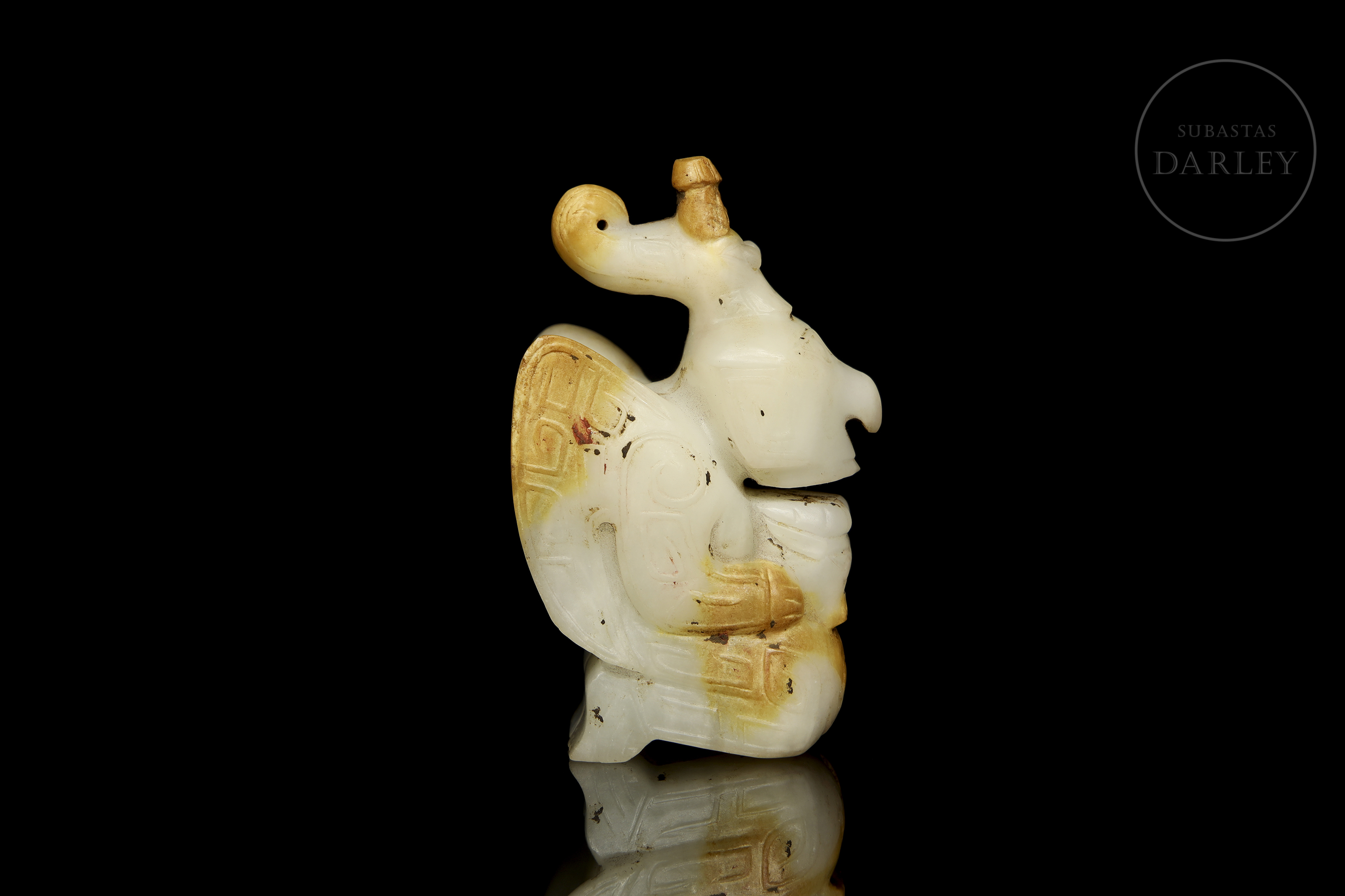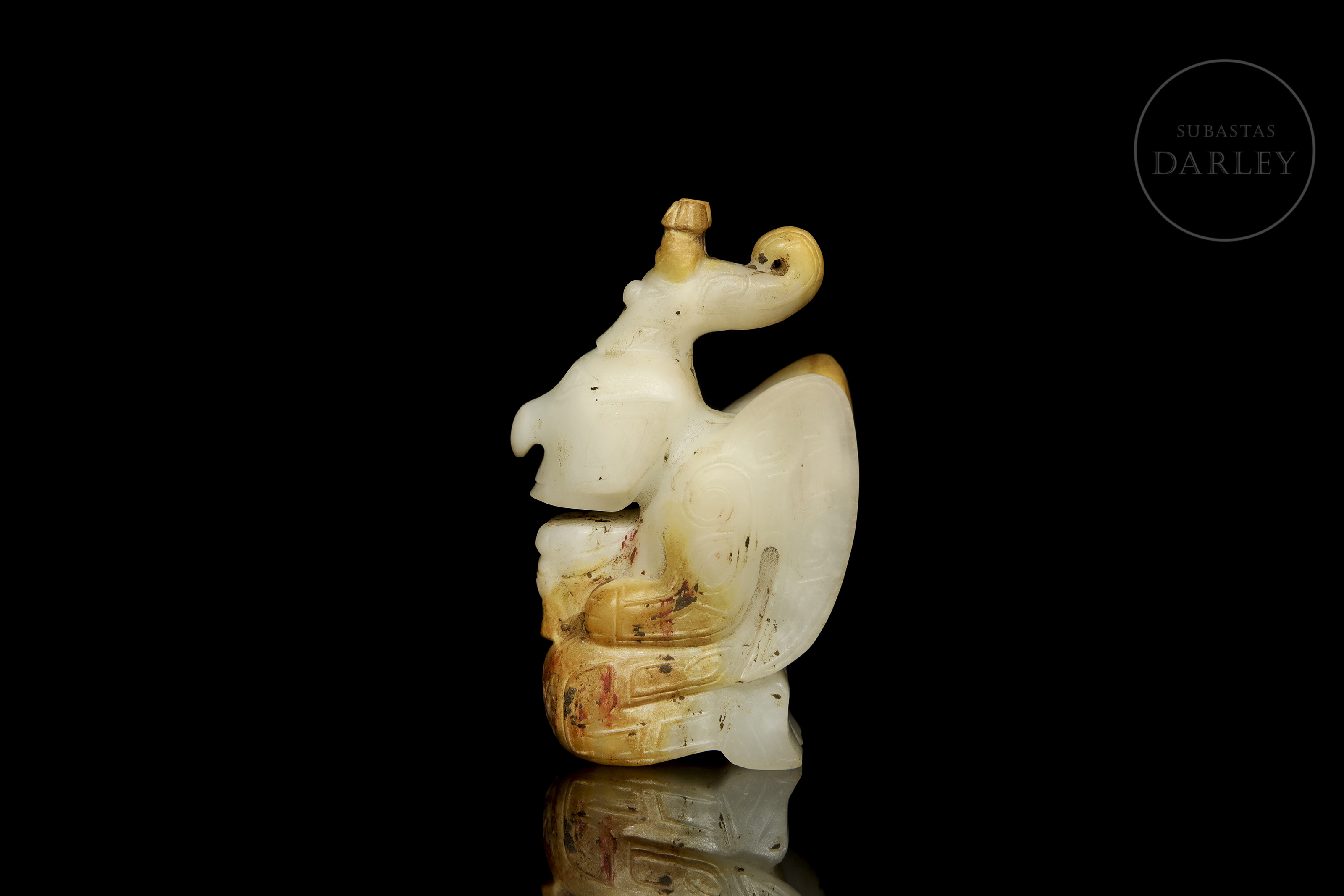 Jade blanco con zonas de pátina ocre rojizo. La pieza representa una figura antropomorfa, en posición arrodillada, sosteniendo una pequeña bestia en su regazo, con rostro solemne, ojos almendrados y un tocado en forma de dragón. Destacan las alas grandes alas posteriores, decoradas con finas incisiones de motivos geométricos y volutas. Dinastía Shang (aprox. 1600–1046 a.C.) o posterior.