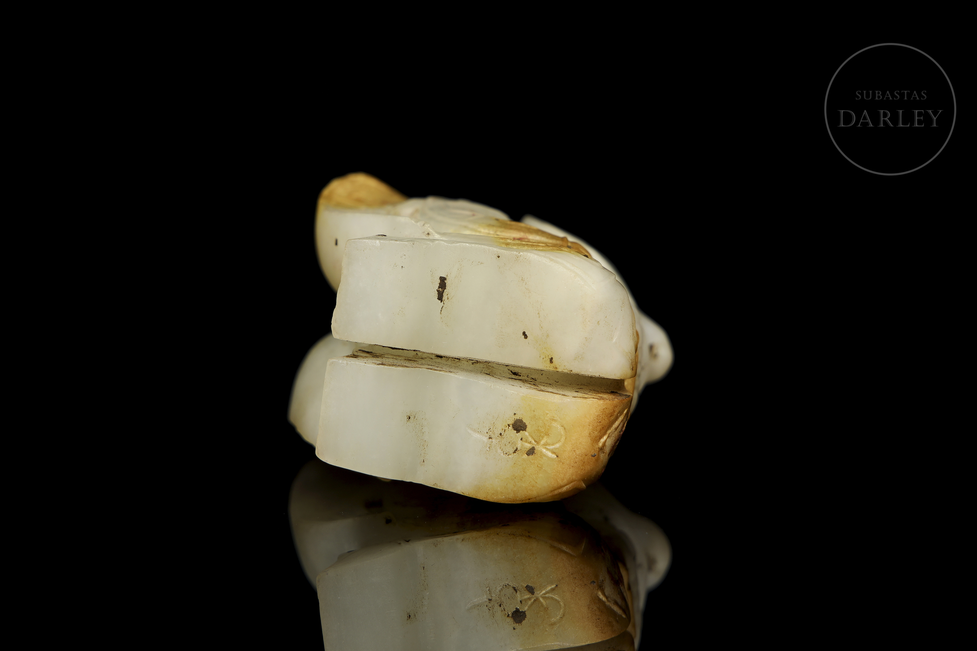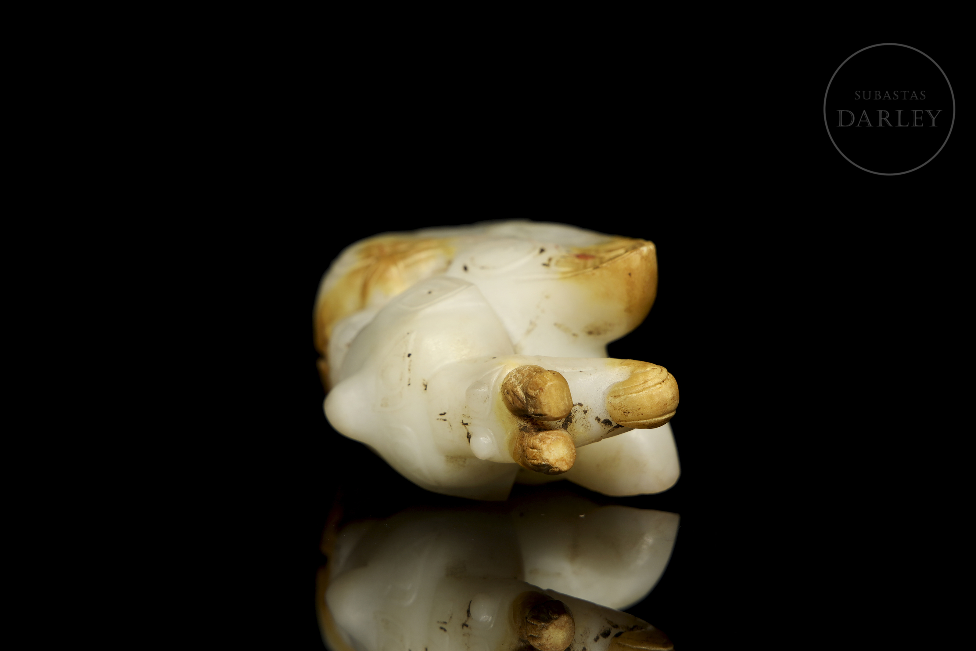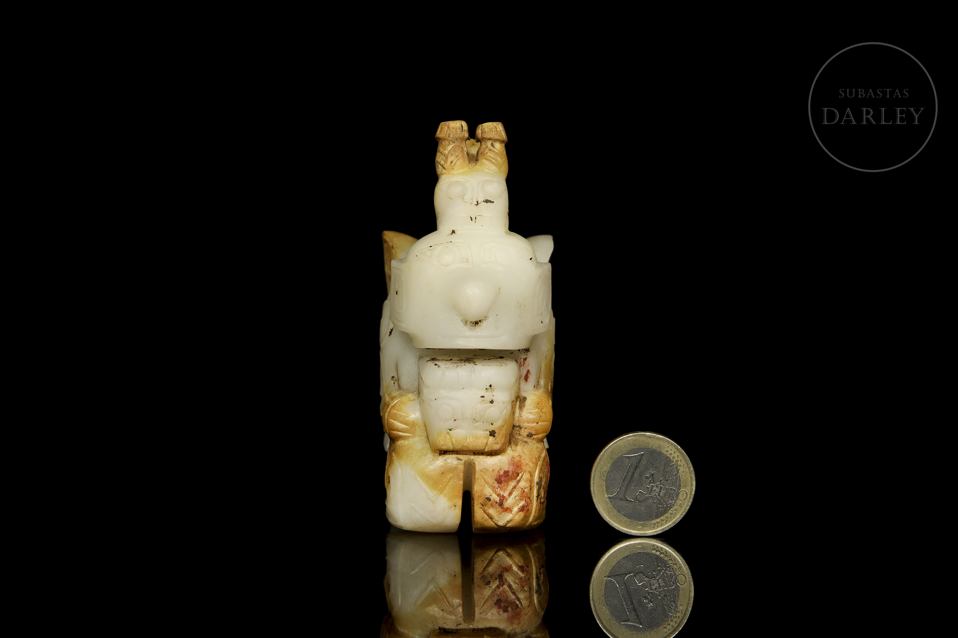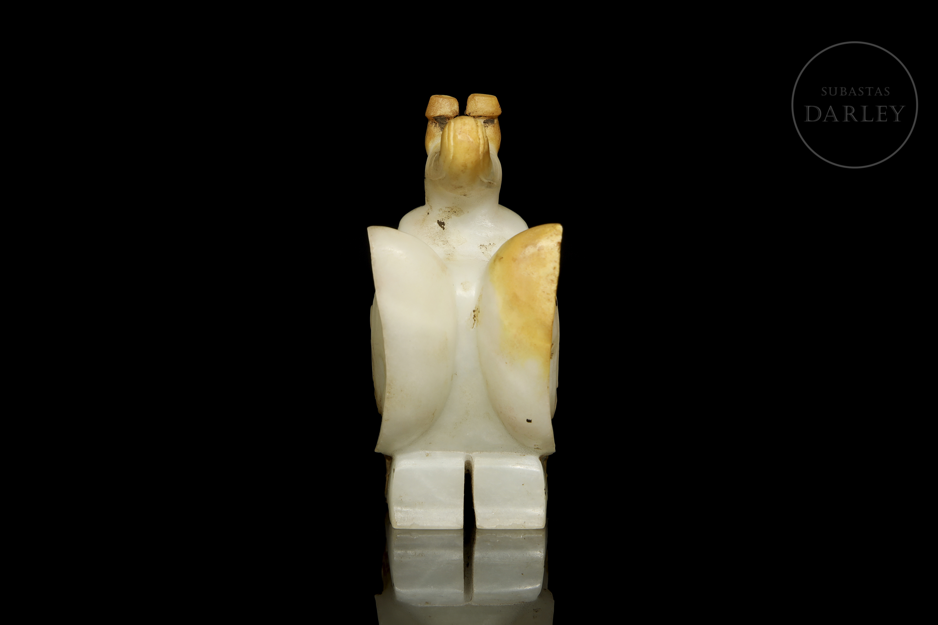 Jade blanco con zonas de pátina ocre rojizo. La pieza representa una figura antropomorfa, en posición arrodillada, sosteniendo una pequeña bestia en su regazo, con rostro solemne, ojos almendrados y un tocado en forma de dragón. Destacan las alas grandes alas posteriores, decoradas con finas incisiones de motivos geométricos y volutas. Dinastía Shang (aprox. 1600–1046 a.C.) o posterior.