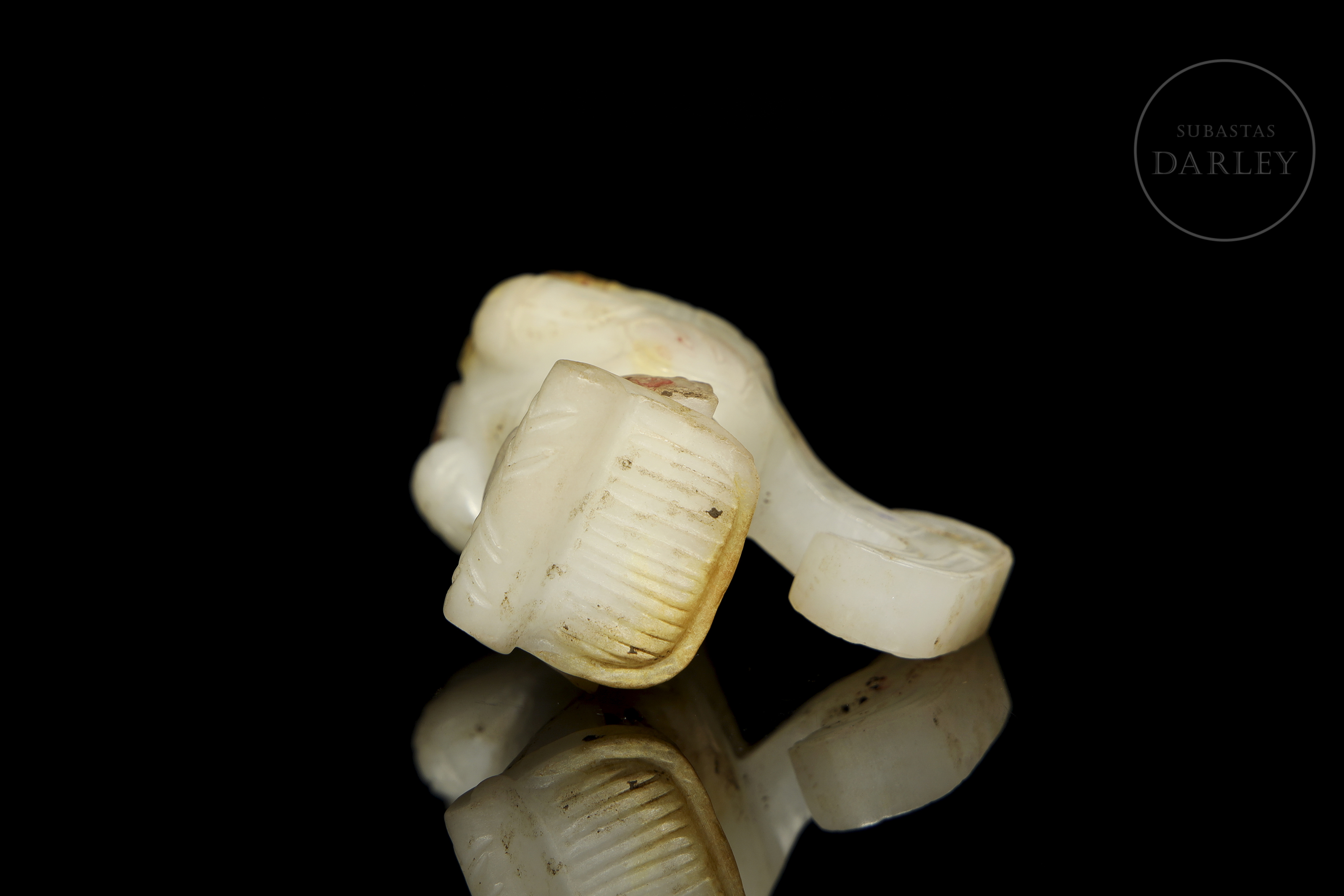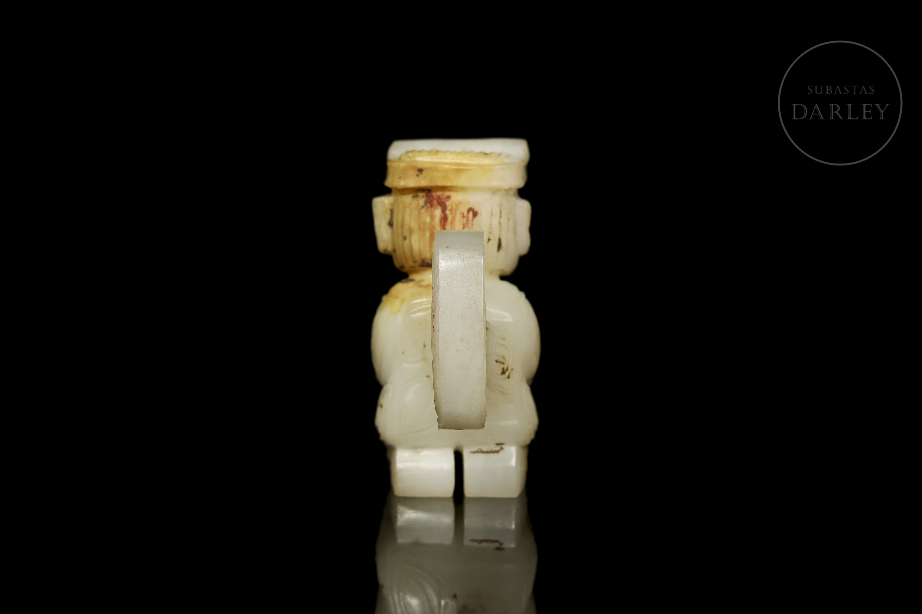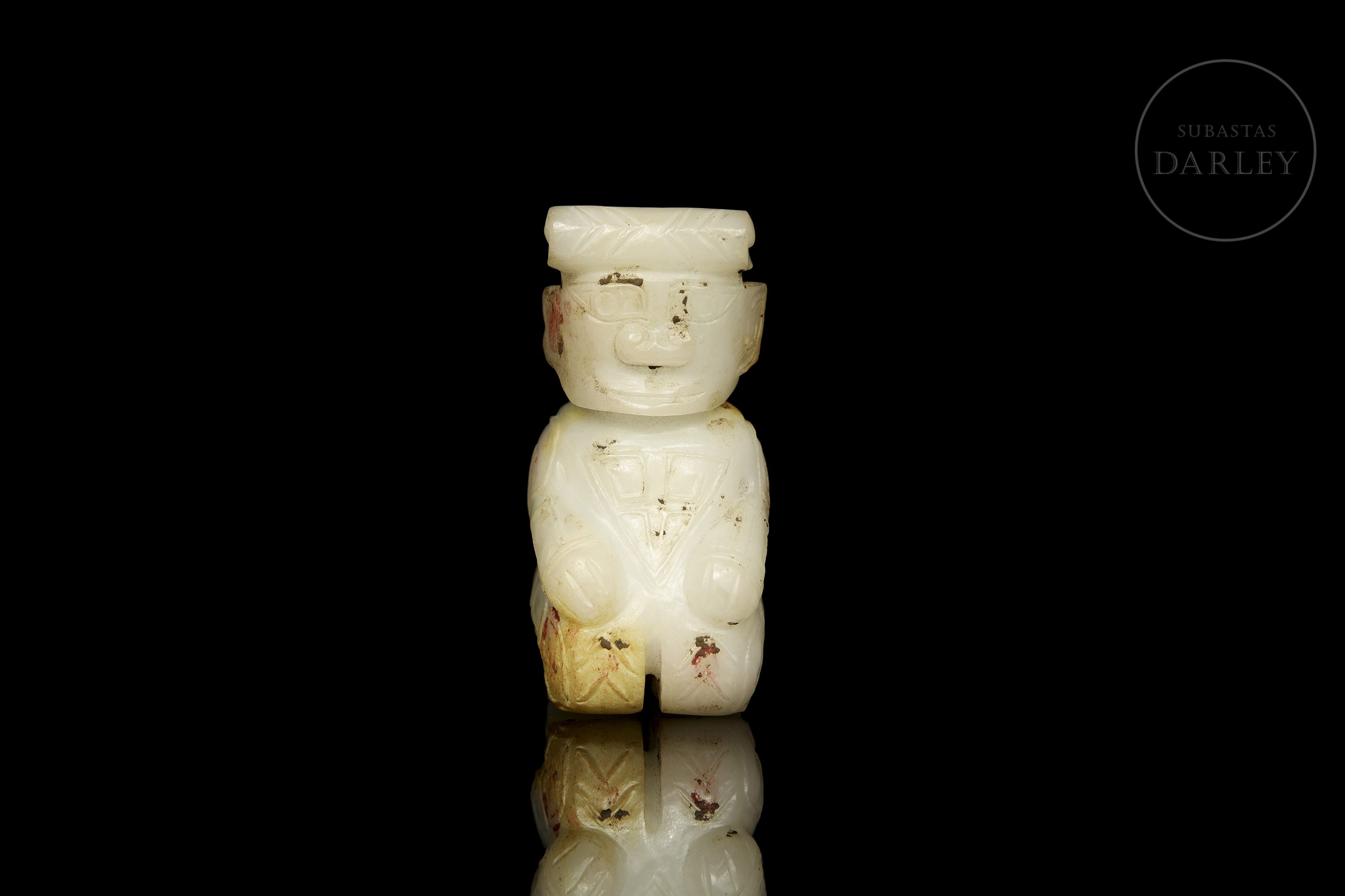 Jade blanco con áreas de pátina ámbar. Representa una figura arrodillada, con las manos sobre el regazo. Presenta rasgos solemnes con ojos almendrados, una nariz ancha y un elaborado tocado superior de perfil escalonado. Destaca el apéndice dorsal calado en forma de voluta curva que se extiende desde la nuca hacia la espalda. Muestra pátina por envejecimiento. Dinastía Shang (aprox. 1600–1046 a.C.) o posterior.