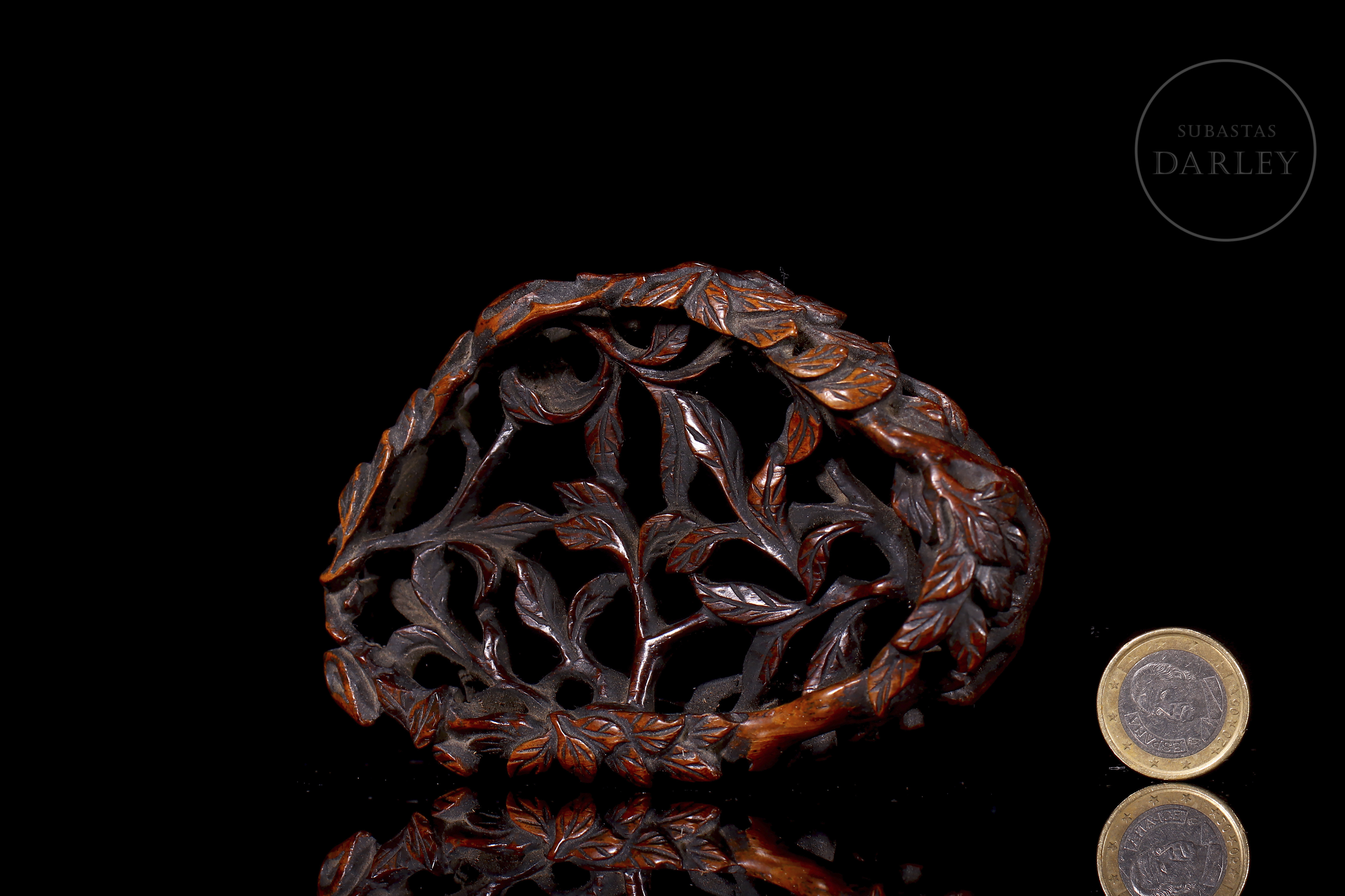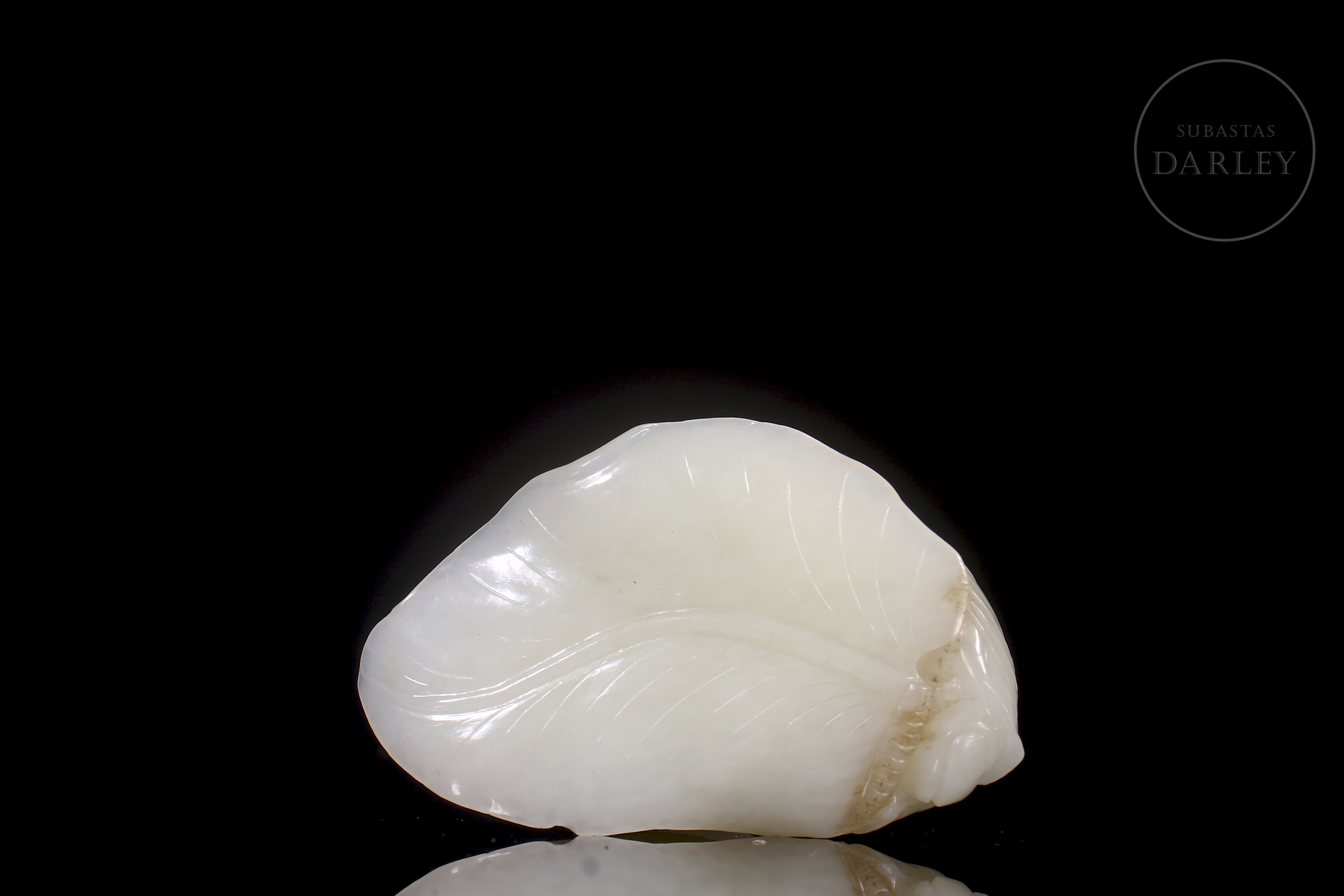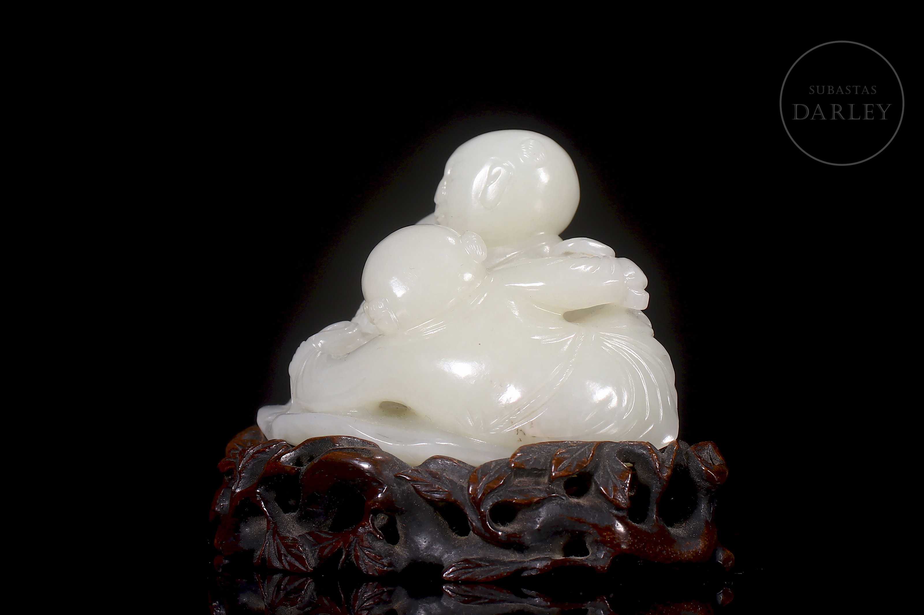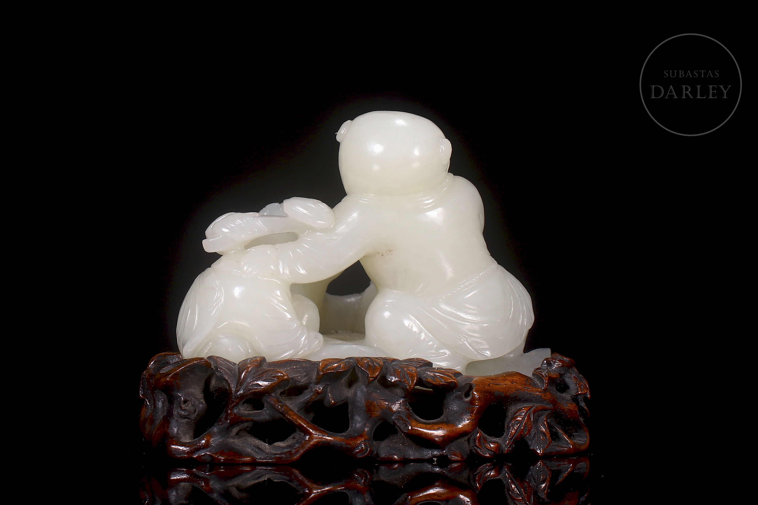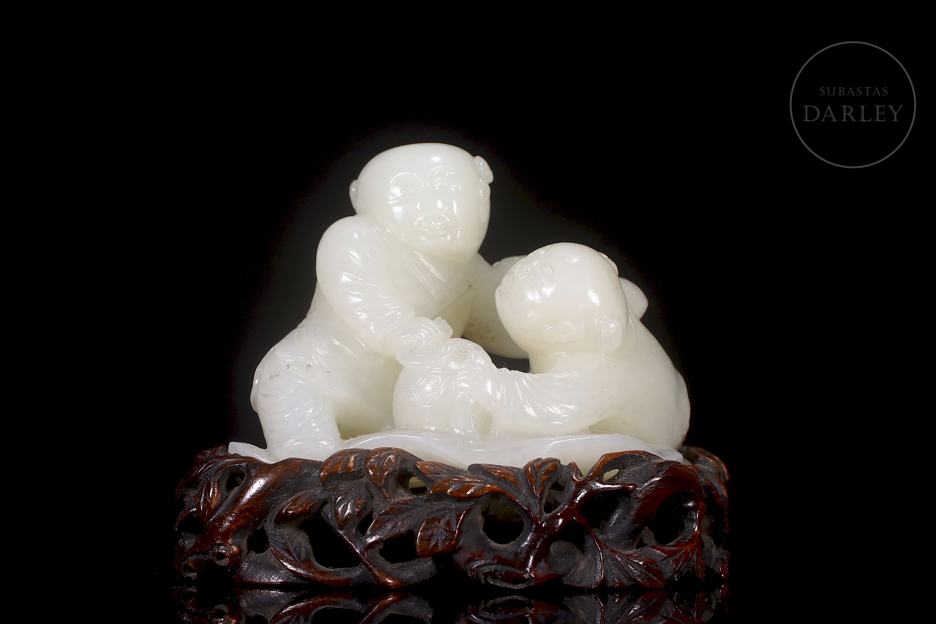 Figura tallada de jade blanco. Se encuentra adornada por dos infantes en una escena de juego con un objeto. La decoración se basa en la talla suave de las figuras infantiles, con cabezas grandes, cuerpos rechonchos, y detalles incisos en la ropa. La pieza se presenta sobre una base de madera tallada con un diseño calado de ramas y volutas florales. Dinastía Qing (1644–1912).