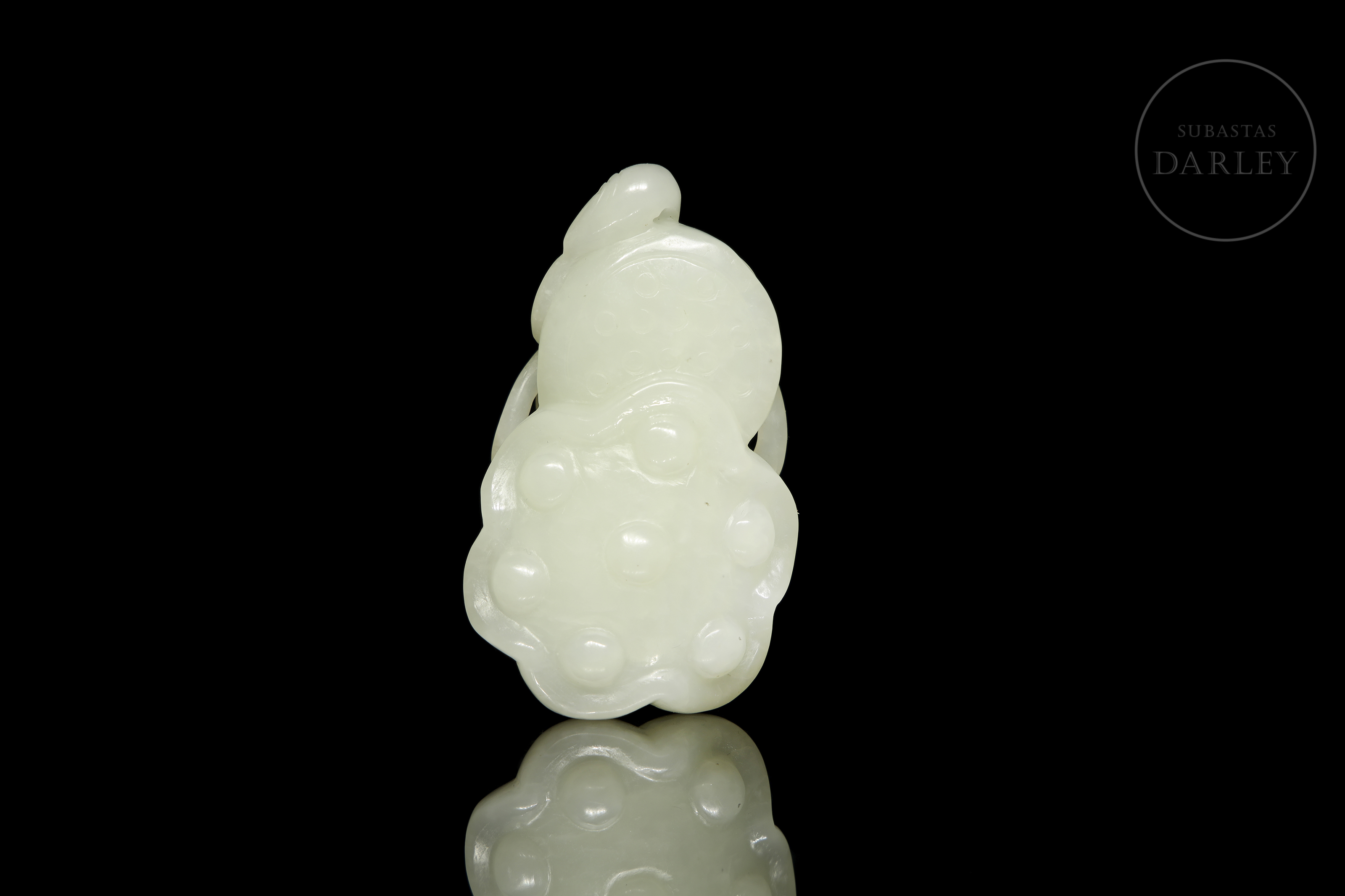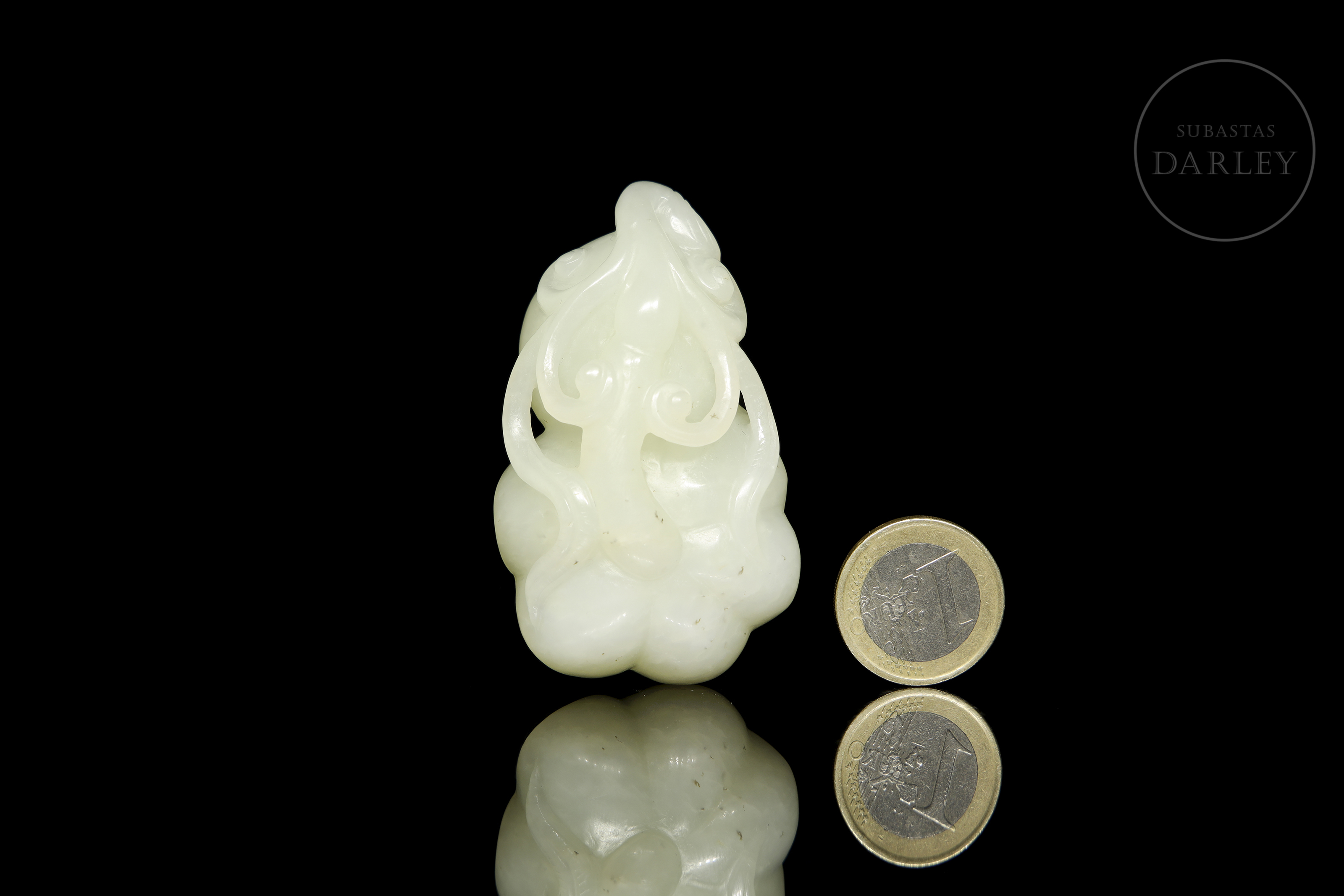 Jade de tonalidad blanca translúcida. Muestra una raíz de loto (lian'ou), mostrando en su reverso las características cavidades internas del tubérculo, acompañado de sinuosas hojas, caladas y en relieve, integrando tallos sinuosos que envuelven el cuerpo. Muestra pátina por antigüedad. Dinastía Qing (1644–1912).