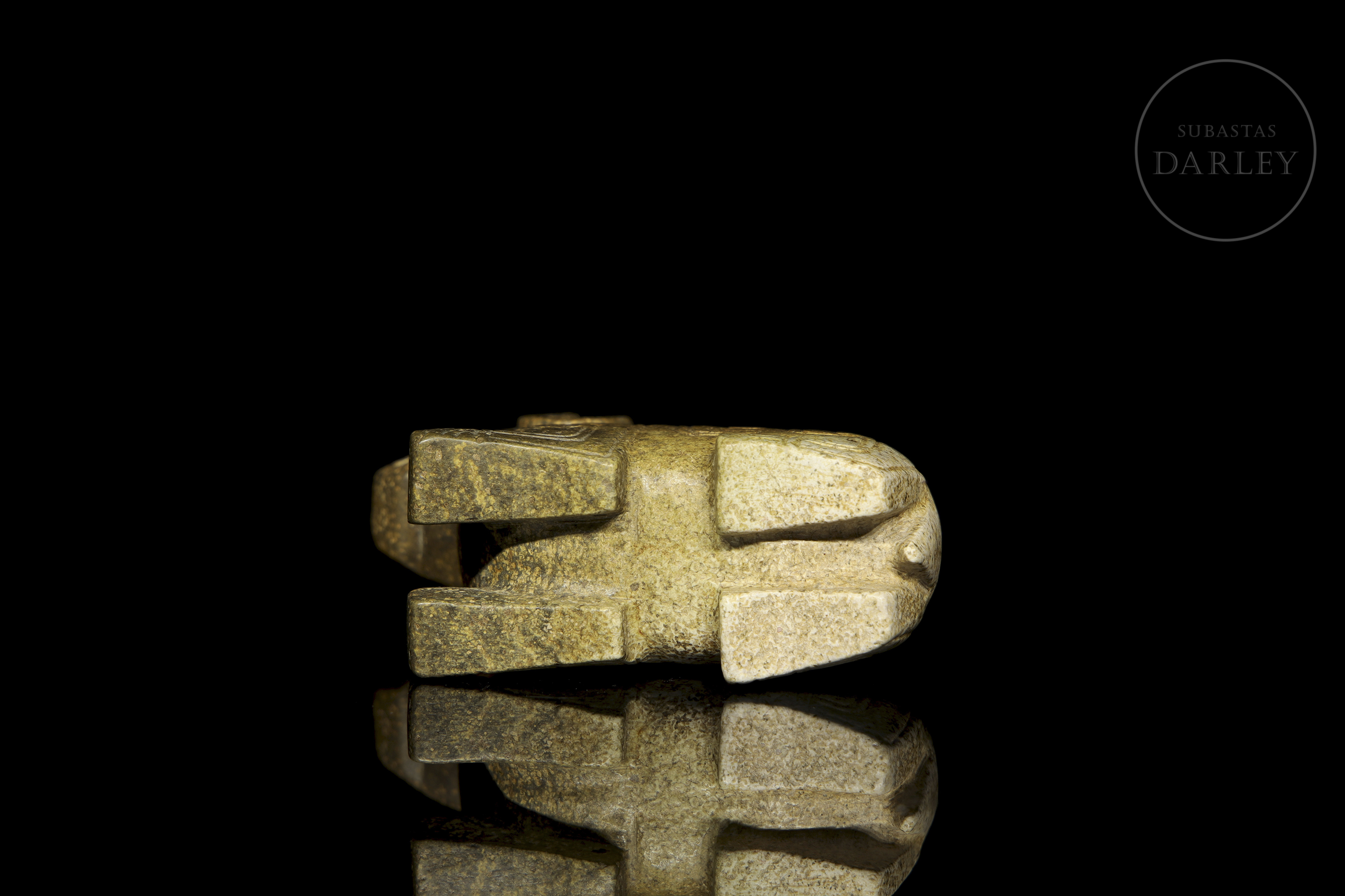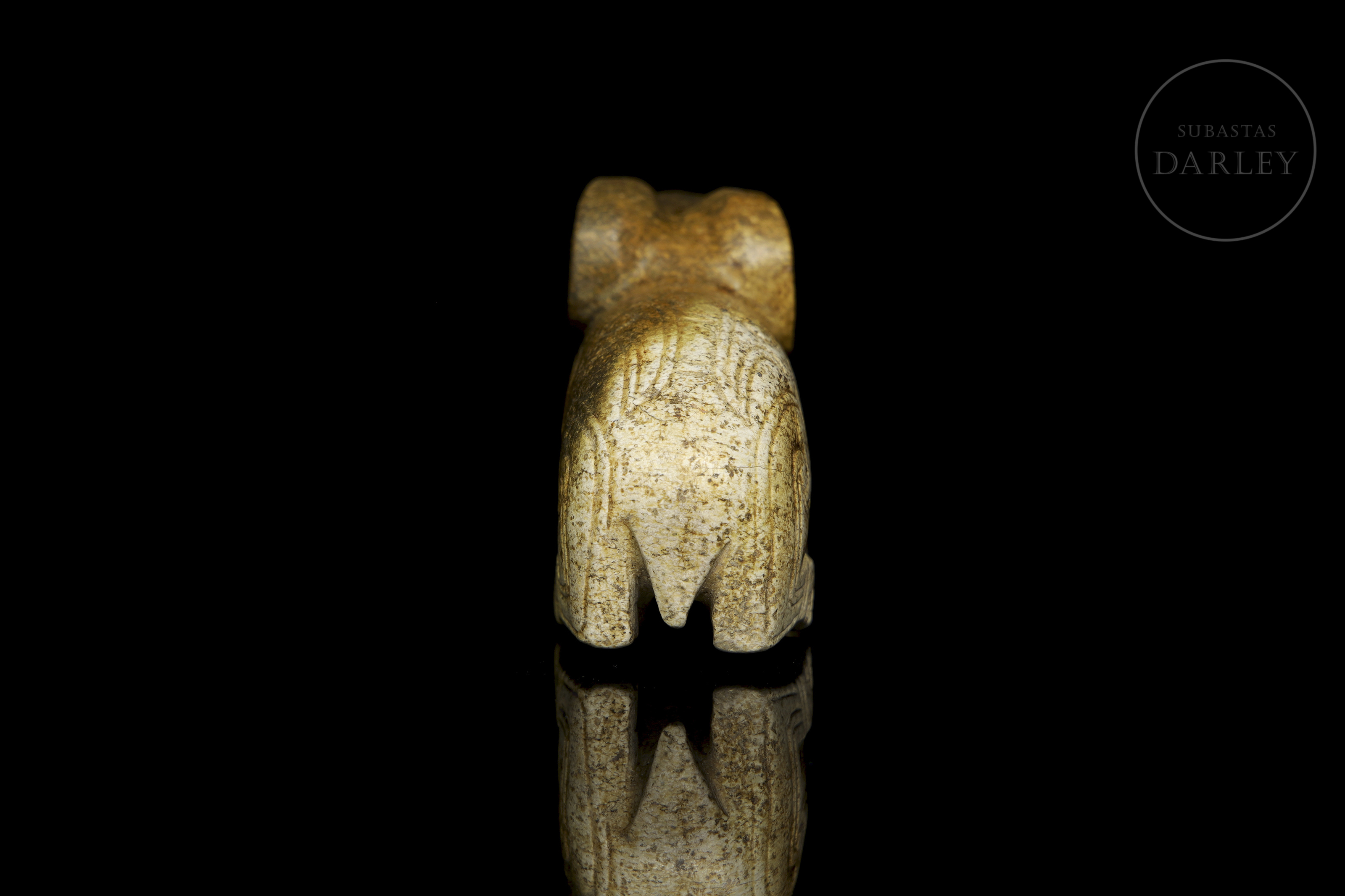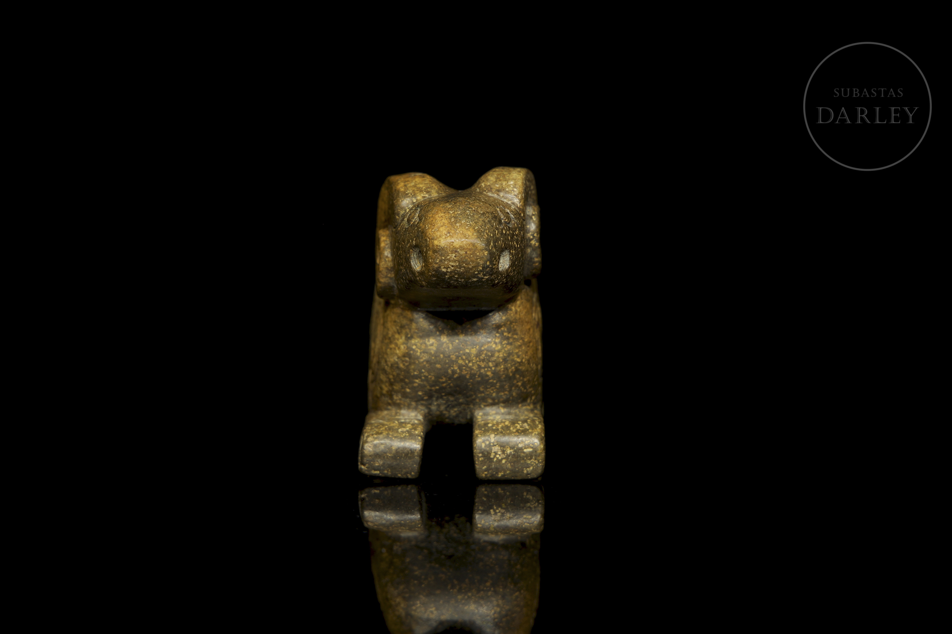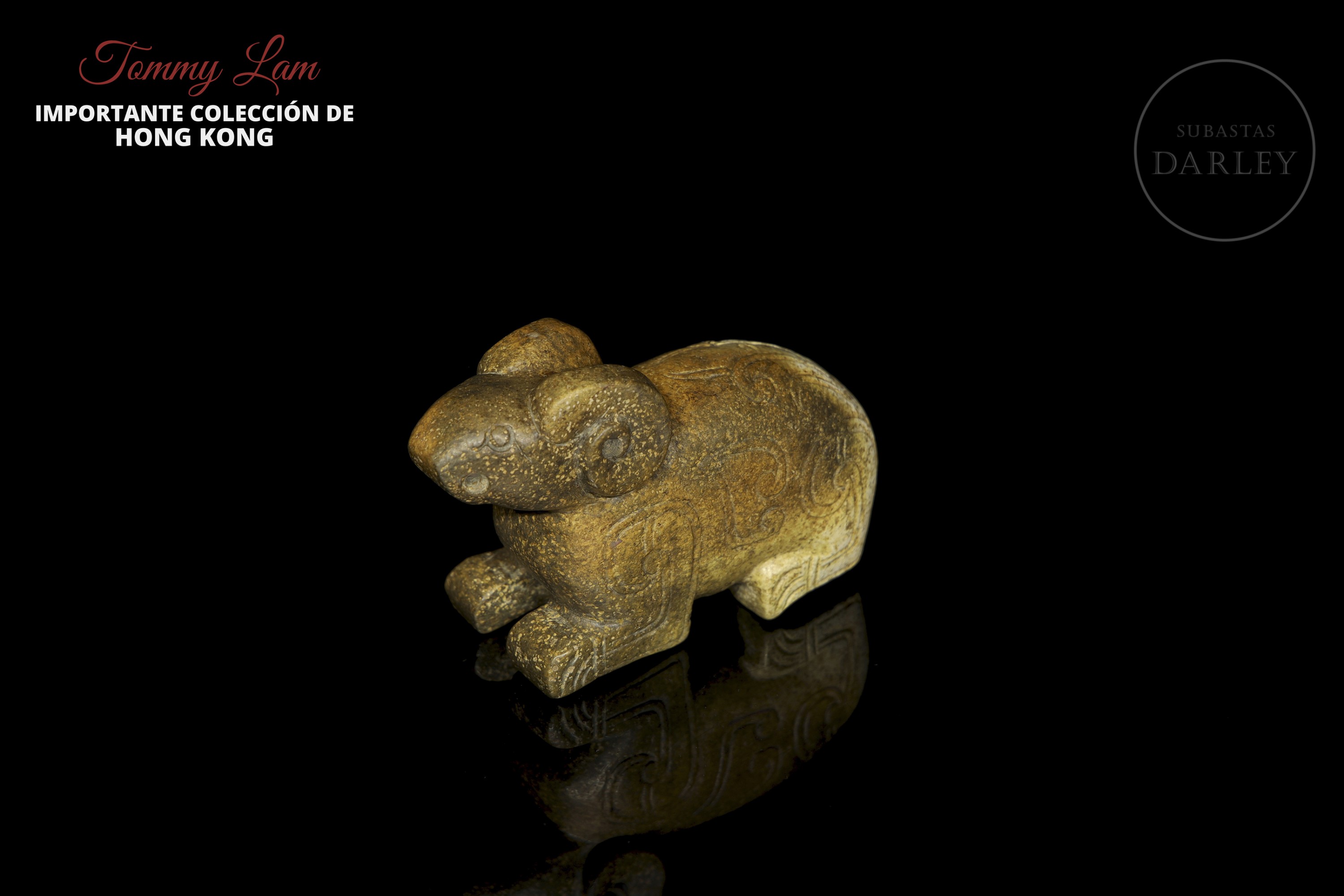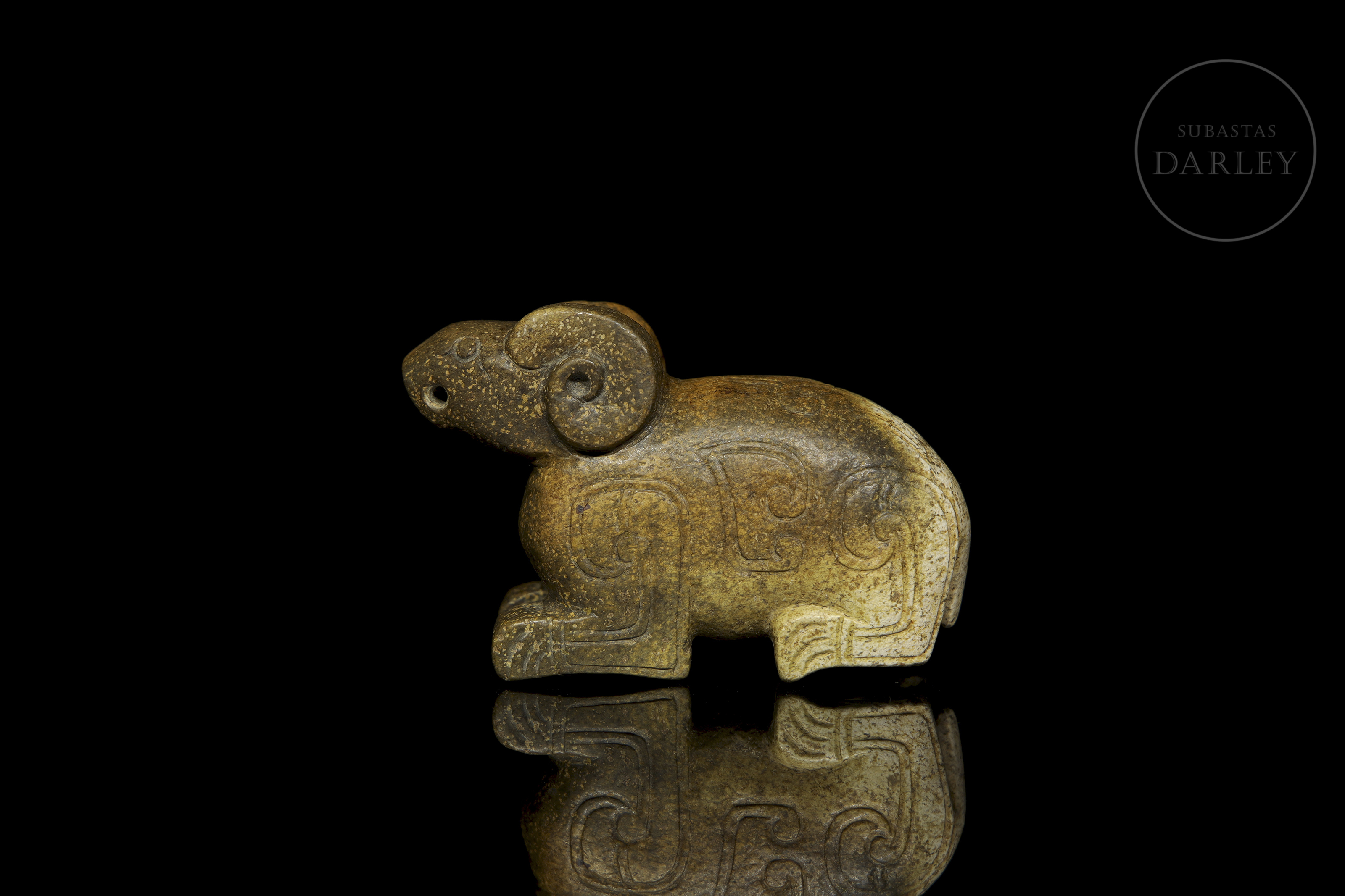 Jade de tonalidad verde amarillento con una marcada pátina mineral en tonos ocre y marrón oscuro. La pieza representa a un carnero descansando con las extremidades recogidas bajo el cuerpo. Destaca por la síntesis de los rasgos, donde destacan los grandes cuernos curvados. Está decorada con bajorrelieves arcaicos que definen la musculatura y el pelaje. Dinastía Shang (aprox. 1600–1046 a.C.) o posterior.
