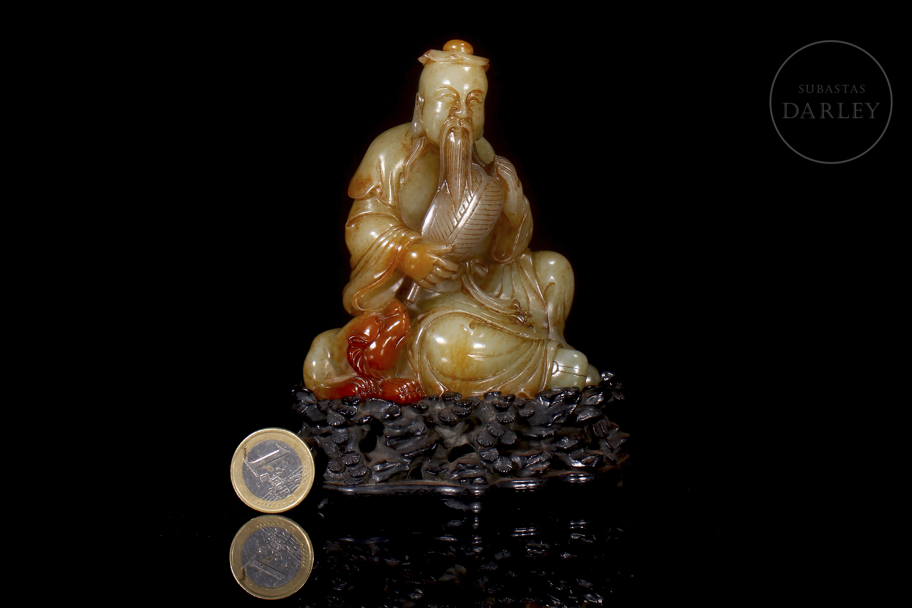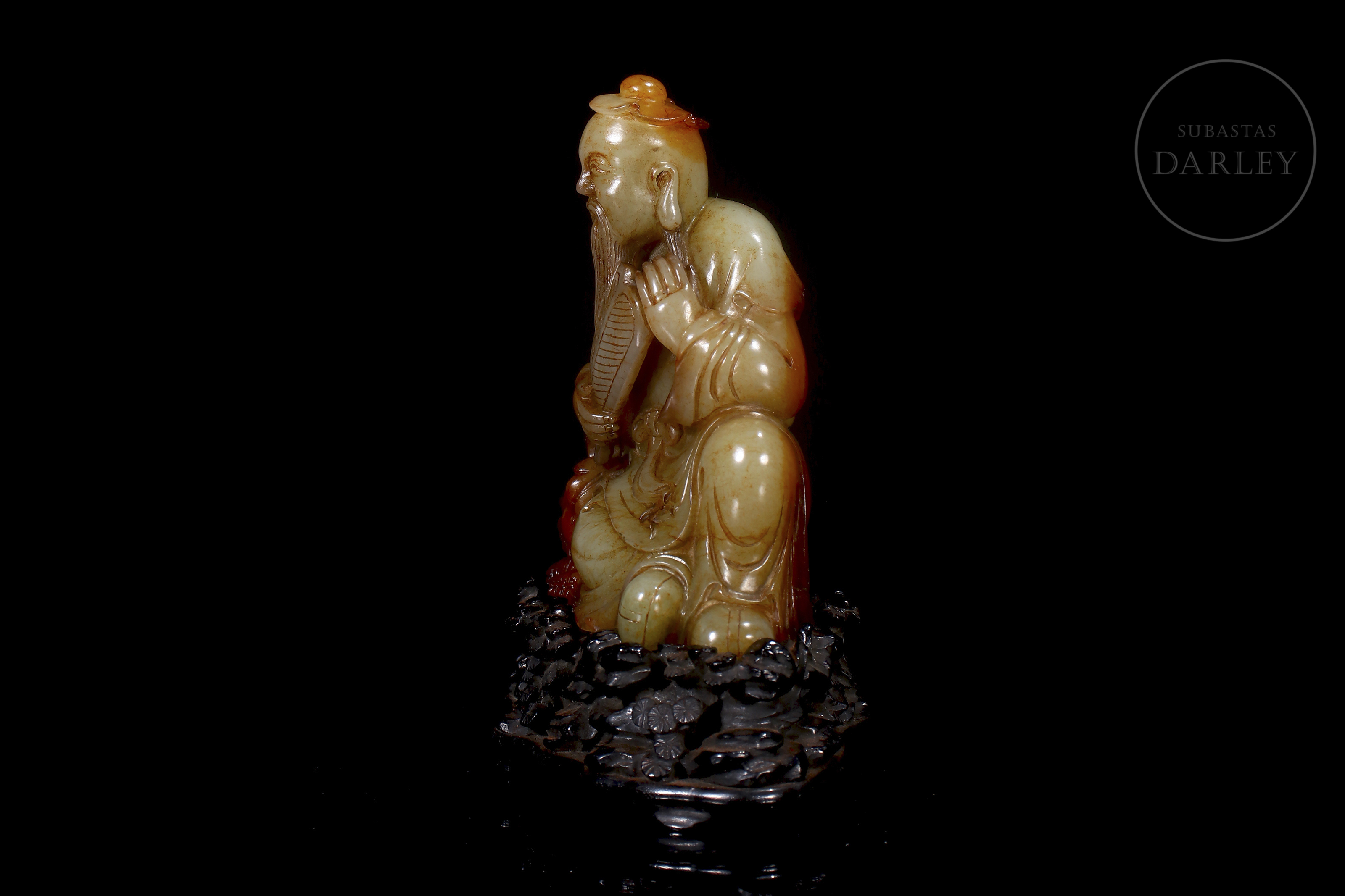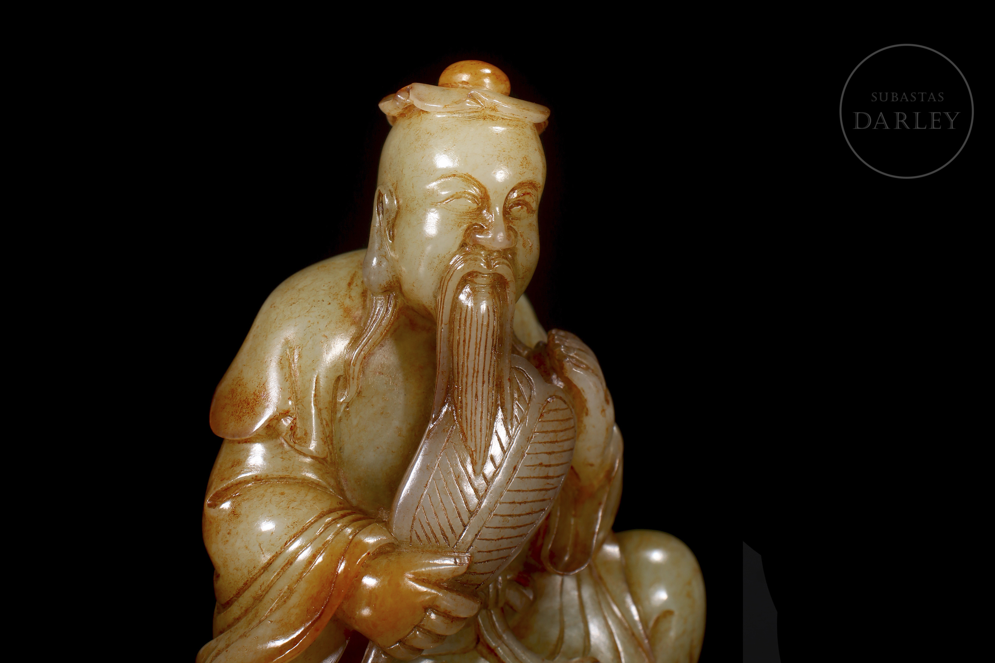 Tallada en jade de Hetian de tonalidad marfileña con vetas ocres y rojizas, representa a un erudito sentado en actitud solemne, sosteniendo un abanico en la mano derecha mientras a su lado se dispone una pequeña bestia. Se encuentra ataviado con una túnica de finos pliegues anidada en la cintura. La parte inferior presenta un largo poema grabado. La pieza se dispone sobre una base de madera tallada.
