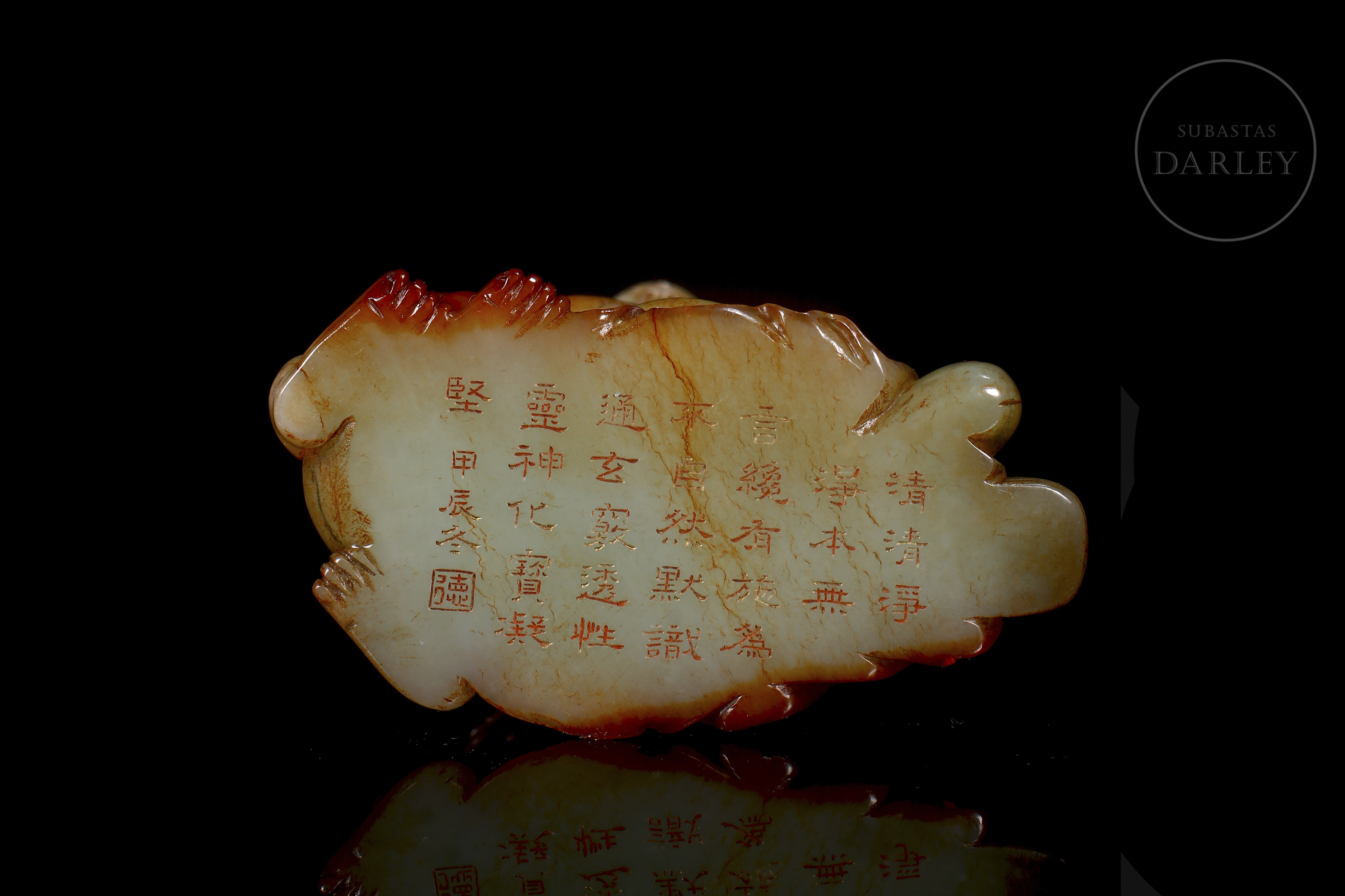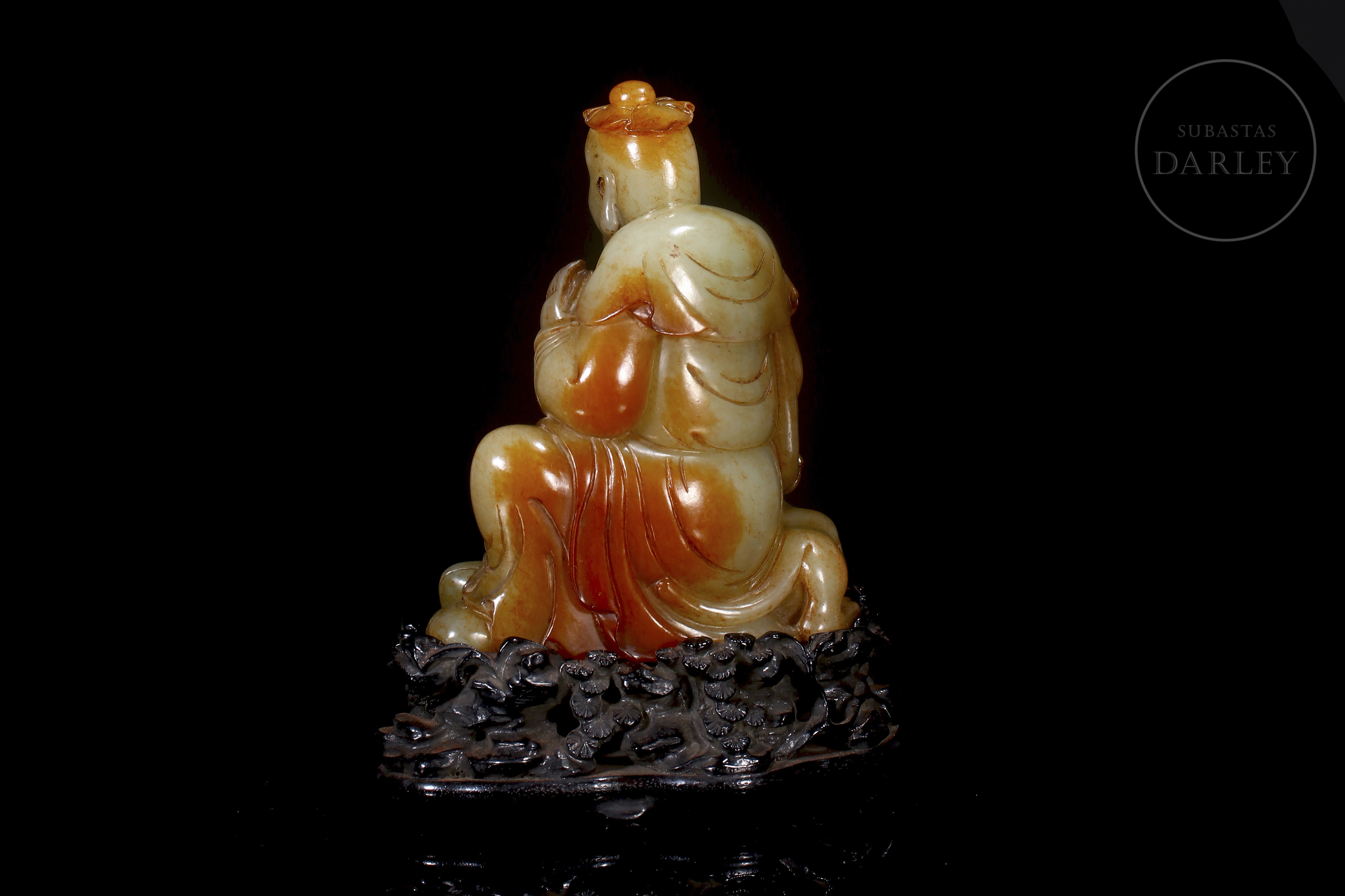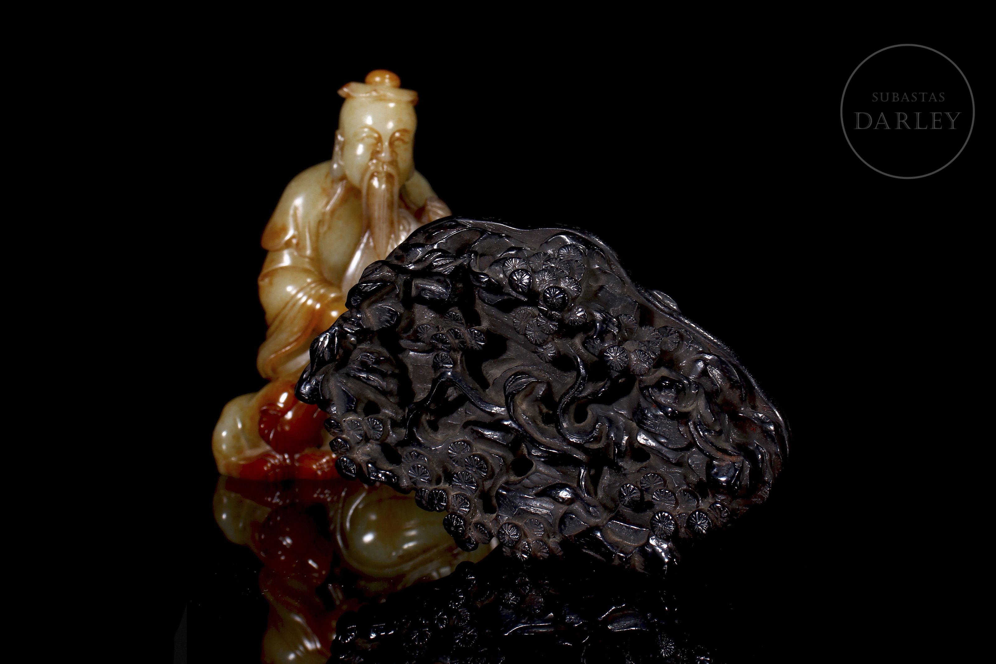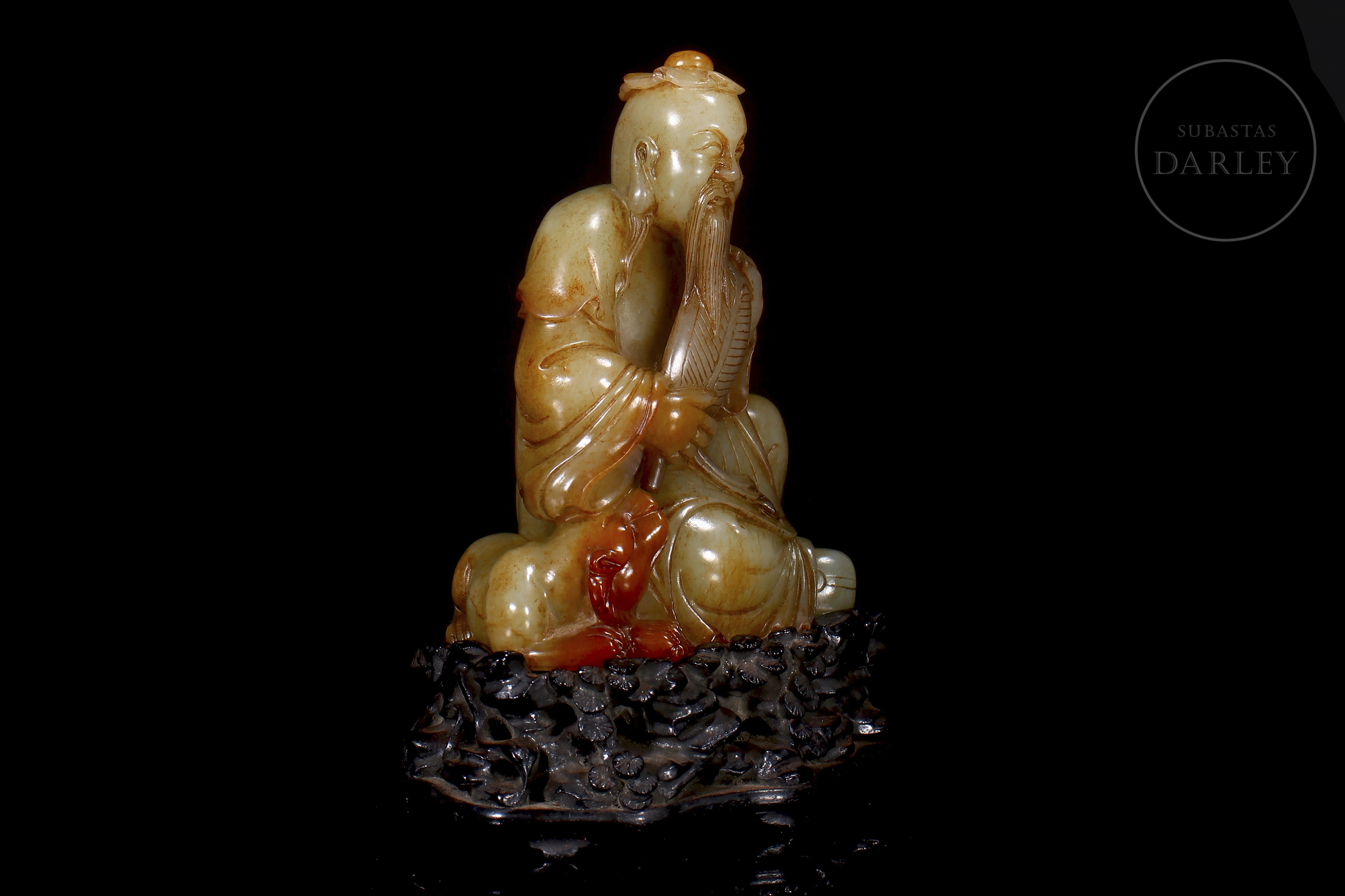 Tallada en jade de Hetian de tonalidad marfileña con vetas ocres y rojizas, representa a un erudito sentado en actitud solemne, sosteniendo un abanico en la mano derecha mientras a su lado se dispone una pequeña bestia. Se encuentra ataviado con una túnica de finos pliegues anidada en la cintura. La parte inferior presenta un largo poema grabado. La pieza se dispone sobre una base de madera tallada.