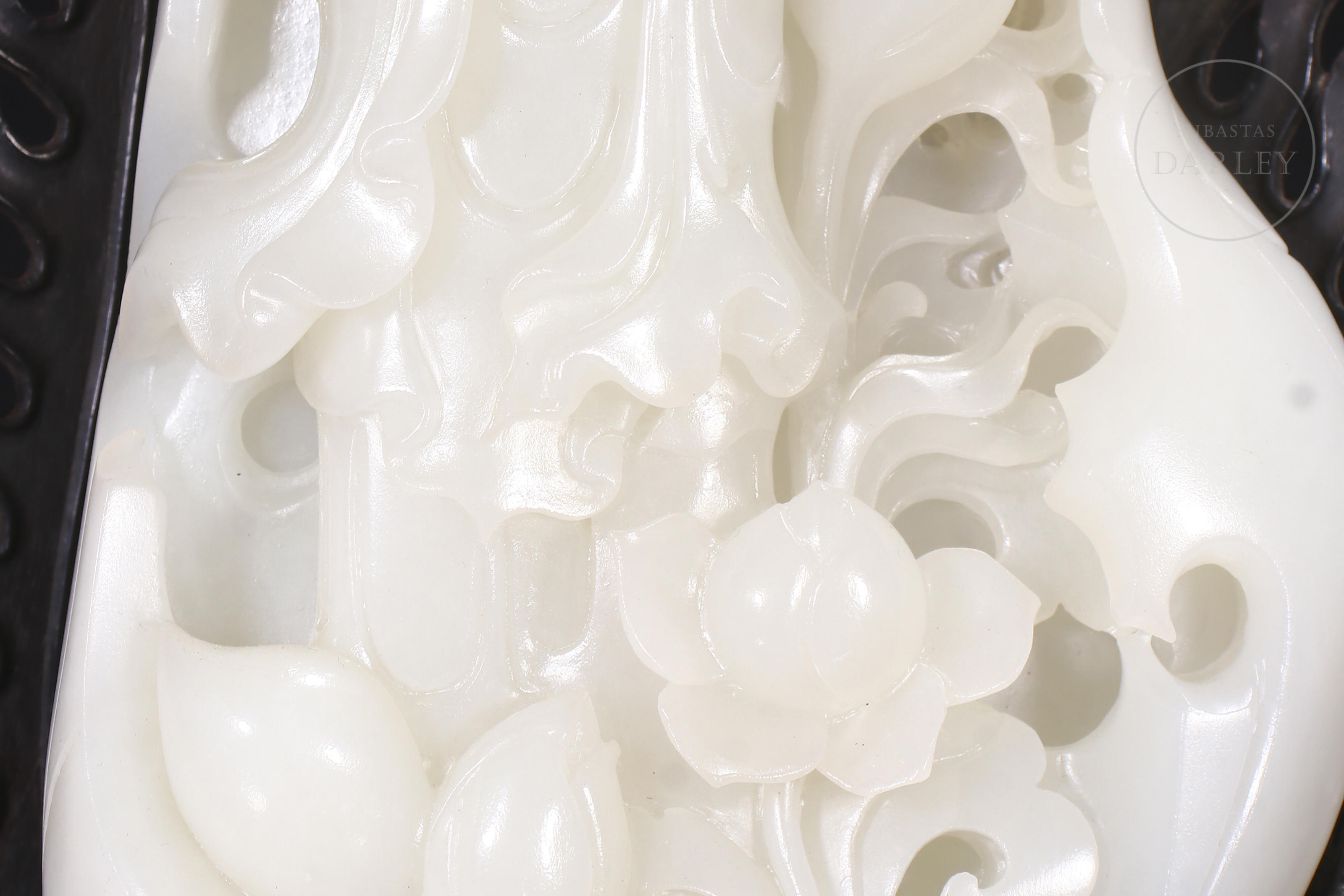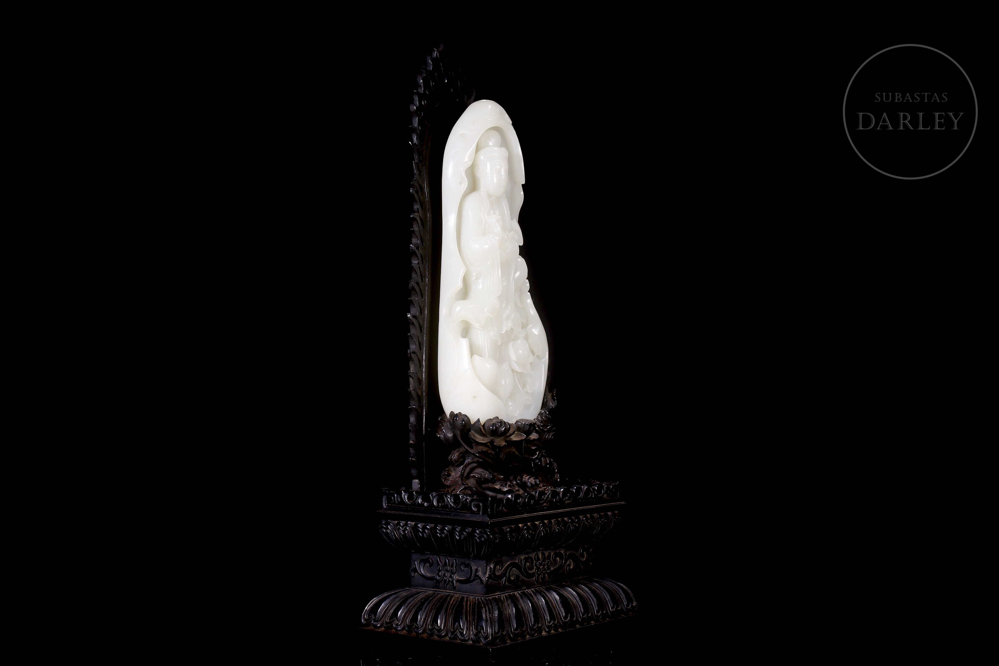 Jade de tonalidad blanca, de gran pureza. La pieza presenta la deidad que emerge de una composición de flores y capullos de loto. La figura se muestra en una postura grácil y serena, sosteniendo un tallo, con vestiduras fluidas que se funden con los elementos vegetales tallados en altorrelieve y calado. Su rostro posee una expresión de profunda benevolencia y paz interior, y un peinado recogido en un alto moño. Descansa sobre una imponente base de madera tallada en dos niveles, el inferior, rectangular con detalles de lotos y grecas, y la superior, a modo de aureola de afiladas llamas, dispuesta sobre una base de rocas y lotos en flor que se funden con el jade. Dinastía Qing (1644–1911).