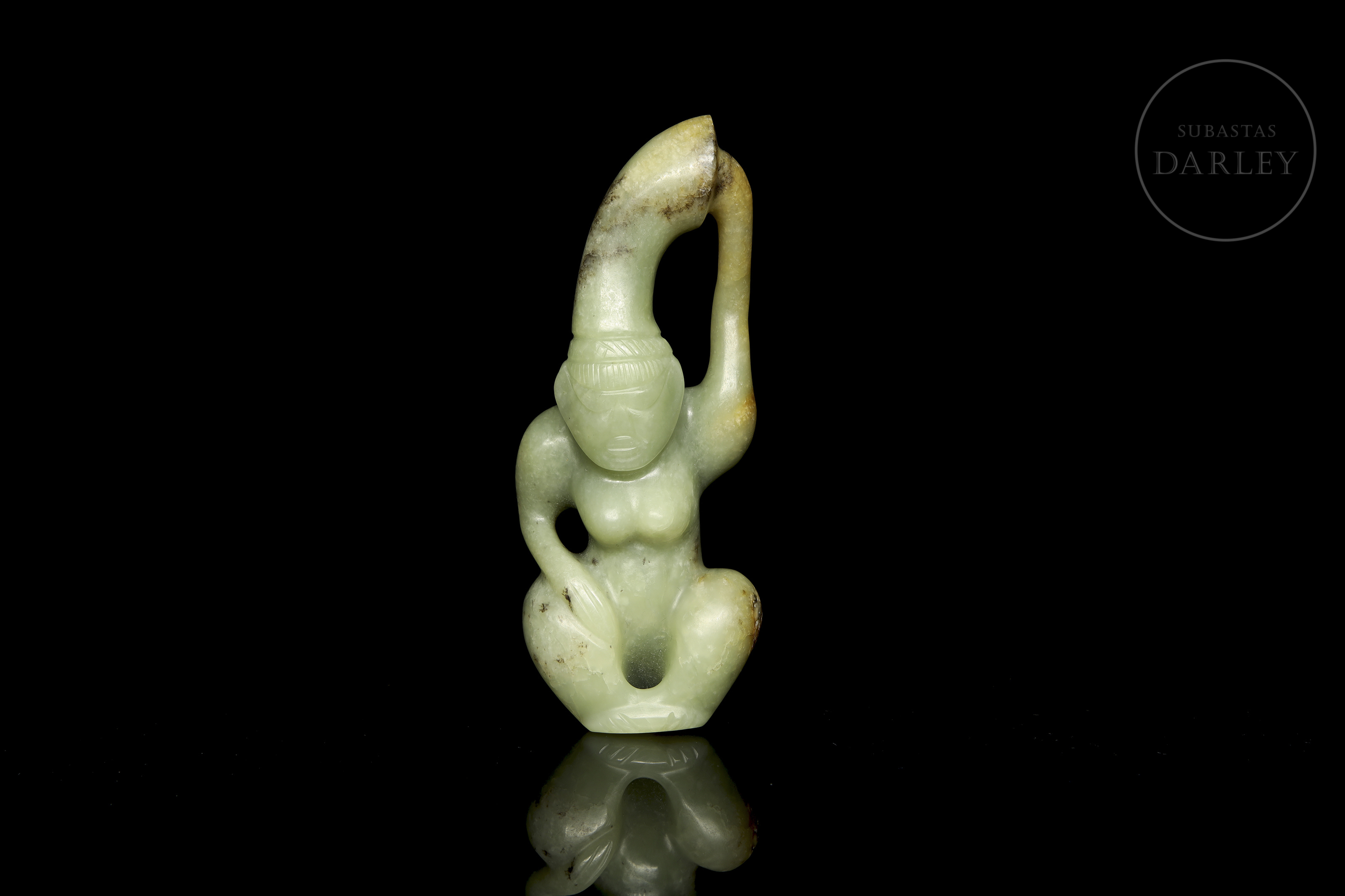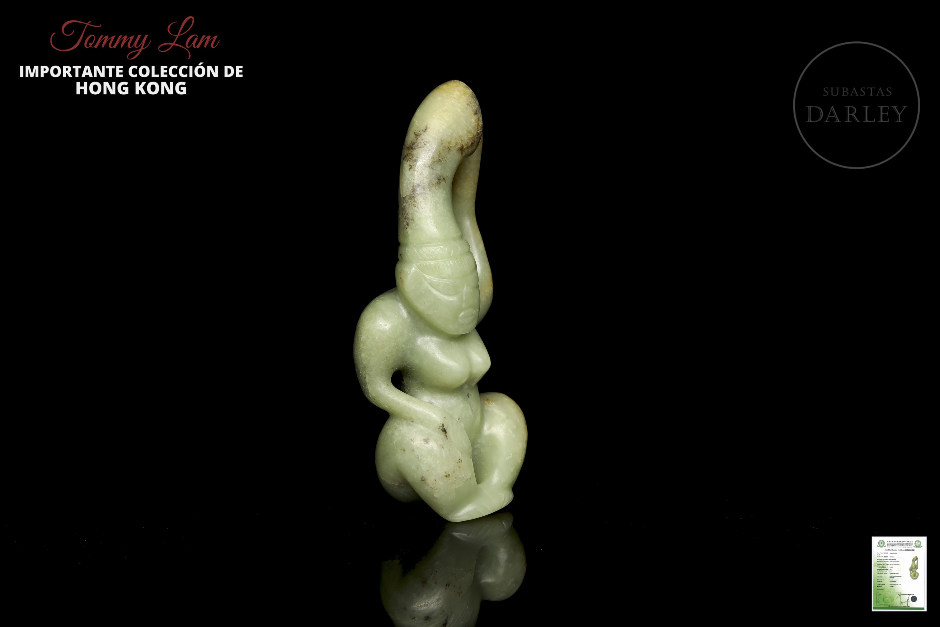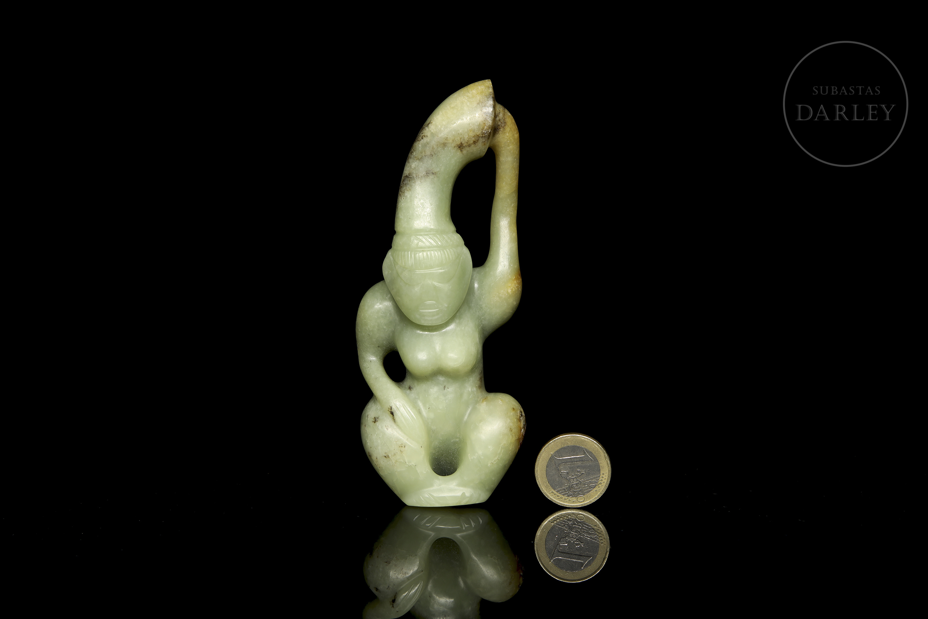 Tallada en jade nefrita natural de tono verde pálido con áreas de ligera translucidez y presencia de pátina de tonos ocre. La pieza representa una figura femenina en posición sedente, con una anatomía estilizada y un tocado prominente y curvado. Presenta rasgos faciales esquemáticos, senos marcados y un brazo descansando sobre las piernas. Cultura Hongshan (aprox. 4000–3000 a.C.) o posterior.